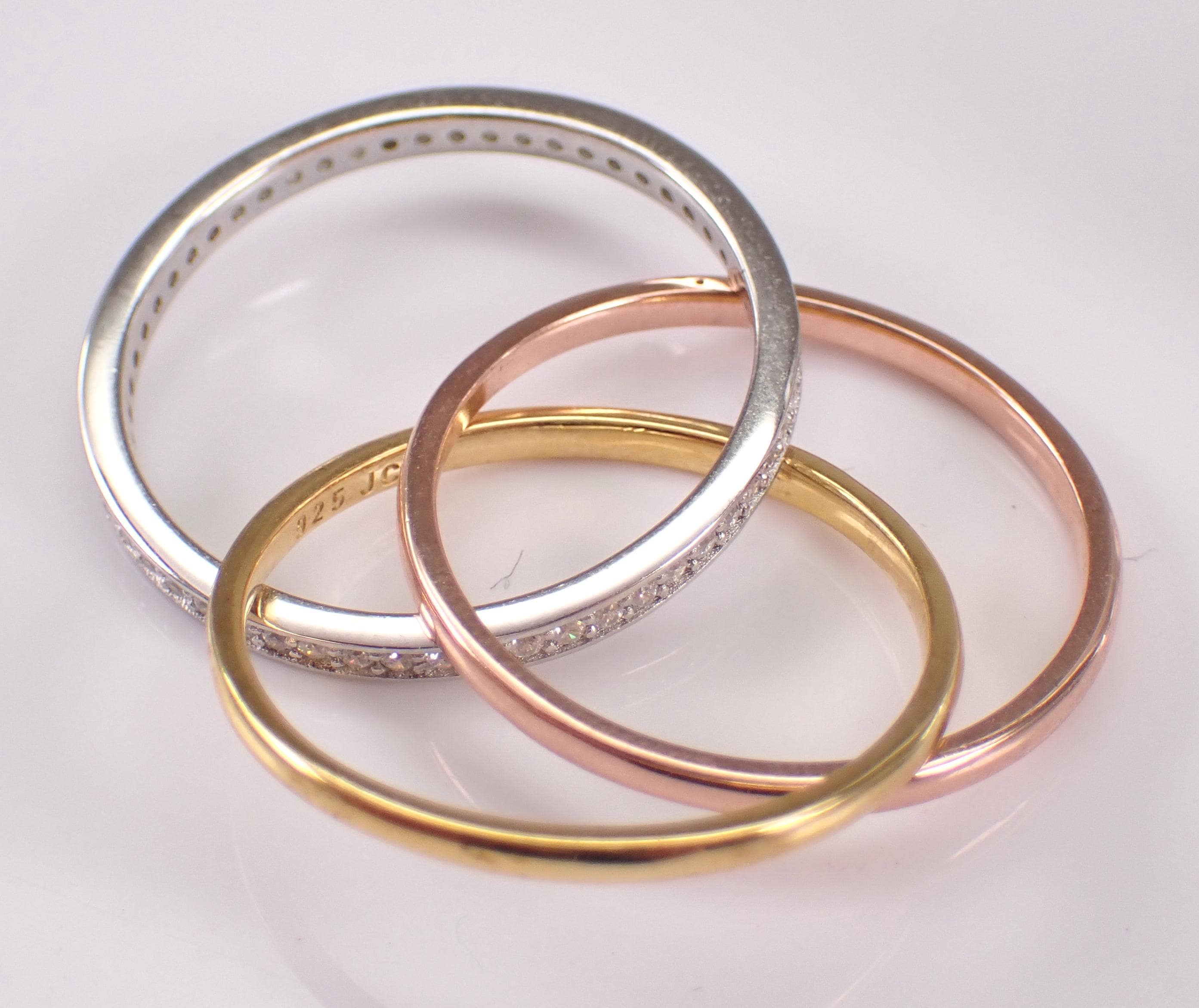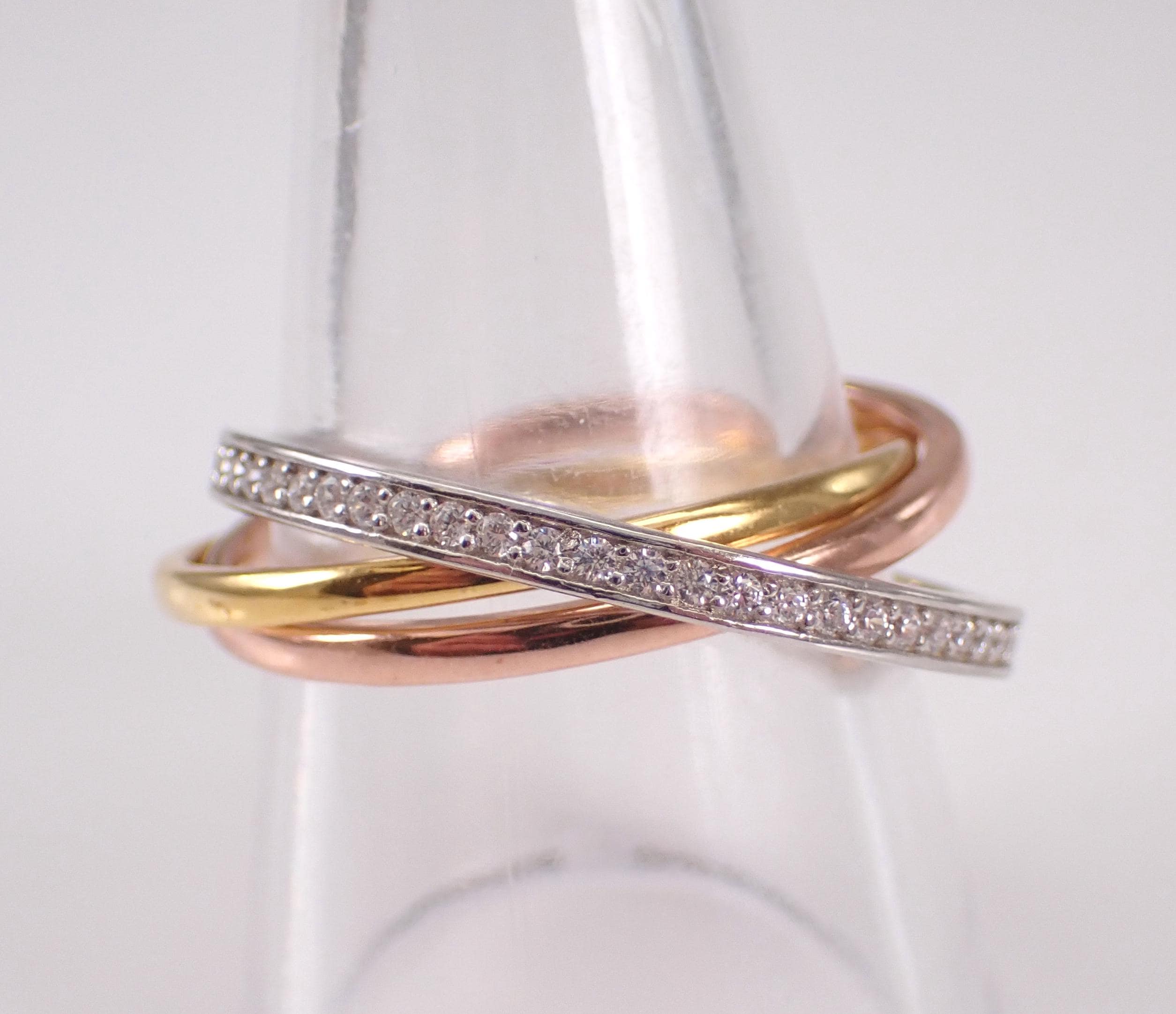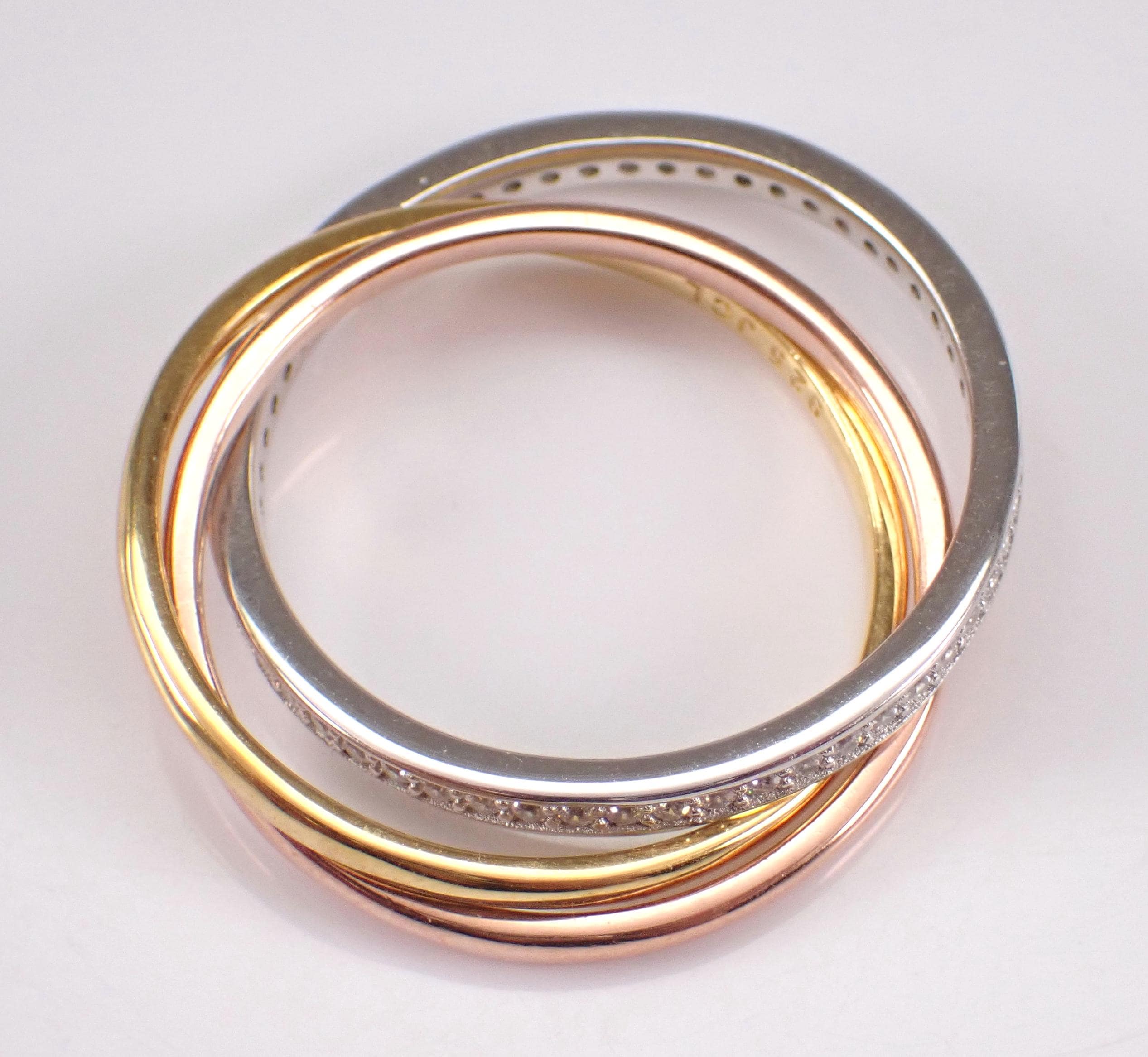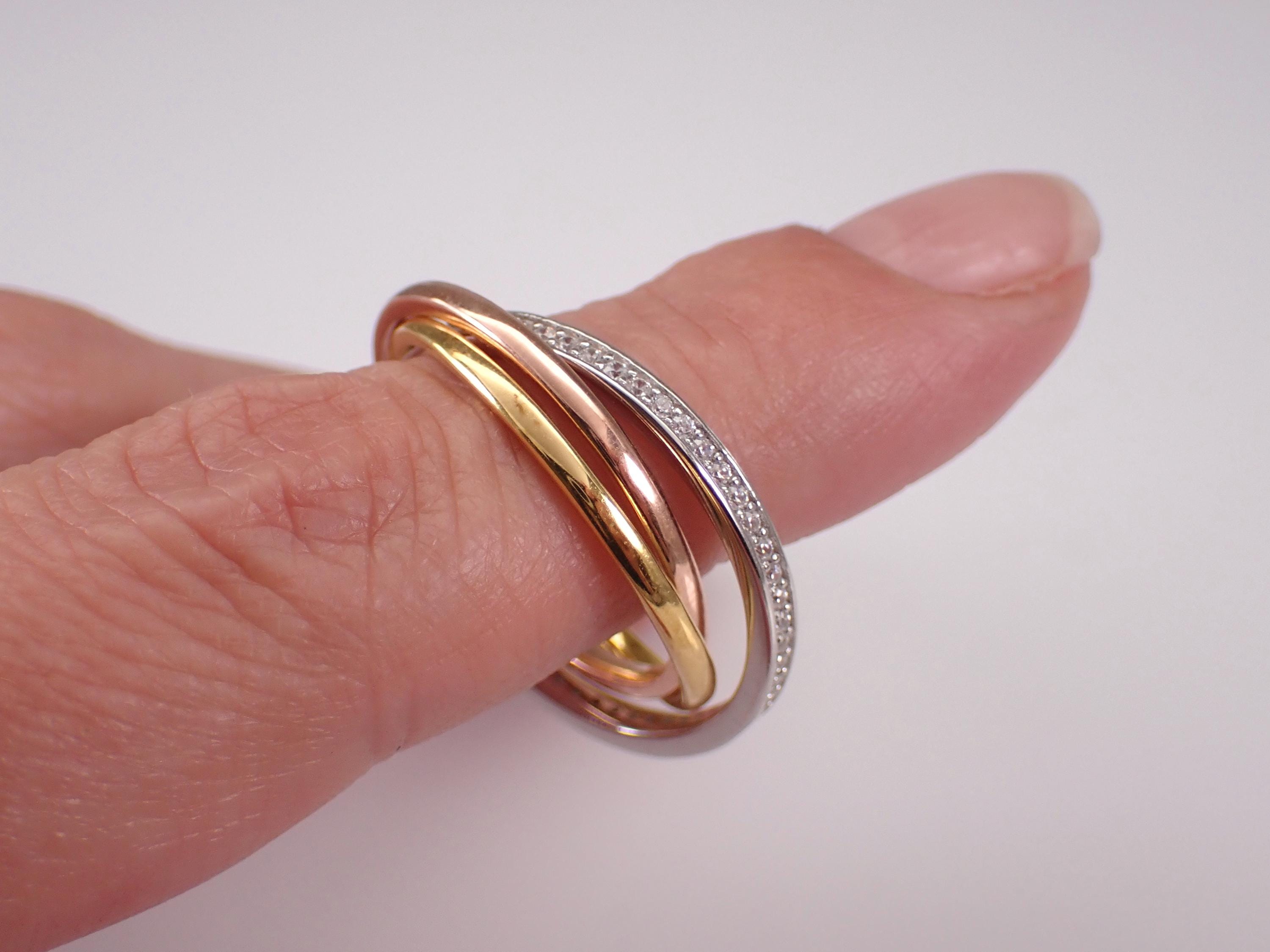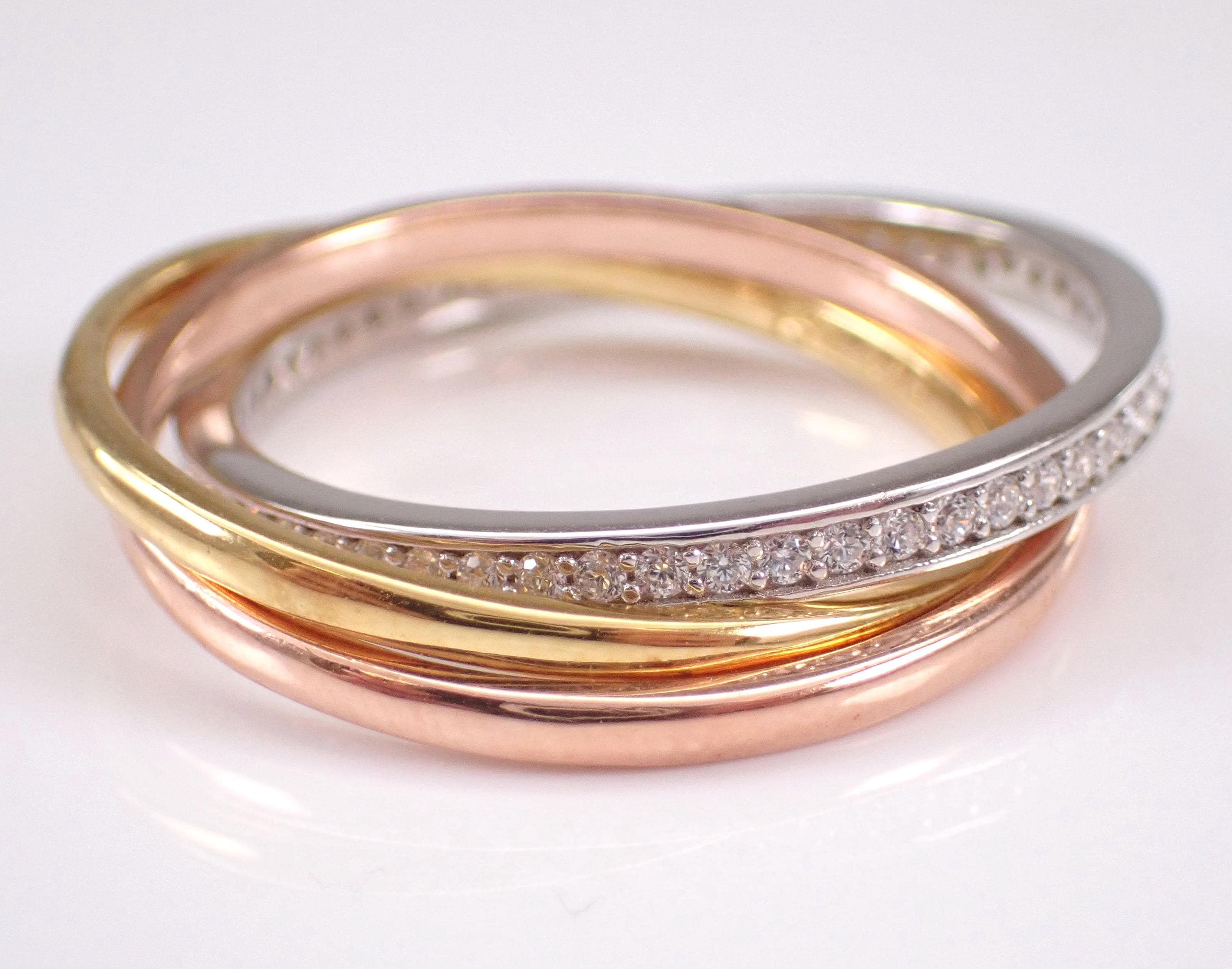 Sterling Silver Tri Color Eternity Rolling Wedding Ring Anniversary Band. There are three bands connected together, each a different color. The silver color Band is set with Cubic Zirconia. The Gold tone and Rose Tone bands are solid. These rings weigh 5.2 grams and a finger size 10. I will ship this ring promptly in a beautiful gift pouch.