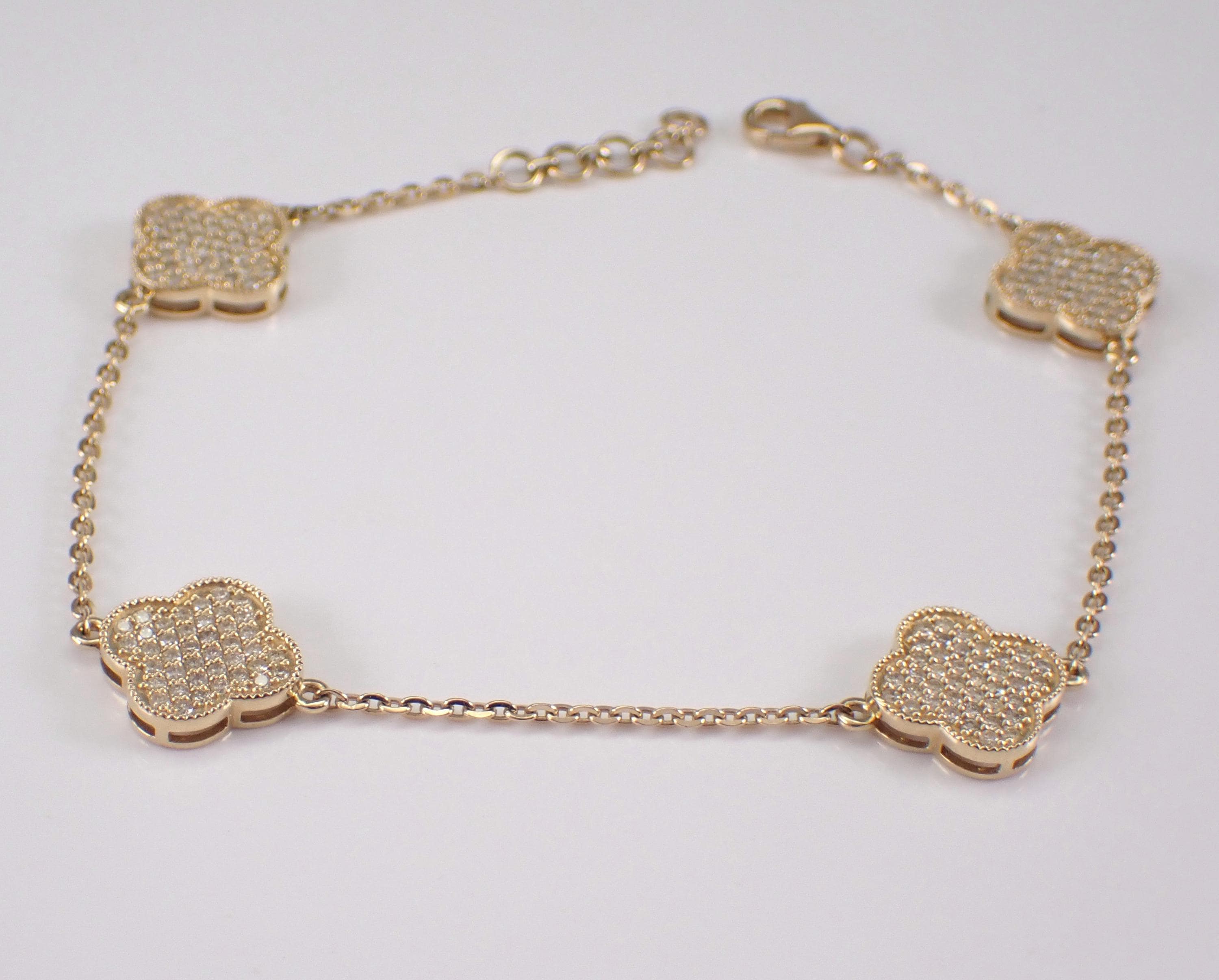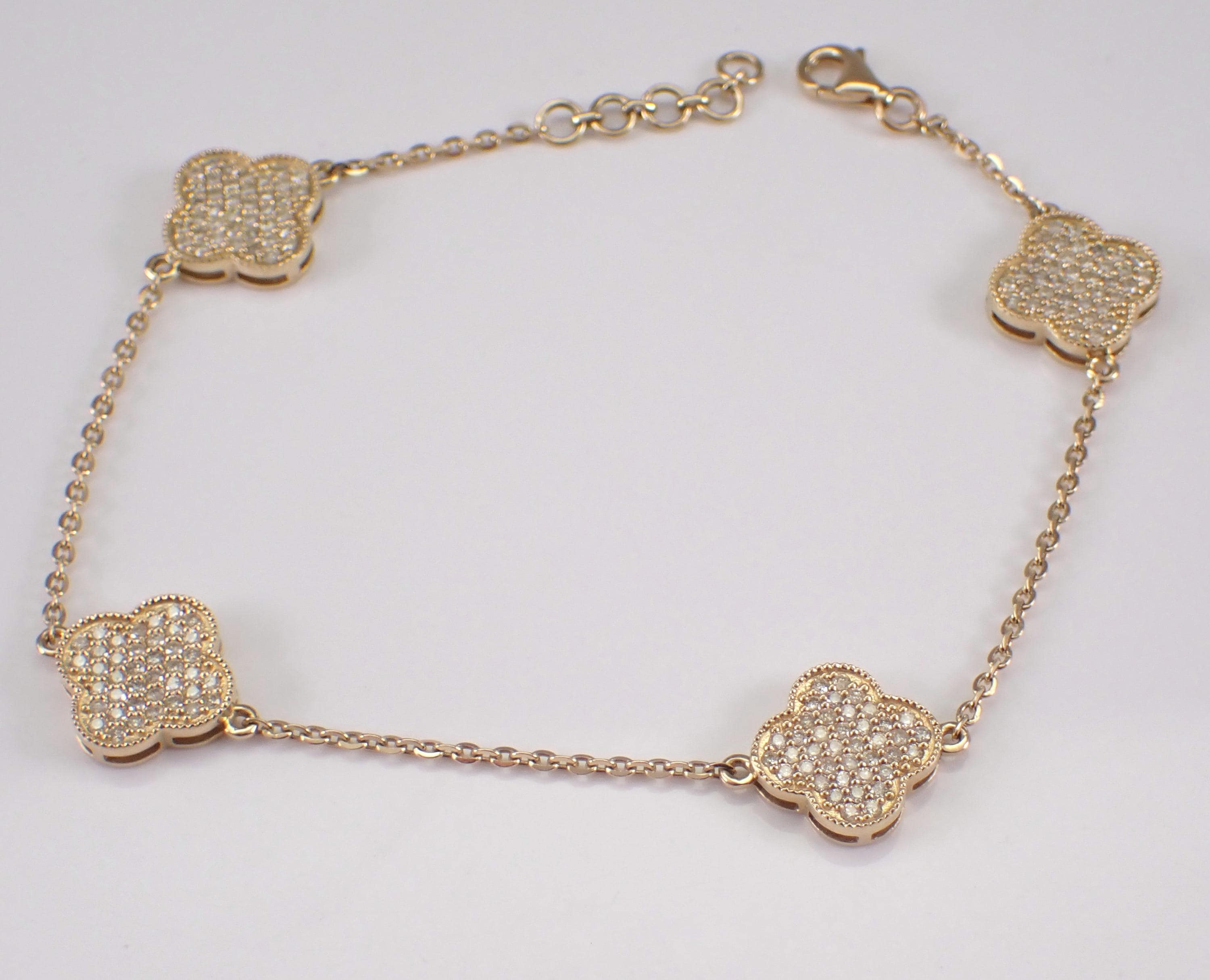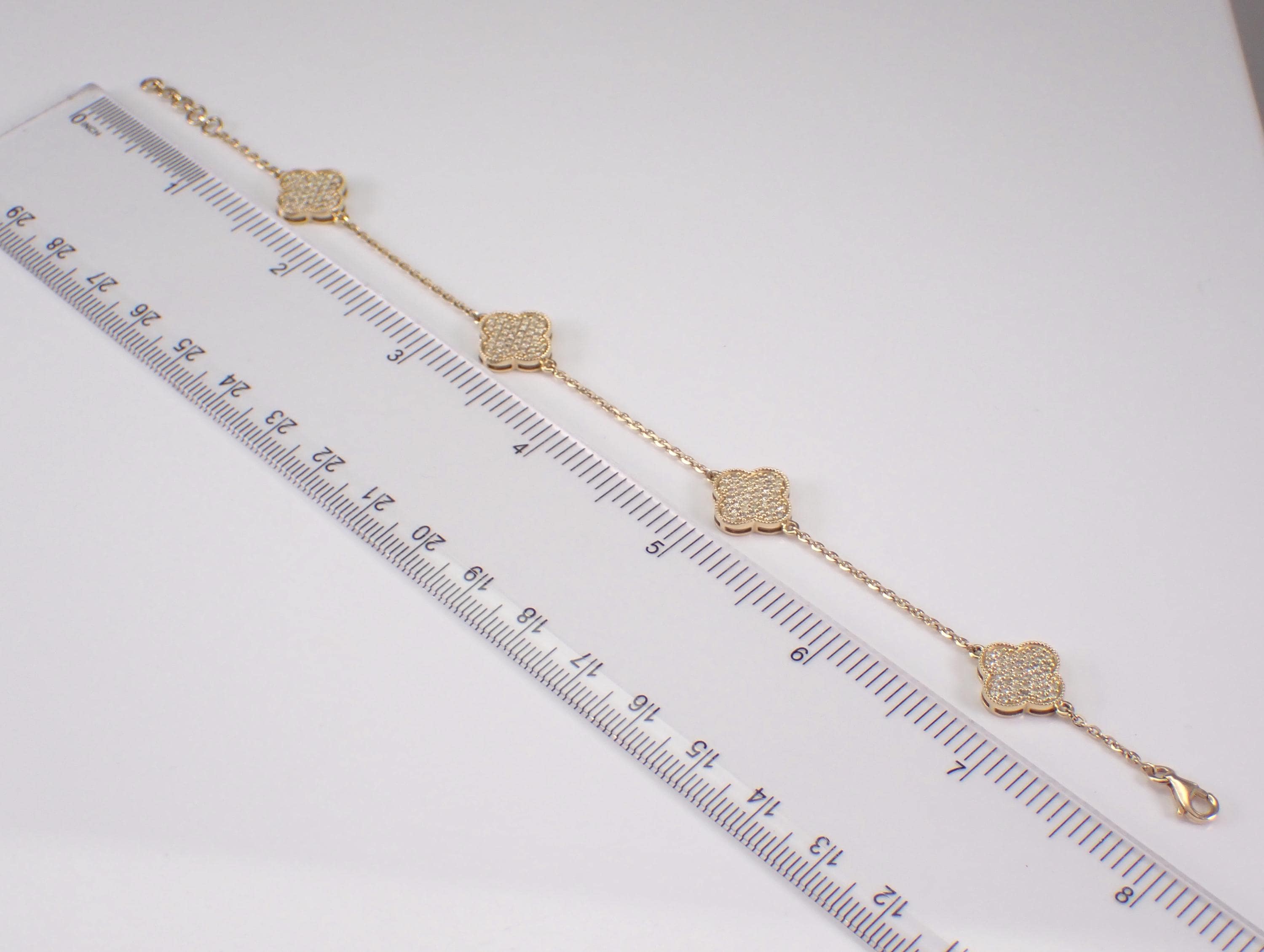 14K Yellow Gold Diamond Cluster Station Tennis Bracelet. This bracelet is set with one hundred and sixty (160) genuine Round Brilliant Diamonds. These diamonds are H color, SI/I1 clarity and weigh a total of 1.00 carat. This bracelet measures 7.75" in length overall but is adjustable for shorter 7" length, weighs 5.6 grams and is 14KT Yellow Gold. Each clover cluster measures 12 X 12 mm. This bracelet will be accompanied by an appraisal written by a GIA Certified Diamond Grader with the retail replacement value of $4,095.00. I will ship this bracelet promptly in a beautiful gift box.
