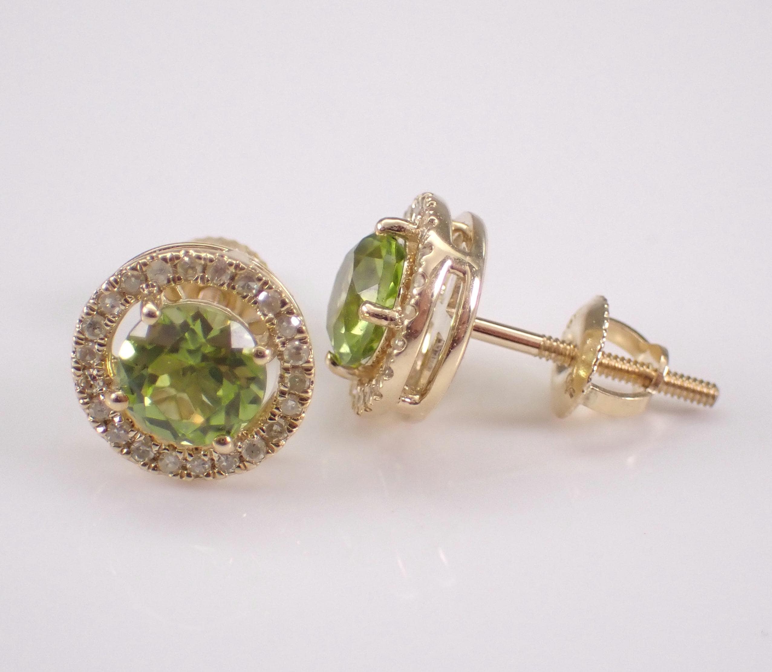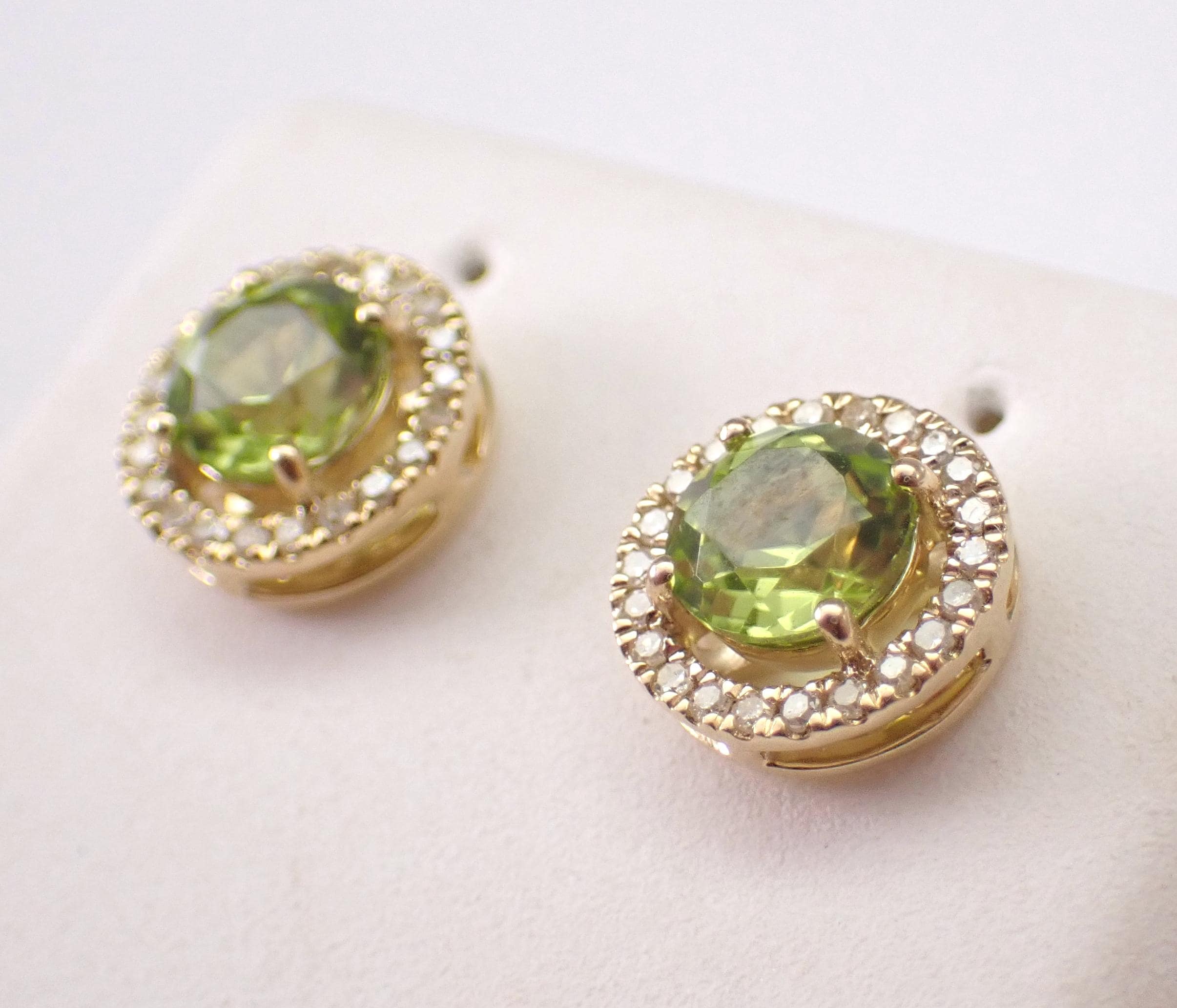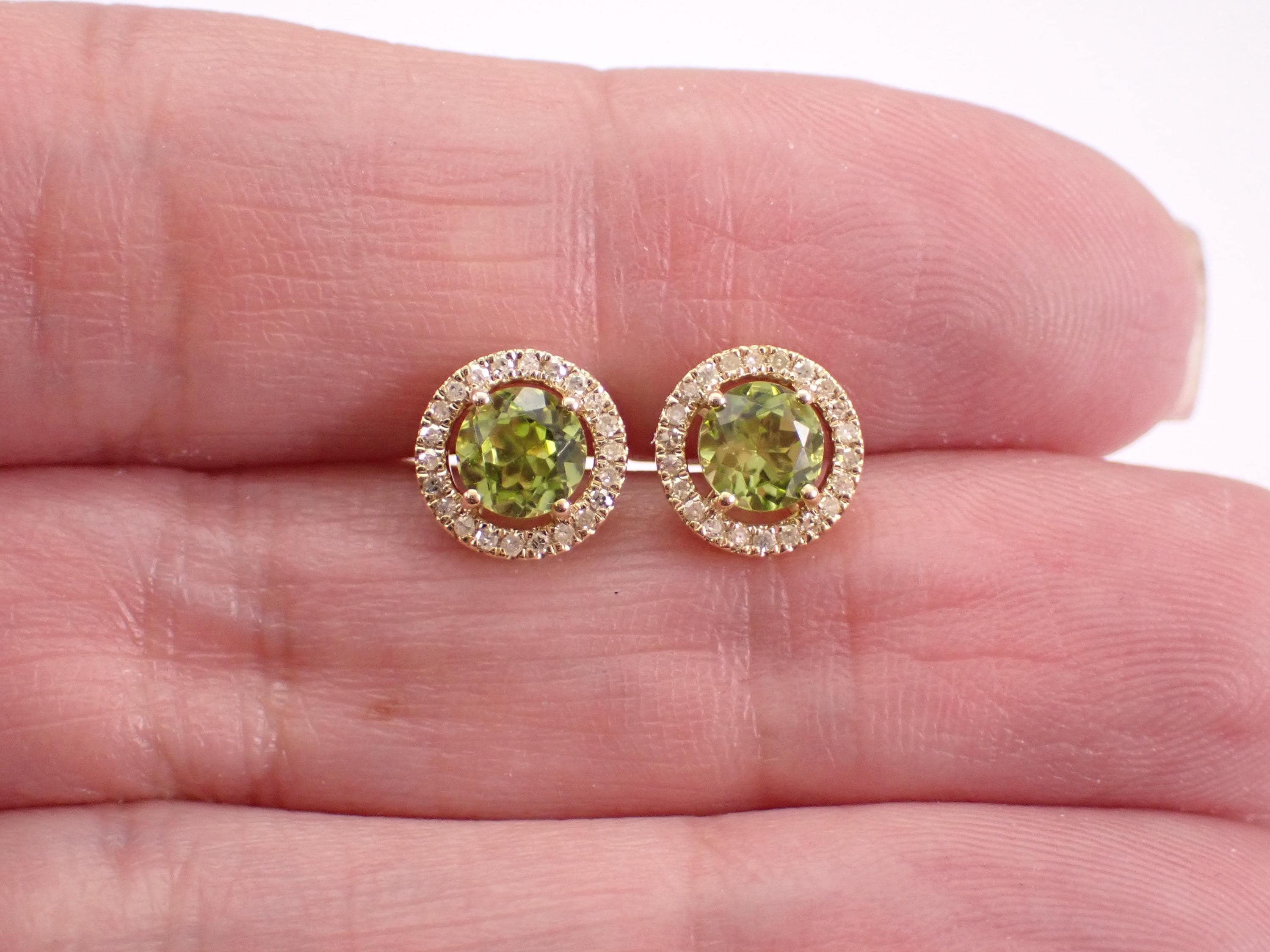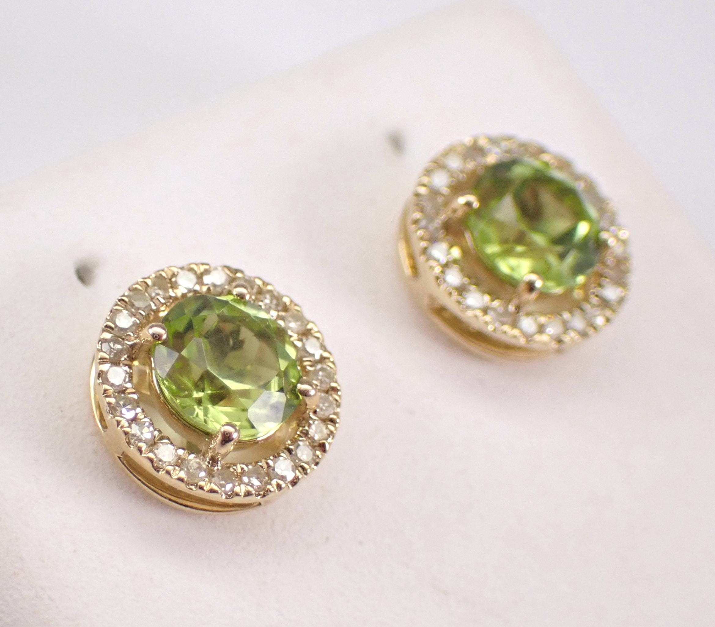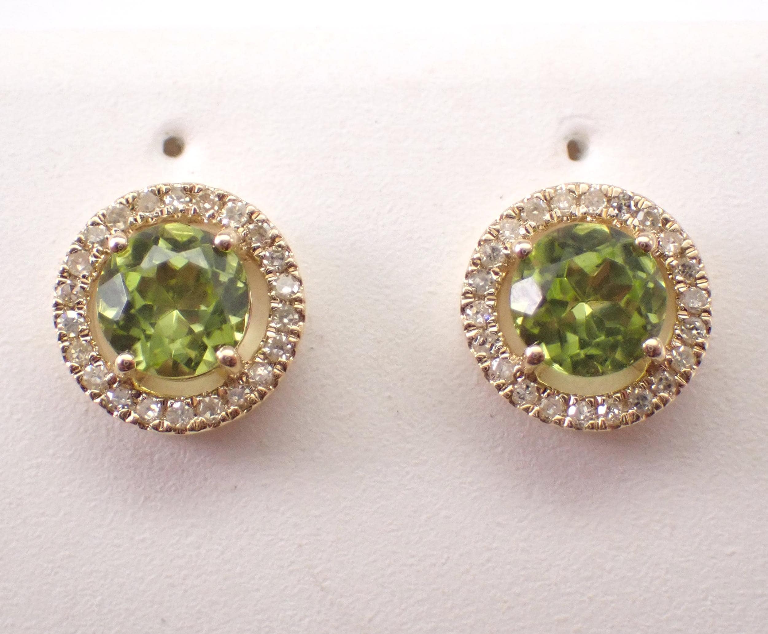 Yellow Gold Diamond and Peridot Halo Stud Earrings.
