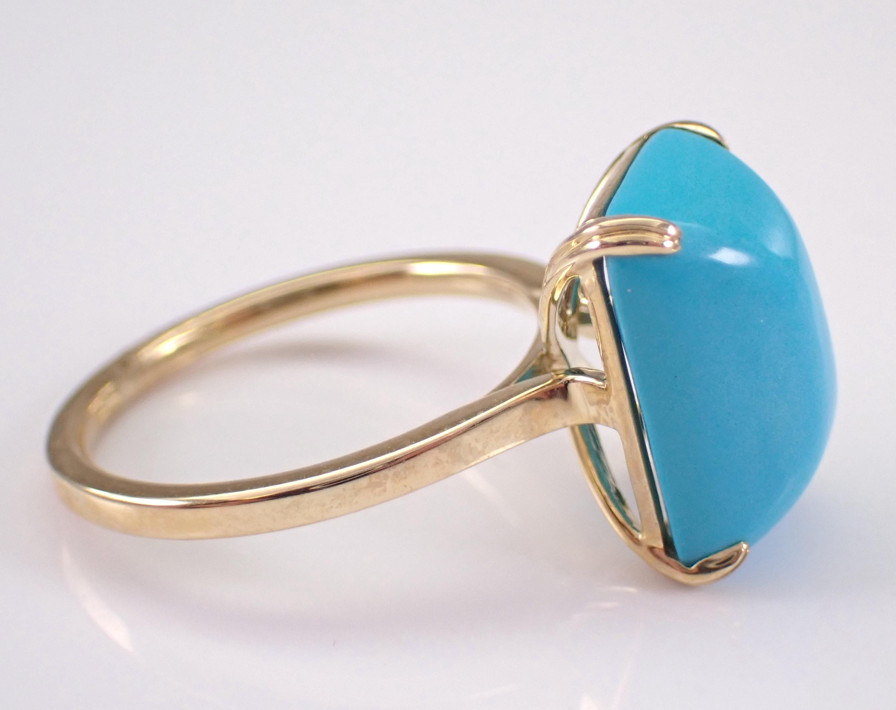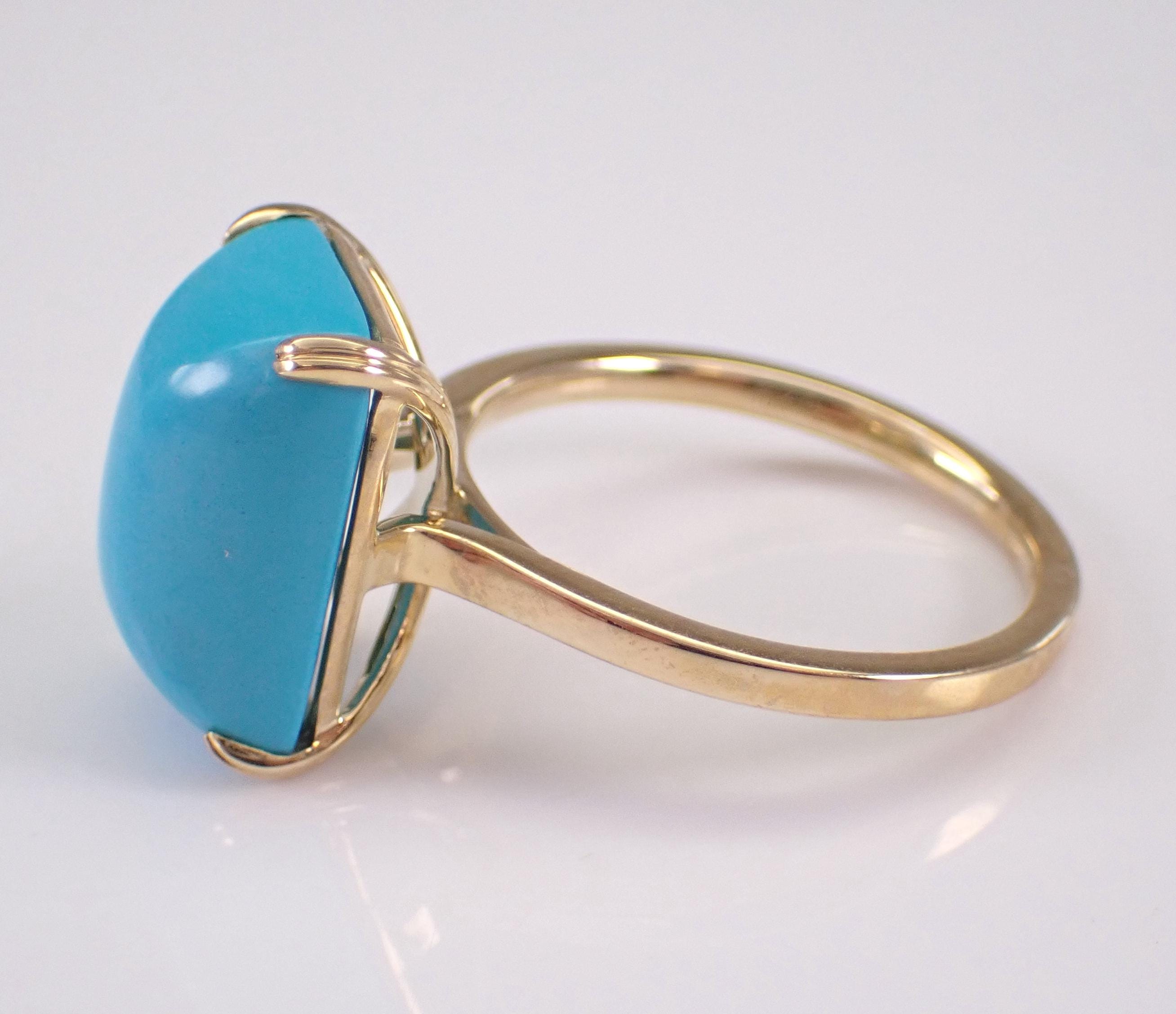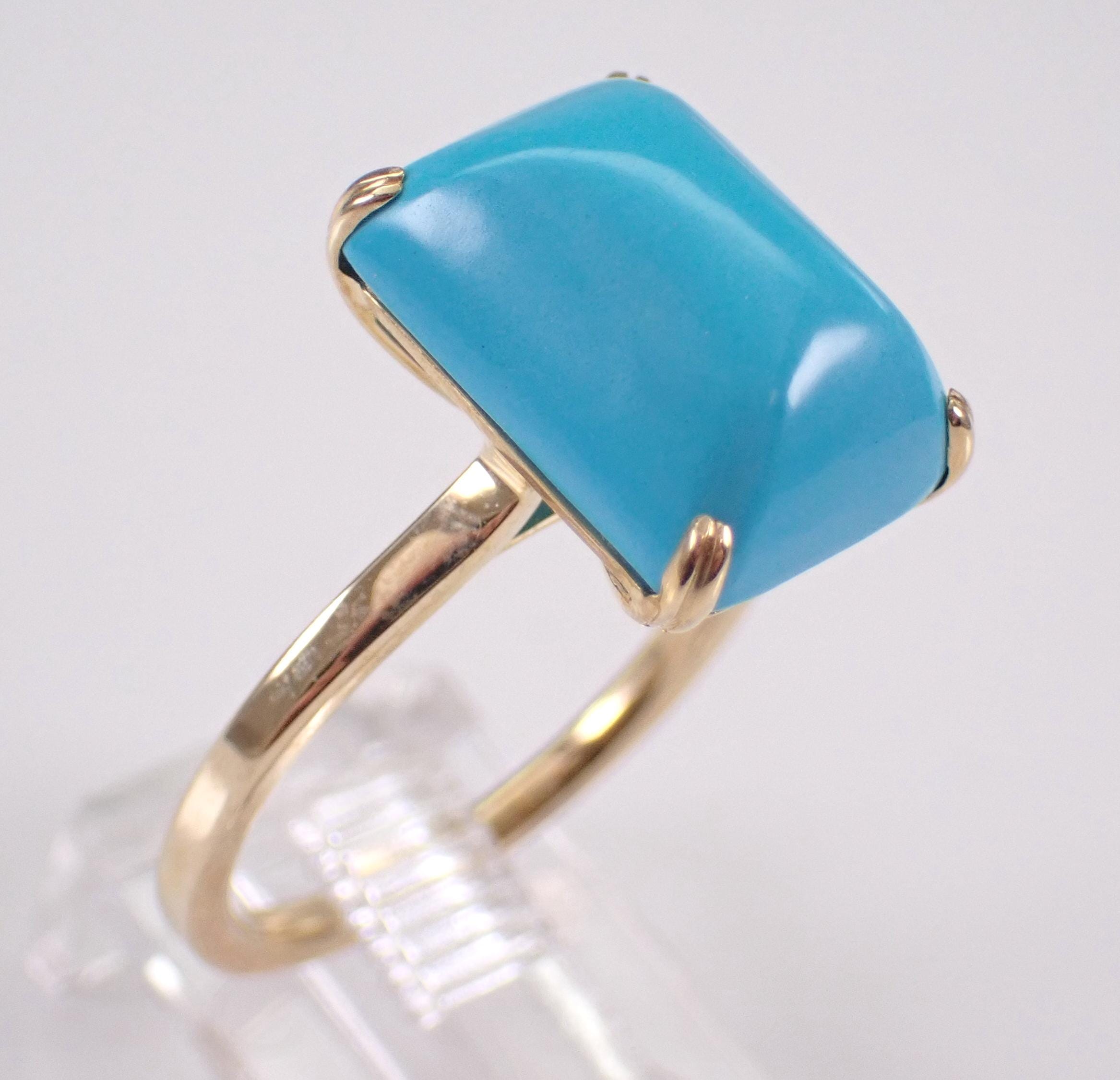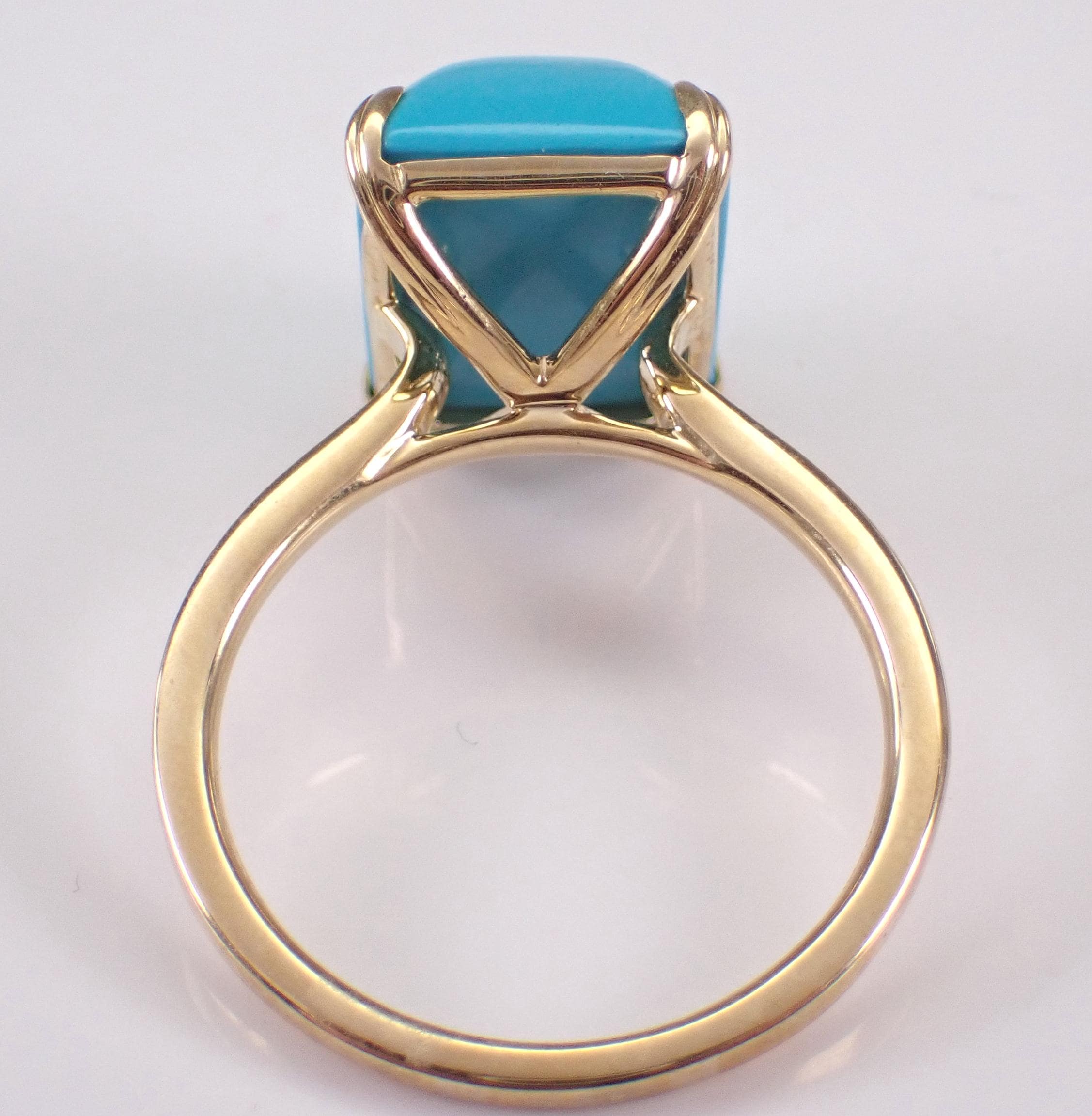 Yellow Gold Turquoise Ring. This ring is set with one Cushion cut Cabochon Turquoise in the center. This Turquoise measures 14 X 10 mm, a beautiful even Teal color and weighs 6 carats. This ring is 10KT Yellow Gold, weighs 3.7 grams and is a finger size 7, which can be resized (please inquire about sizing with the finger size that you would need). I will ship this ring promptly in a beautiful gift box.