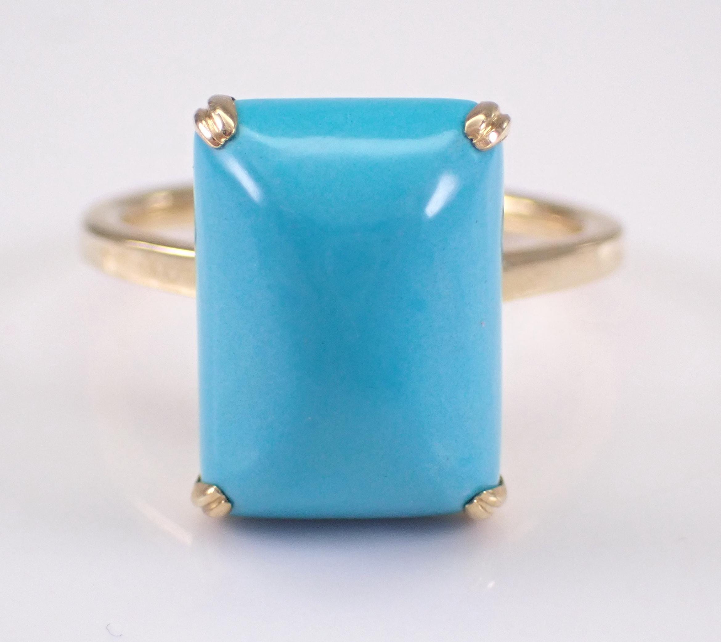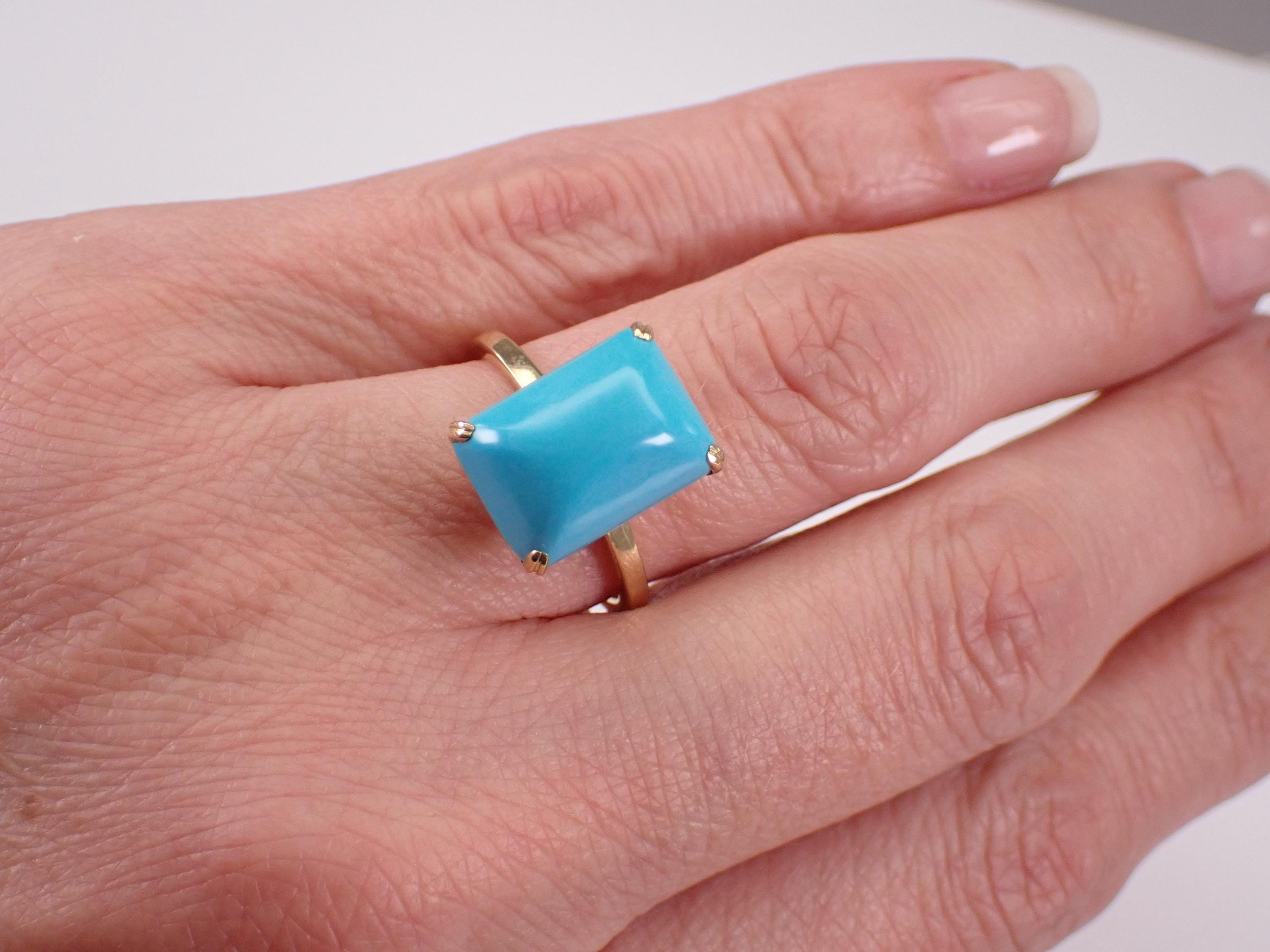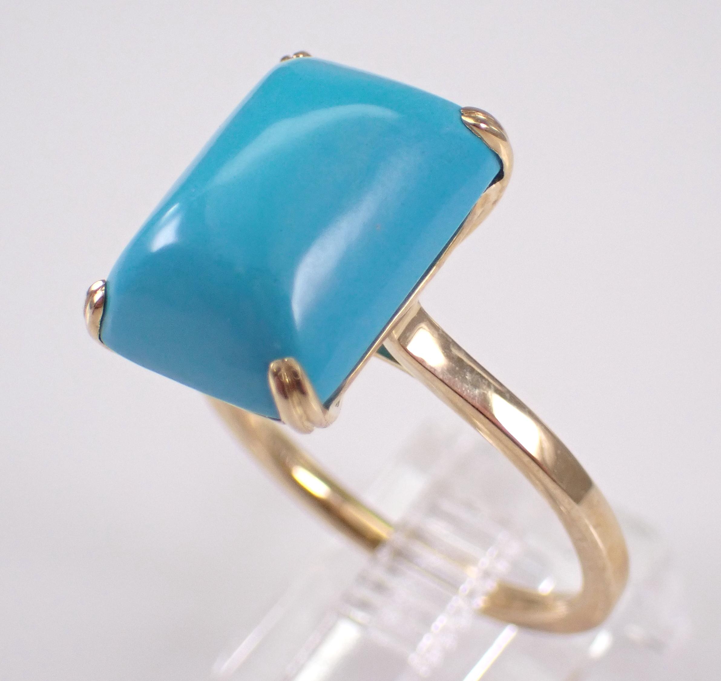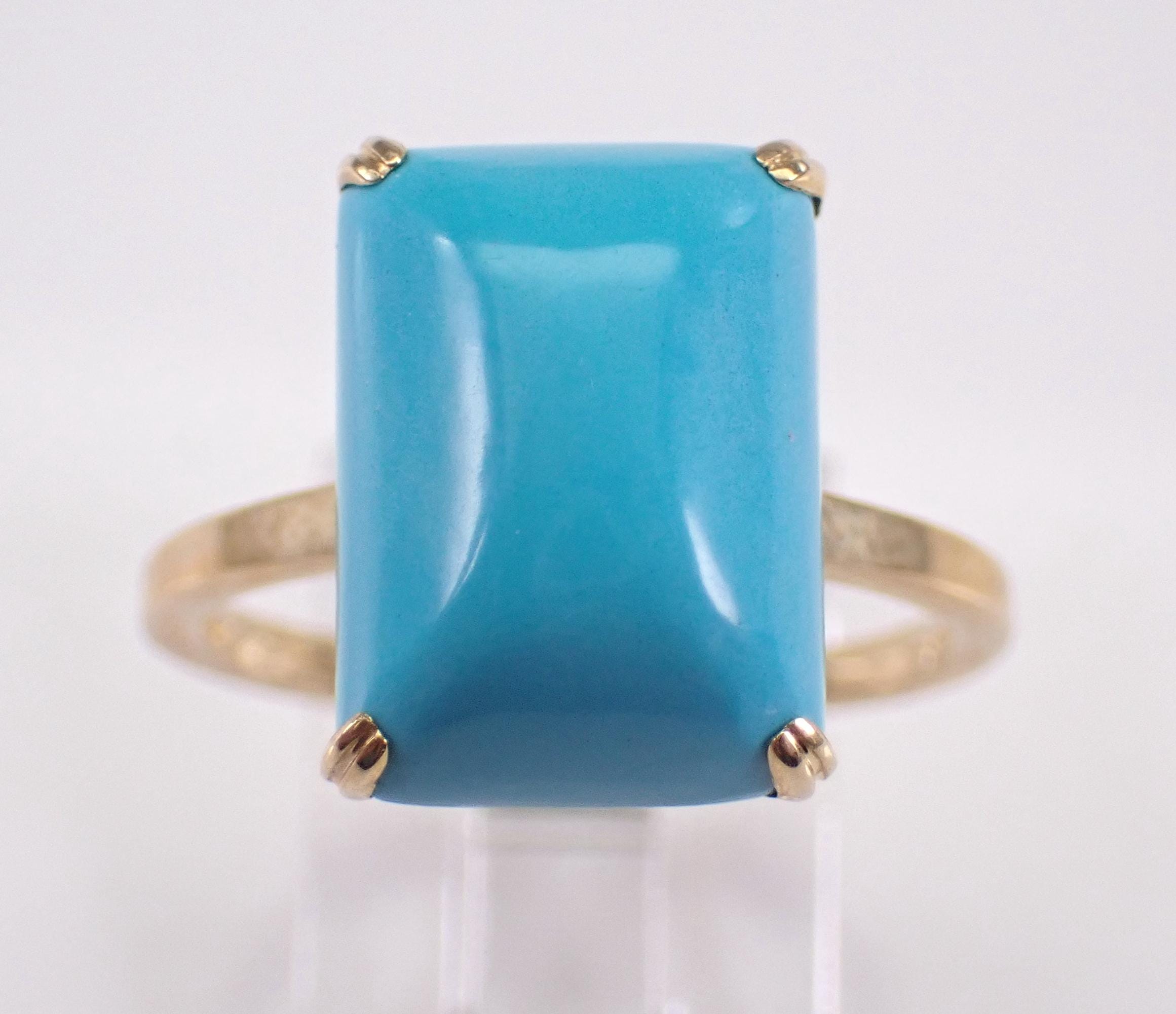 Yellow Gold Turquoise Ring. This ring is set with one Cushion cut Cabochon Turquoise in the center. This Turquoise measures 14 X 10 mm, a beautiful even Teal color and weighs 6 carats. This ring is 10KT Yellow Gold, weighs 3.7 grams and is a finger size 7, which can be resized (please inquire about sizing with the finger size that you would need). I will ship this ring promptly in a beautiful gift box.