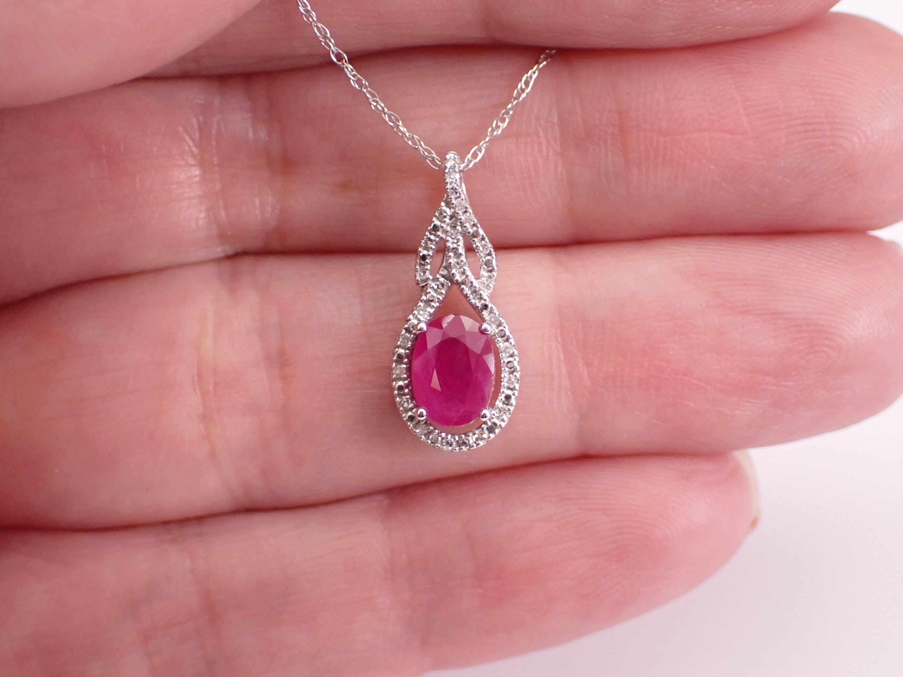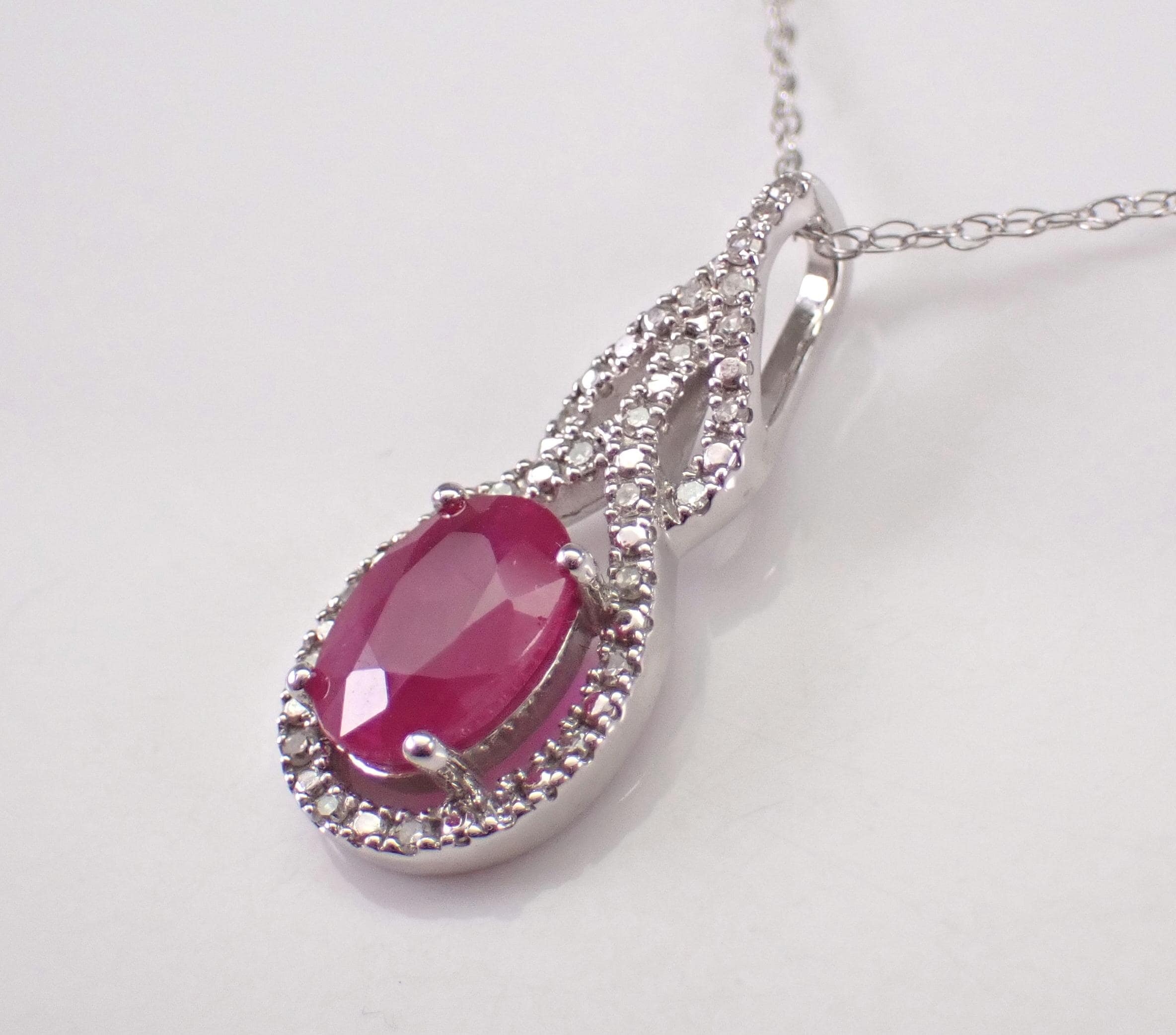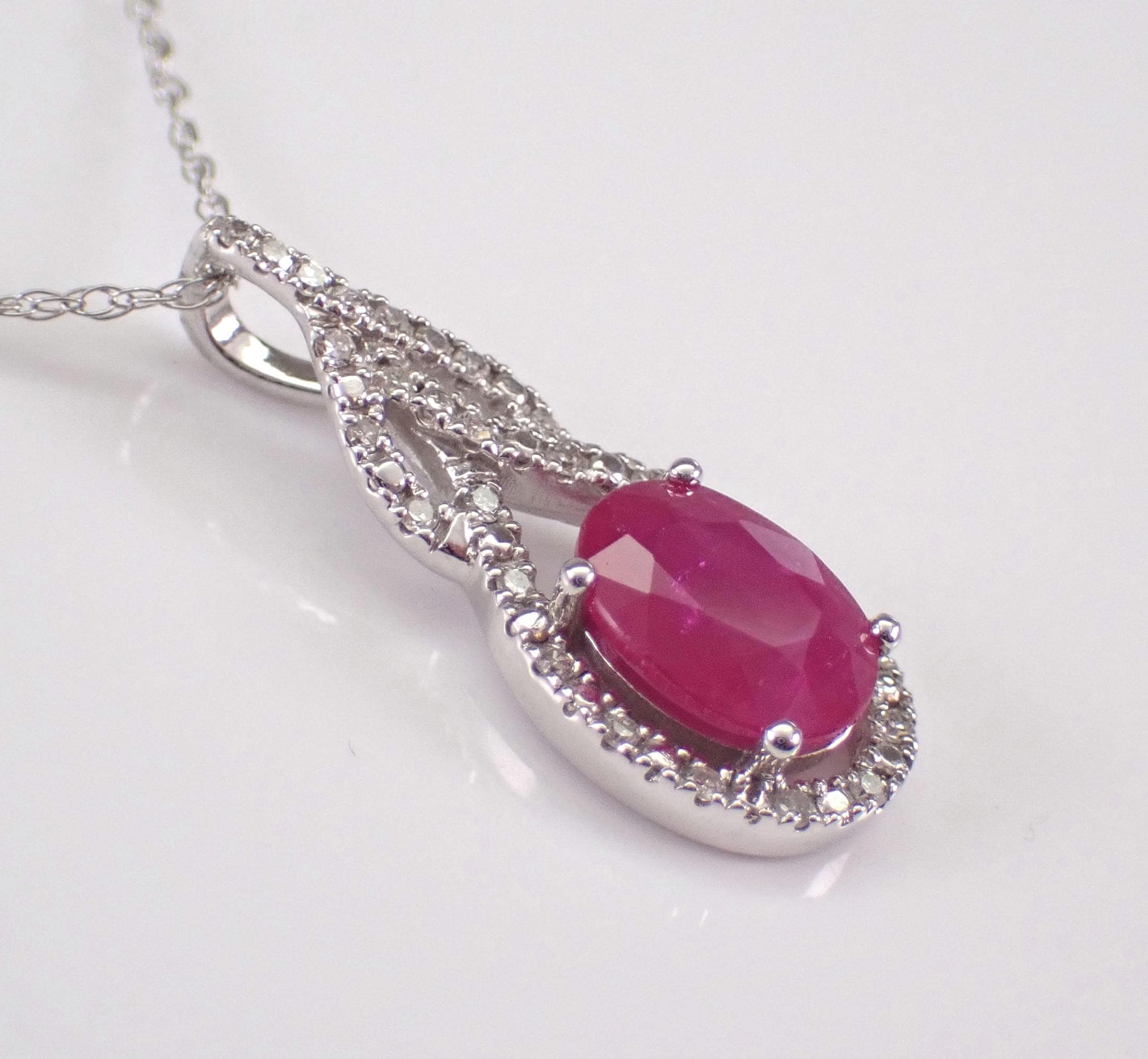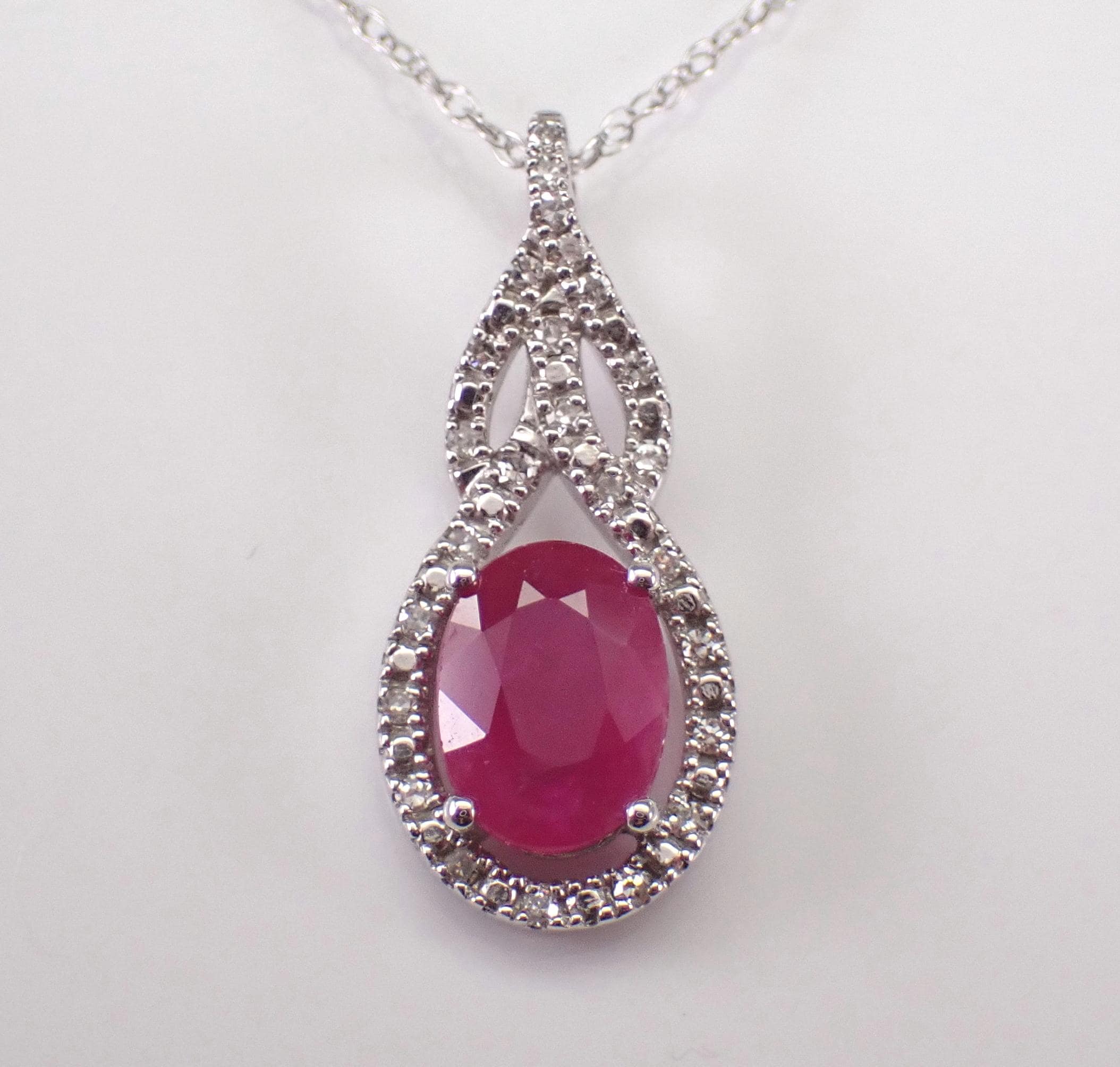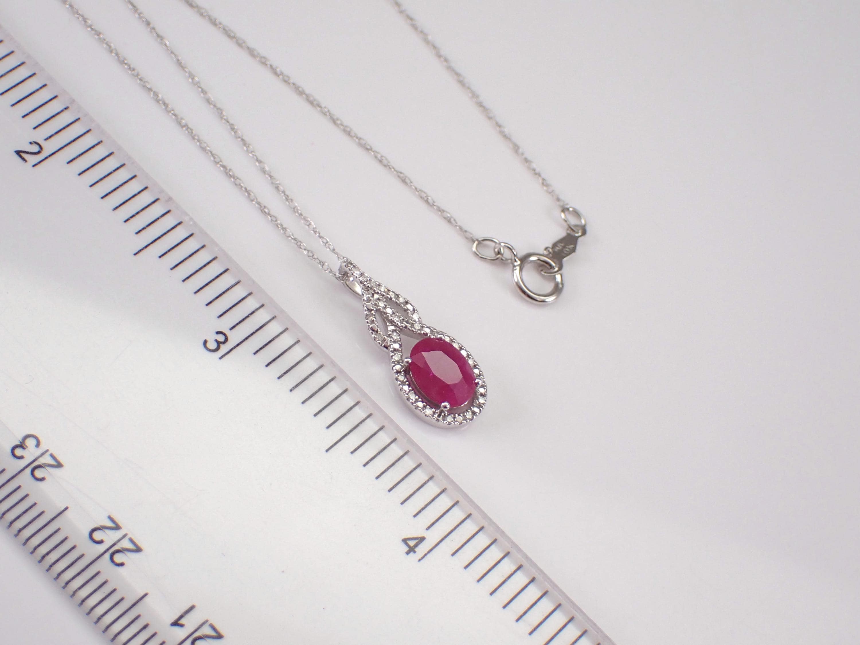 14K White Gold Diamond and Ruby Halo Pendant Necklace with Chain. This Necklace is set with an Oval Ruby in the center. This Ruby measures 7 X 5 mm and weighs 1 carat. There are also twenty-five Round Diamonds set in this pendant. These diamonds are H color, I1 clarity and weigh a total of .10 carat. The pendant comes with an 18" 14K White Gold chain and together weigh 1.7 grams. The pendant measures 19 X 8 mm. This necklace will be accompanied by an appraisal written by a GIA Certified Diamond Grader with the retail replacement value of $1,395.00. I will ship this necklace promptly in a beautiful gift box.