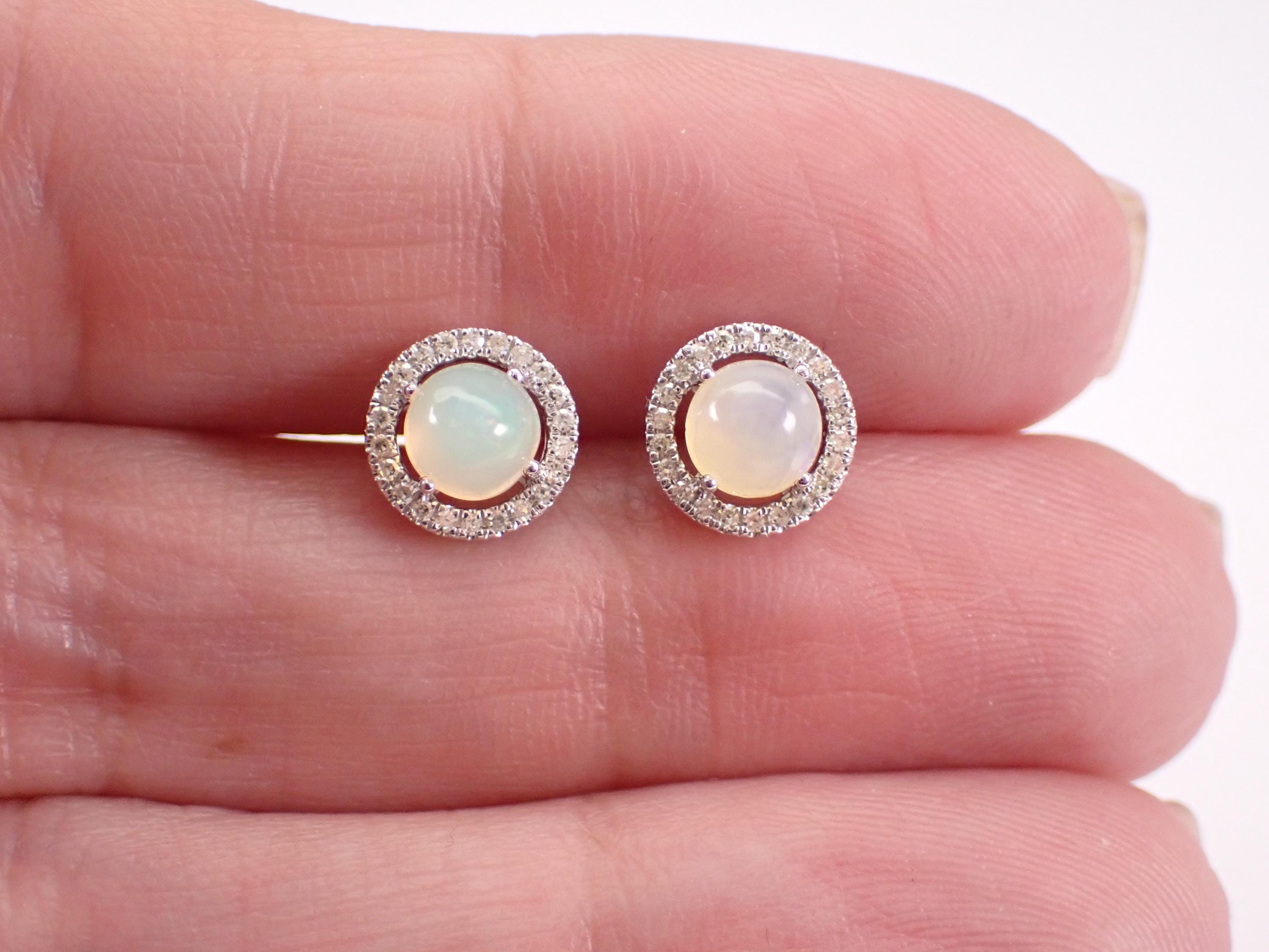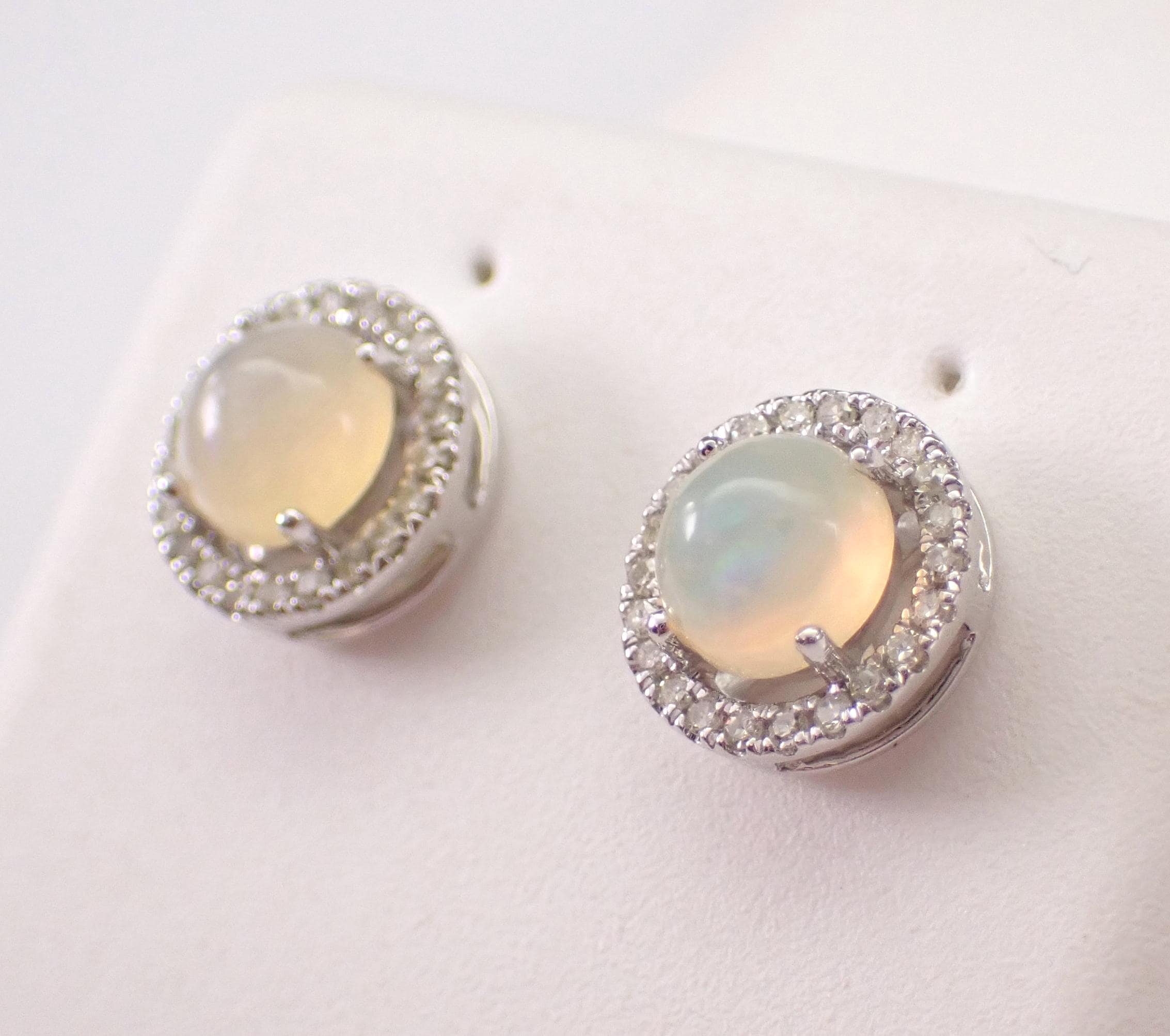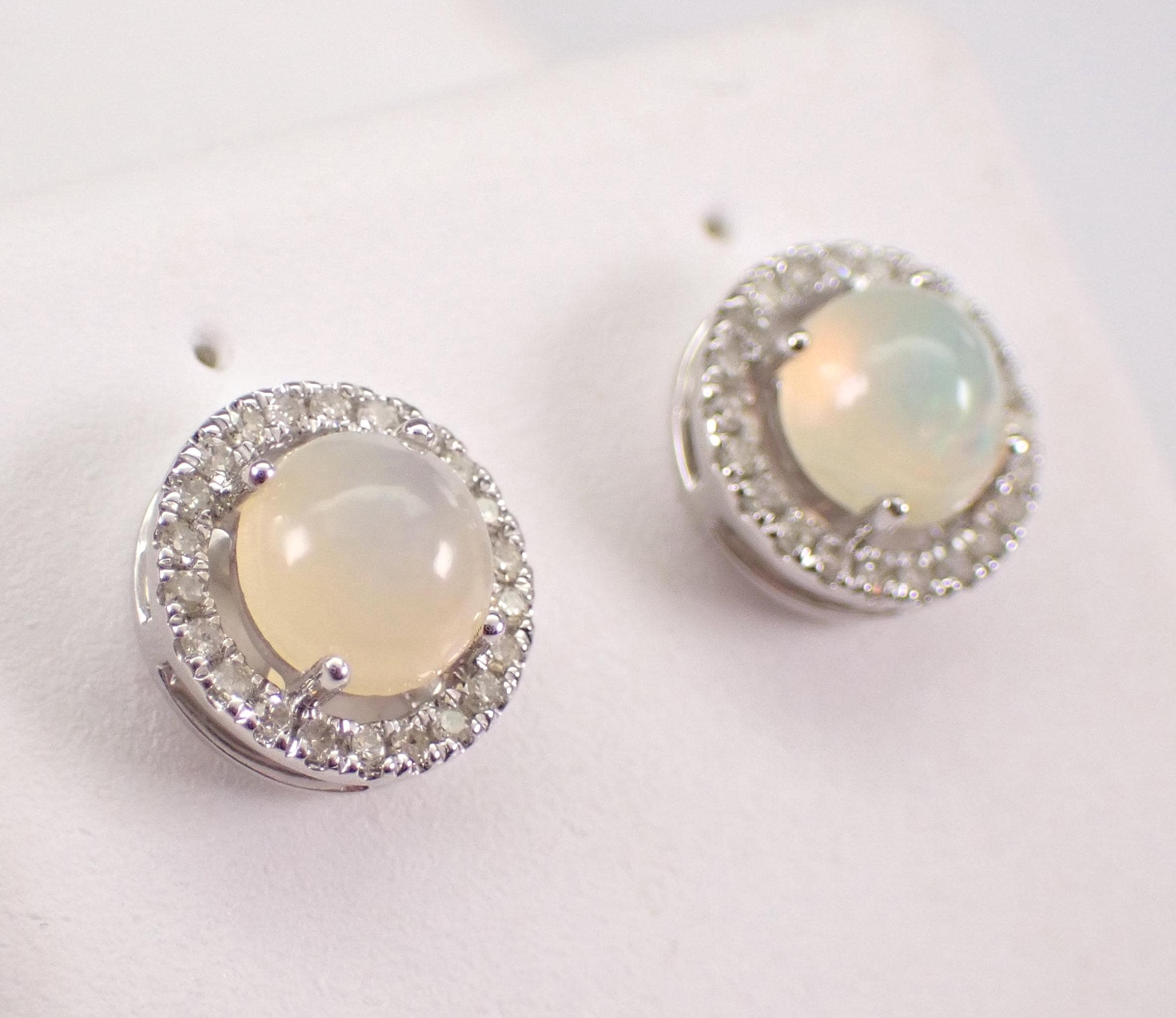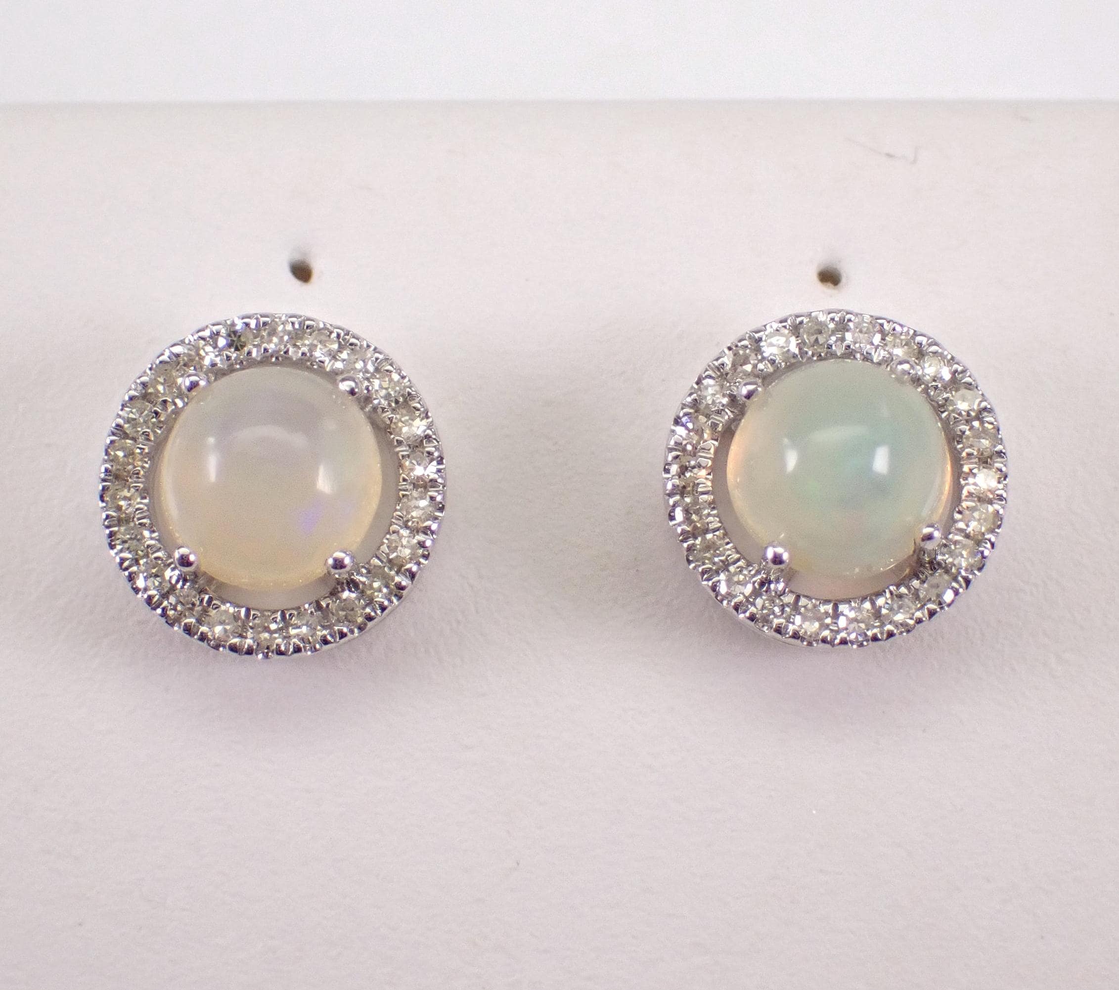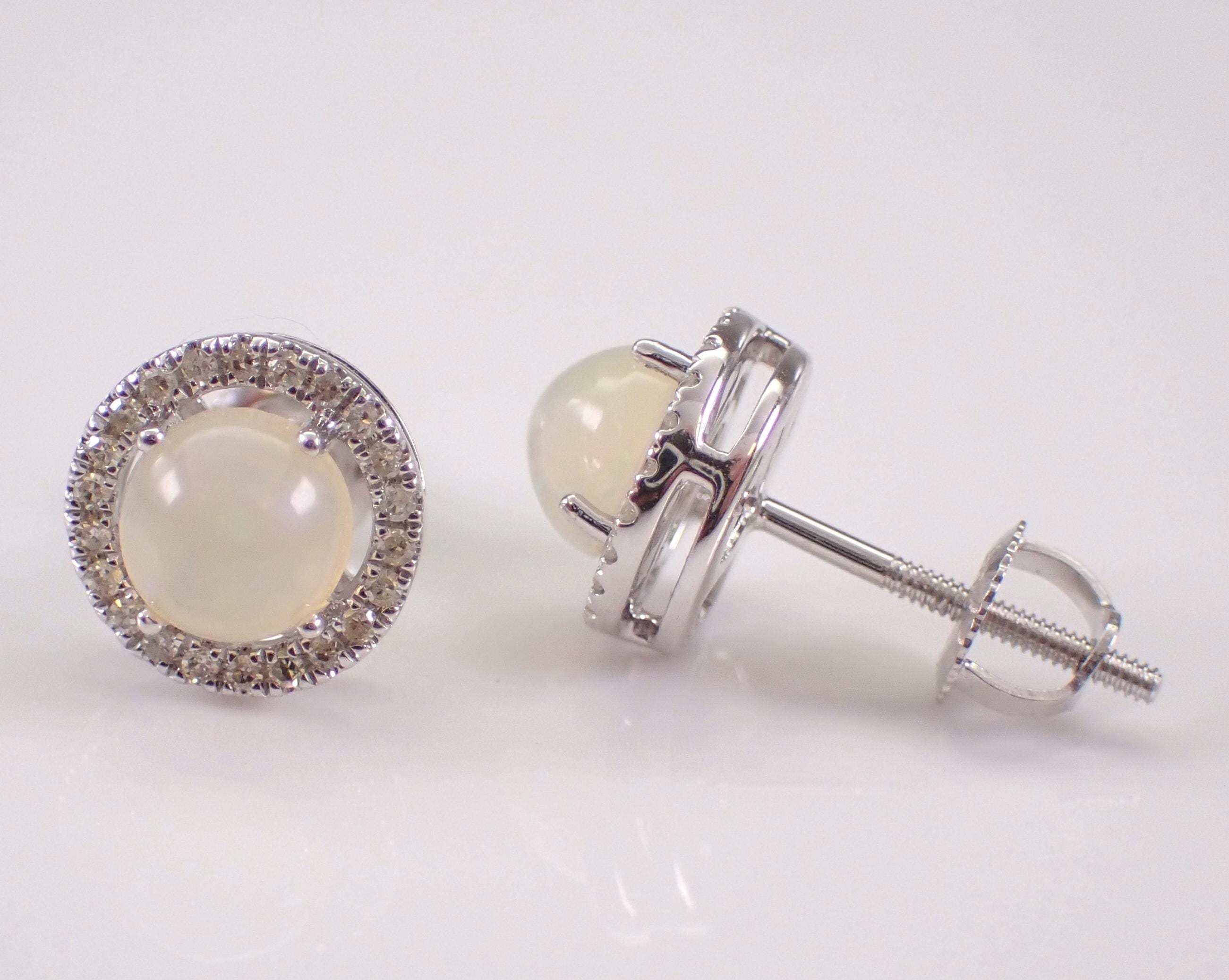 White Gold Diamond and Opal Stud Earrings. There is one Round Opal set in each earring. These Opal measure 5 mm each and weigh a total of 3/4 carat. There are twenty-two Round Brilliant Diamond set in EACH earring. These diamonds are H color, SI/I1 clarity and weigh a total of .15 carat. These earrings are 10KT White Gold and weigh a total of 1.6 grams. These earrings are for pierced ears, measure 8 mm in diameter each and have Screw Back closures. These earrings will be accompanied by an appraisal written by a GIA Certified Diamond Grader with the retail replacement value of $1,395.00. I will ship these earrings promptly in a gift box.
