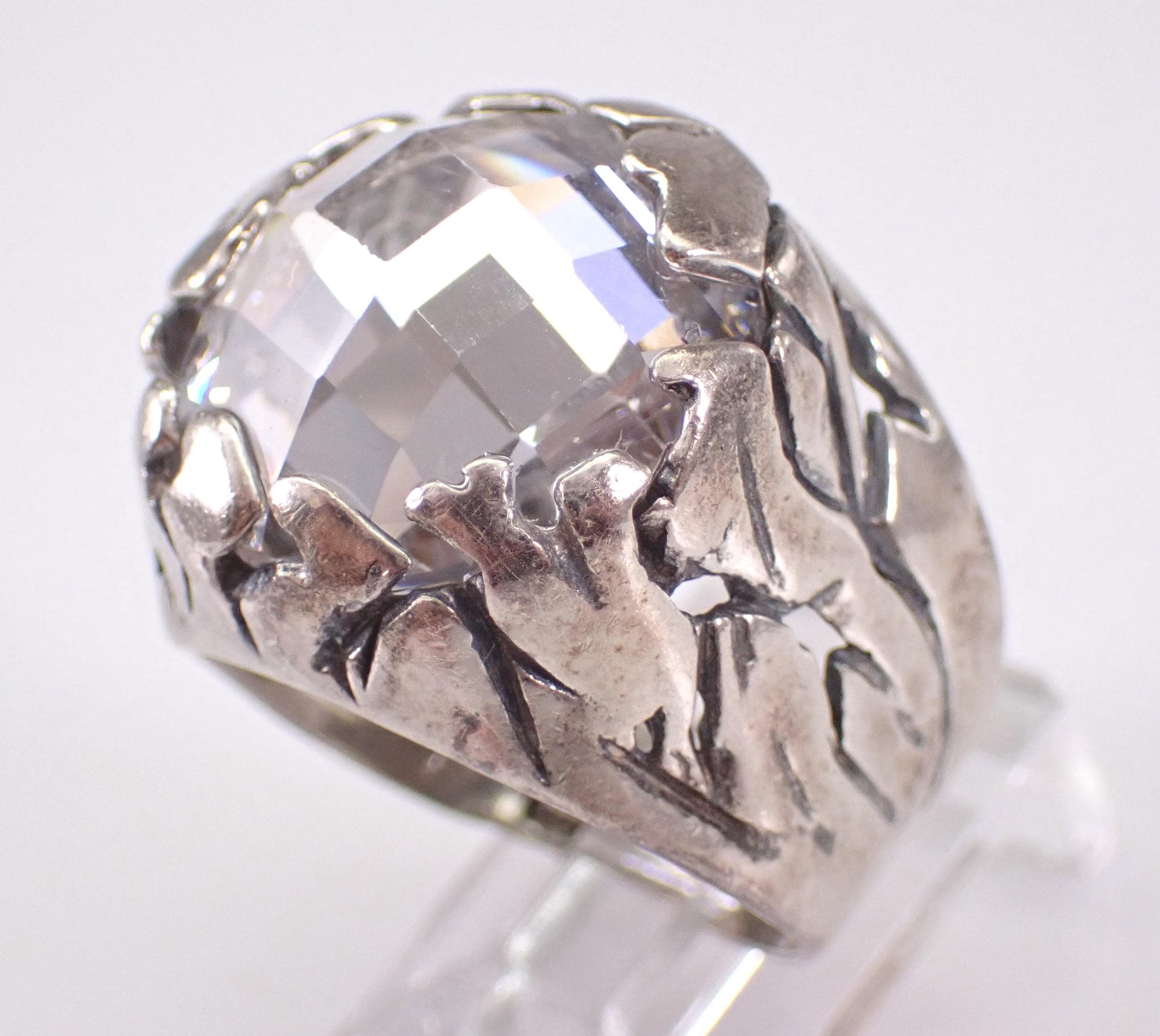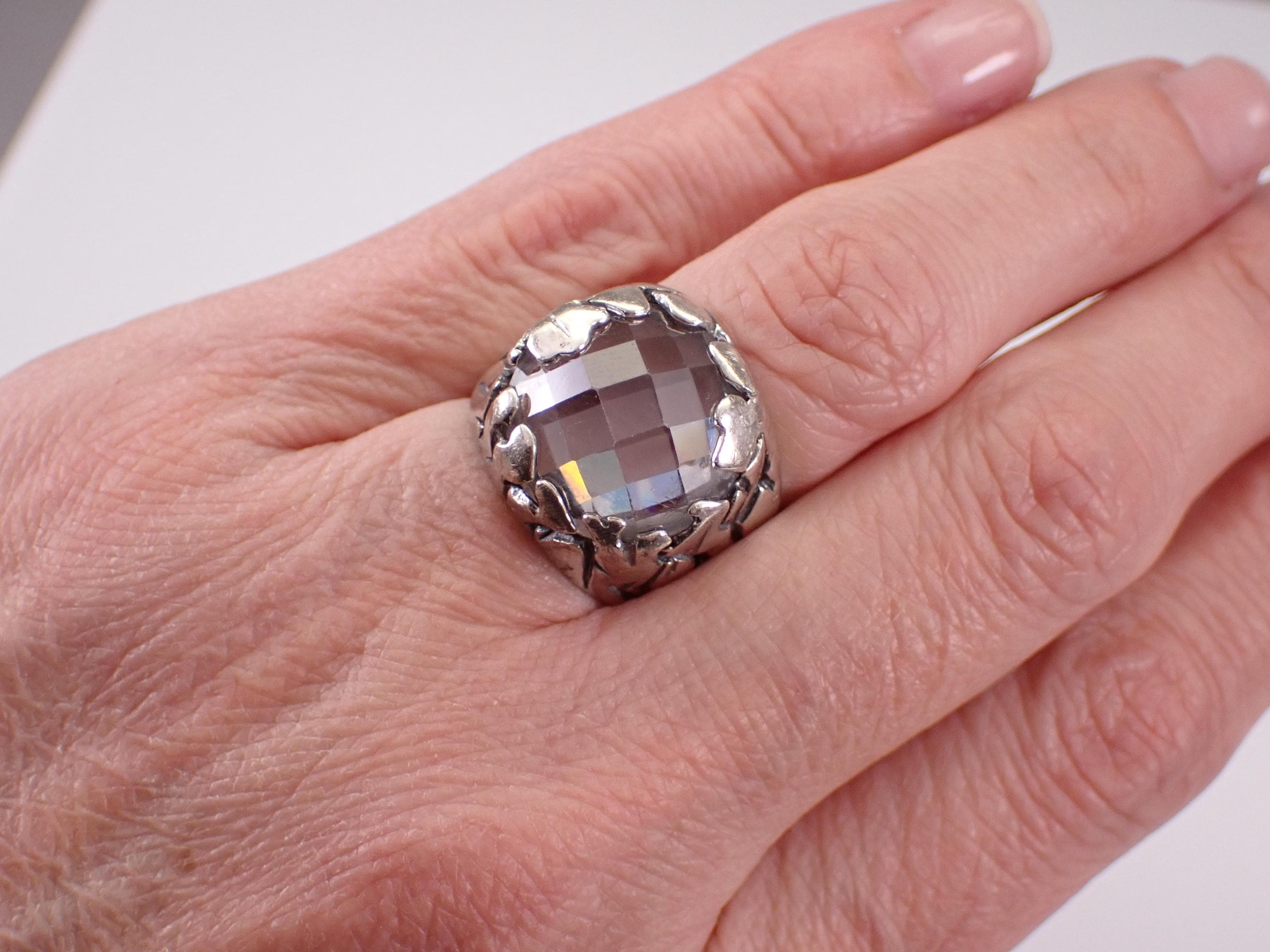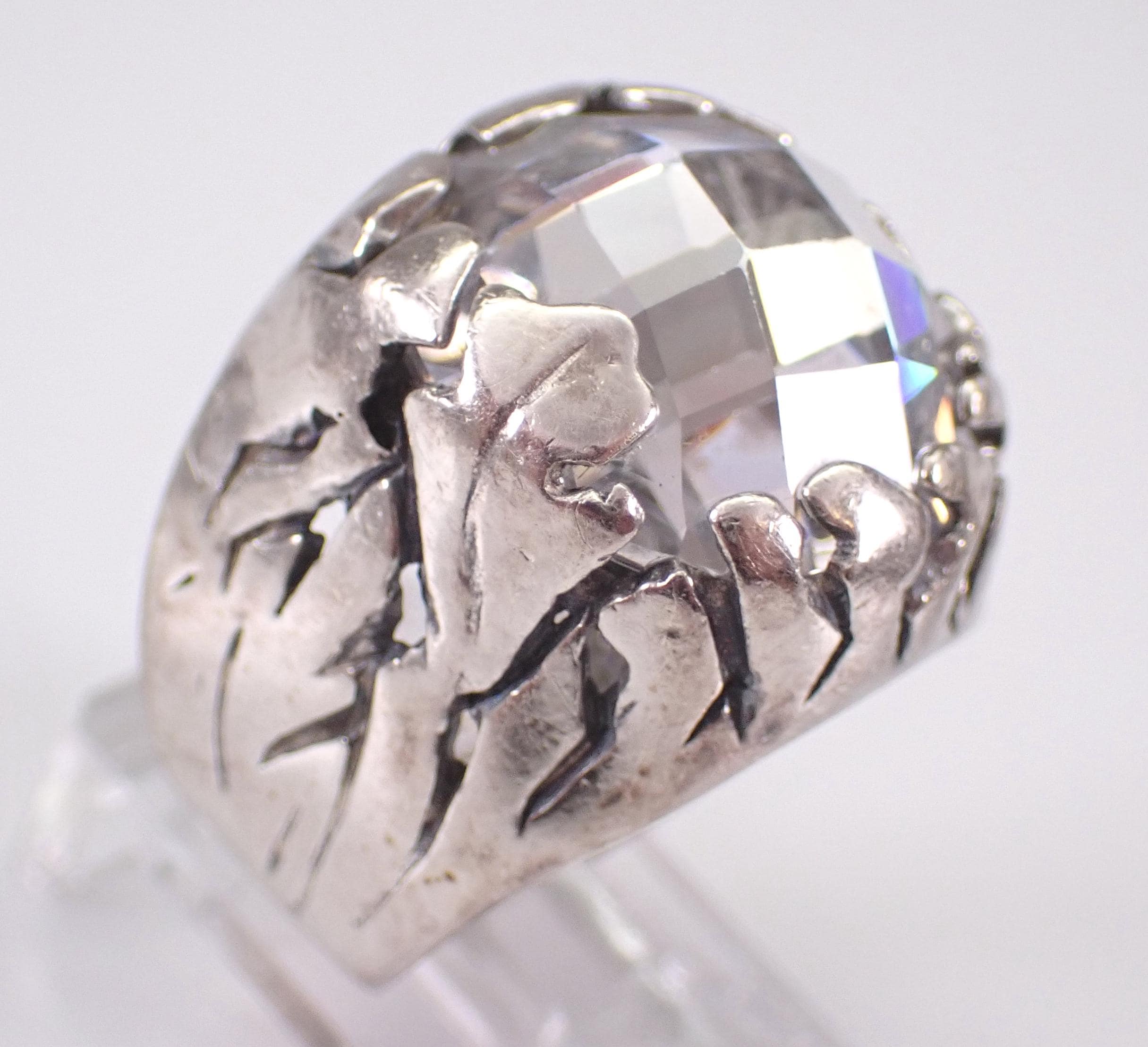 Vintage Sterling Silver Cubic Zirconia Engagement Ring. This ring is set with one Round Cubic Zirconia (CZ) in the center. This Cubic Zirconia measures 16 mm in diameter. This ring is Sterling Silver, weighs 10.9 grams and is a finger size 7. I will ship this ring promptly in a beautiful gift box.