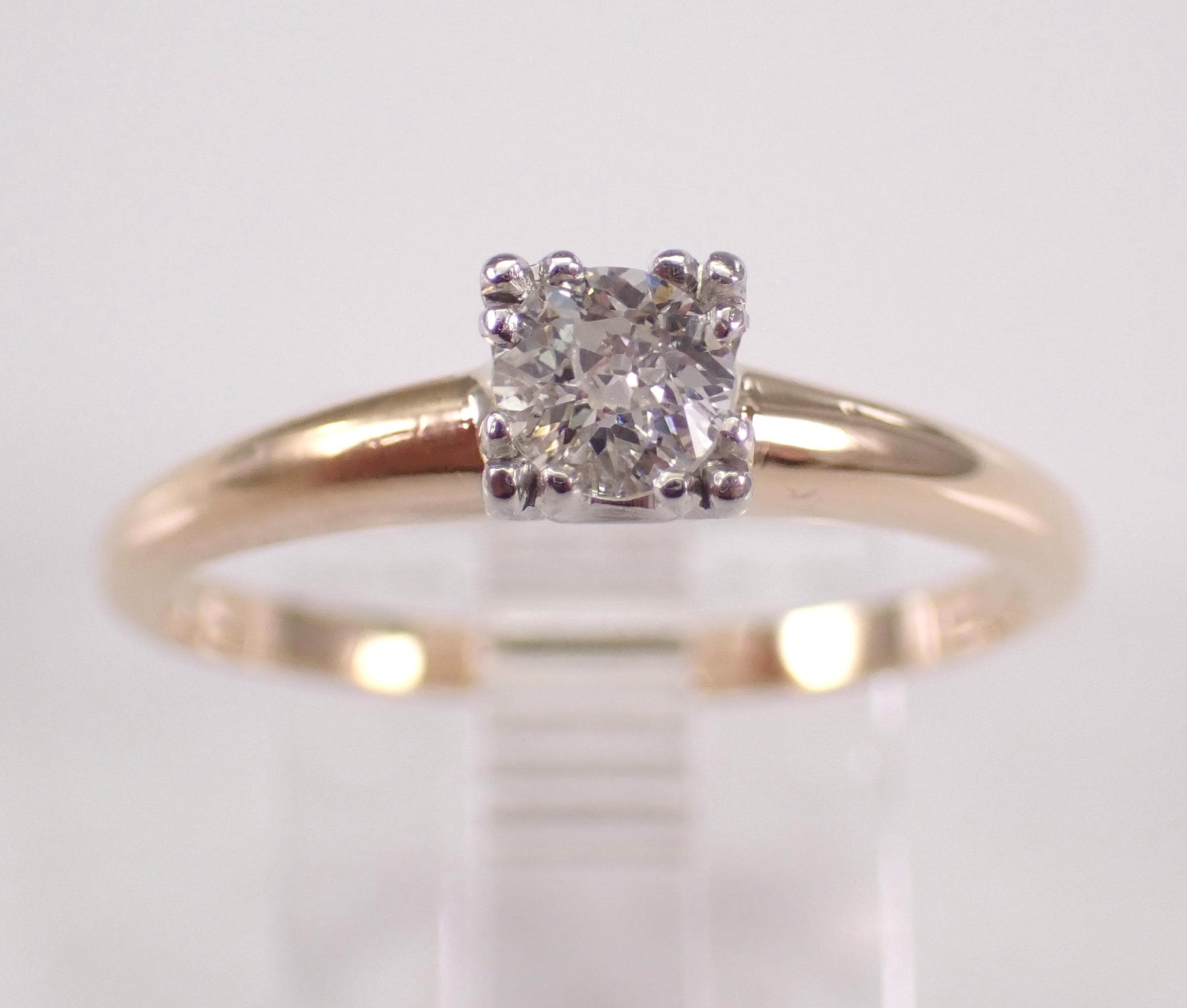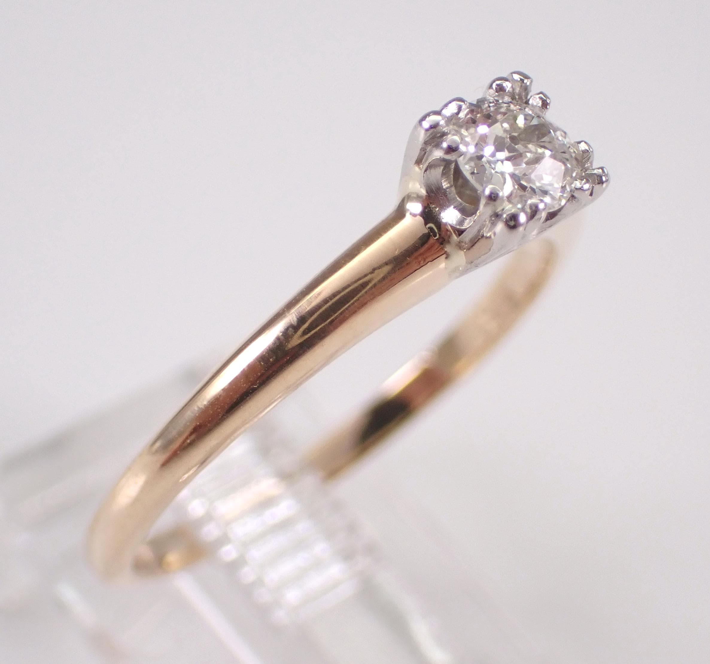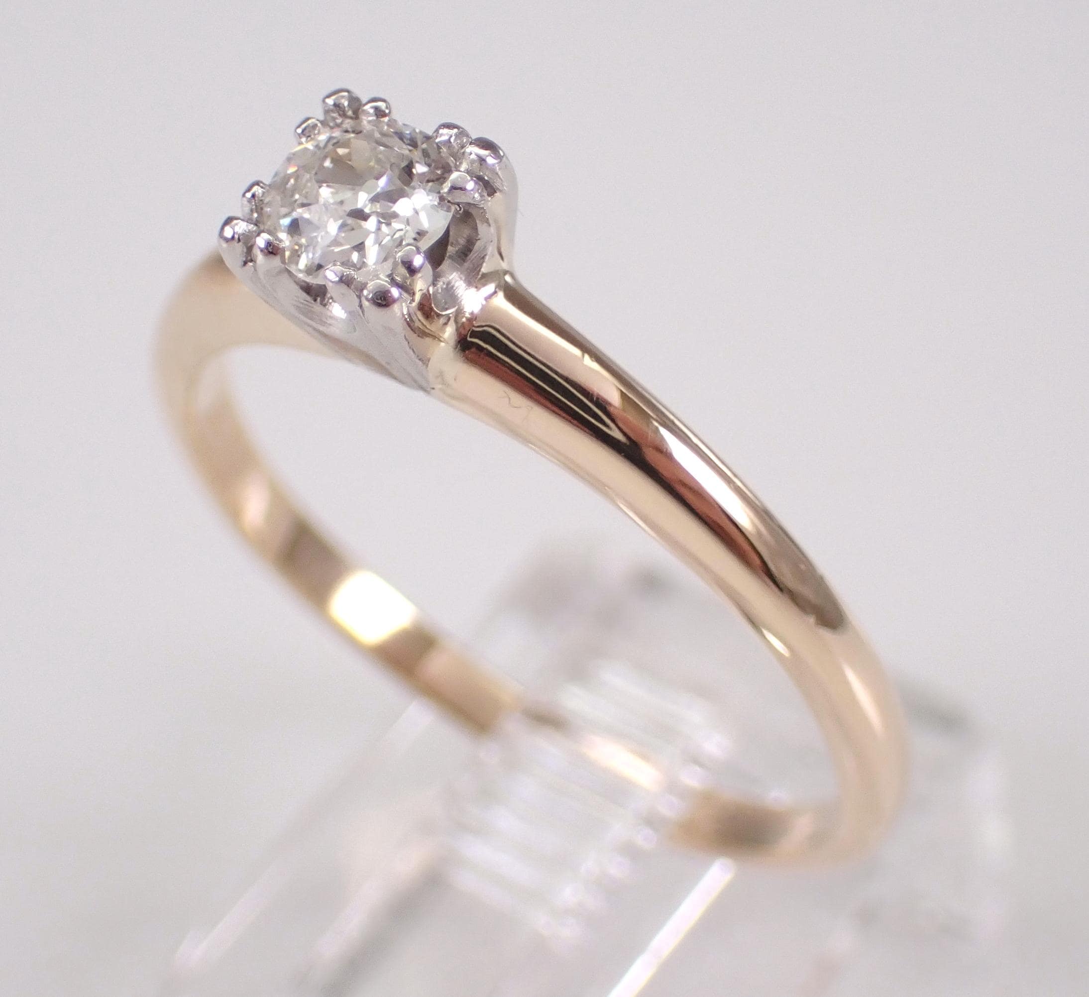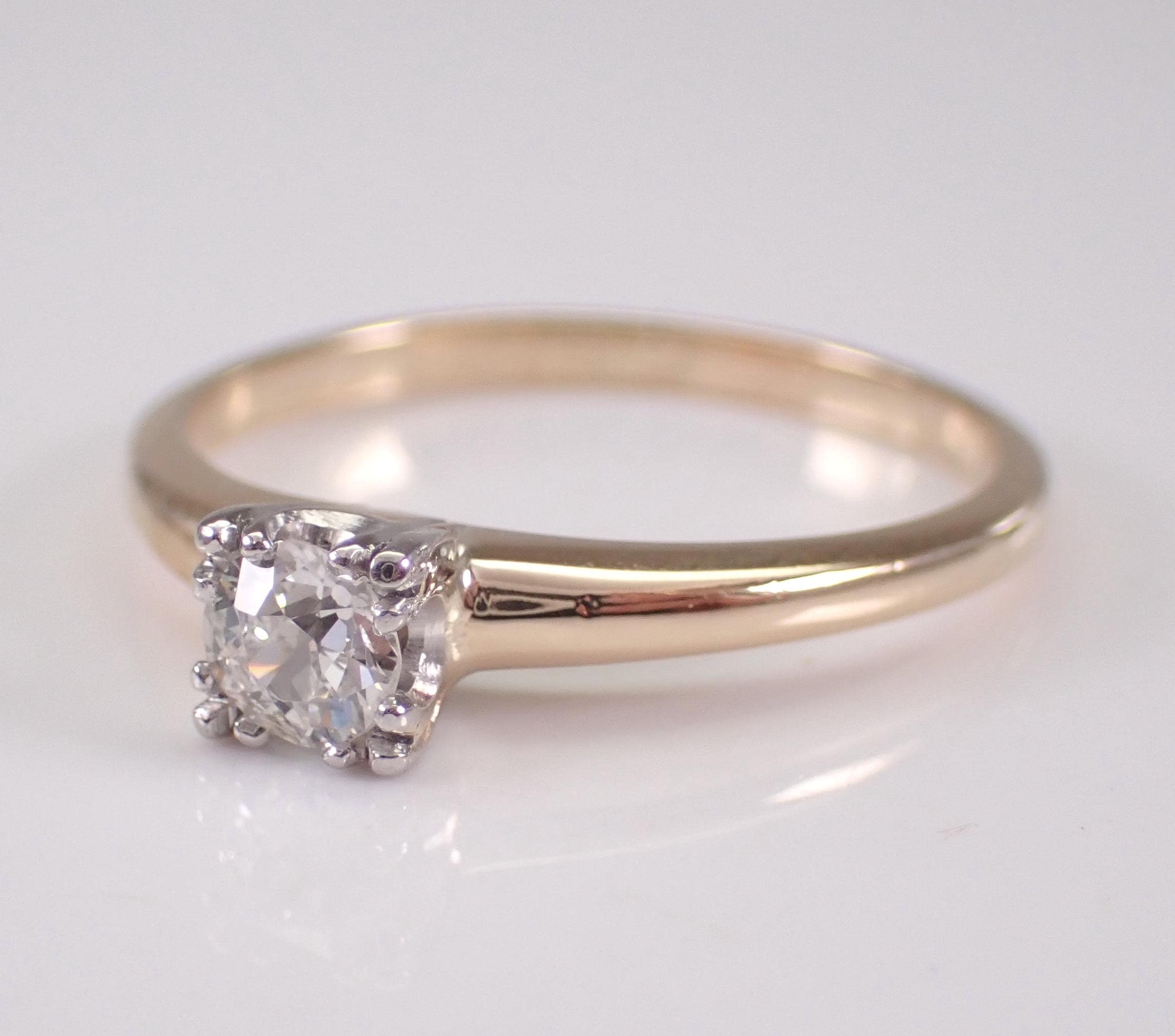 Antique 14K Yellow Gold Old Miner Diamond Engagement Ring. This ring is set with a Round Old Miner Diamond in the center. This diamond is G color, VS clarity and weighs .30 carat. This ring is 14KT Yellow Gold (the diamond is set in 14k White Gold prongs), weighs 2.6 grams and is a finger size 7, can be resized (please inquire about sizing with the finger size you need). This ring dates back to Circa 1940's and will be accompanied by an appraisal by a GIA Certified Diamond Grader with the retail replacement value of $1,975.00. I will ship these rings promptly in a beautiful gift box.