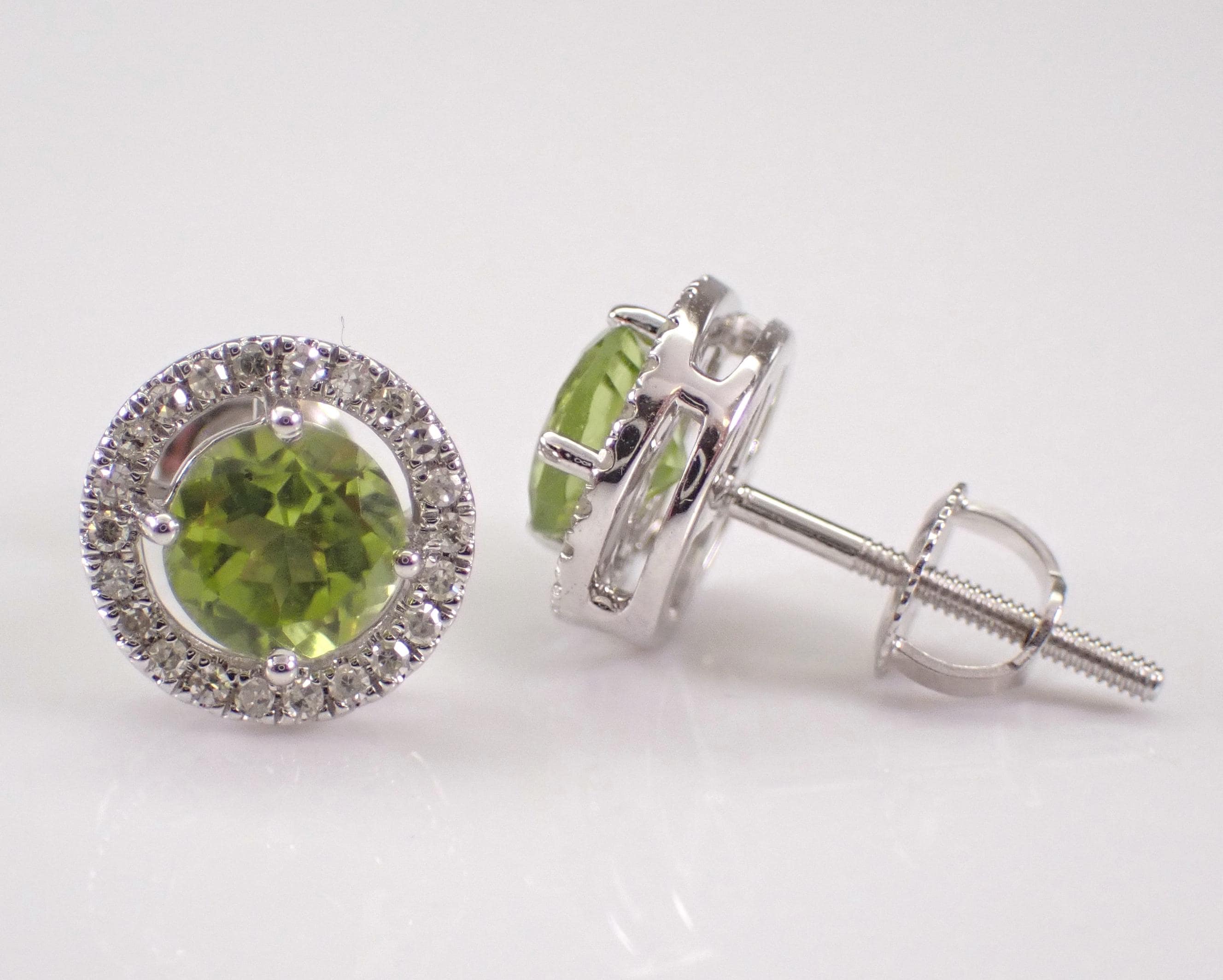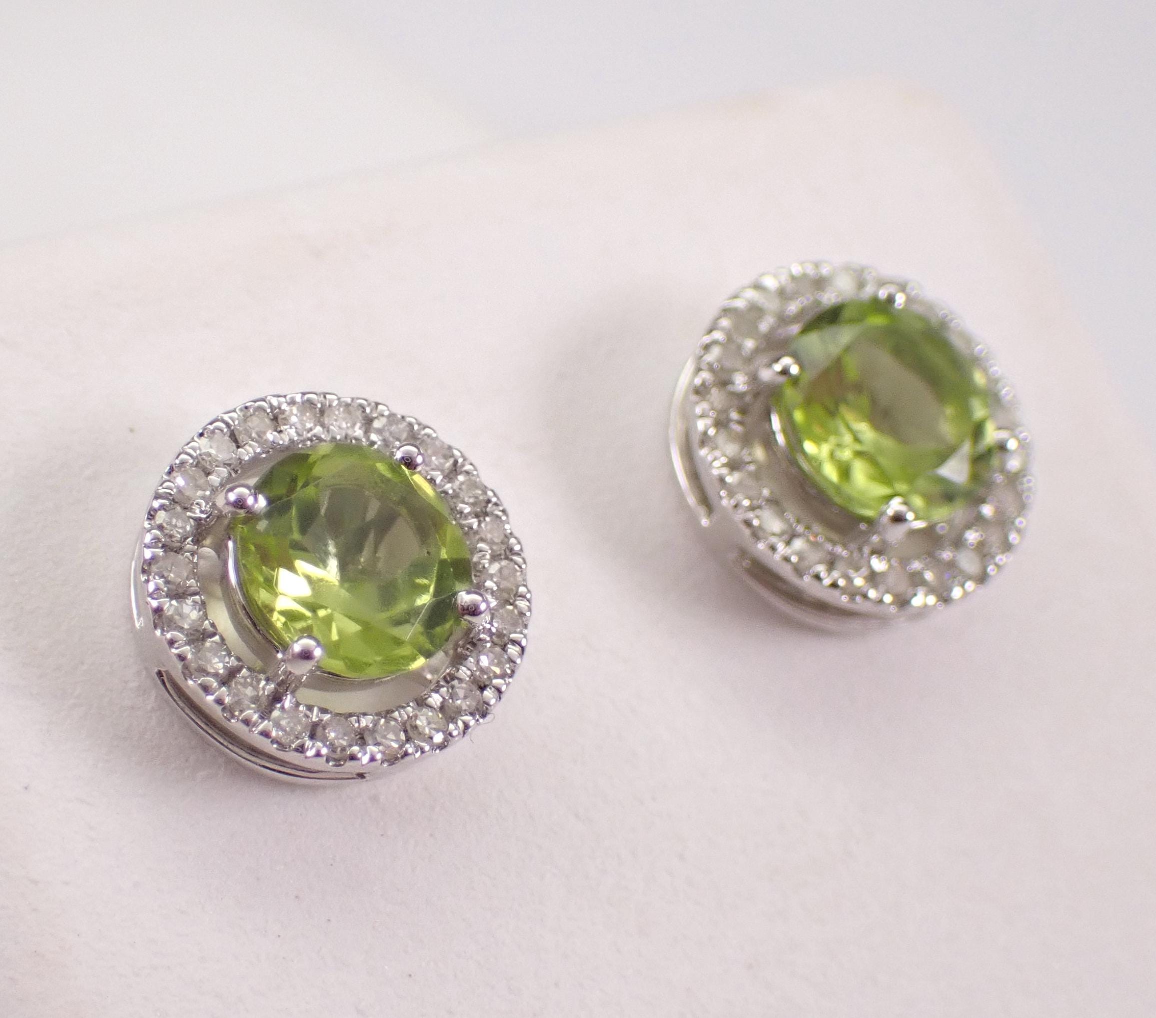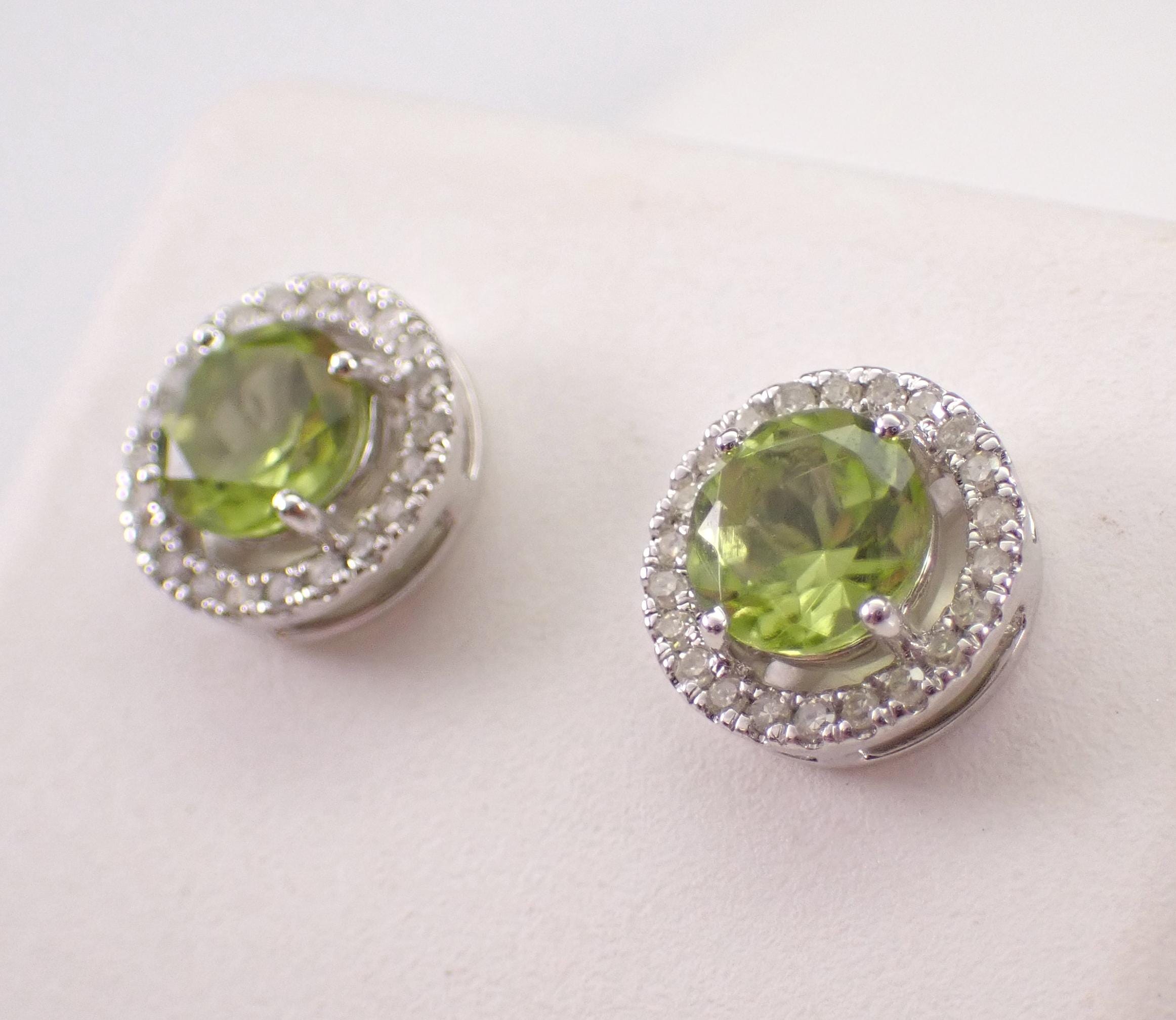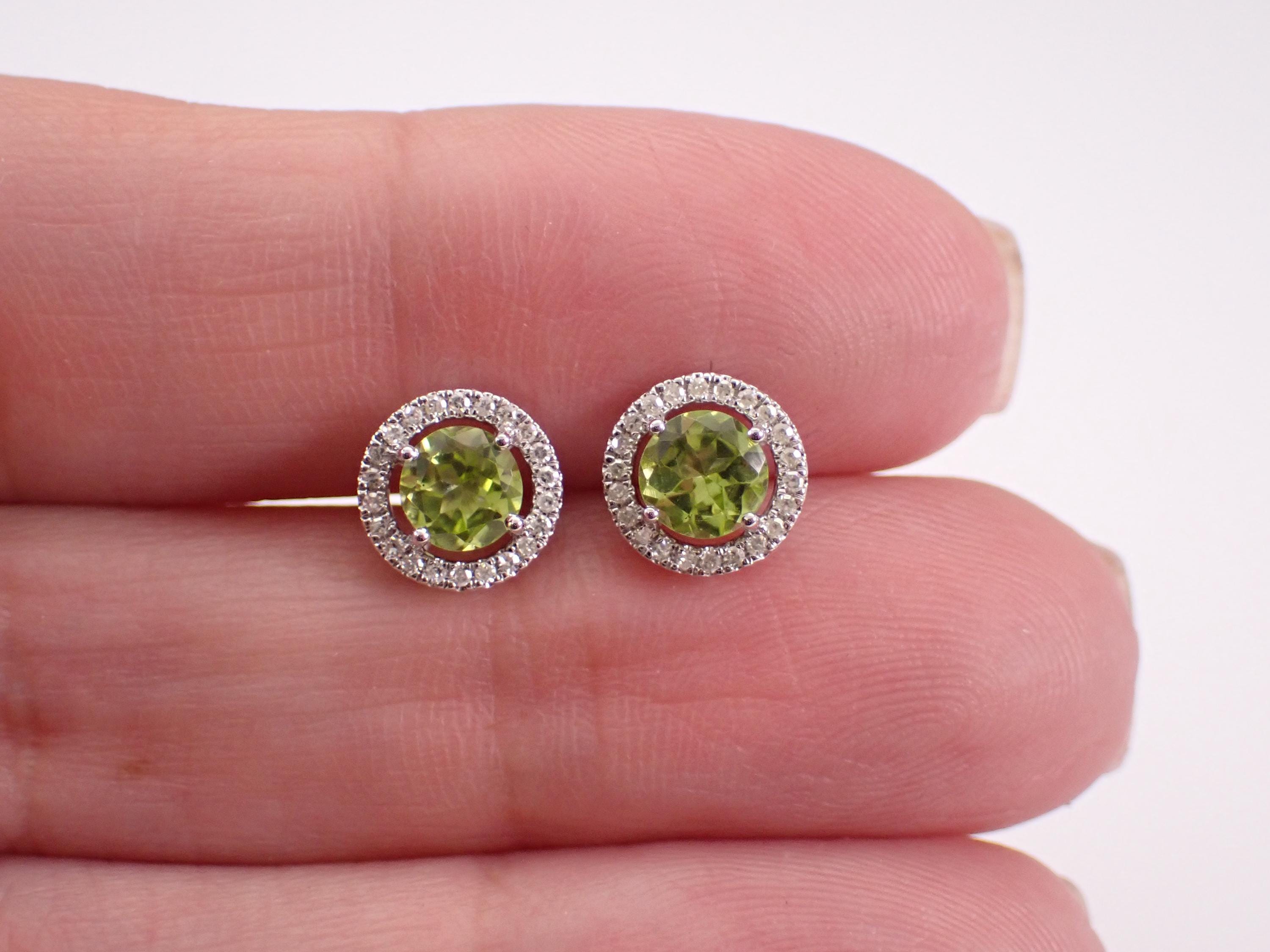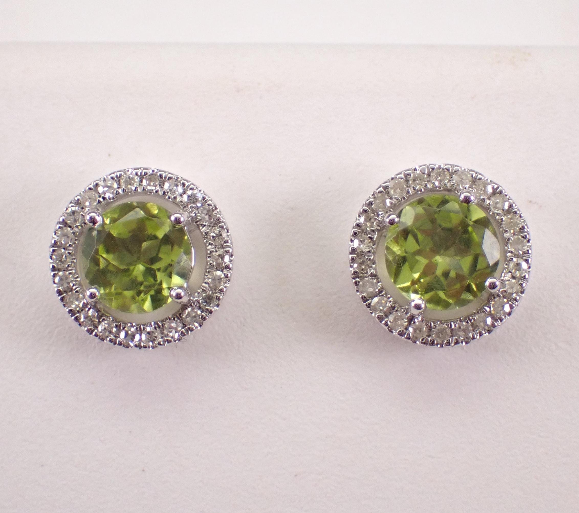 White Gold Diamond and Peridot Halo Stud Earrings.