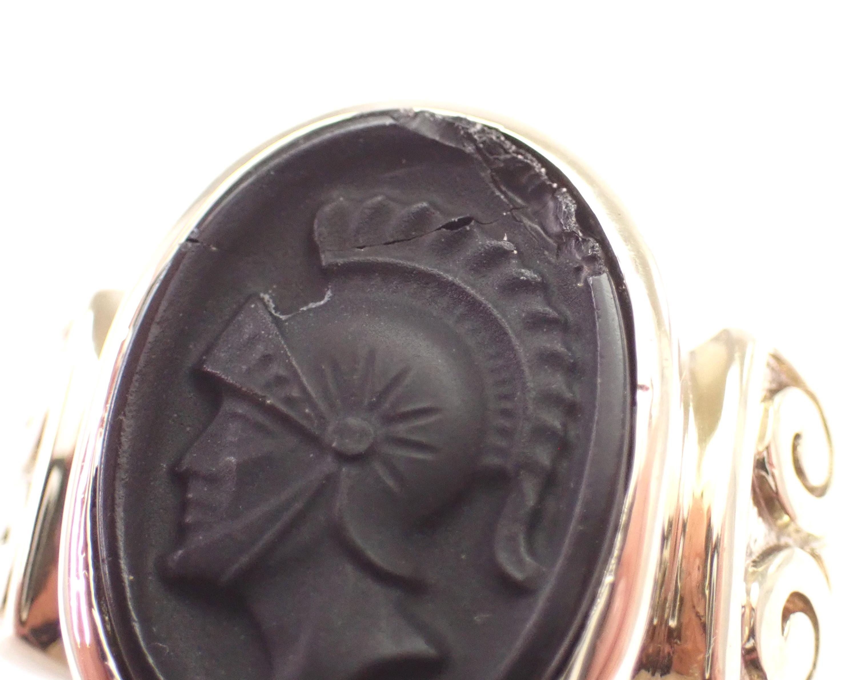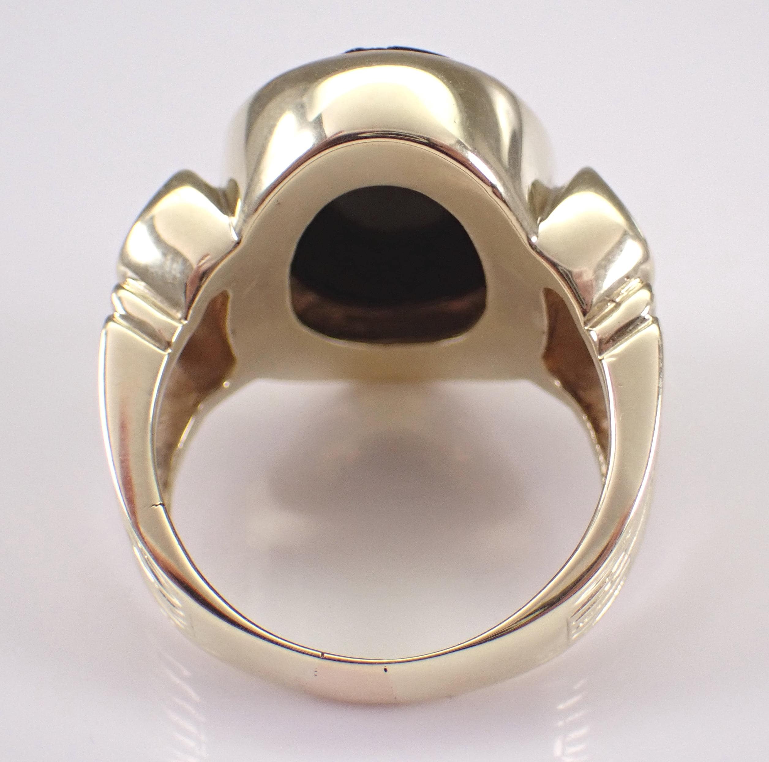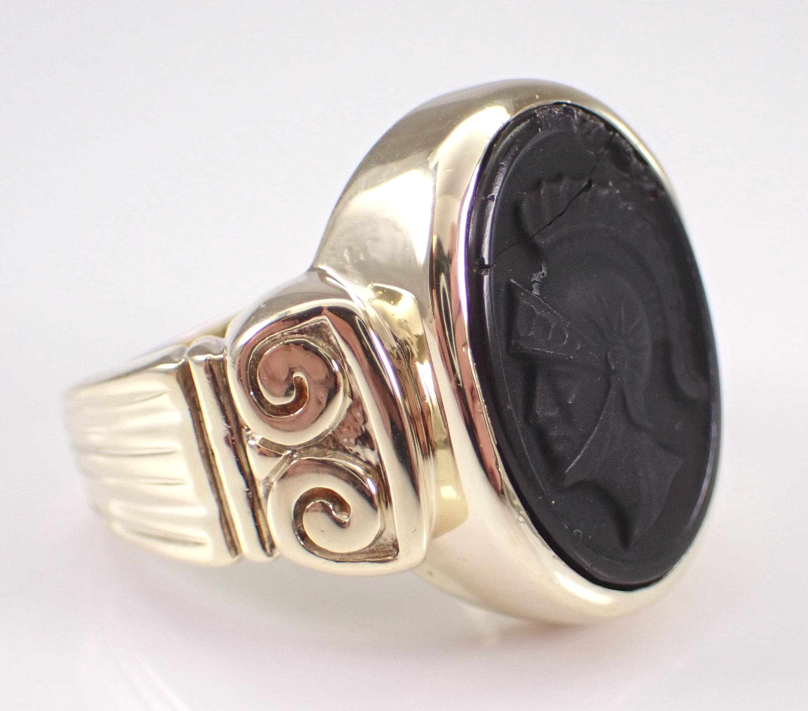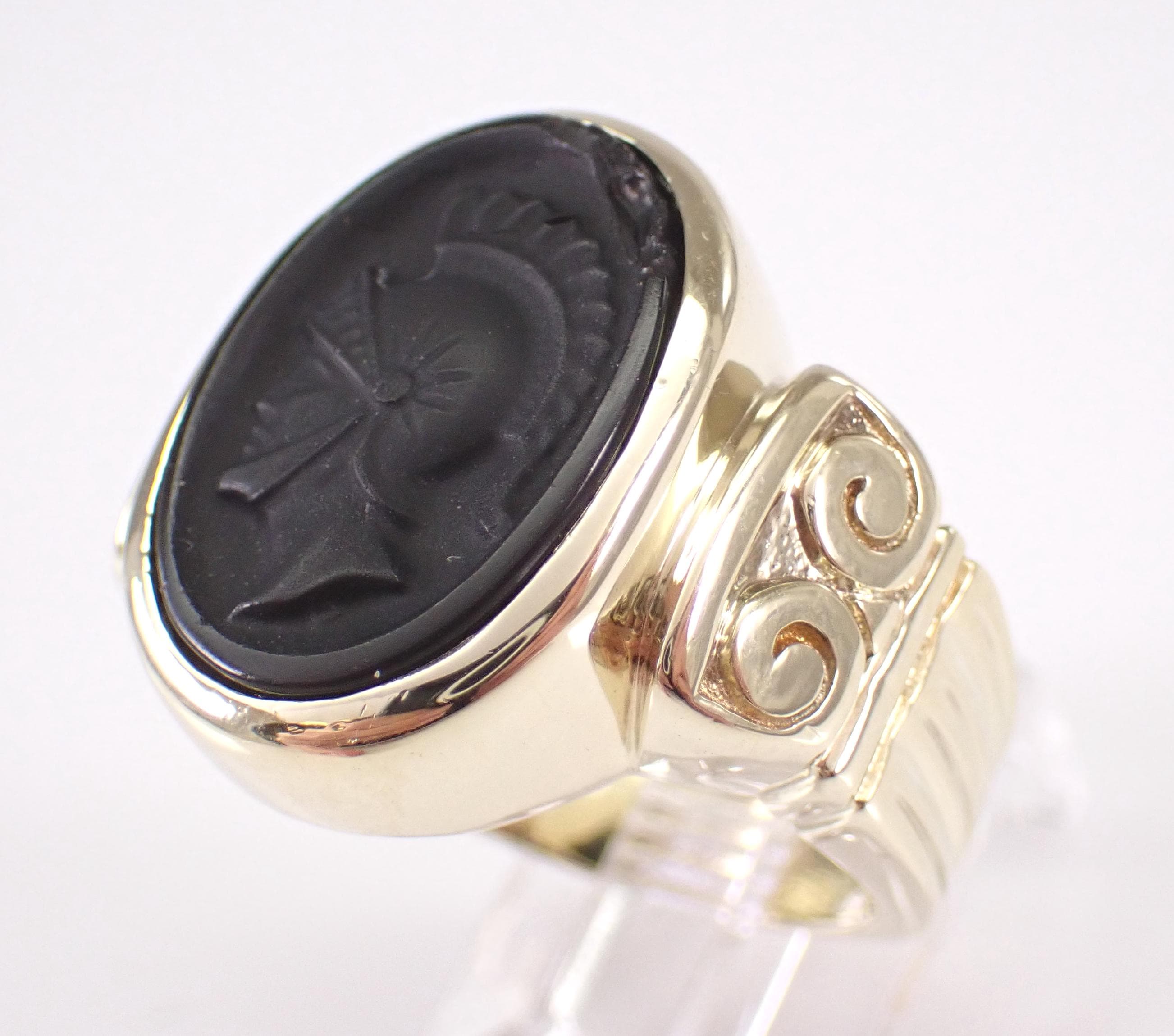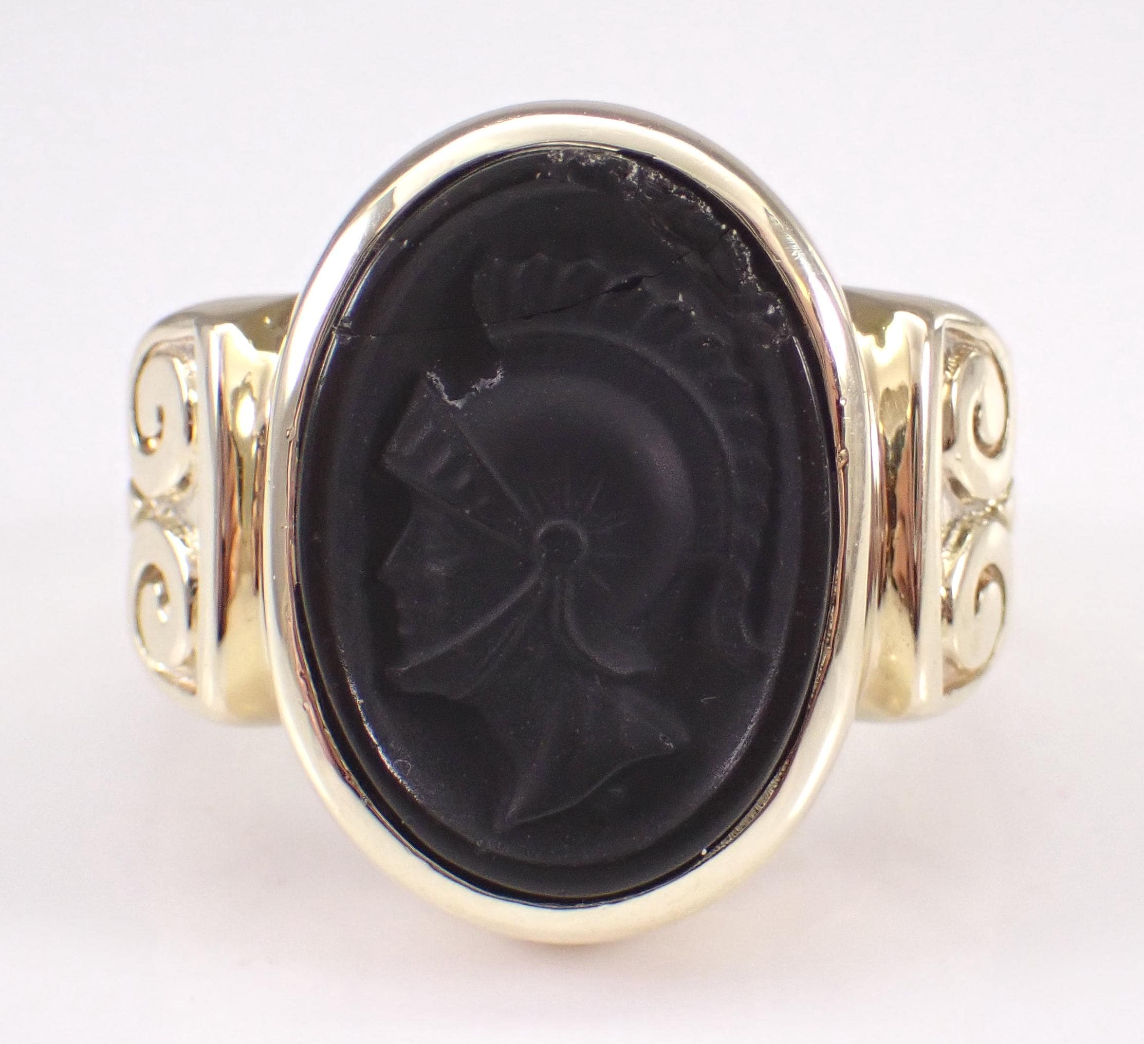 Vintage 14k Yellow Gold Onyx Intaglio Ring. This ring is set with a genuine Oval Onyx in the center. This Onyx measures 17 X 12 mm and there is a chip on the top (pictured). This ring is 14 KT Yellow Gold, weighs 17.0 grams and is a finger size 7 3/4, can be resized (please inquire about sizing with the finger size you need). This ring will be accompanied by an appraisal for insurance and authentication purpose. I will ship this ring promptly in a gift box.