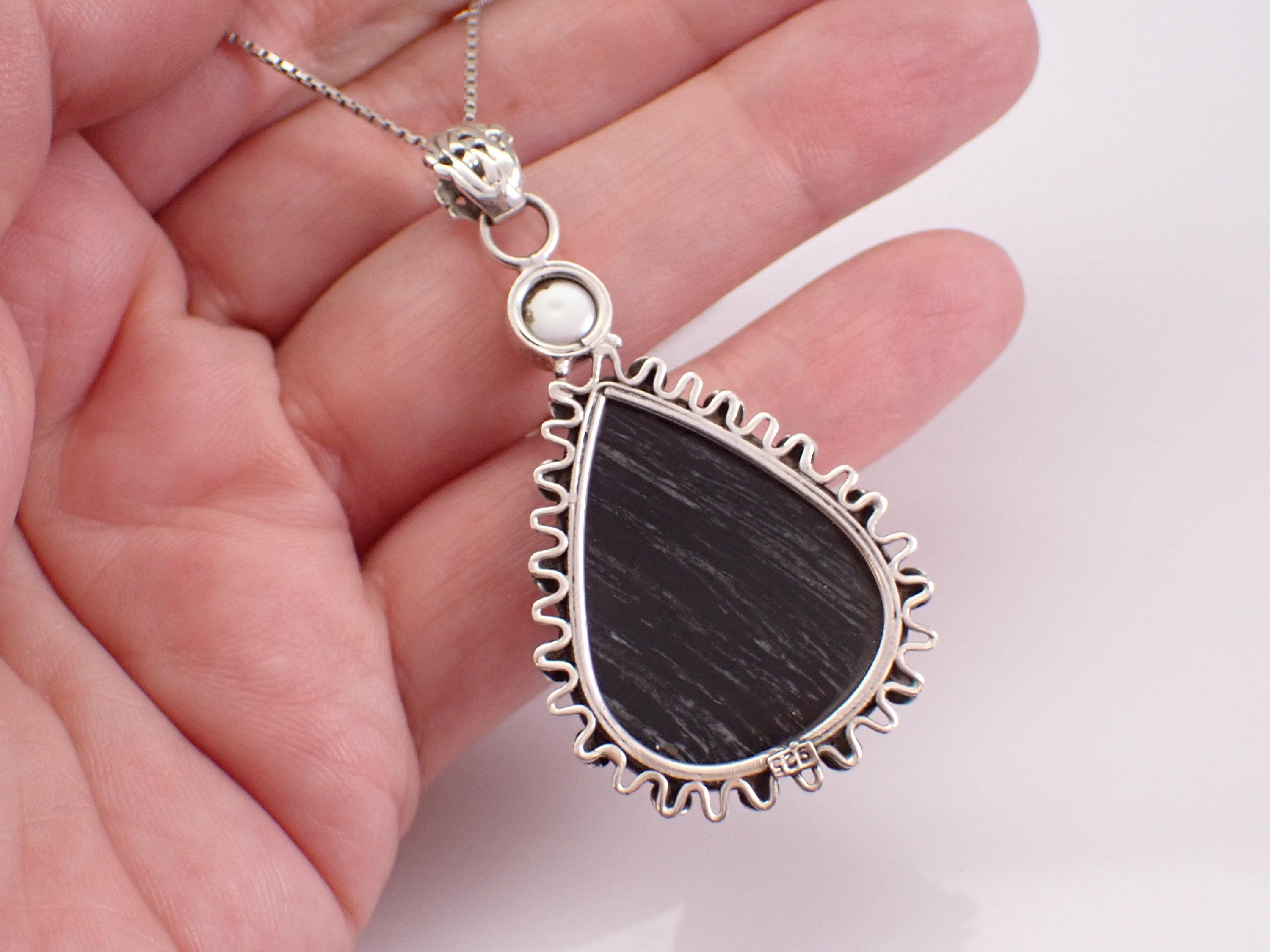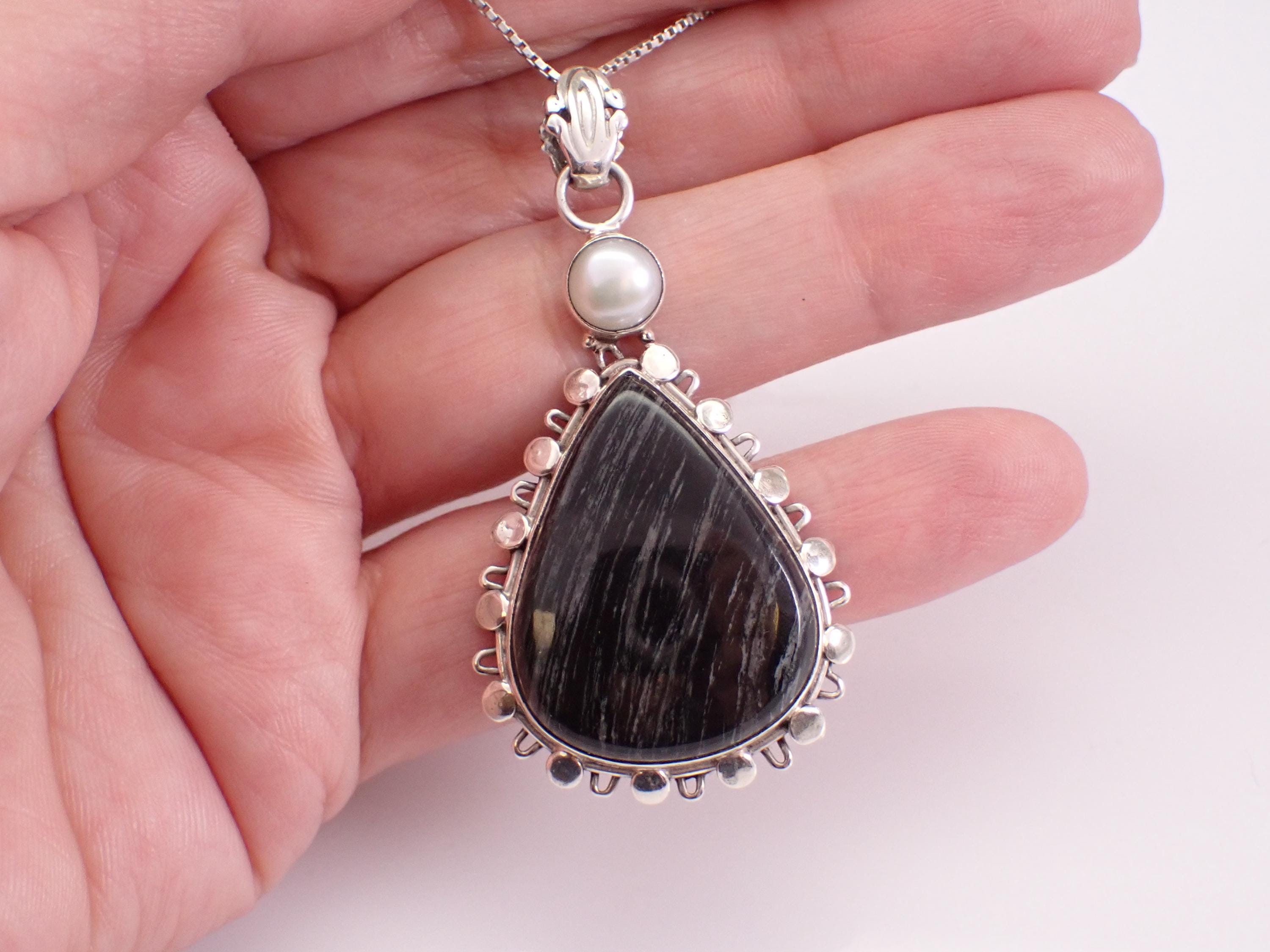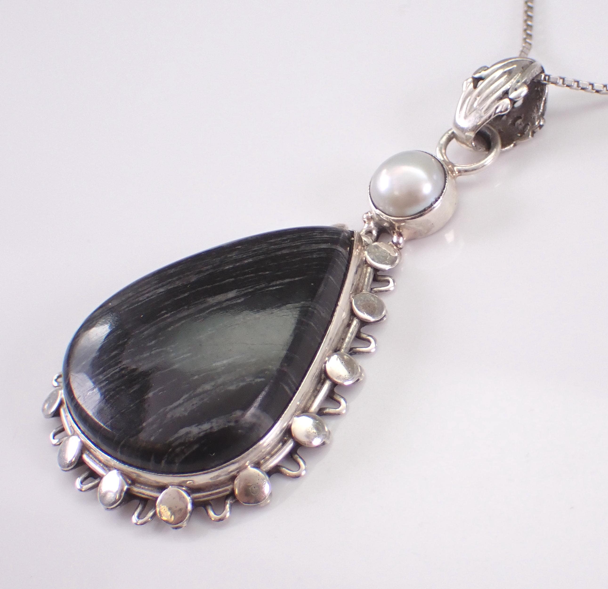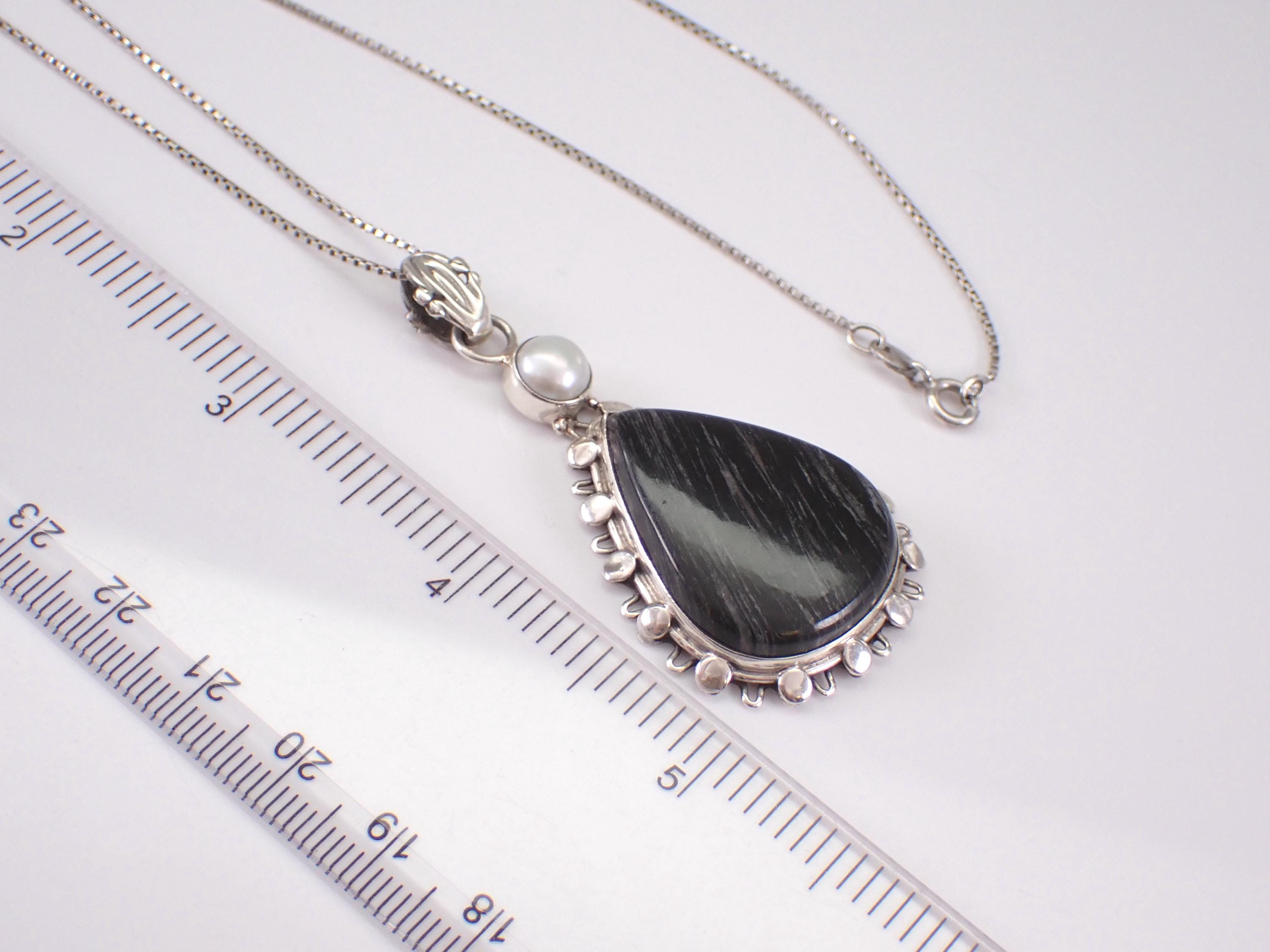 Vintage Sterling Silver Agate and Pearl Necklace and Chain. There is a Large Pear shaped Agate (28 X 22 mm) bezel set to dangle off the pendant and a Button Pearl (6.5mm in diameter) set at the top of this pendant. This pendant is Sterling Silver and is accompanied by a 22" Sterling Silver chain. The necklace weighs 13.8 grams and the pendant measures 2 1/4" in length. I will ship this necklace promptly in a gift pouch.