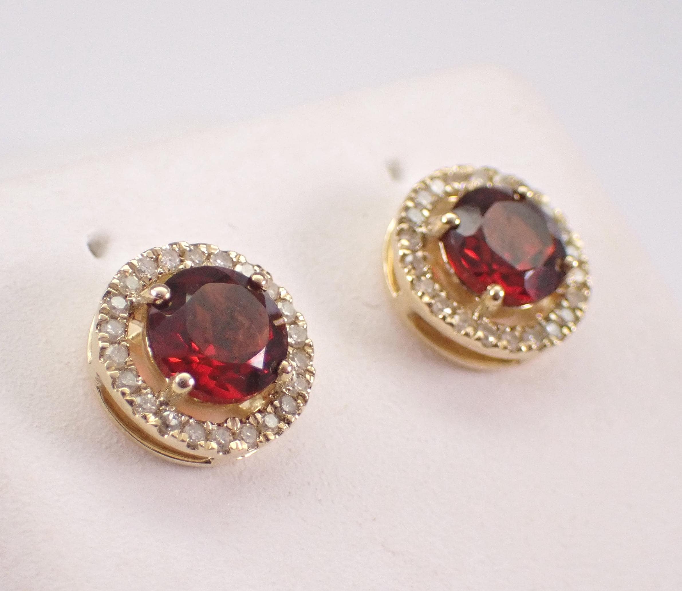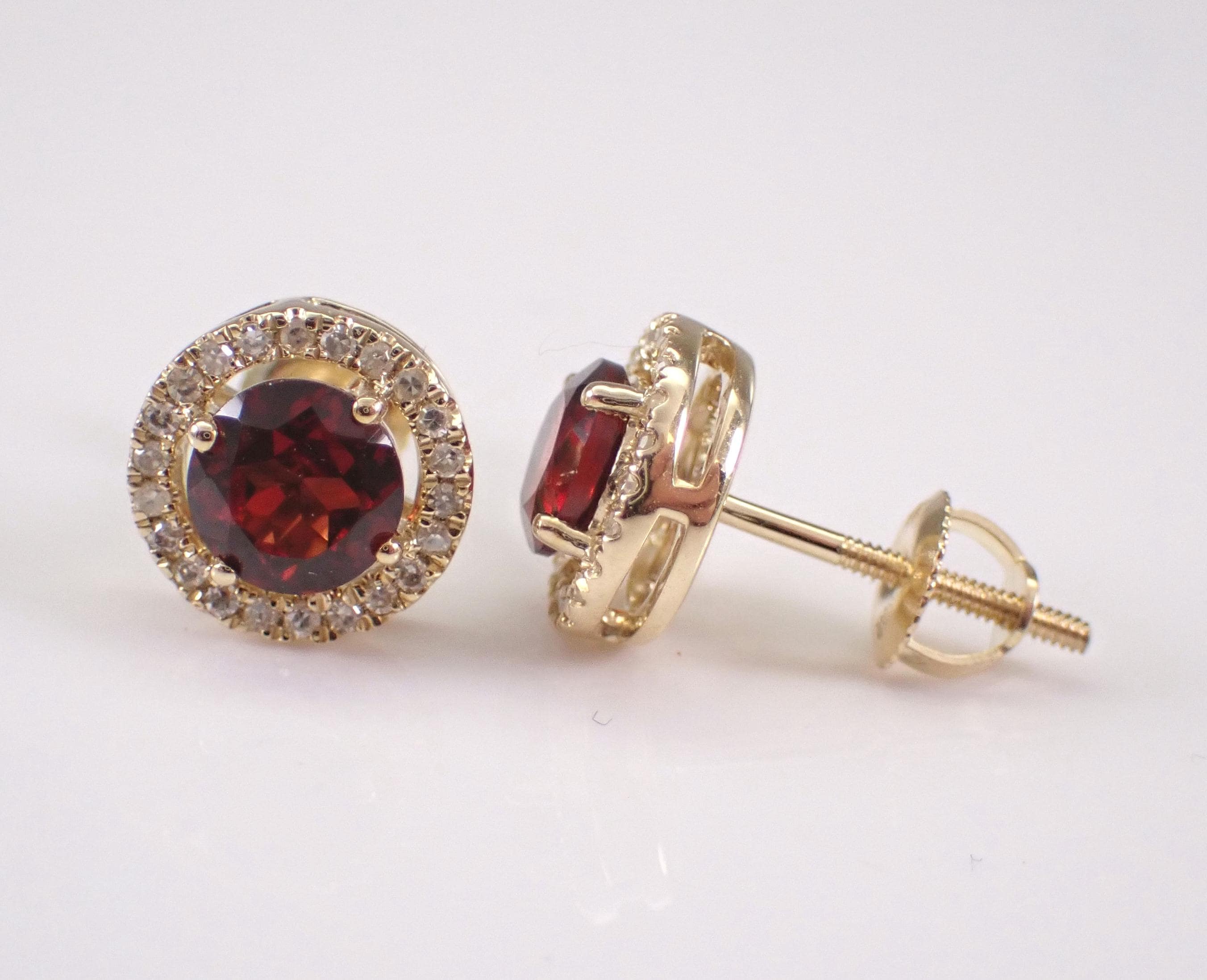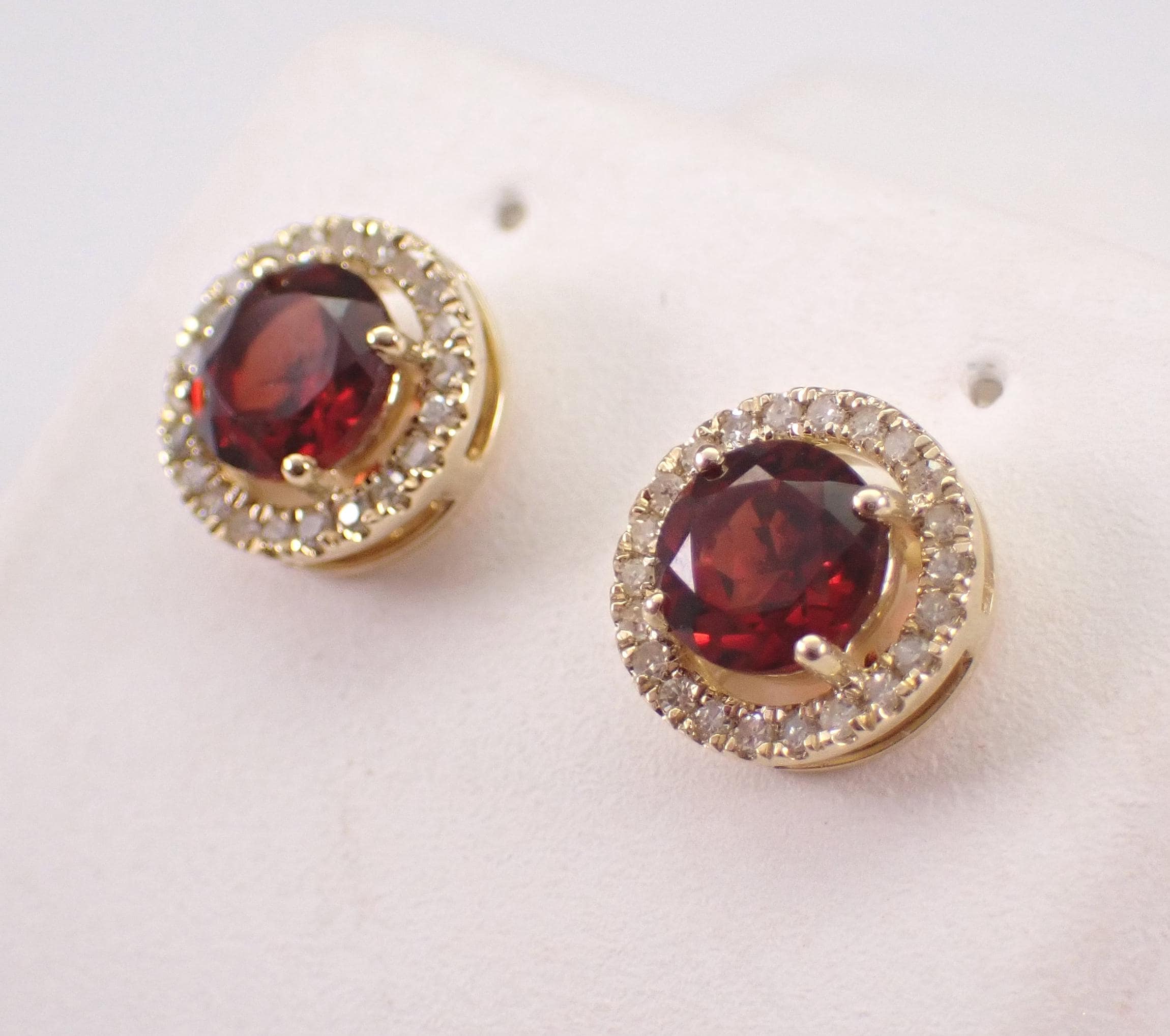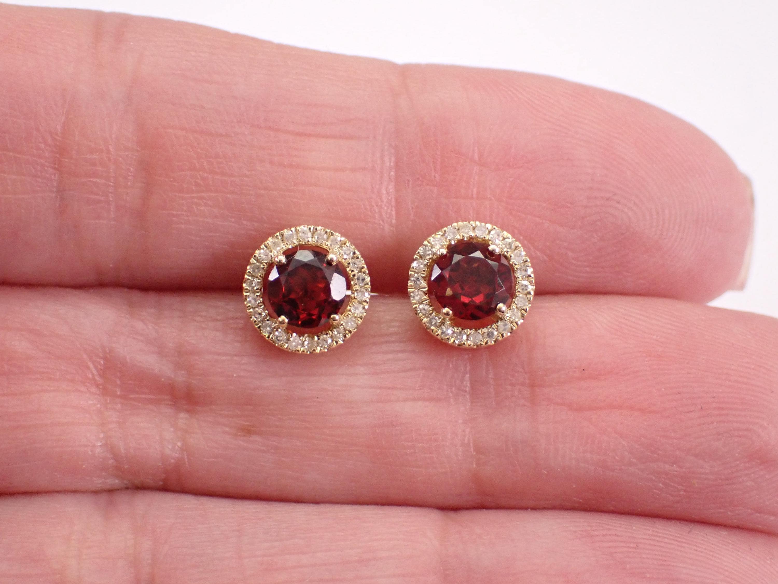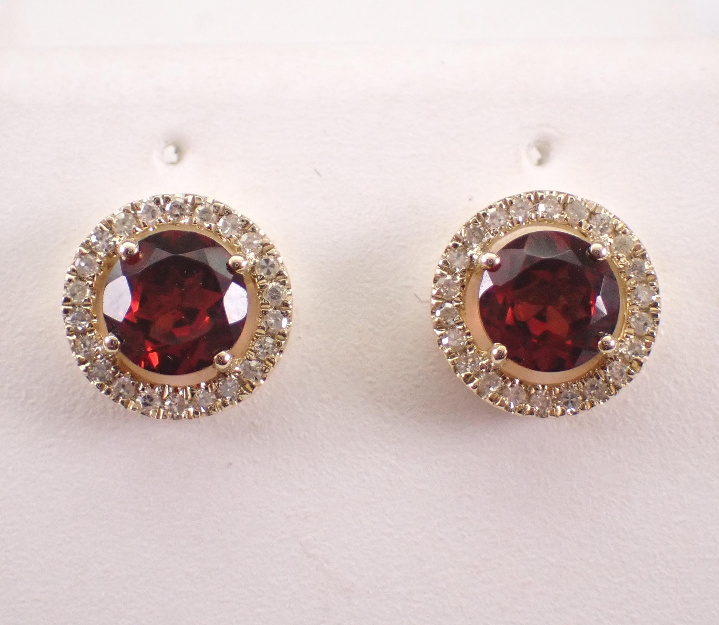 Yellow Gold Diamond and Garnet Halo Stud Earrings.