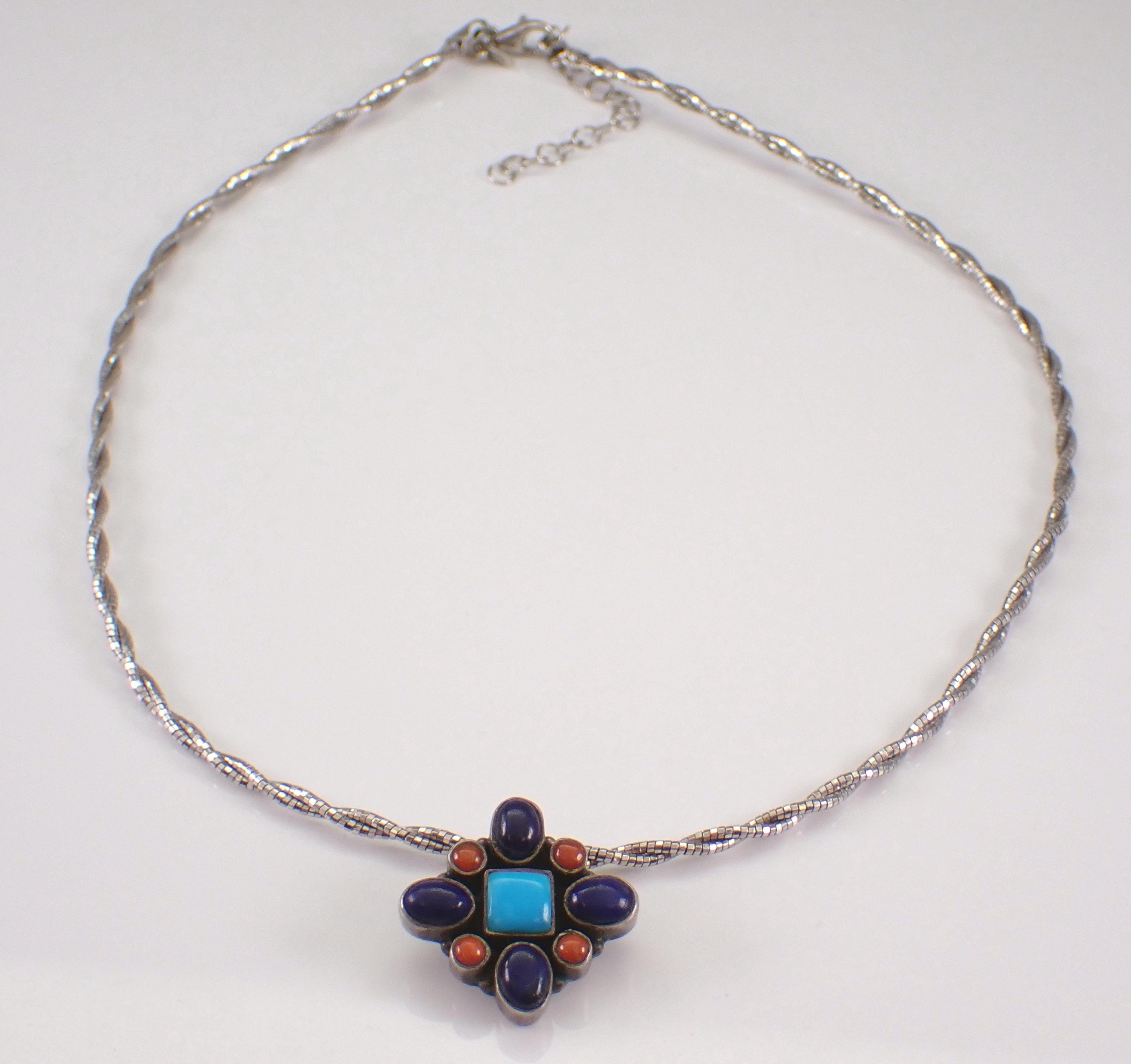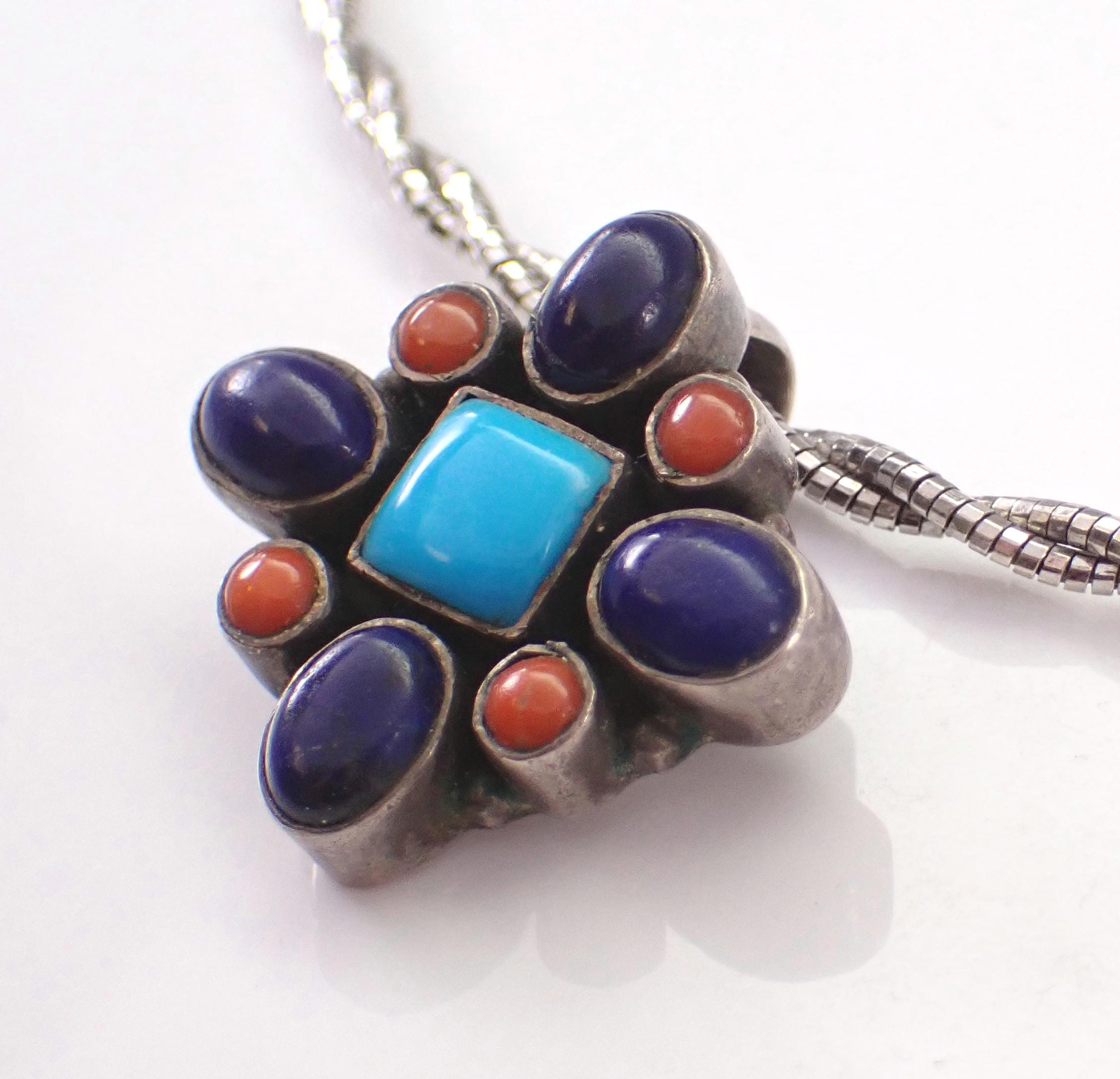 There is one square Turquoise, four Oval Lapis Lazuli and four Round Coral set in the centerpiece. The pendant slide charm measures 23 X 24 mm. The chain is a braided wire Omega style chain that measures 18" in full length with adjustment loops from 16". This necklace weighs 15.1 grams with the charm. This necklace is a very unique vintage item, perfect gift for any occasion!