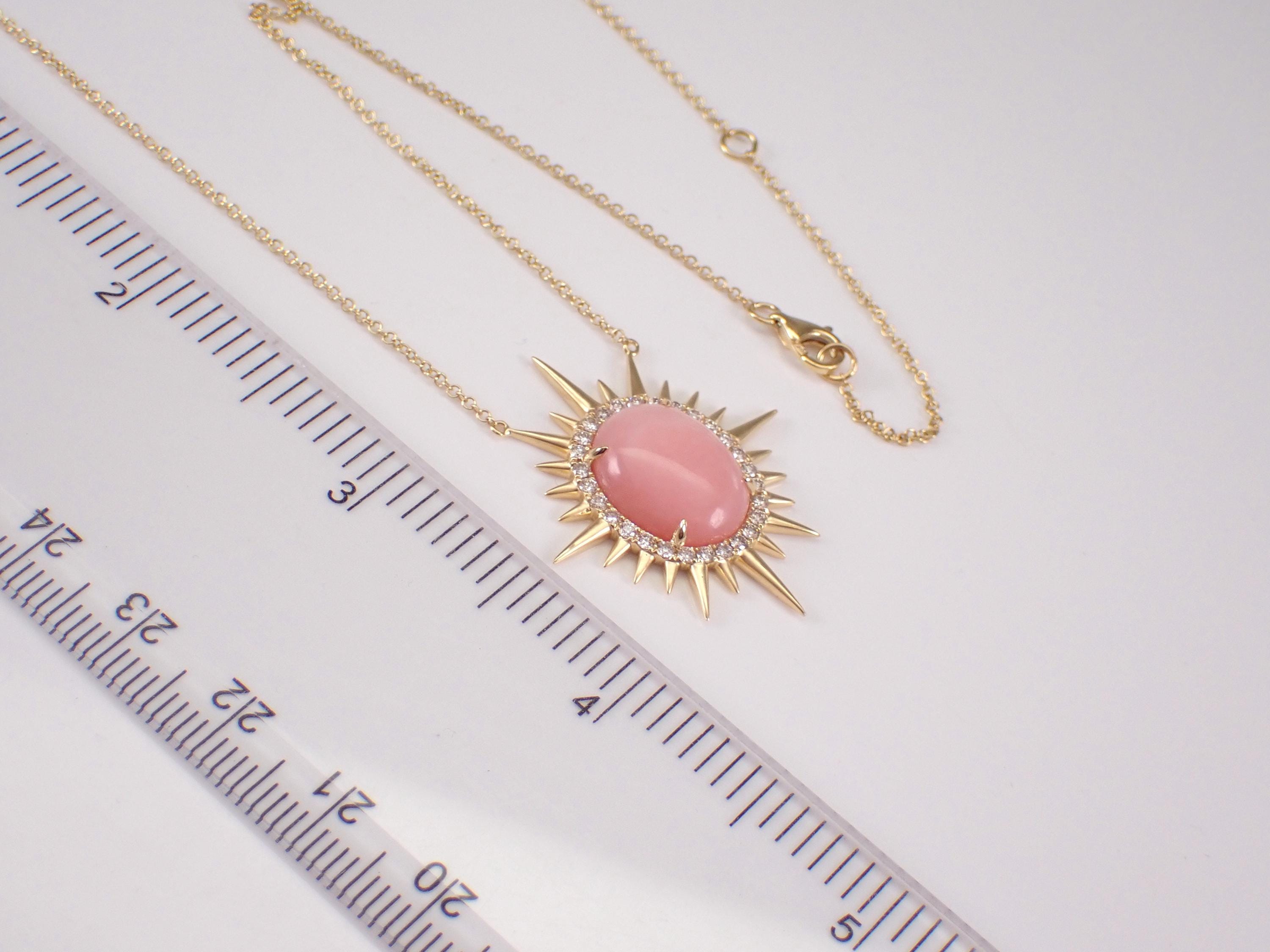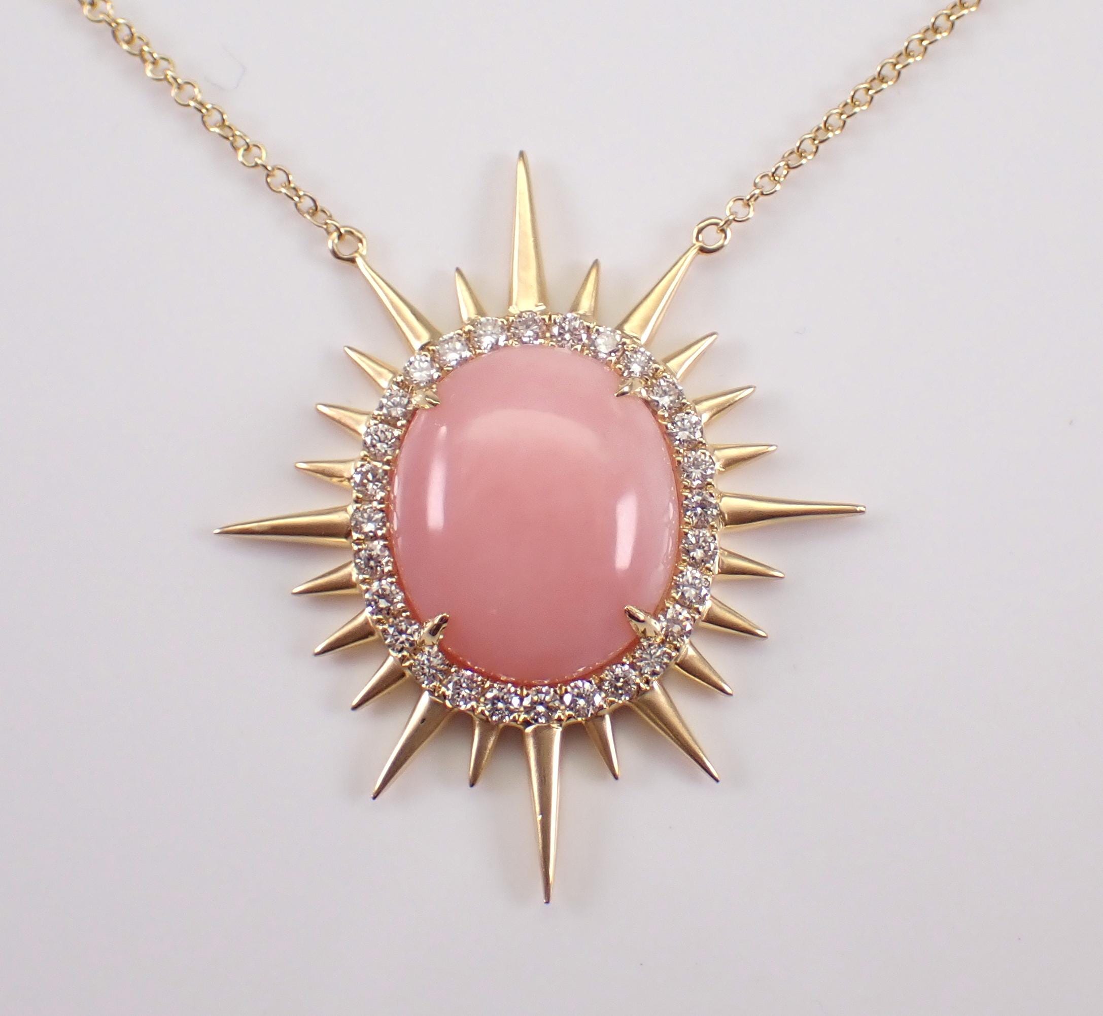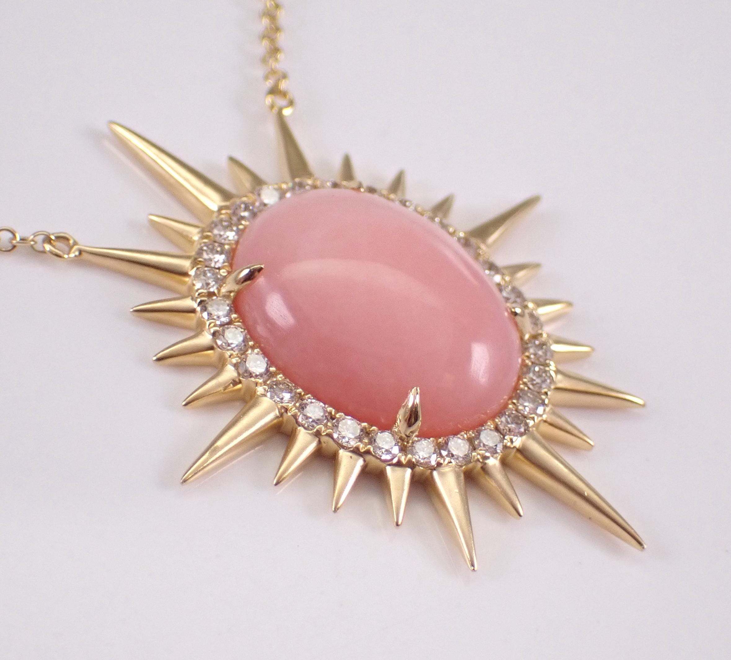 18K Yellow Gold Diamond and Coral Pendant Necklace. The Necklace is set with one Oval genuine Coral in the center and twenty-eight natura Round Brilliant Diamonds. This Coral measures 14 X 12 mm. The diamonds in this necklace are G color, VS clarity and weigh a total of .35 carat. The pendant is 18K Yellow Gold and comes attached to an 18" 18K Yellow Gold chain and together weigh 5.5 grams. The pendant measures 31.5 X 27 mm. This necklace will be accompanied by an appraisal with the retail replacement value of $3,495.00. I will ship this necklace promptly in a gift box.