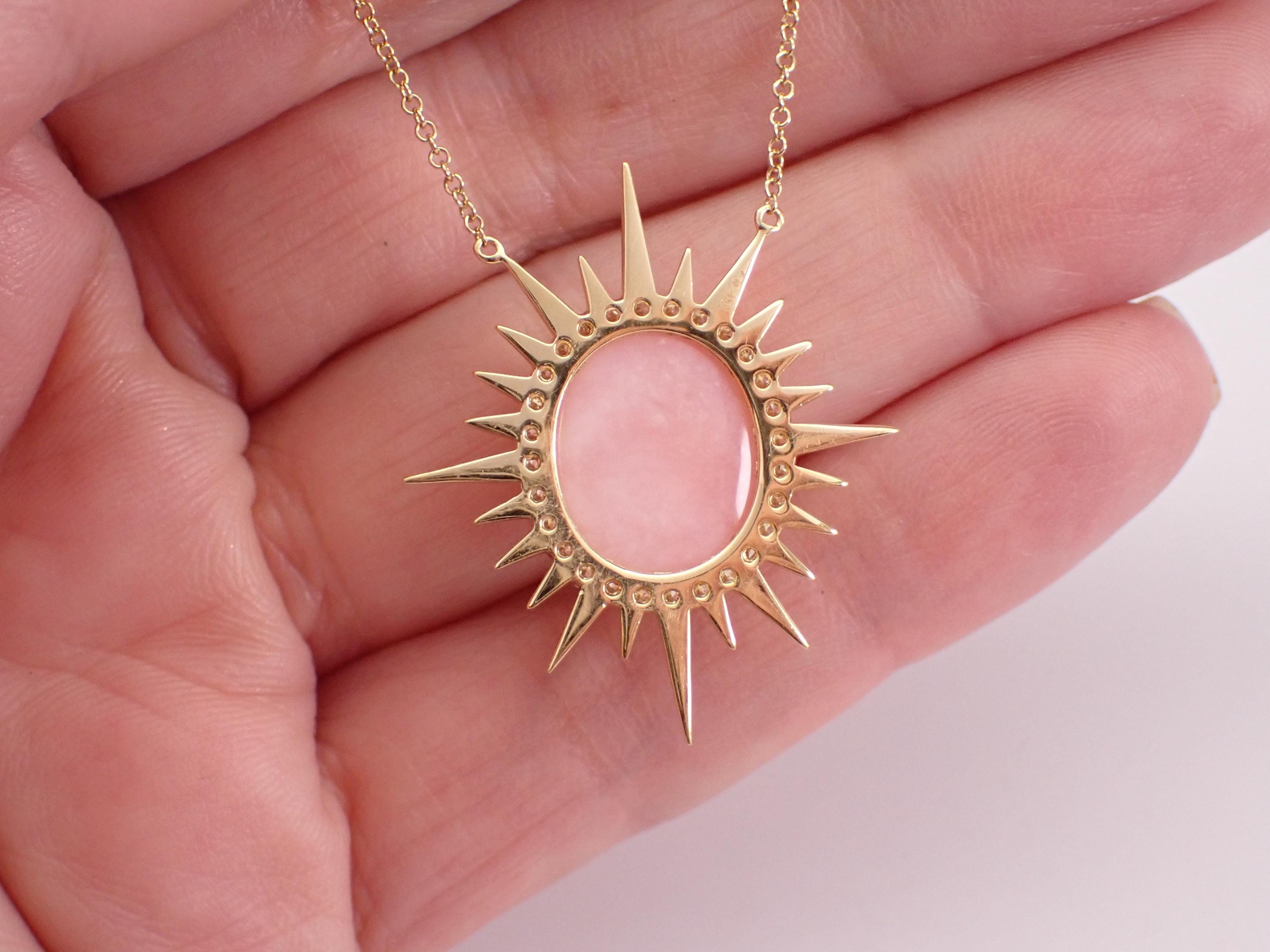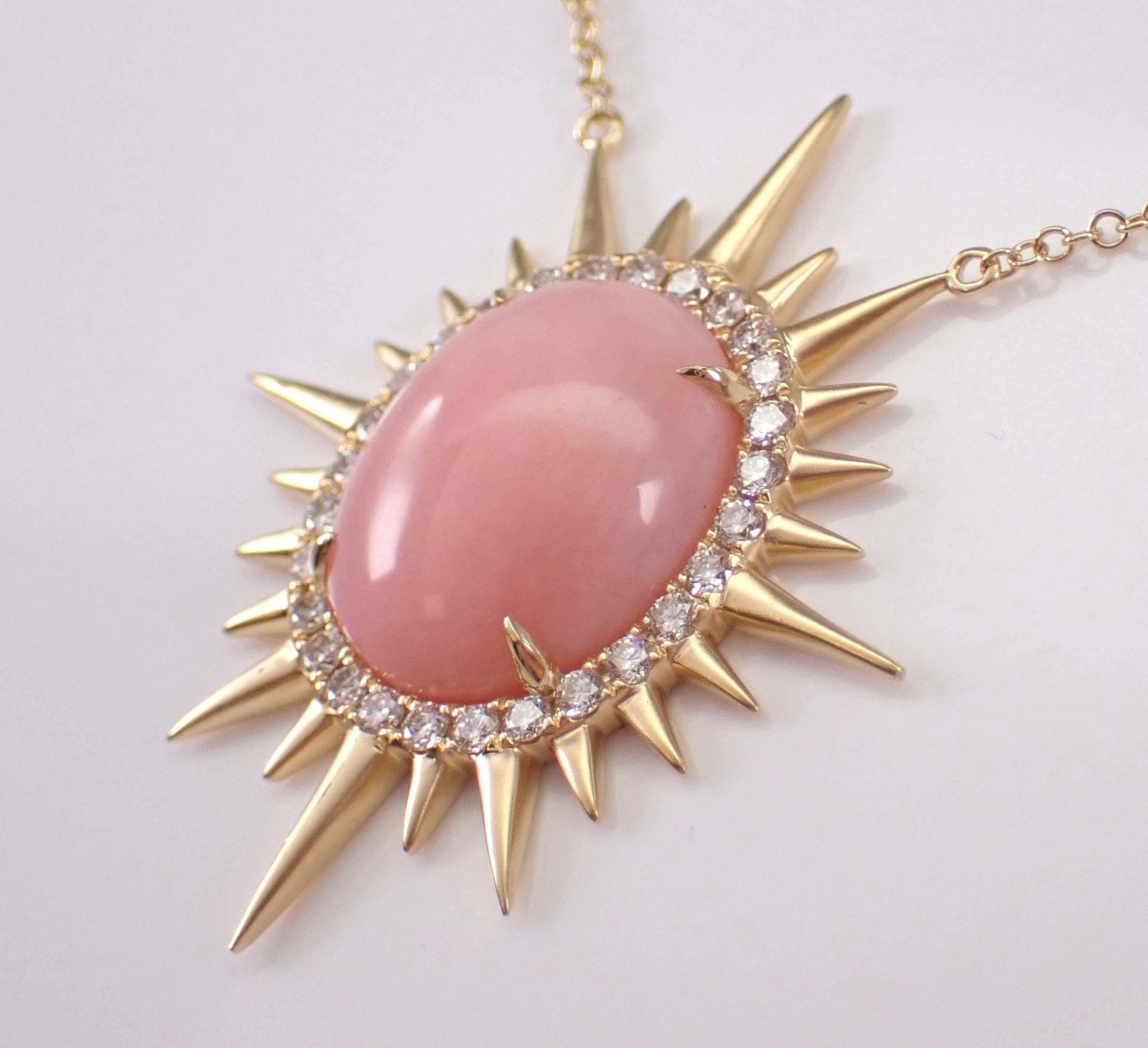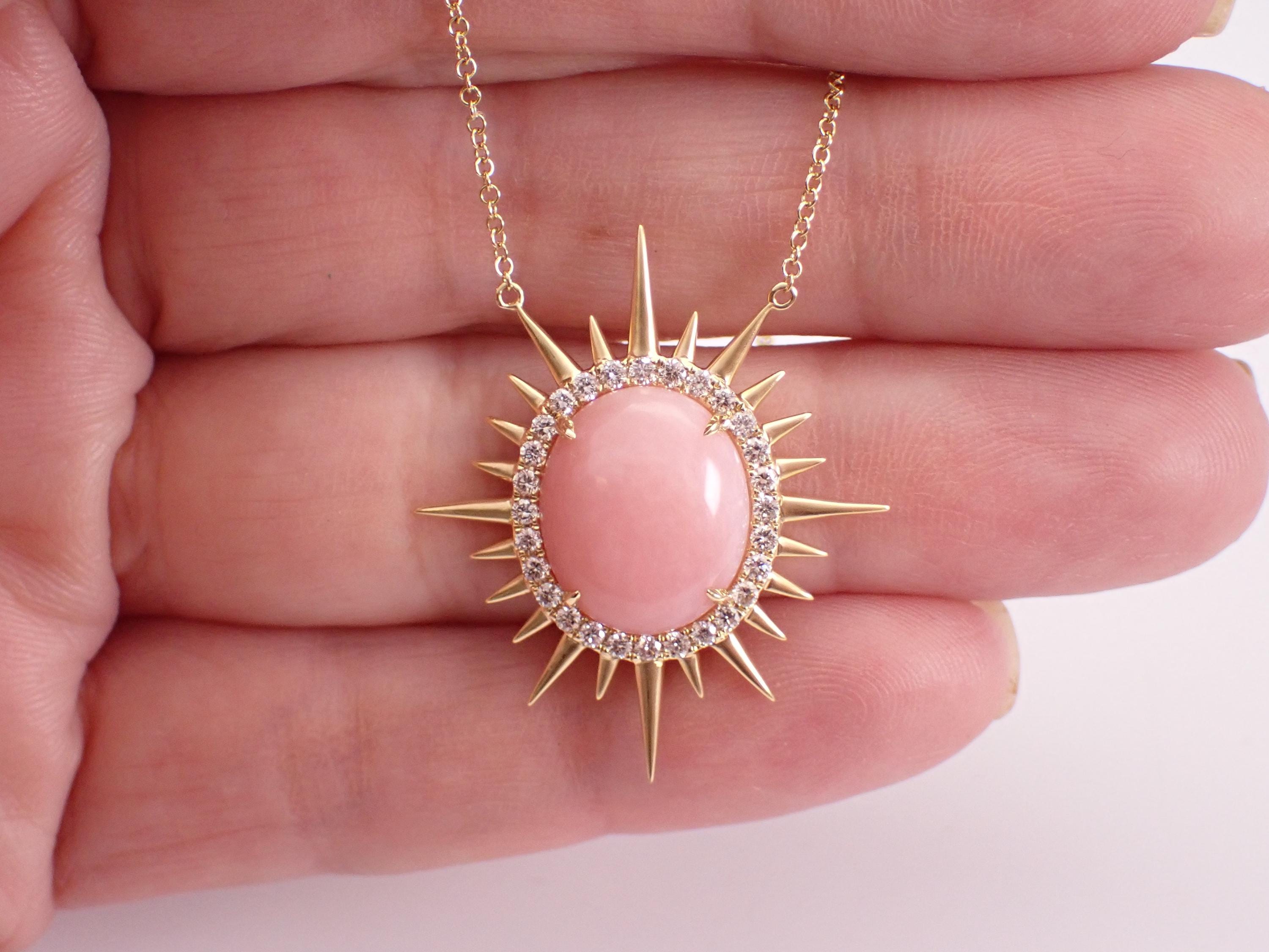18K Yellow Gold Diamond and Coral Pendant Necklace. The Necklace is set with one Oval genuine Coral in the center and twenty-eight natura Round Brilliant Diamonds. This Coral measures 14 X 12 mm. The diamonds in this necklace are G color, VS clarity and weigh a total of .35 carat. The pendant is 18K Yellow Gold and comes attached to an 18" 18K Yellow Gold chain and together weigh 5.5 grams. The pendant measures 31.5 X 27 mm. This necklace will be accompanied by an appraisal with the retail replacement value of $3,495.00. I will ship this necklace promptly in a gift box.