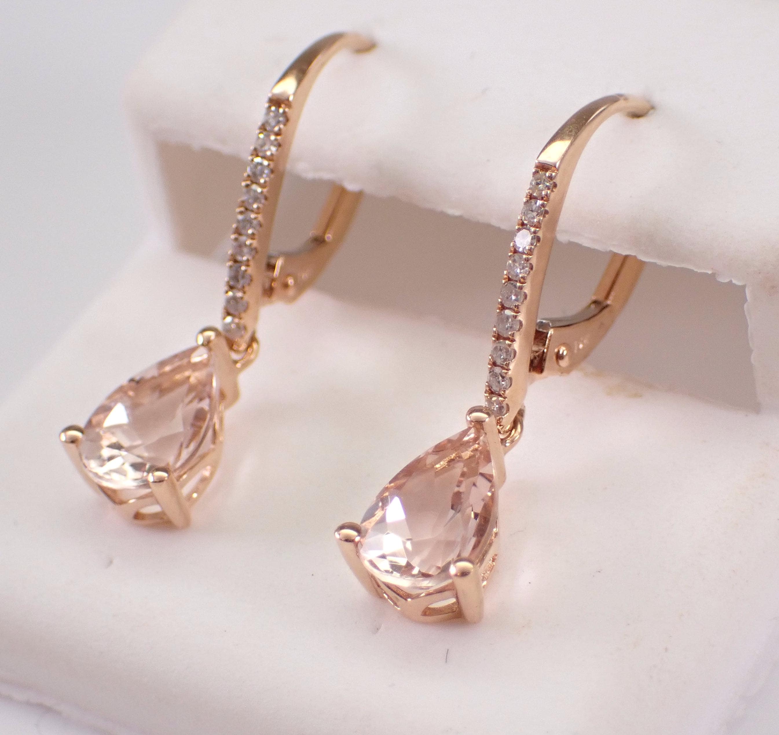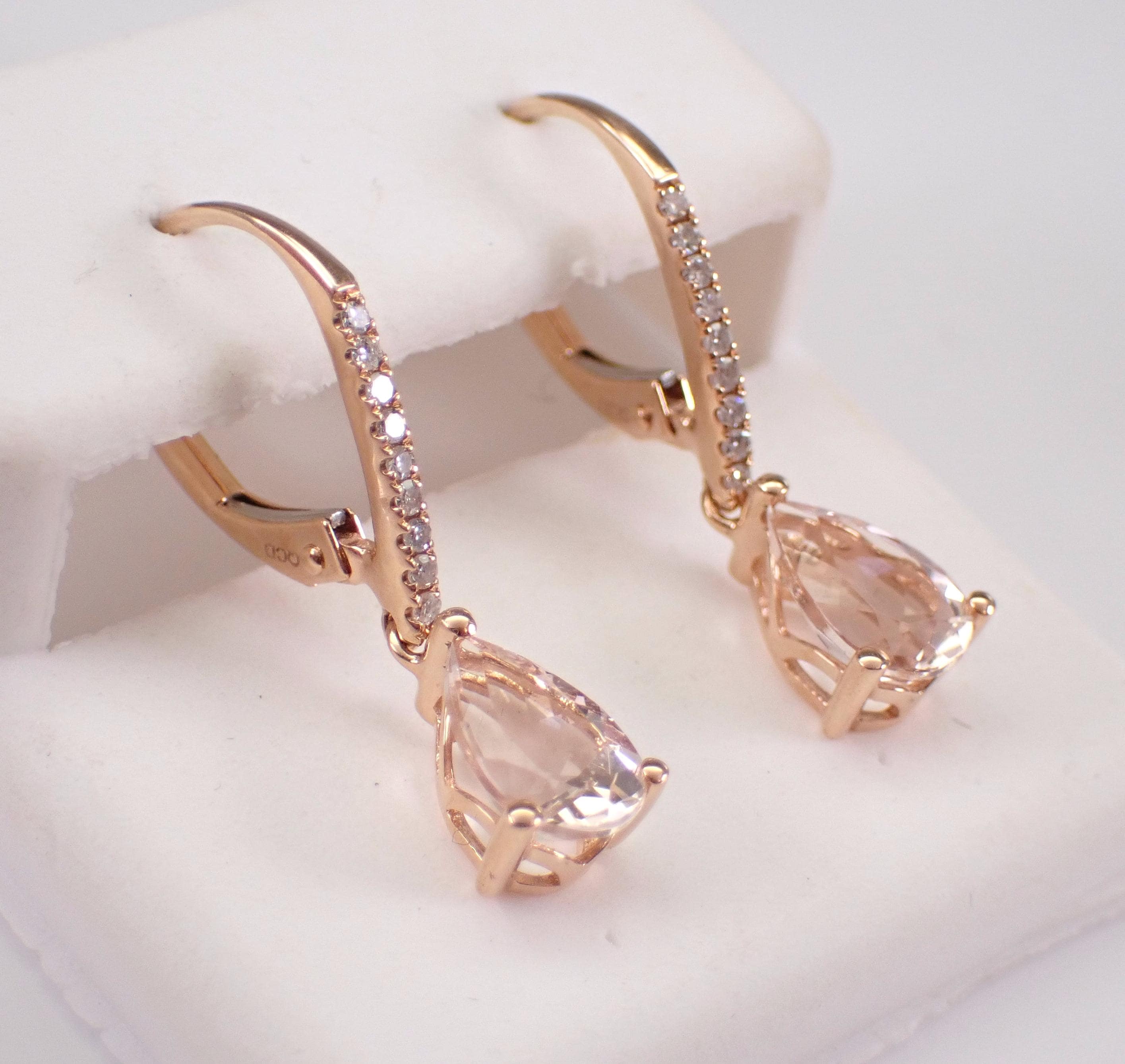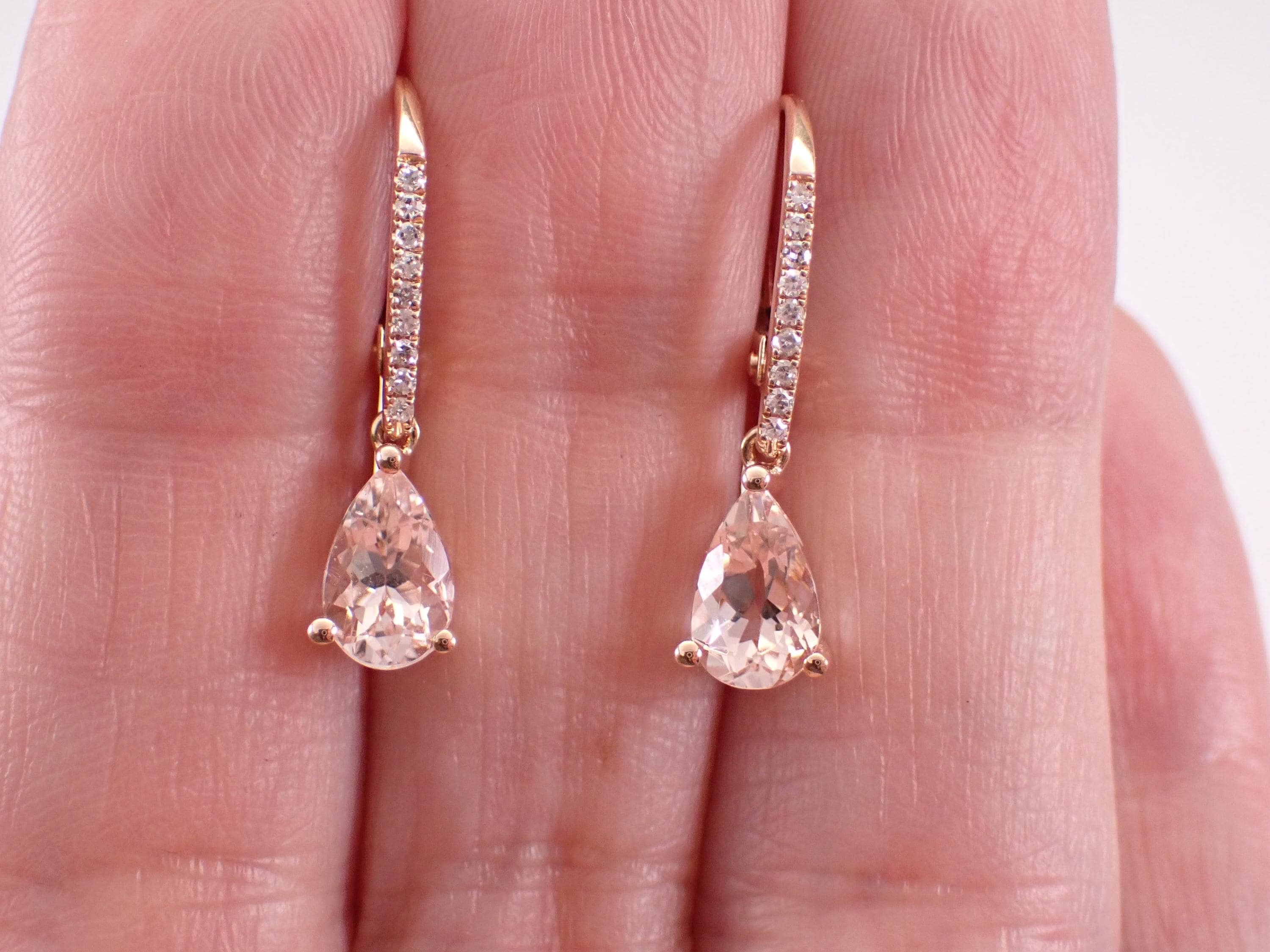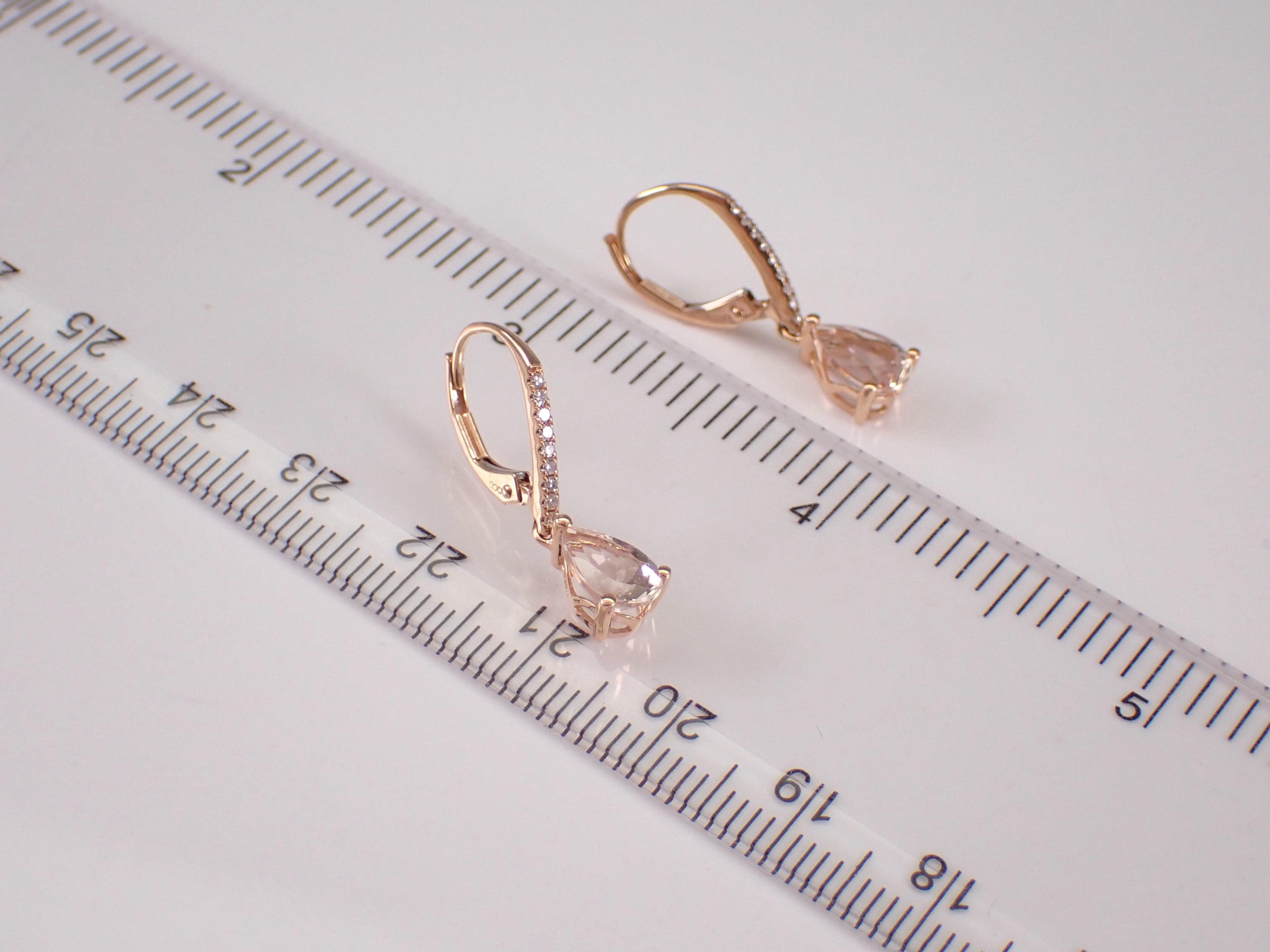 14K Rose Gold Diamond and Morganite Dangle Drop Earrings. There are two genuine Pear shaped Morganite and eighteen natural Round Brilliant Diamonds set in these earrings. The Morganite in these earrings are a peachy color, measure 7 X 5 mm and weigh a total of 1 1/2 carats. The diamonds in these earrings are H color, SI1 clarity and weigh a total of .15 carat. These earrings are 14KT Rose Gold, measure 23 mm in length and weigh a total of 2.0 grams. These earrings are for pierced ears and have leverback closures. These earrings will be accompanied by an appraisal written by a GIA Certified Diamond Grader with the retail replacement value of $2,085.00. I will ship these earrings promptly in a gift box.