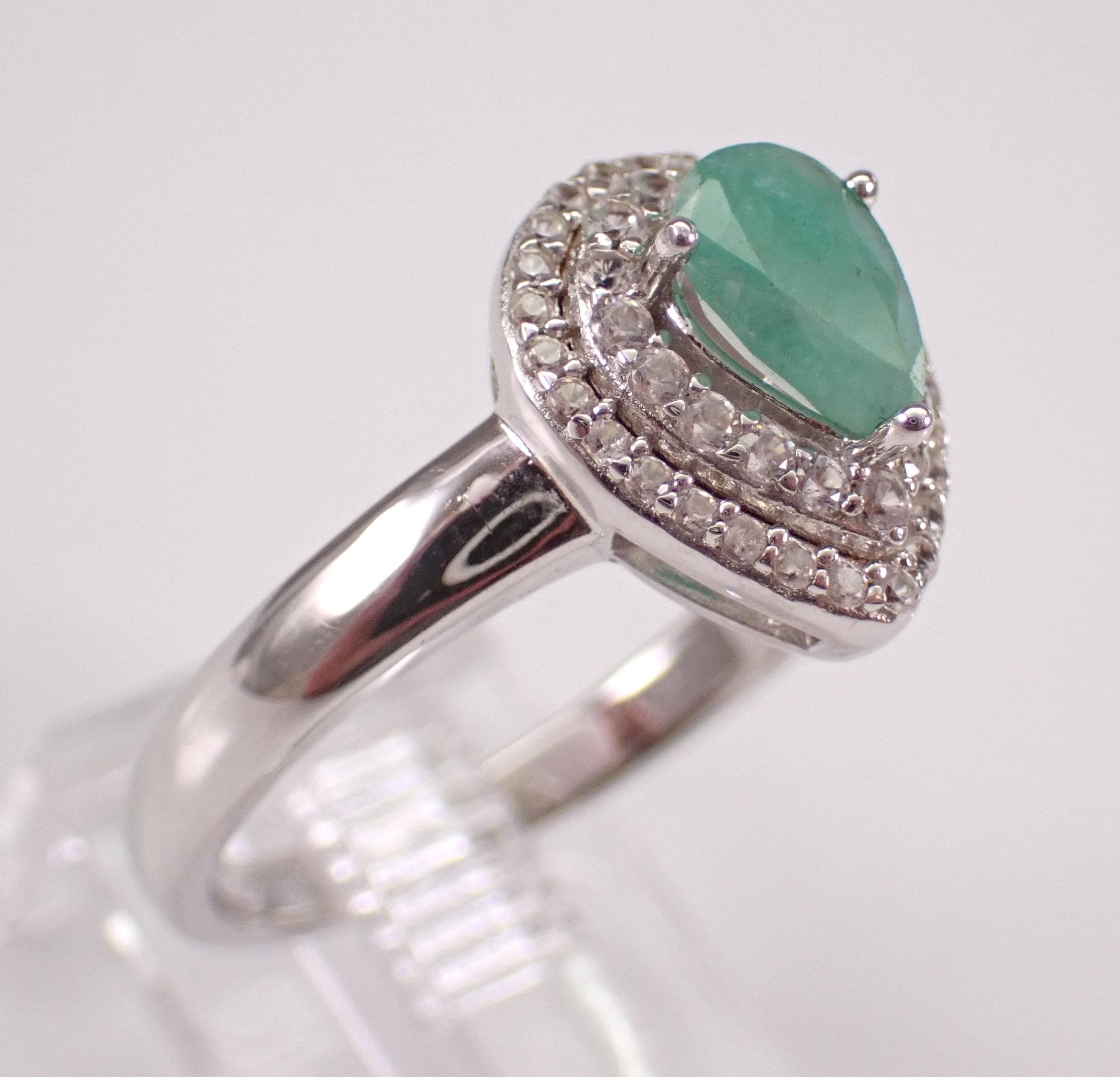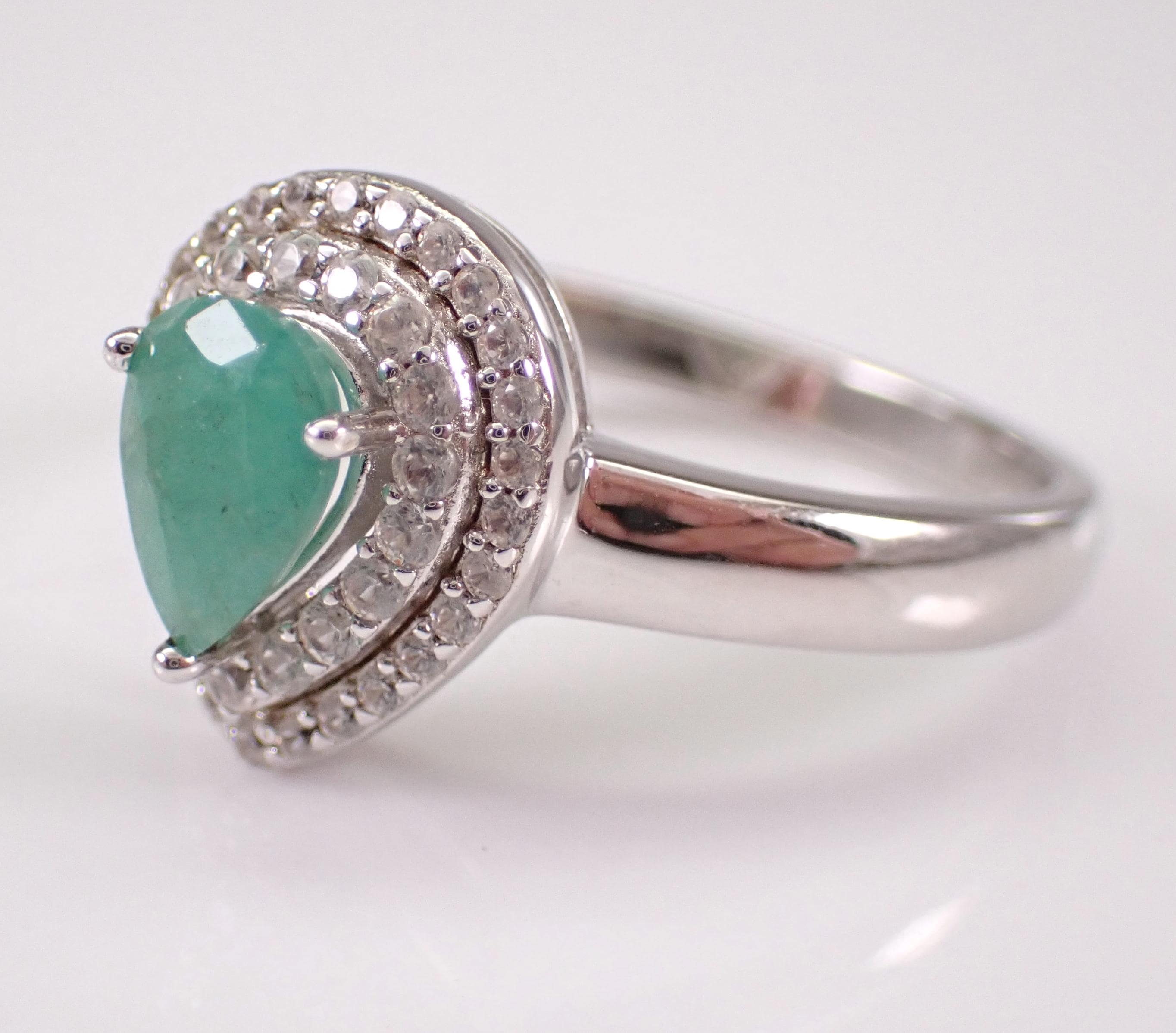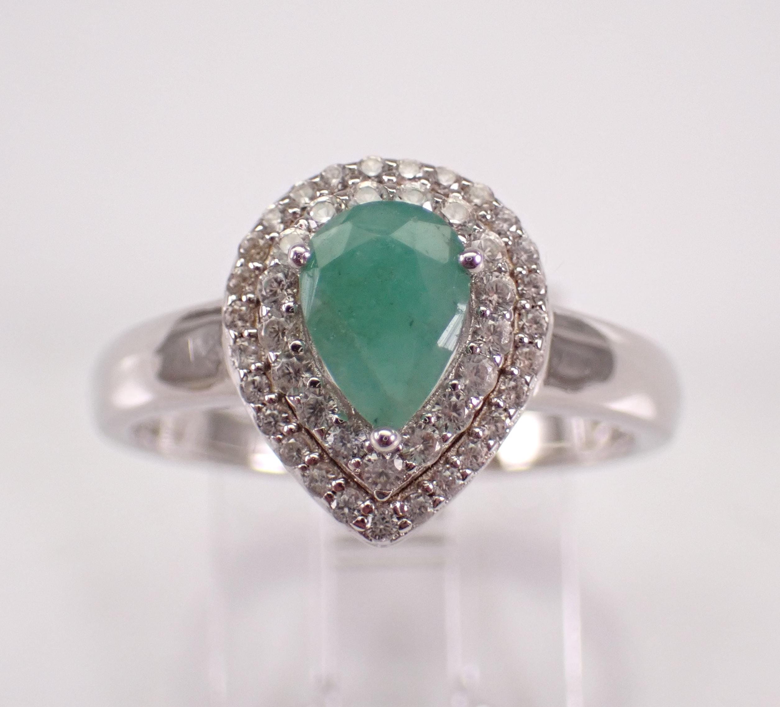 Vintage Sterling Silver Emerald and Cubic Zirconia ring. This ring is set with one genuine Pear shaped Emerald in the center and forty-two Round Cubic Zirconia. The Emerald is a light green color, measures 7 X 5 mm and weighs 1 carat. The ring is made of Sterling Silver and marked 925. This ring is in very good, excellent condition, is finger size 7 and weighs 3.1 grams. This ring will be shipped promptly in a gift pouch.