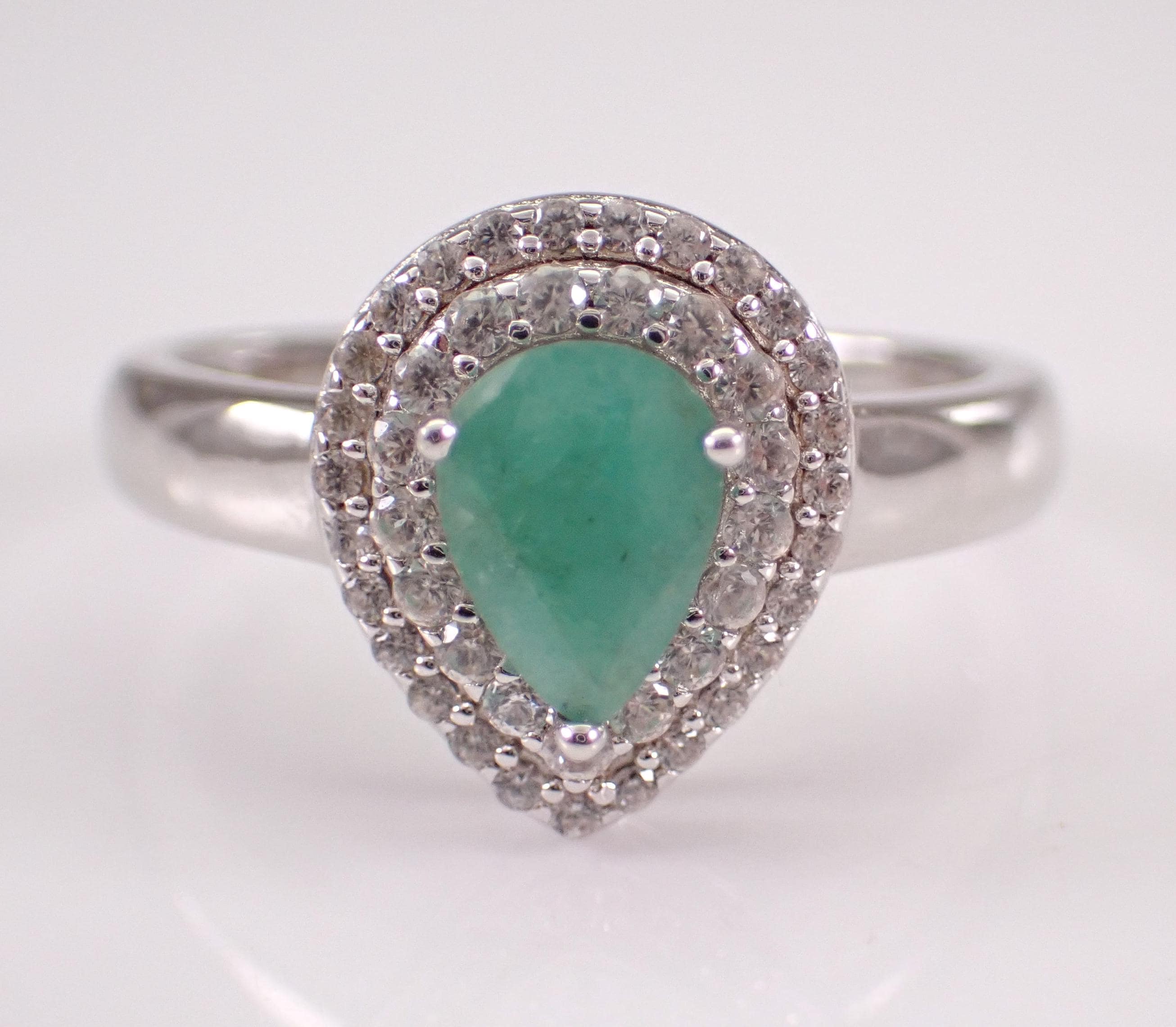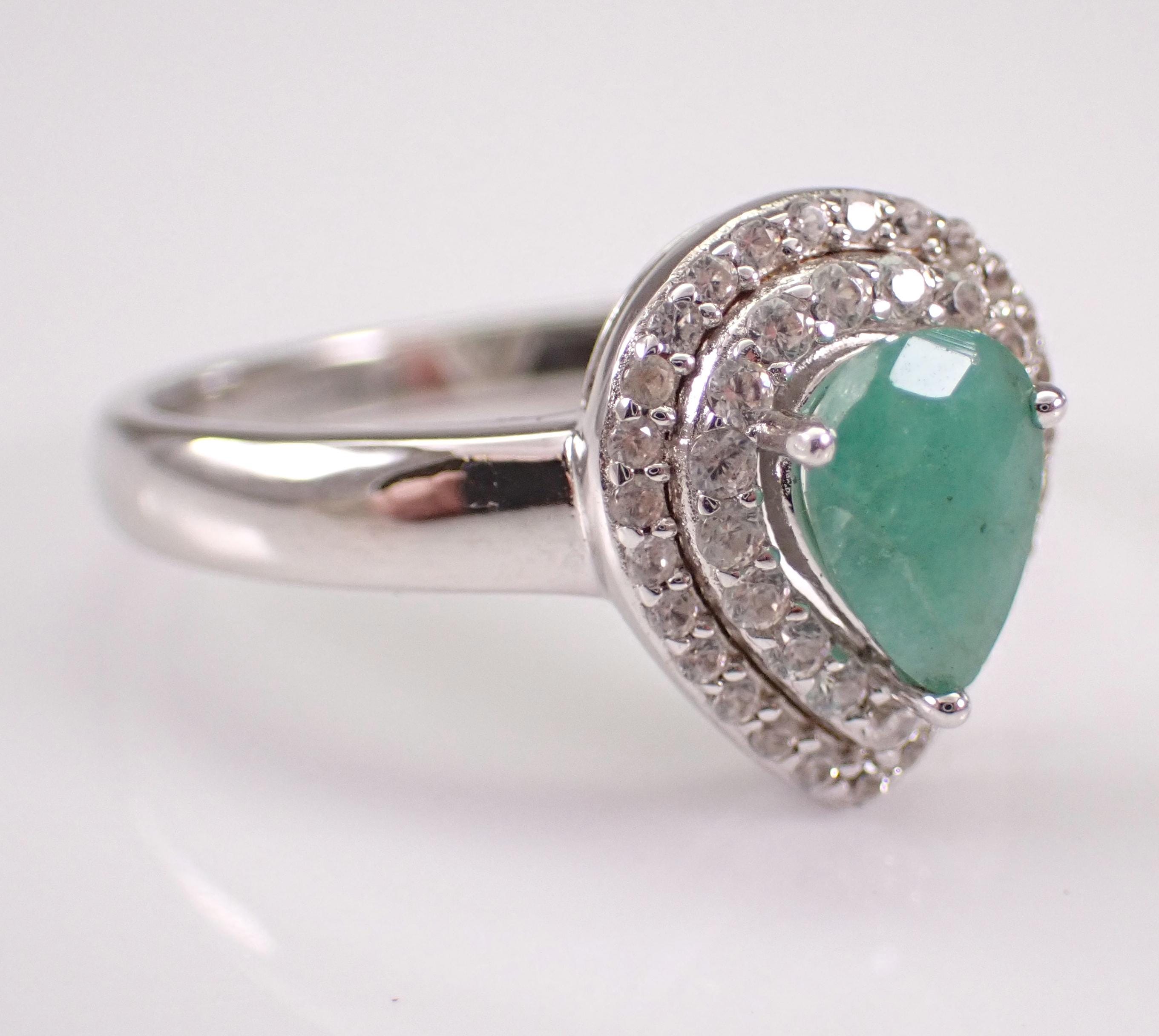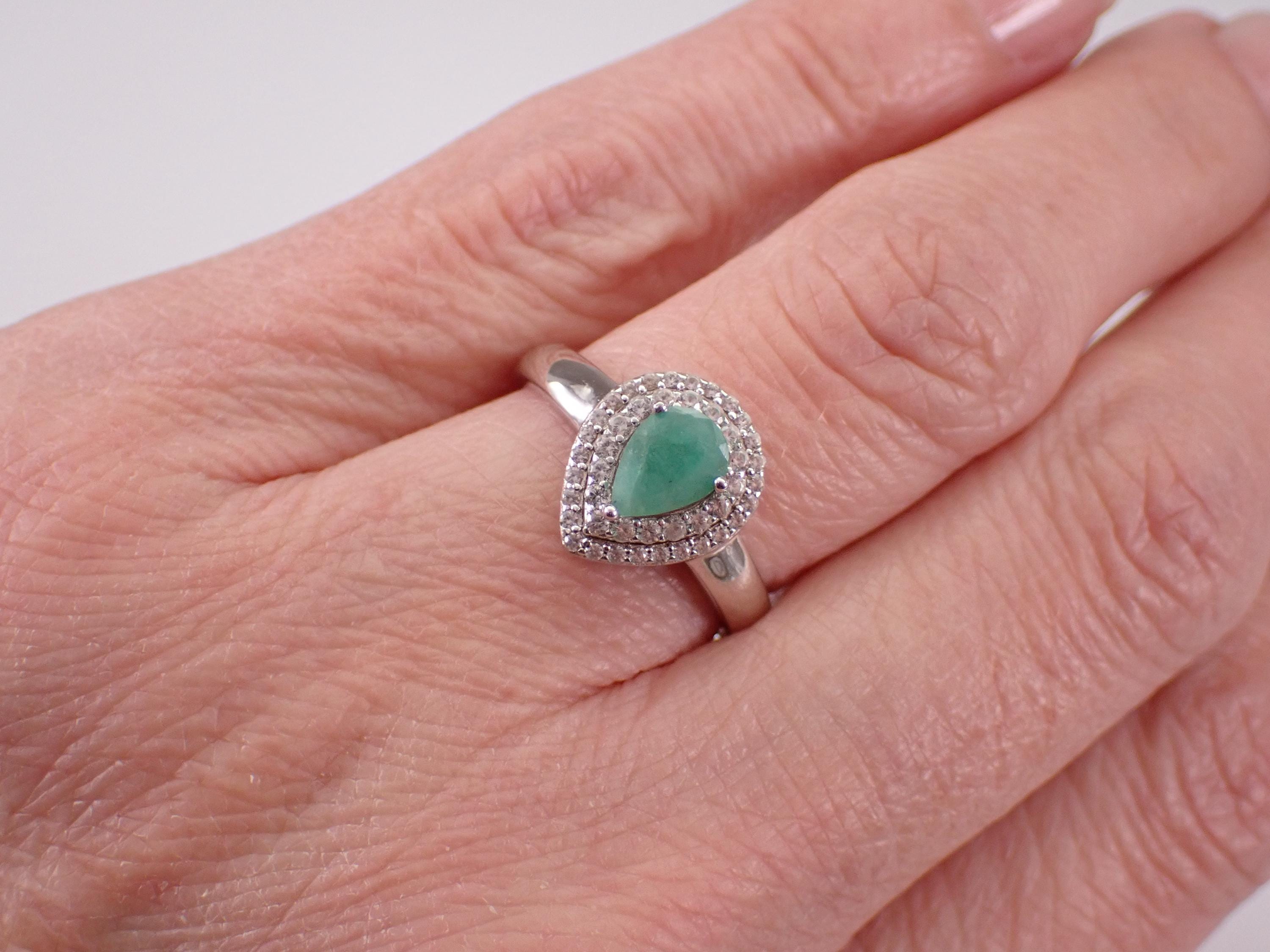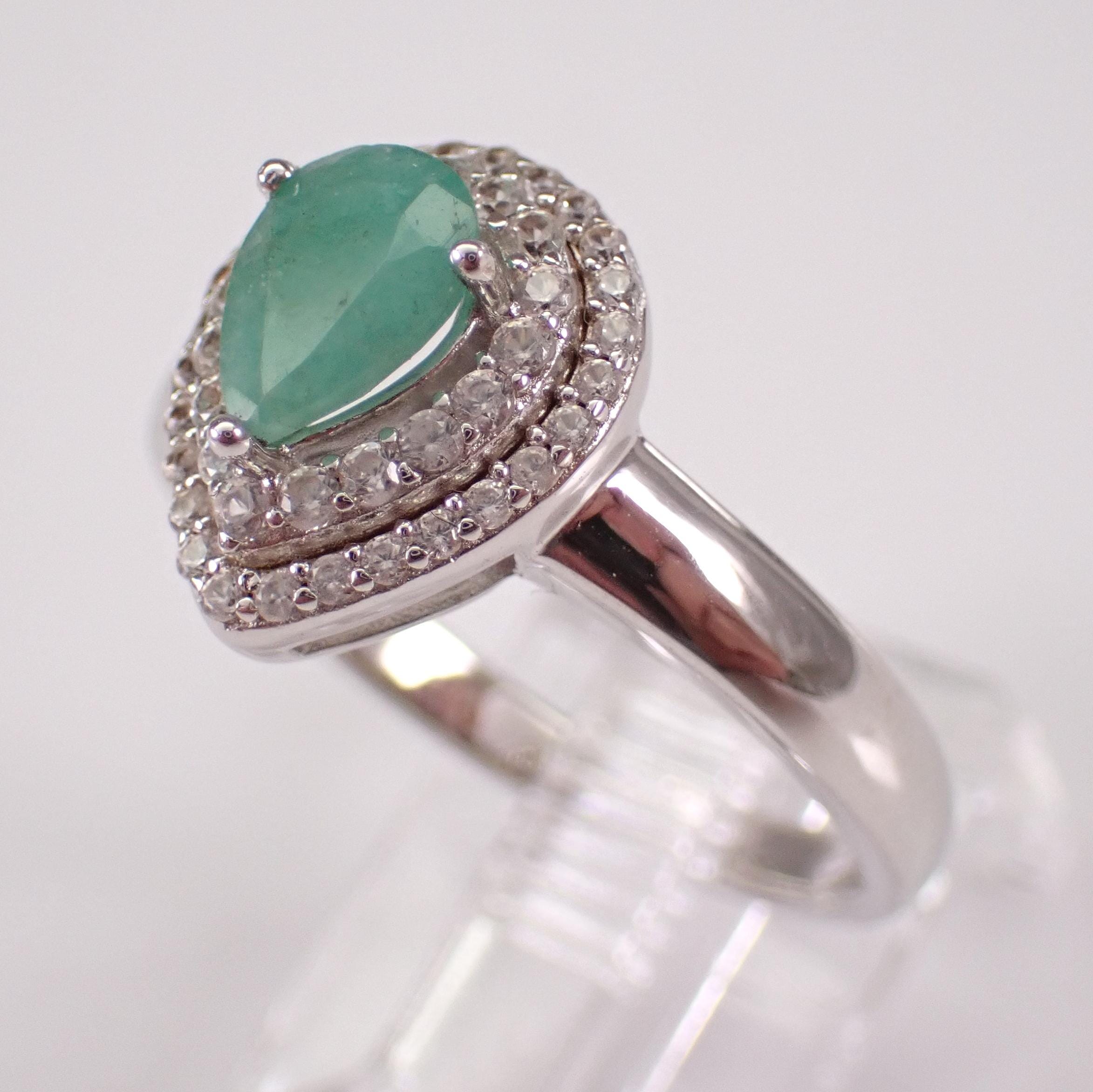 Vintage Sterling Silver Emerald and Cubic Zirconia ring. This ring is set with one genuine Pear shaped Emerald in the center and forty-two Round Cubic Zirconia. The Emerald is a light green color, measures 7 X 5 mm and weighs 1 carat. The ring is made of Sterling Silver and marked 925. This ring is in very good, excellent condition, is finger size 7 and weighs 3.1 grams. This ring will be shipped promptly in a gift pouch.