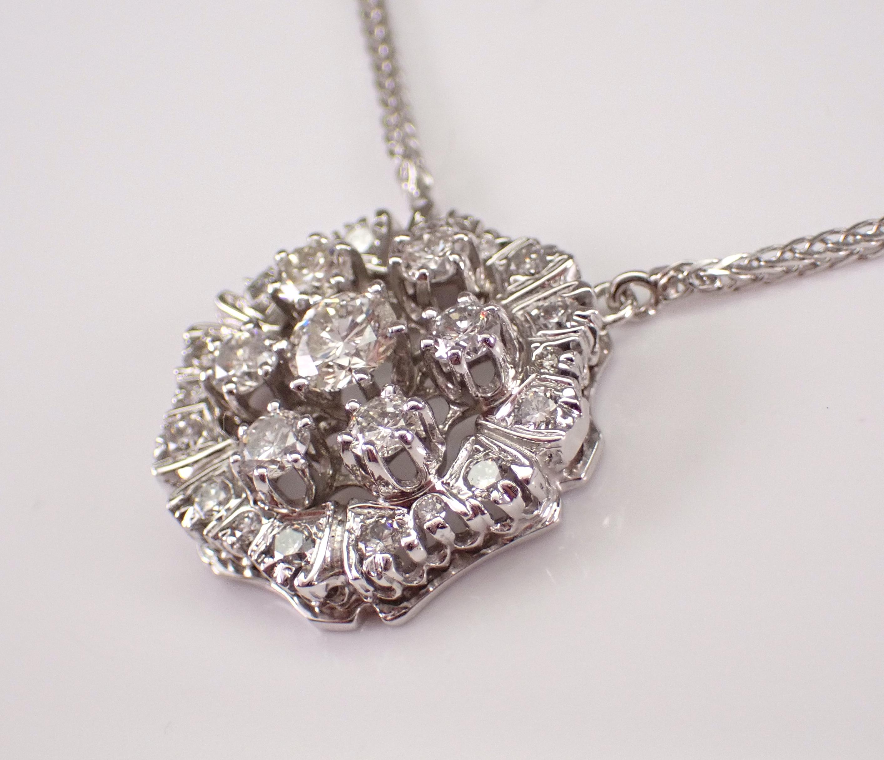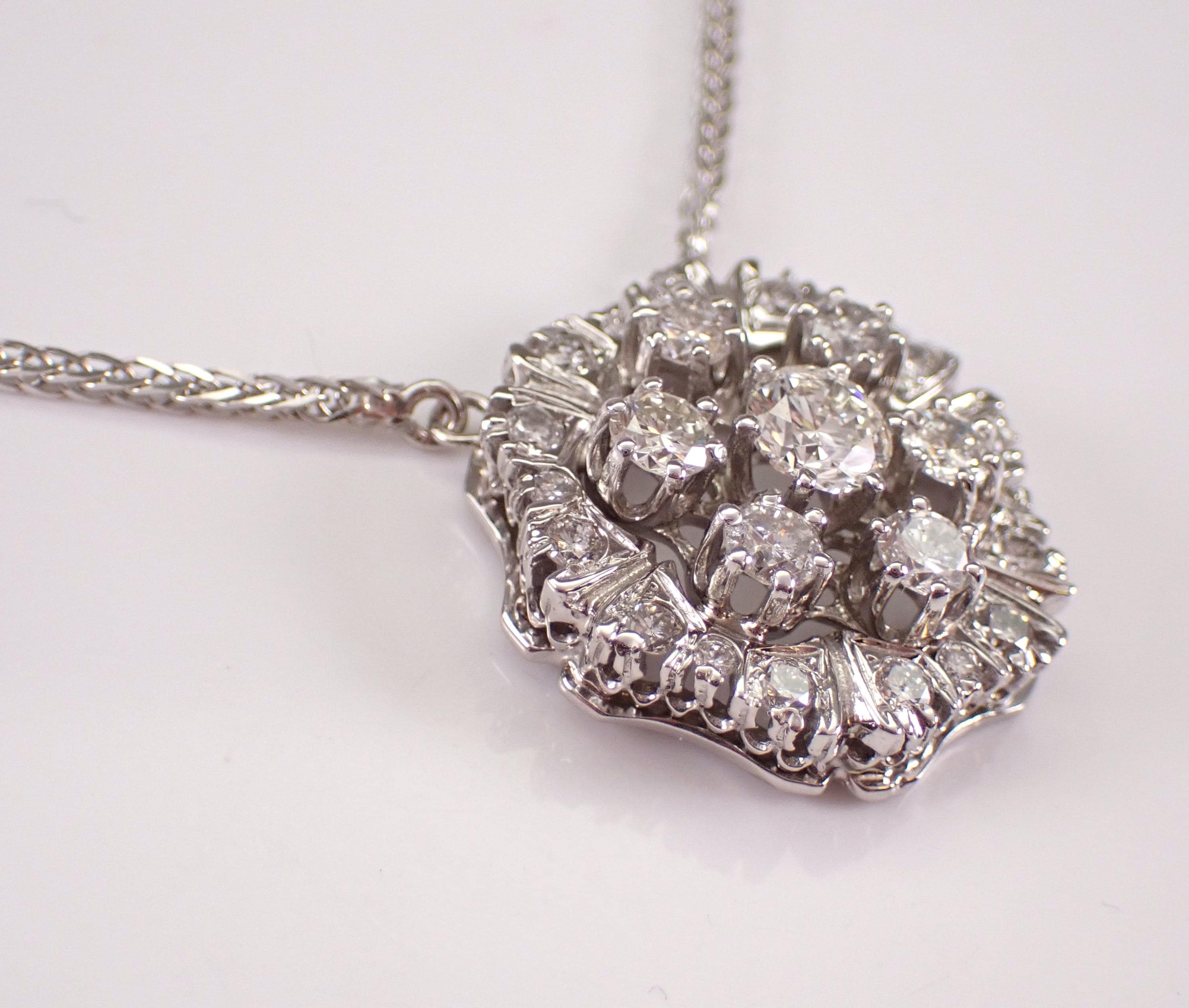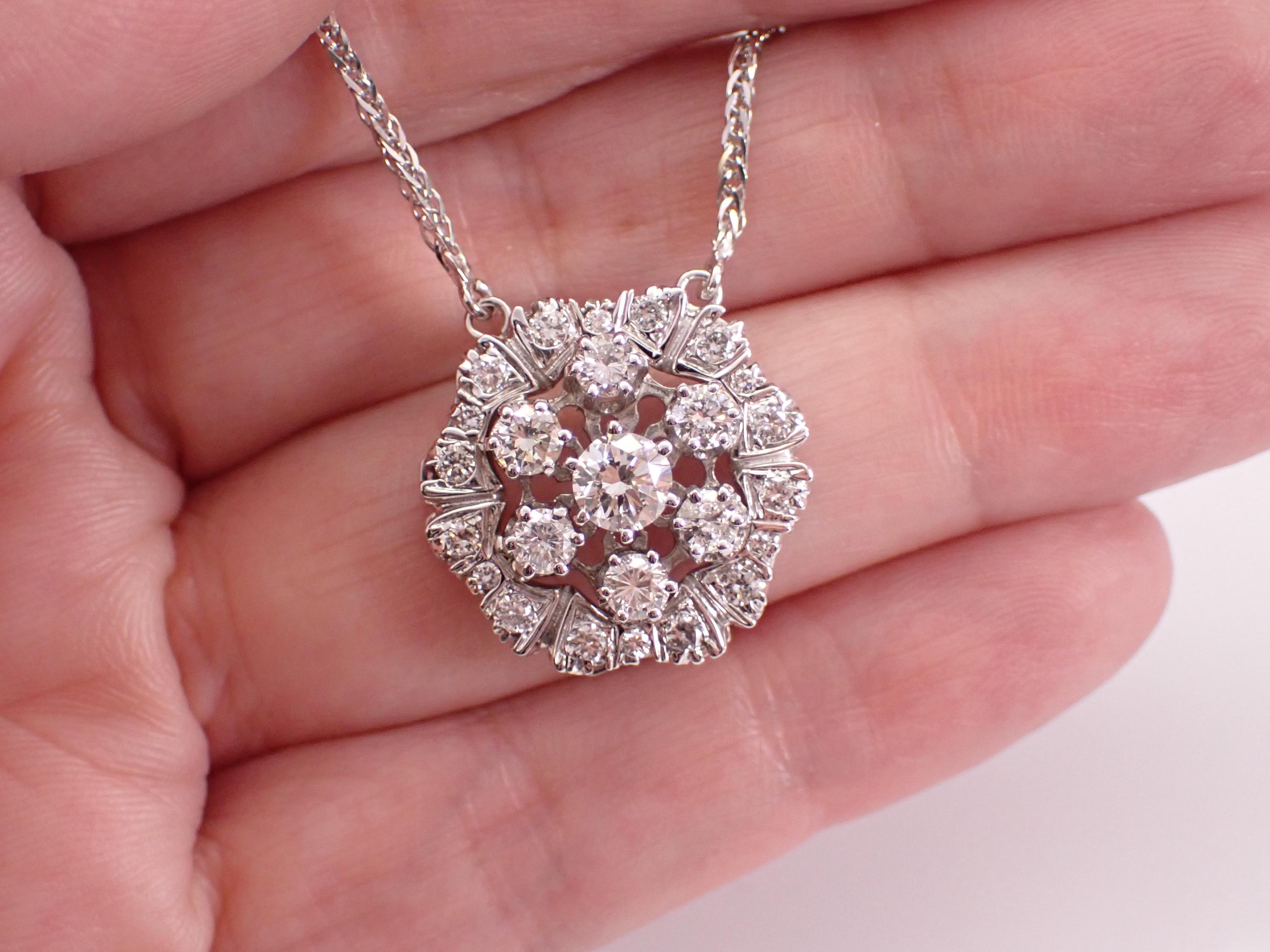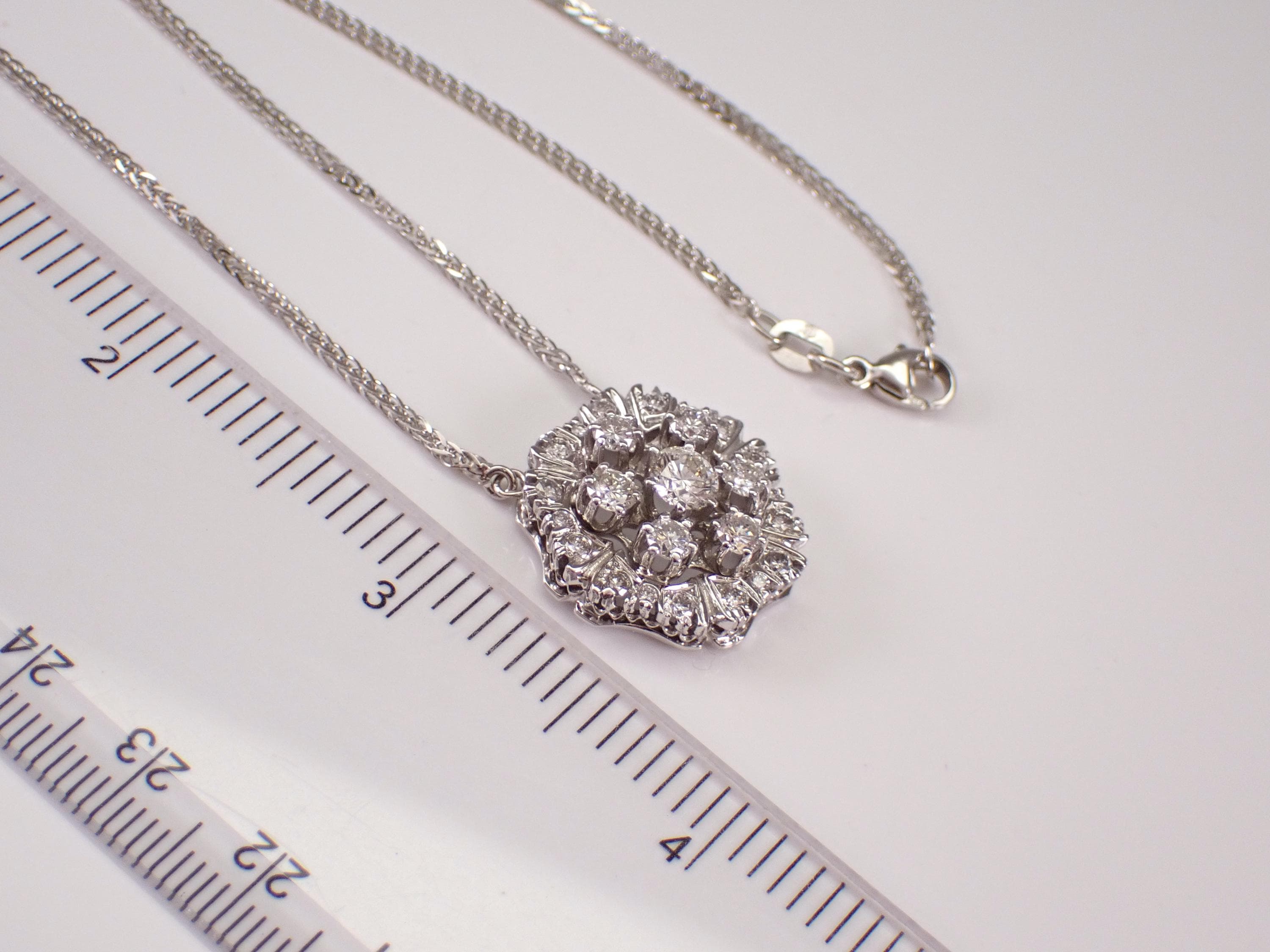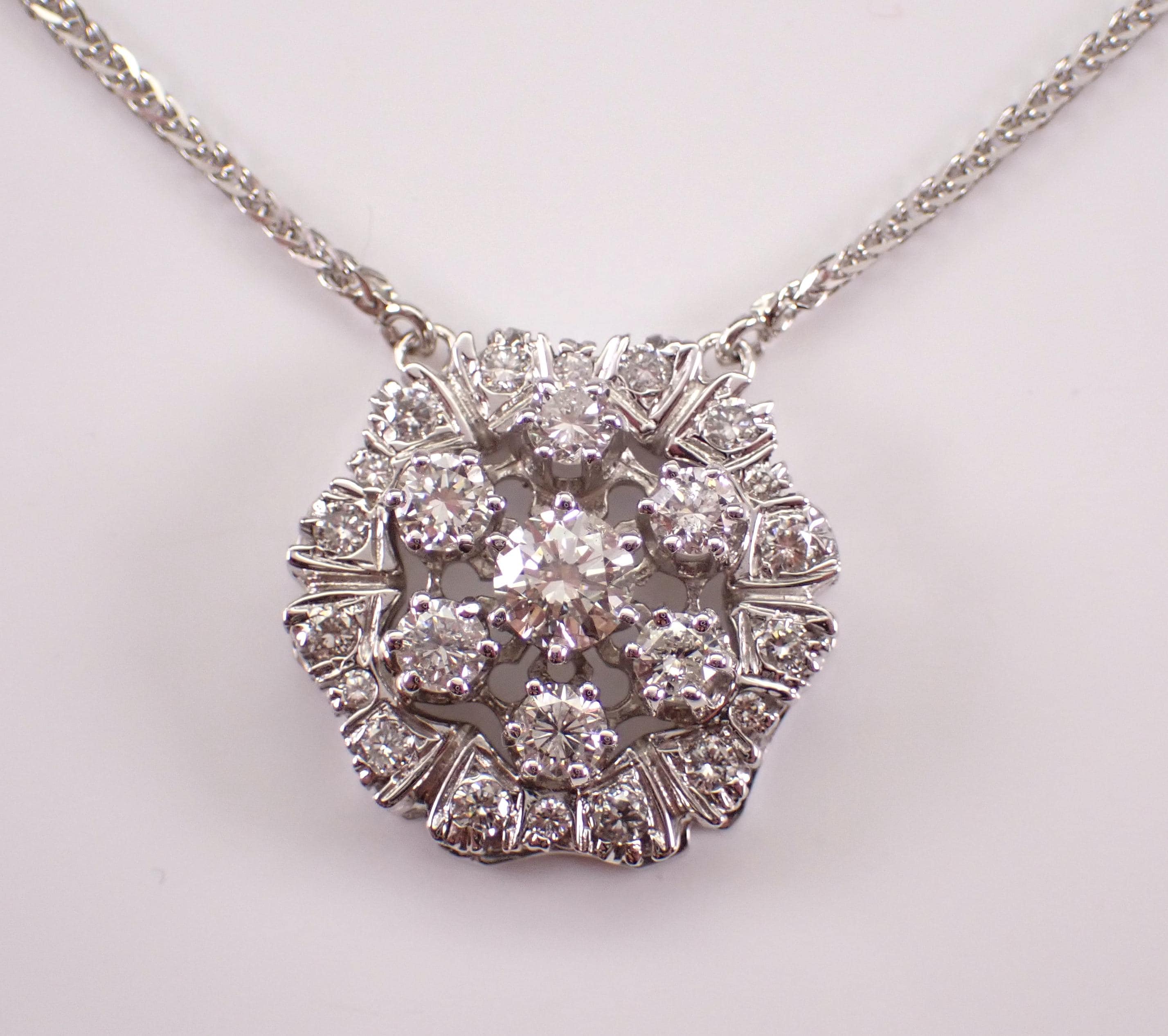 Antique 14K White Gold Diamond Pendant Necklace. This pendant is set with twenty-five genuine Round Brilliant Diamonds. These diamonds are G color, SI2 clarity and weigh a total of 1.20 carats. The center diamond weighs 1/2 carat. This pendant comes attached to a 14K White Gold chain that measures 18" in overall length. This necklace weighs 8.2 grams and the pendant measures 20 mm in diameter. This Necklace dates back to Circa 1950's and will be accompanied by an appraisal with the replacement value of $4,895.00. I will ship this pendant promptly in a beautiful gift box.