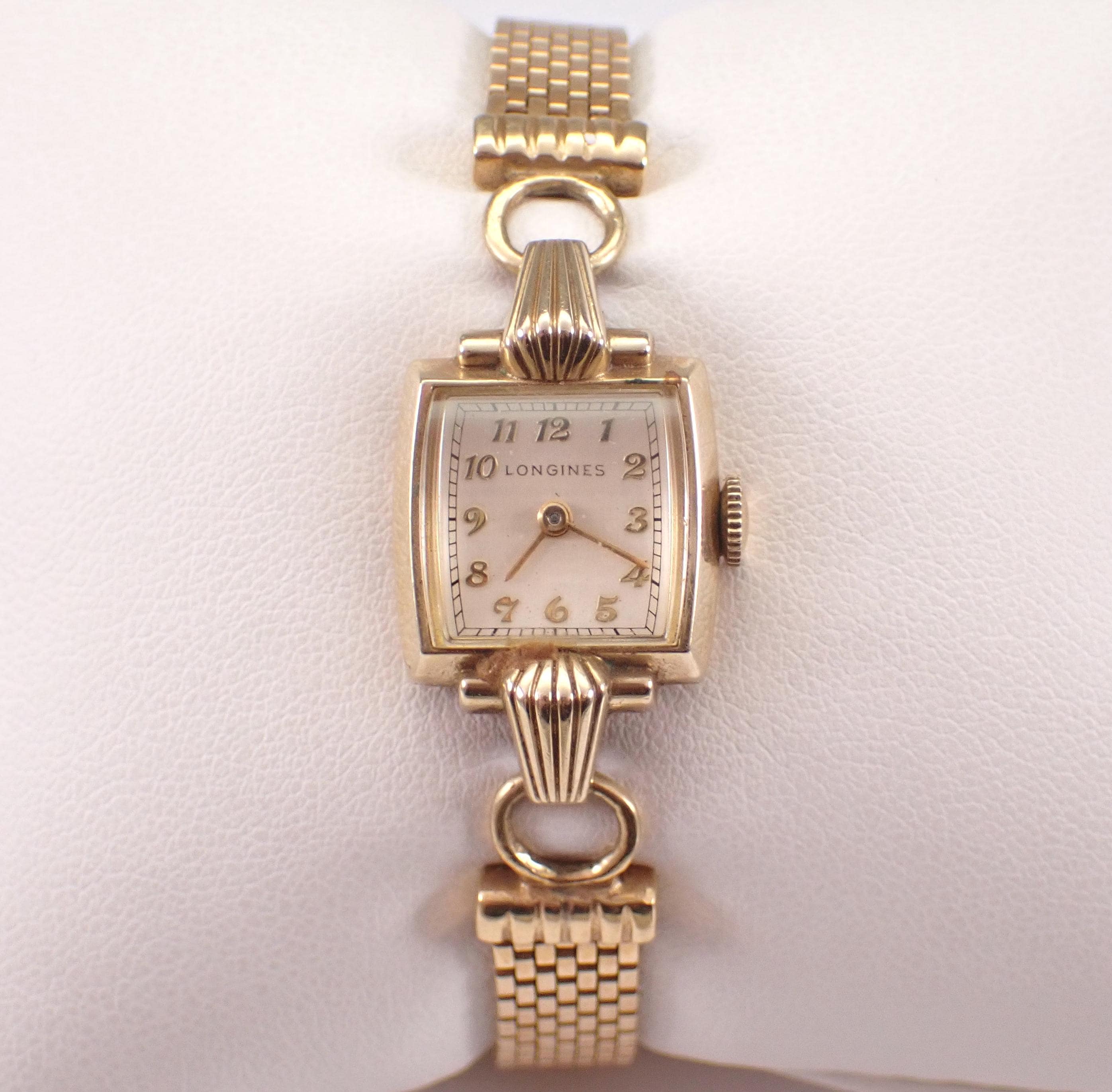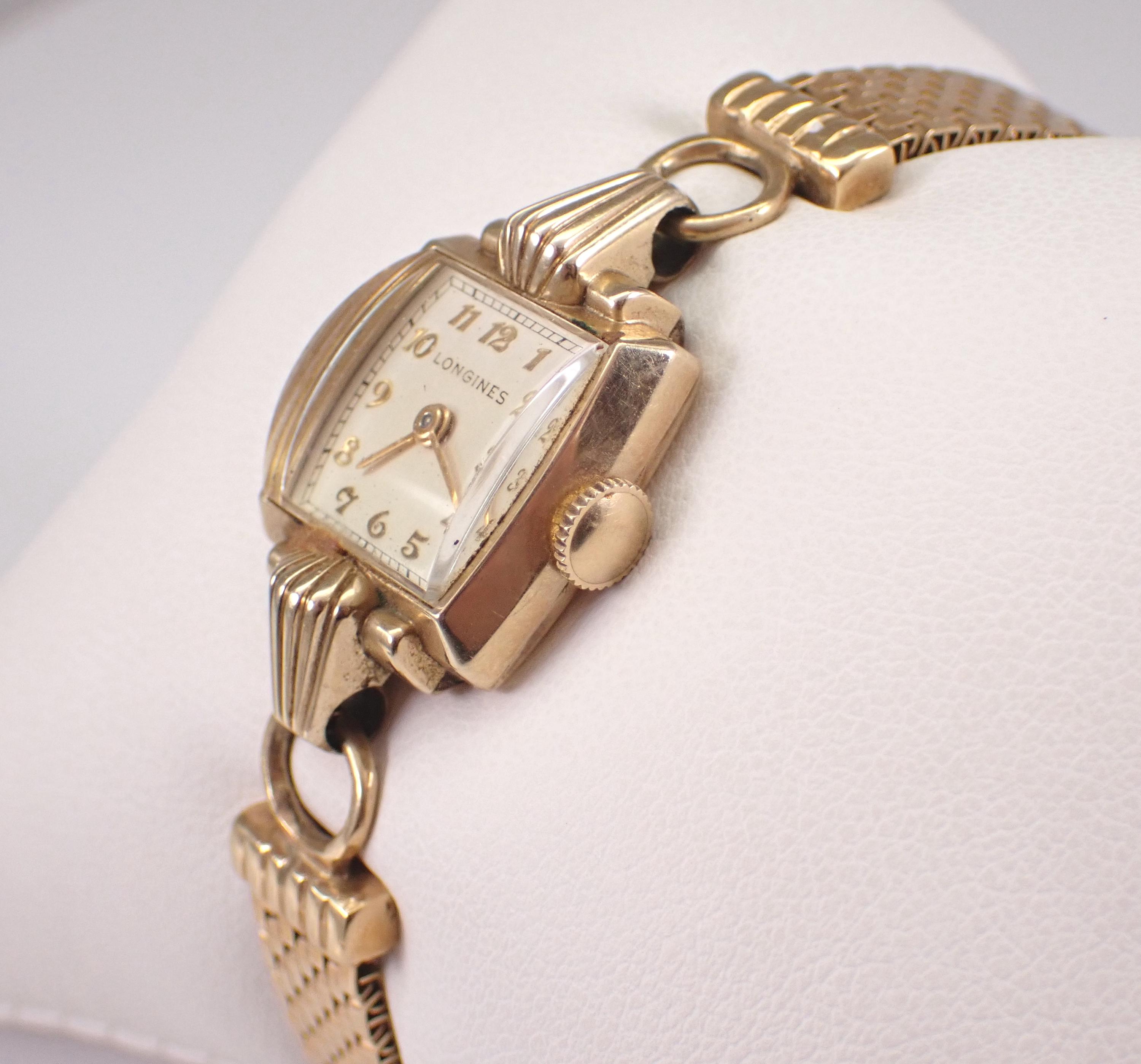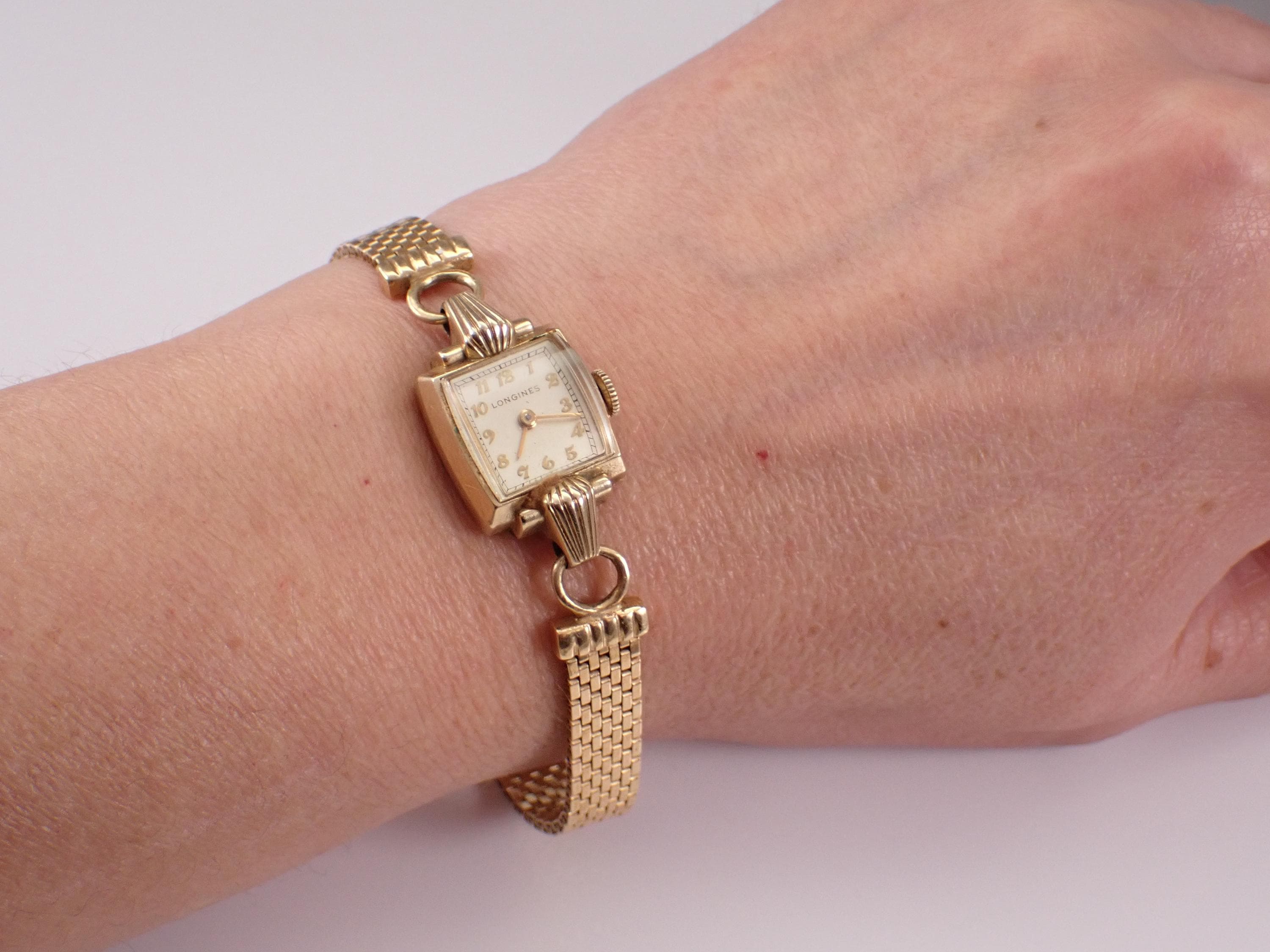 Vintage 14K Yellow Gold Longines Watch, dating back to the 1960's. Mechanical movement in good working condition. The watch case and bracelet are both crafted in a 14K Yellow Gold. The bracelet of this watch is mesh type bracelet with a secure latch closure. The watch weighs 23.7 grams and measures 6 3/4" in length. The watch face measures 20 X 17 mm and the band measures 7.5 mm in width. This watch will ship promptly in a gift box (not original box), accompanied by an appraisal for insurance and authentication purposes.