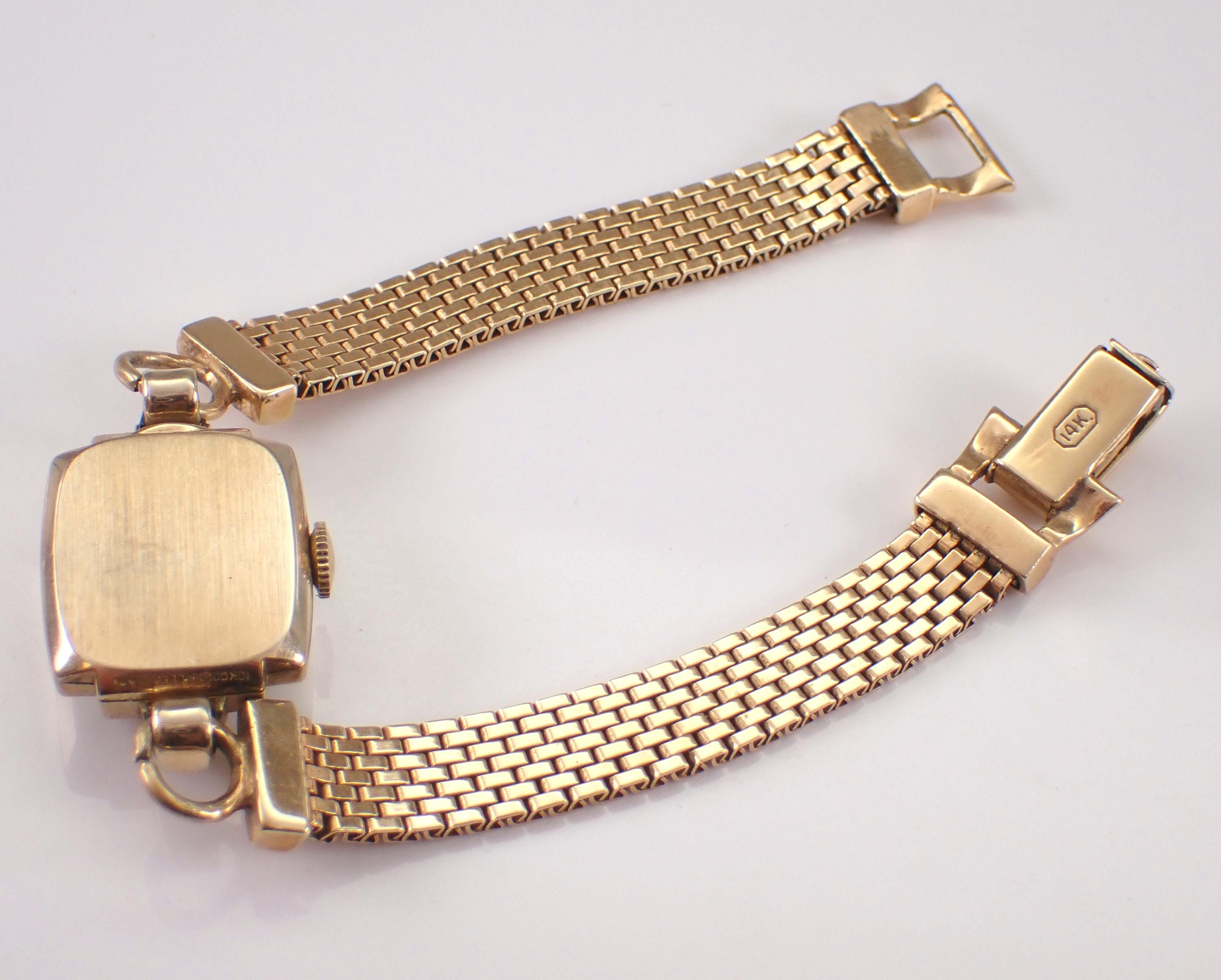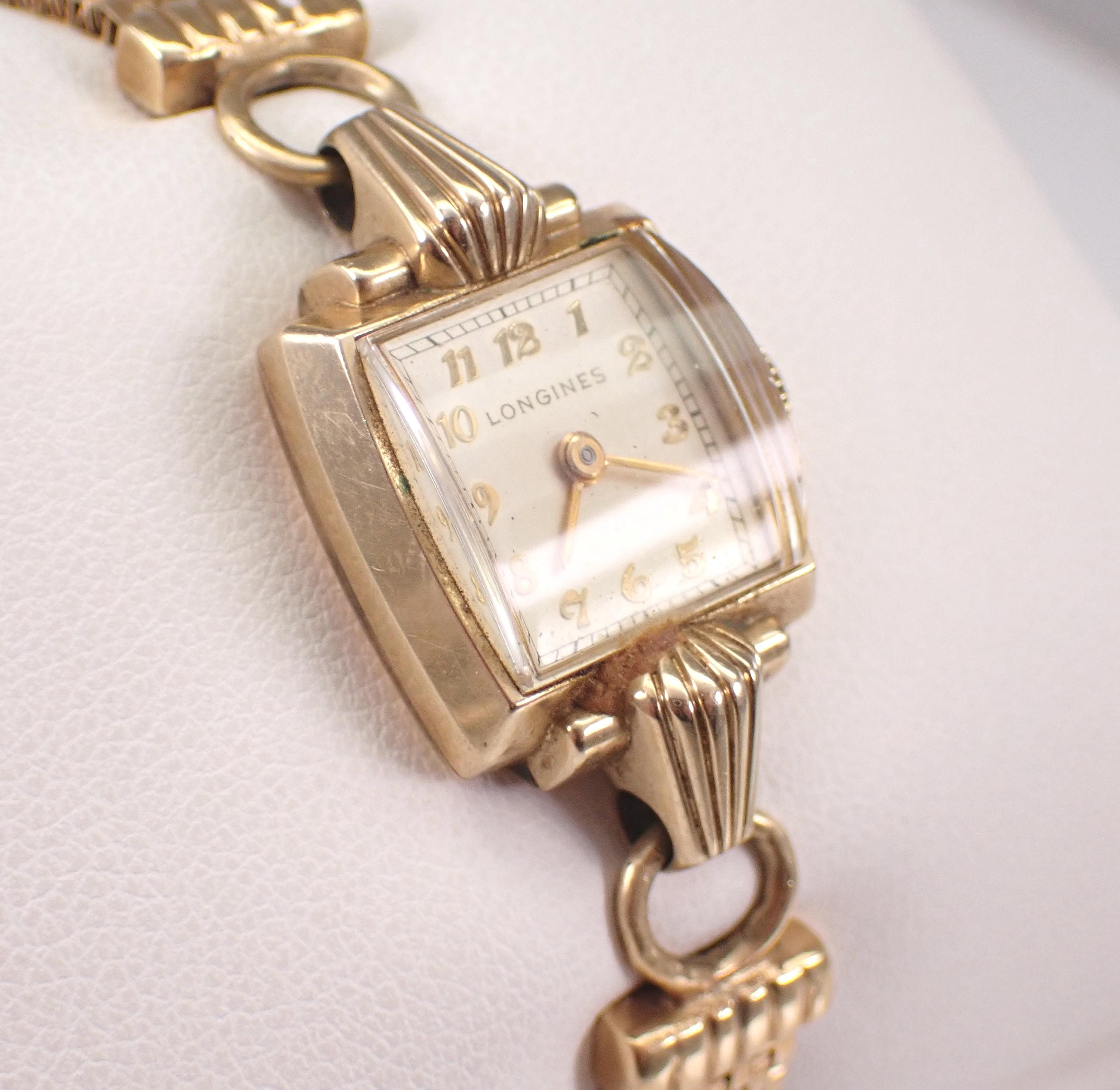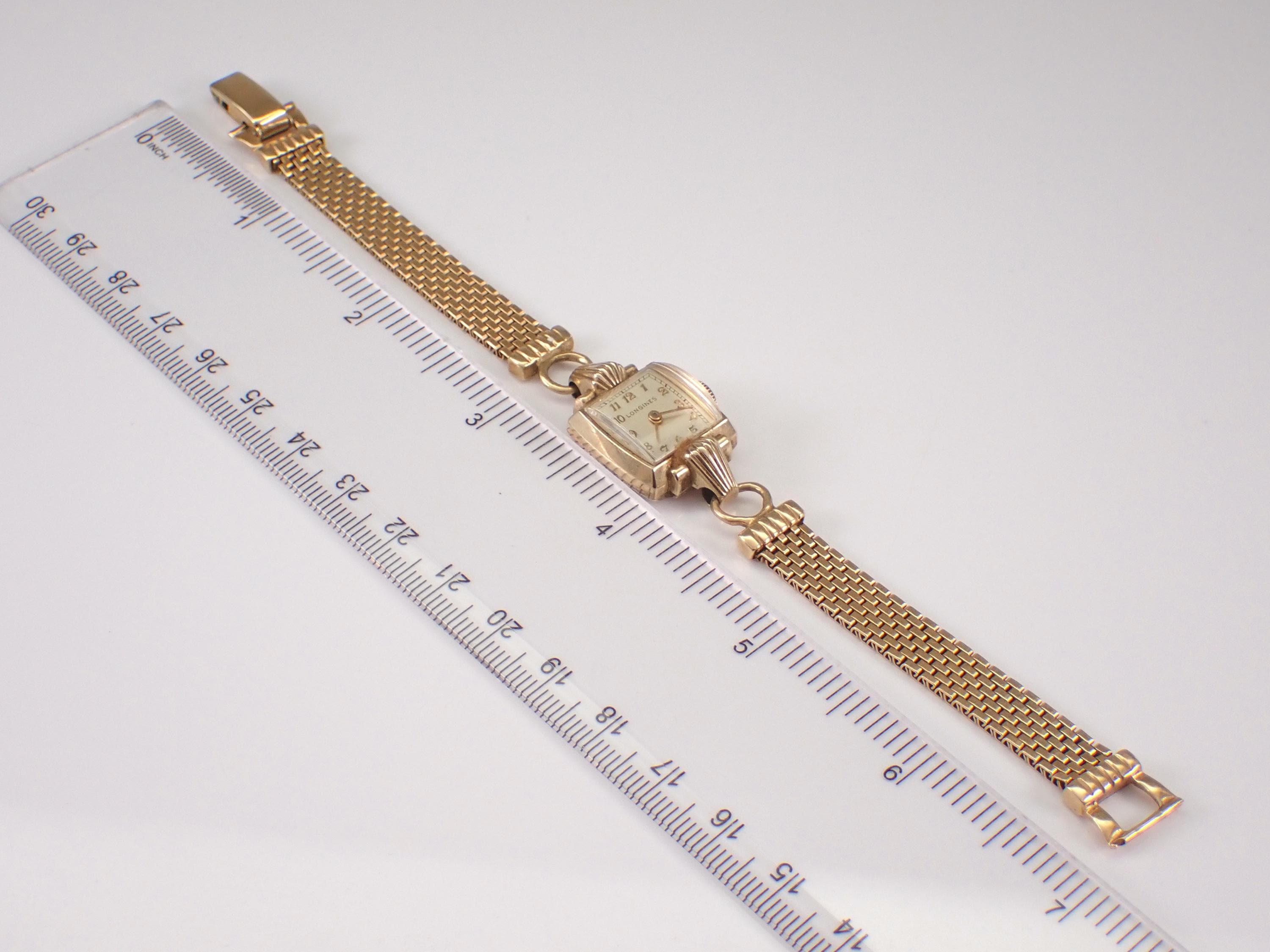 Vintage 14K Yellow Gold Longines Watch, dating back to the 1960's. Mechanical movement in good working condition. The watch case and bracelet are both crafted in a 14K Yellow Gold. The bracelet of this watch is mesh type bracelet with a secure latch closure. The watch weighs 23.7 grams and measures 6 3/4" in length. The watch face measures 20 X 17 mm and the band measures 7.5 mm in width. This watch will ship promptly in a gift box (not original box), accompanied by an appraisal for insurance and authentication purposes.