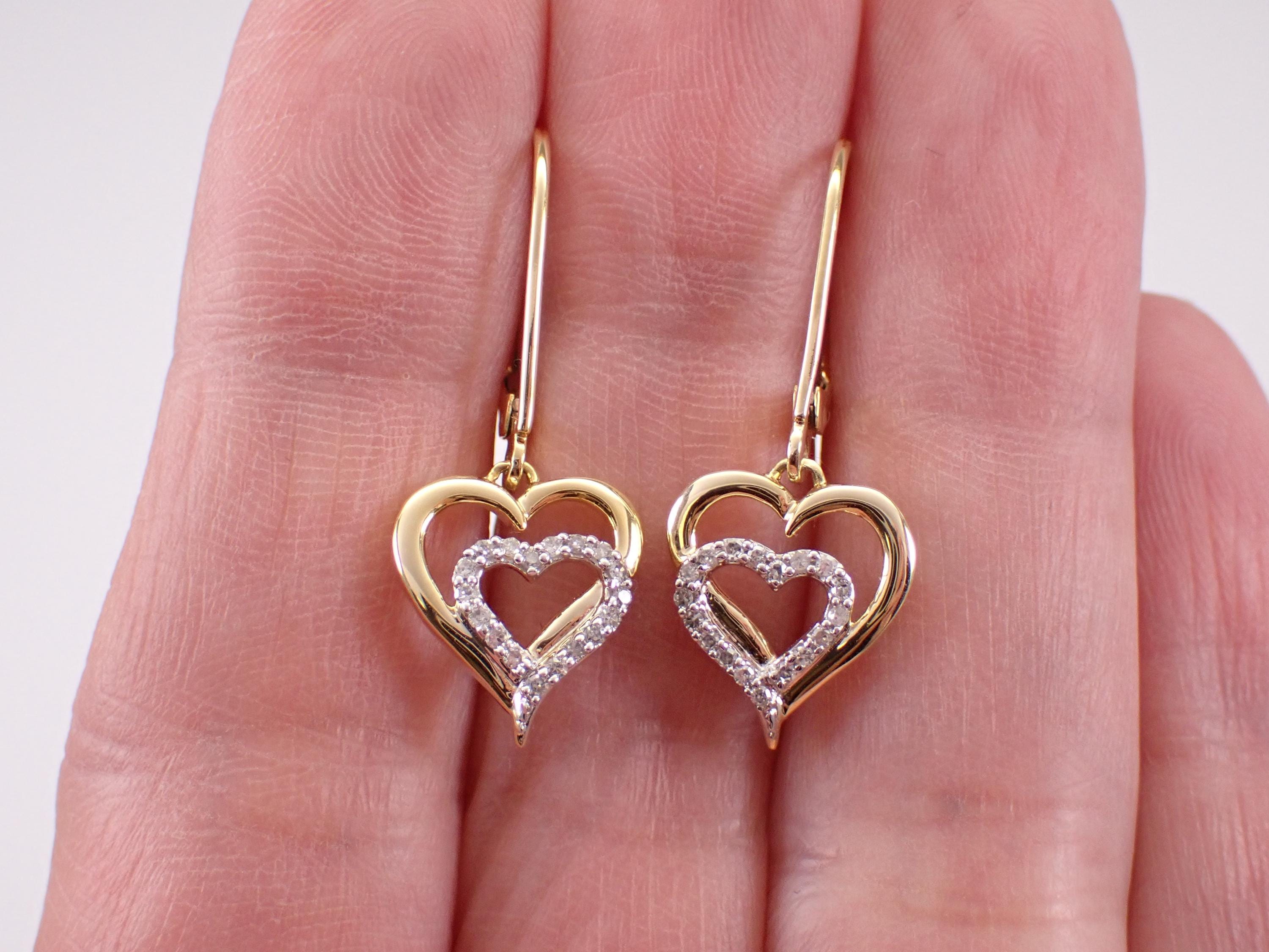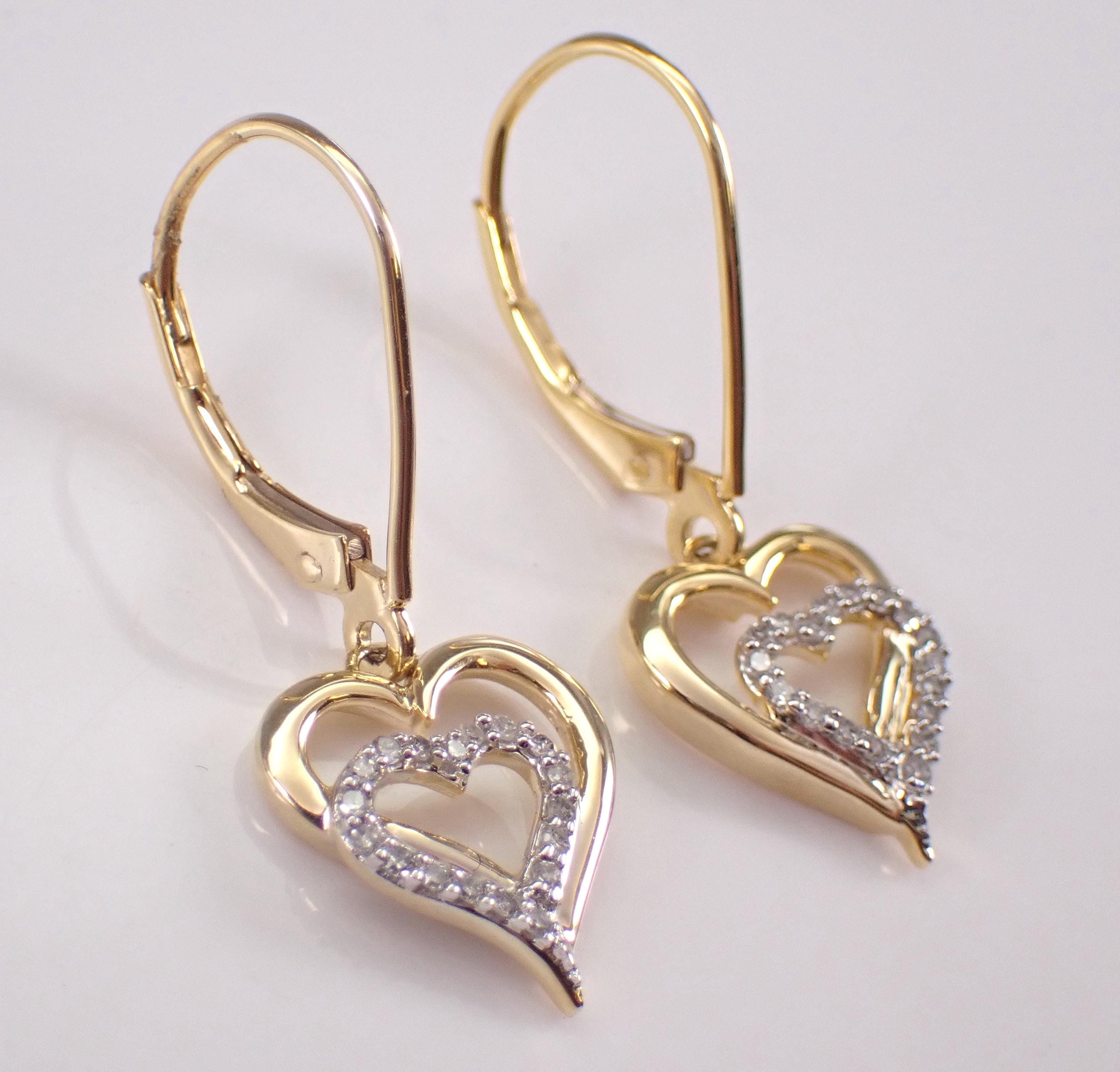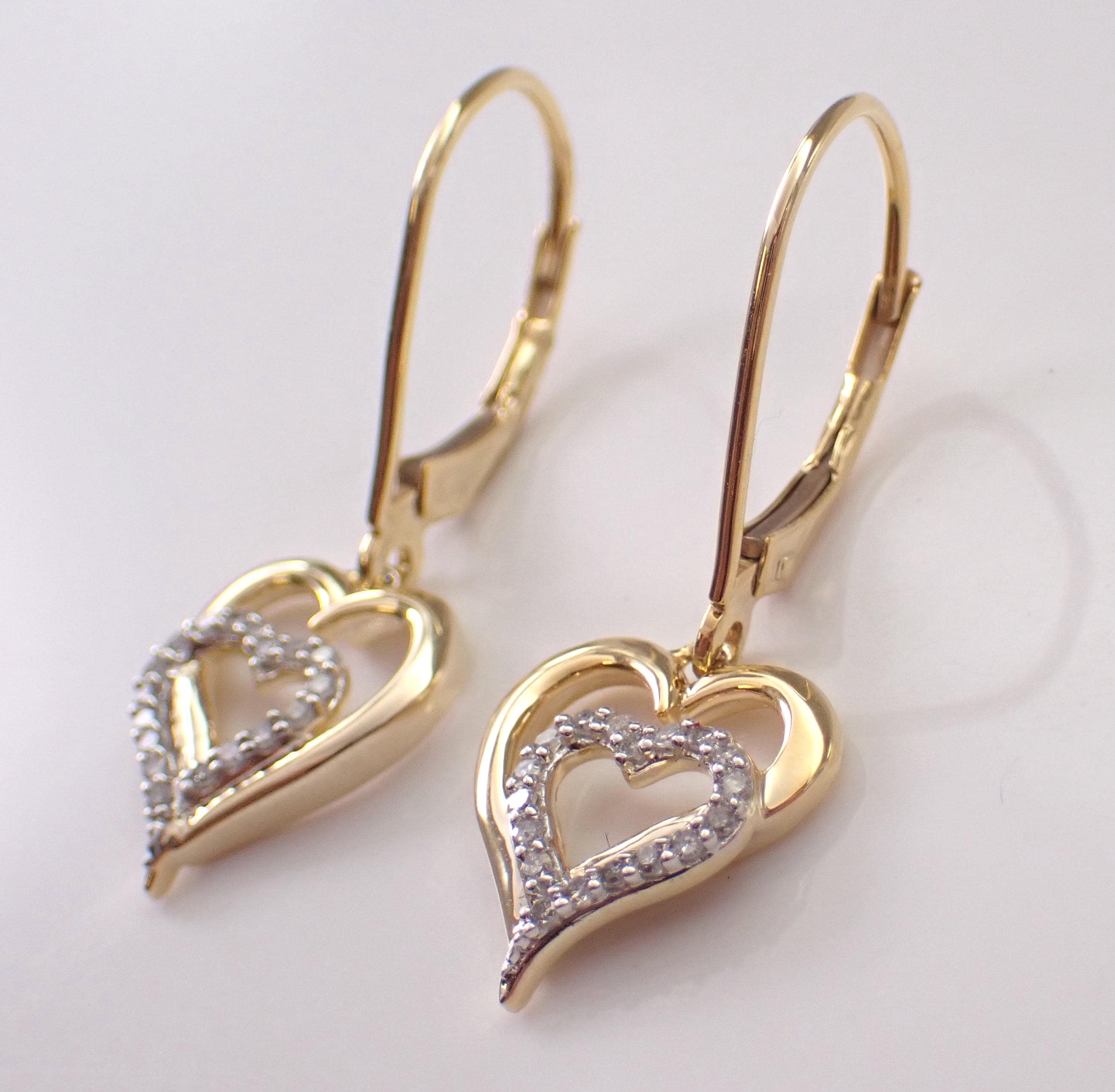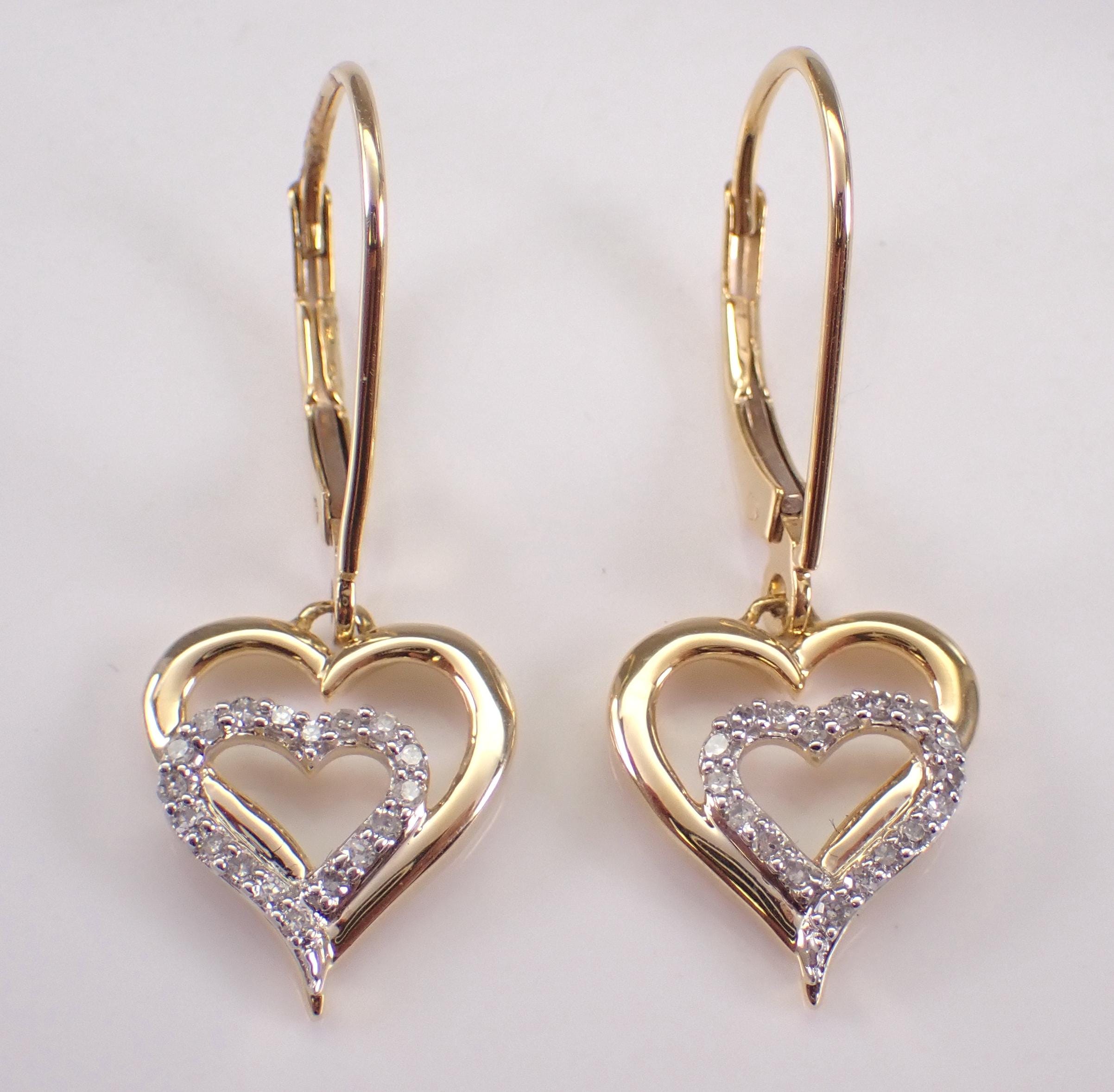 Yellow Gold Diamond Heart Dangle Earrings. There are eighteen natural Round Brilliant Diamond set in EACH earring. These diamonds are H color, SI/I1 clarity and weigh a total of .15 carat. These earrings are 10KT Yellow Gold and weigh a total of 2.6 grams. These earrings are for pierced ears, measure 30 mm in length and have lever back clasps for pierced ears. These earrings will be accompanied by an appraisal written by a GIA Certified Diamond Grader with the retail replacement value of $1,295.00. I will ship these earrings promptly in a gift box.
