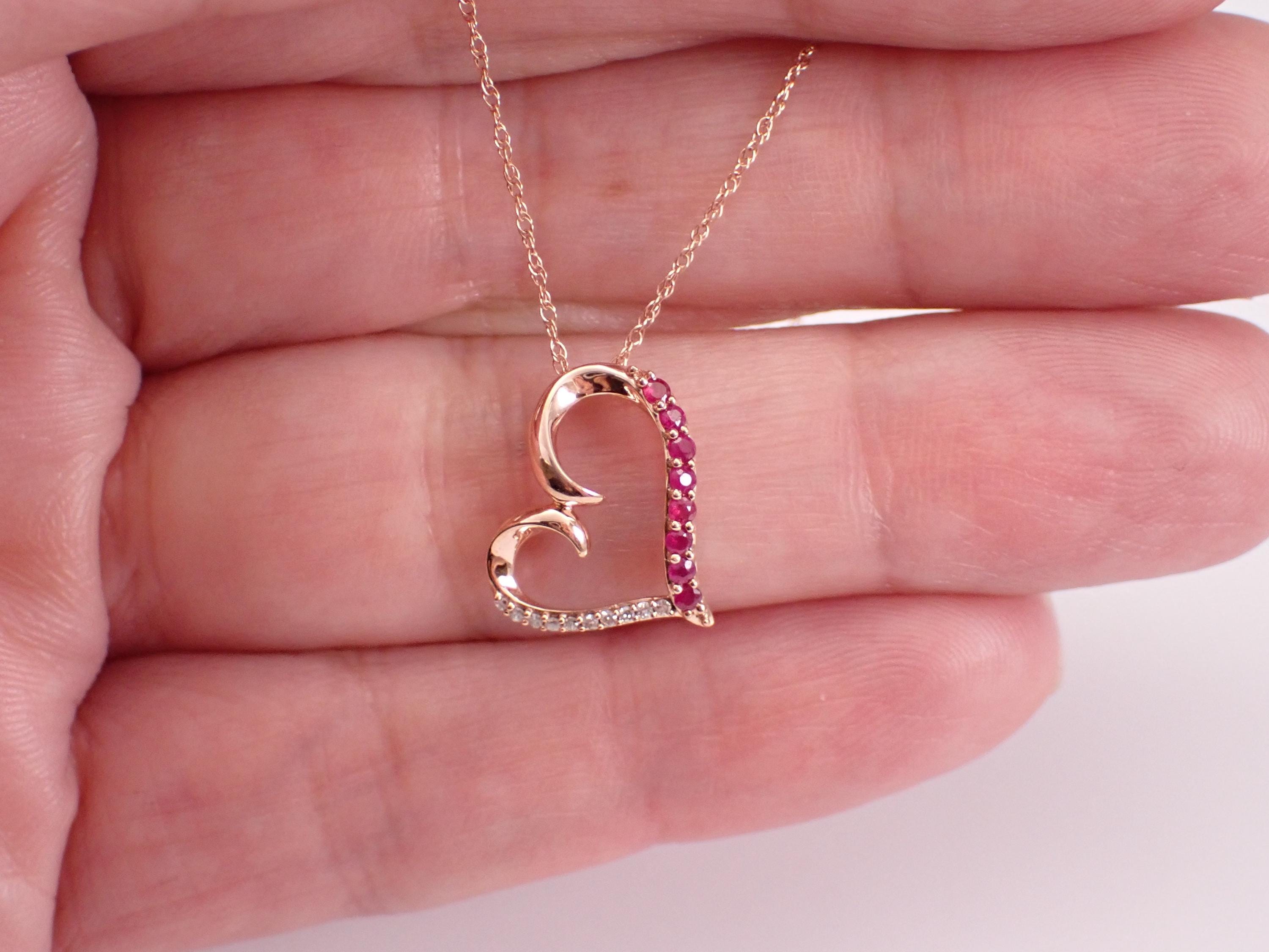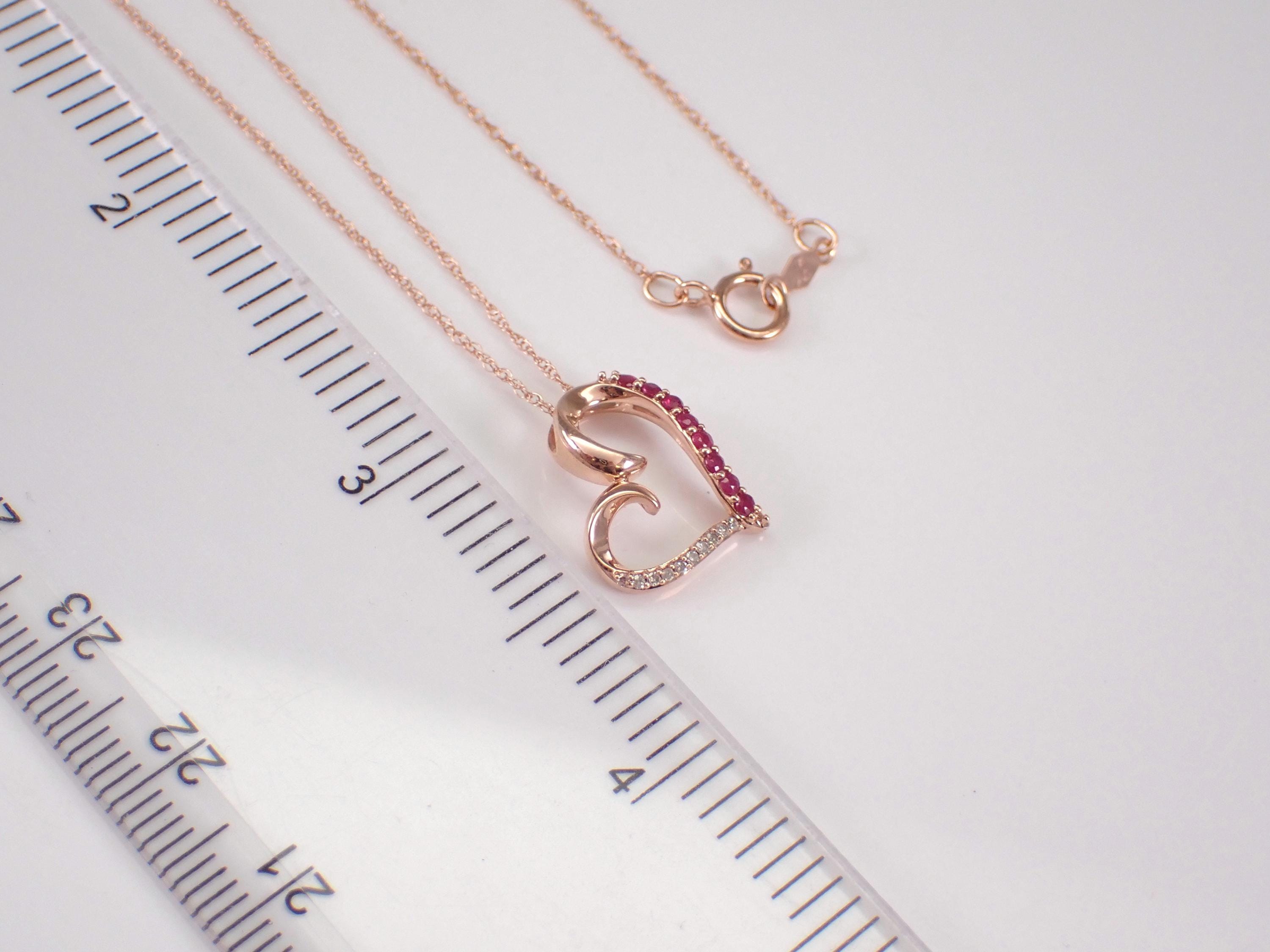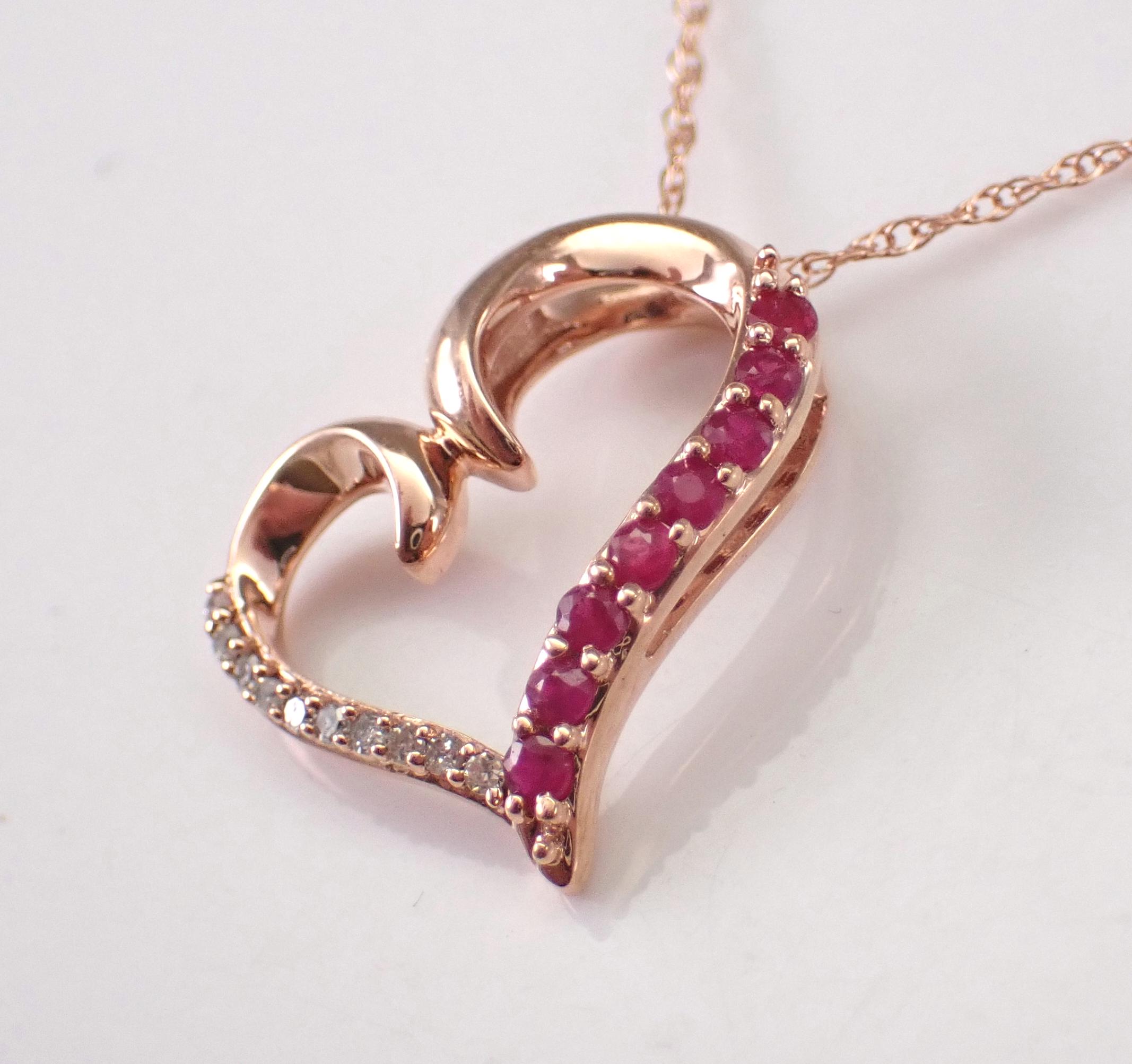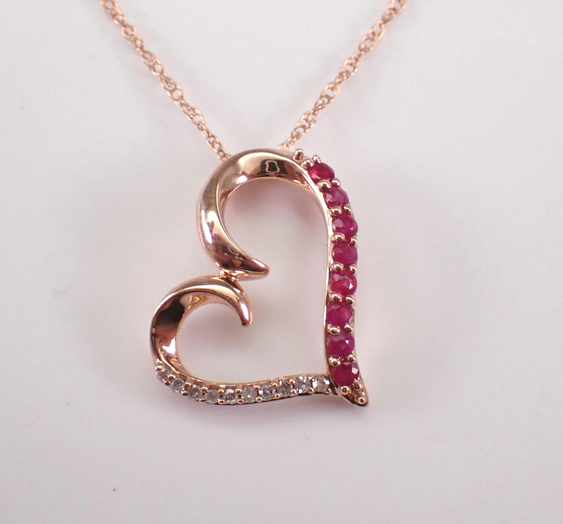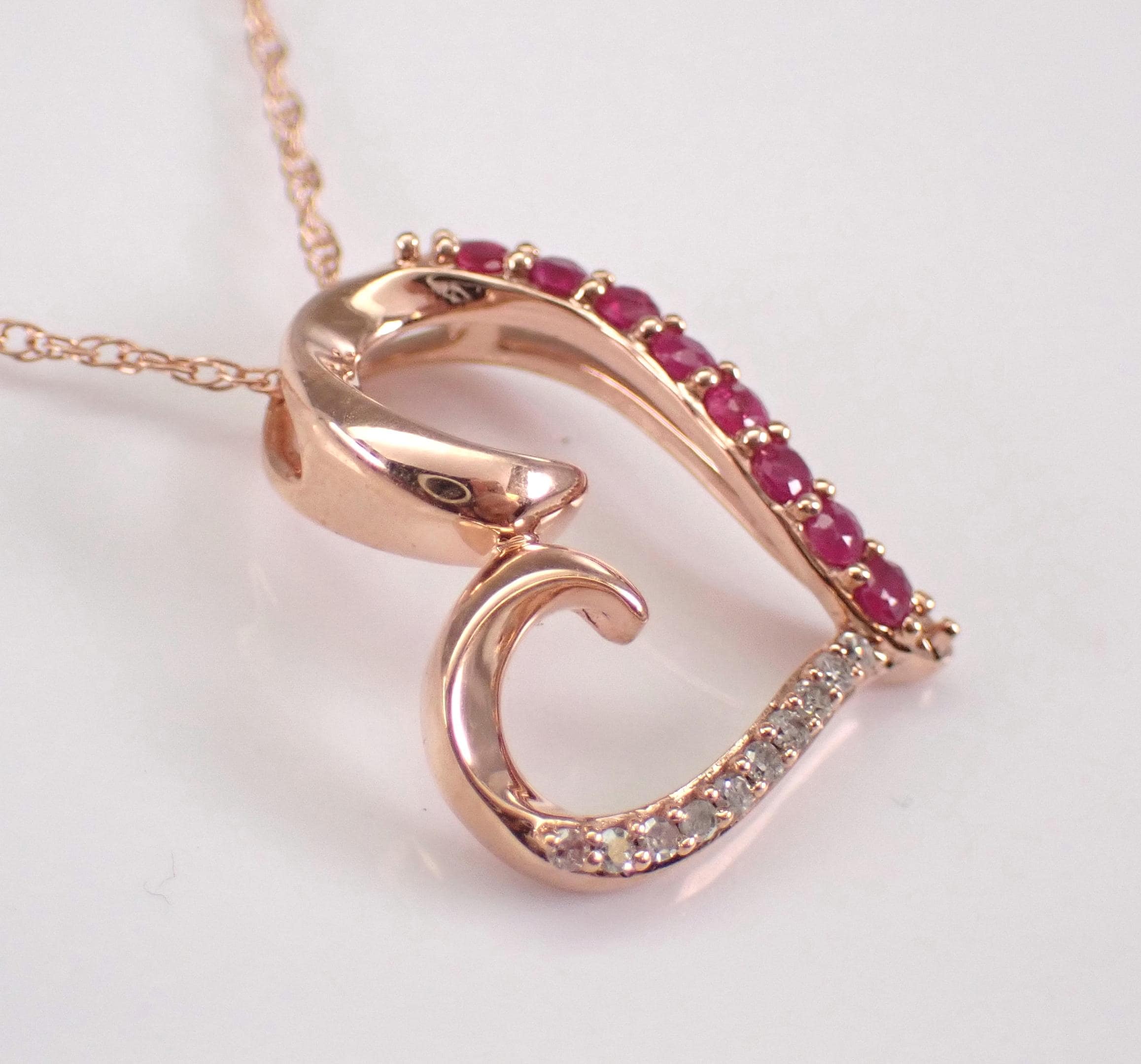 Rose Gold Ruby and Diamond Heart Pendant with Chain. This pendant is set with eight genuine Round Rubies and ten Round natural Brilliant Diamonds. These Rubies are 100% genuine and combine to a total weight of .20 carat. The diamonds are H color, I1 clarity and weigh a total of .07 carat. This pendant is 10KT Rose Gold and comes with an 18" 10KT Rose Gold chain. Both the pendant and chain weigh a total of 1.5 grams and the charm measures 14 X 12 mm. This necklace will be accompanied by an appraisal written by a GIA Certified Diamond Grader with the retail replacement value of $985.00. I will ship this necklace promptly in a beautiful gift box.