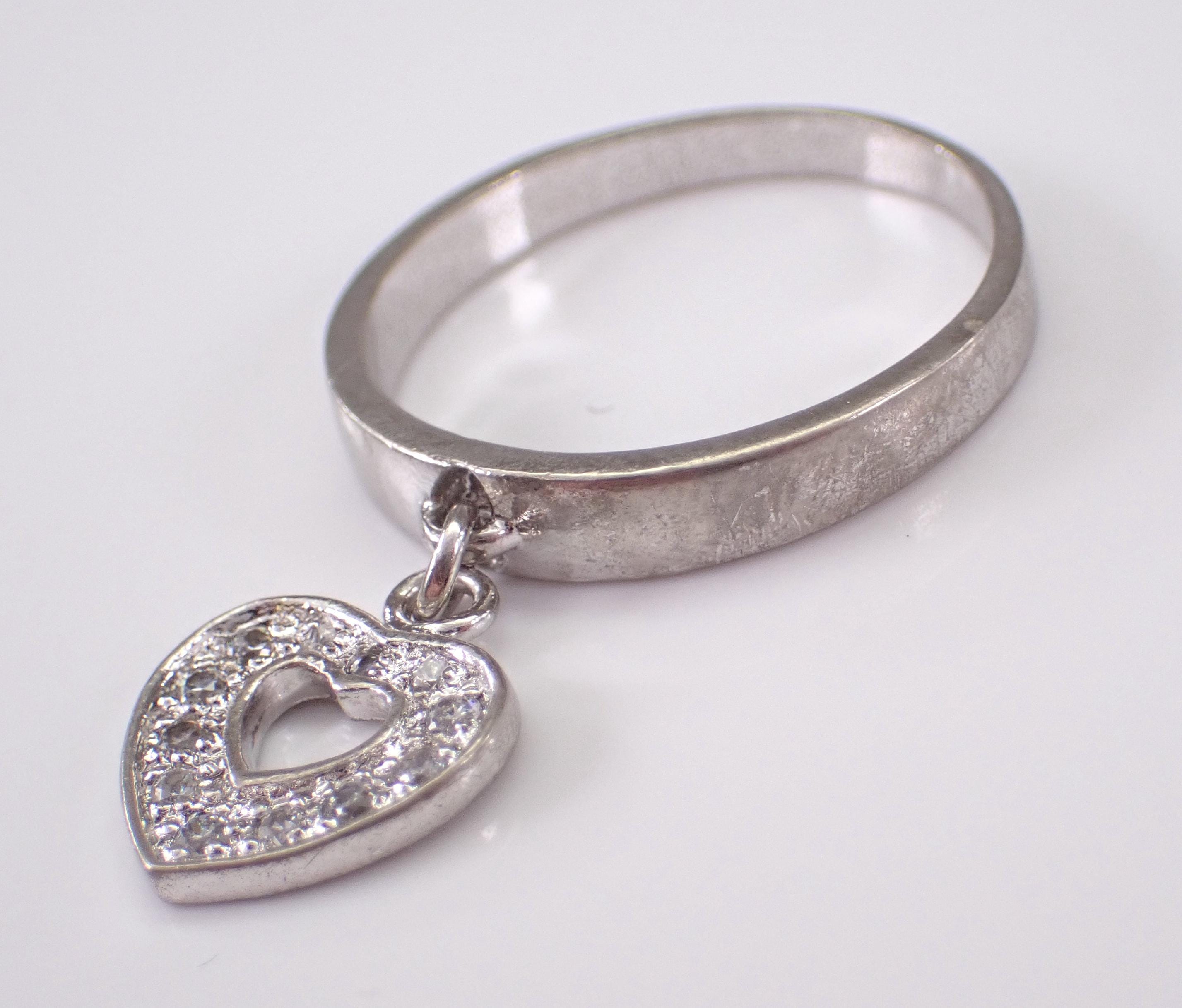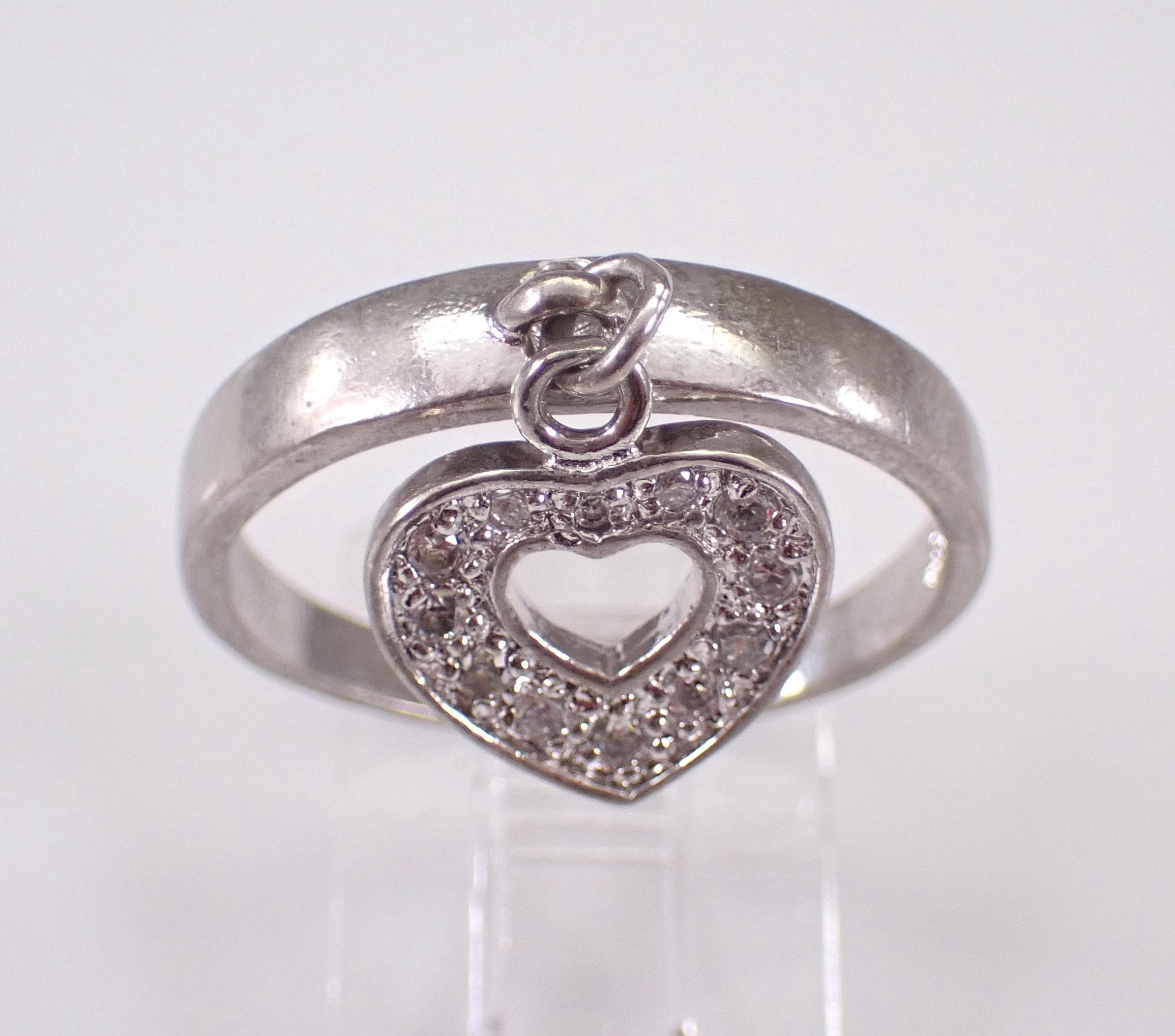 Vintage Wedding band made of Solid Sterling Silver (925) with an attached heart charm set with Cubic Zirconia. There are twelve Cubic Zirconia set in the dangling heart charm. This ring weighs 3.3 grams and is a finger size 8. The ring will be shipped promptly in a gift pouch.