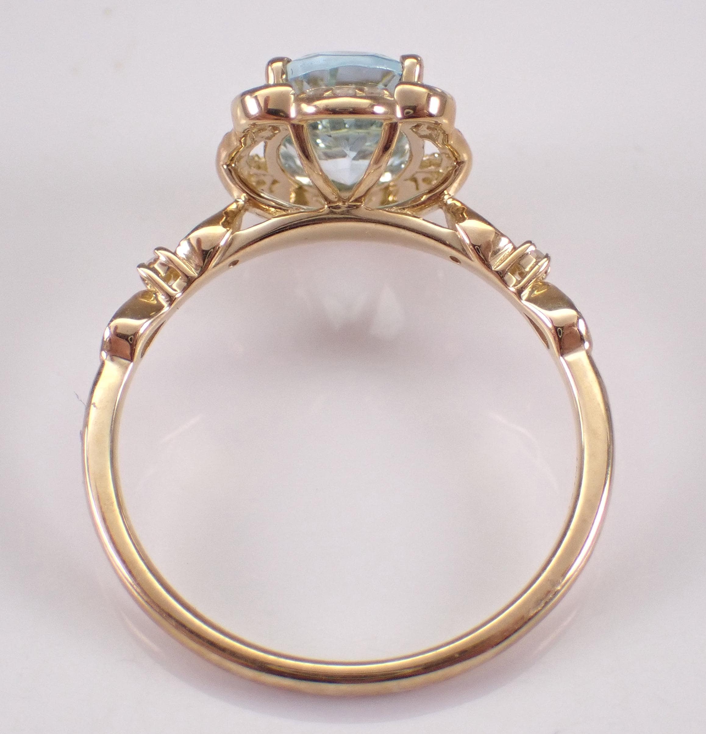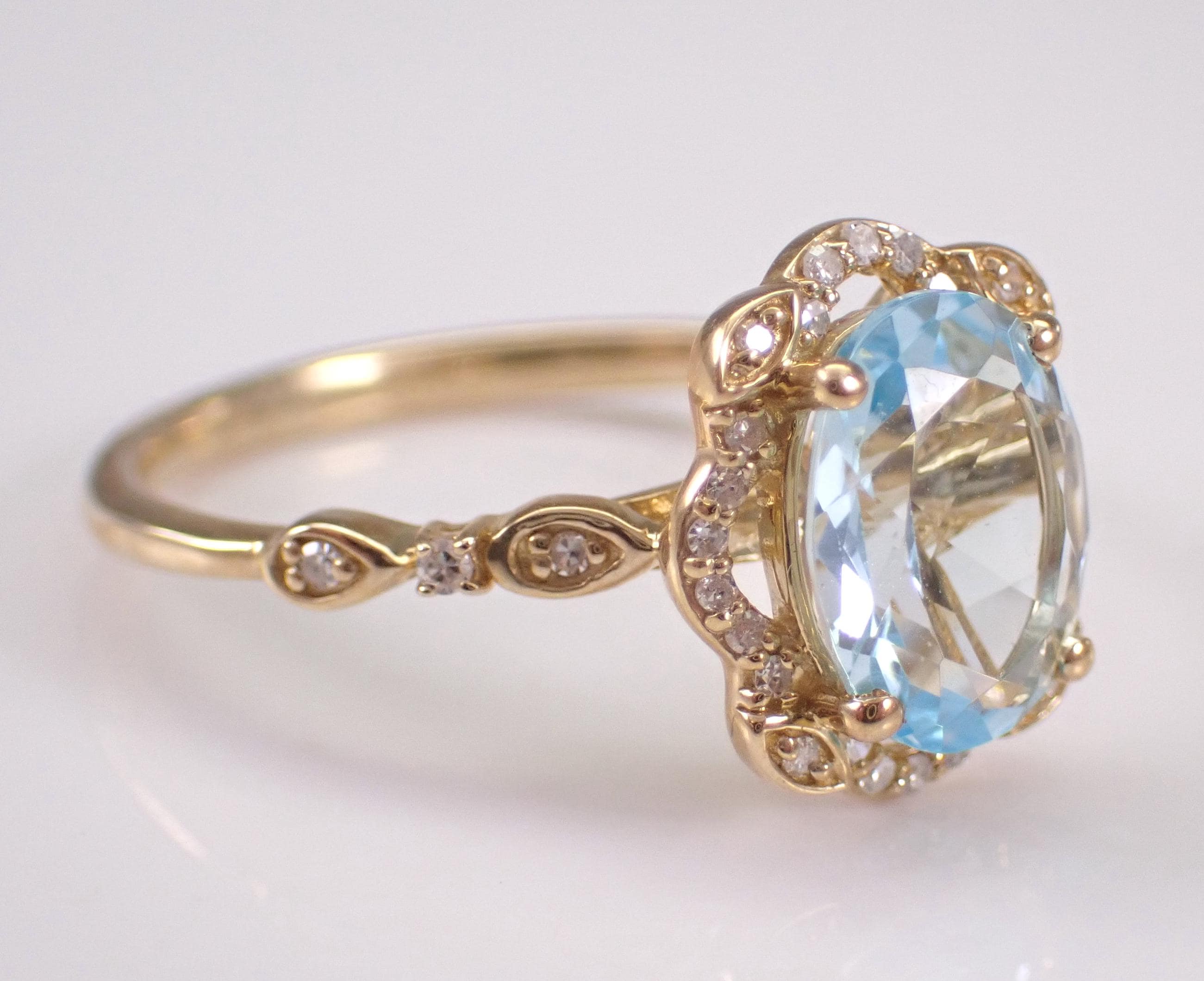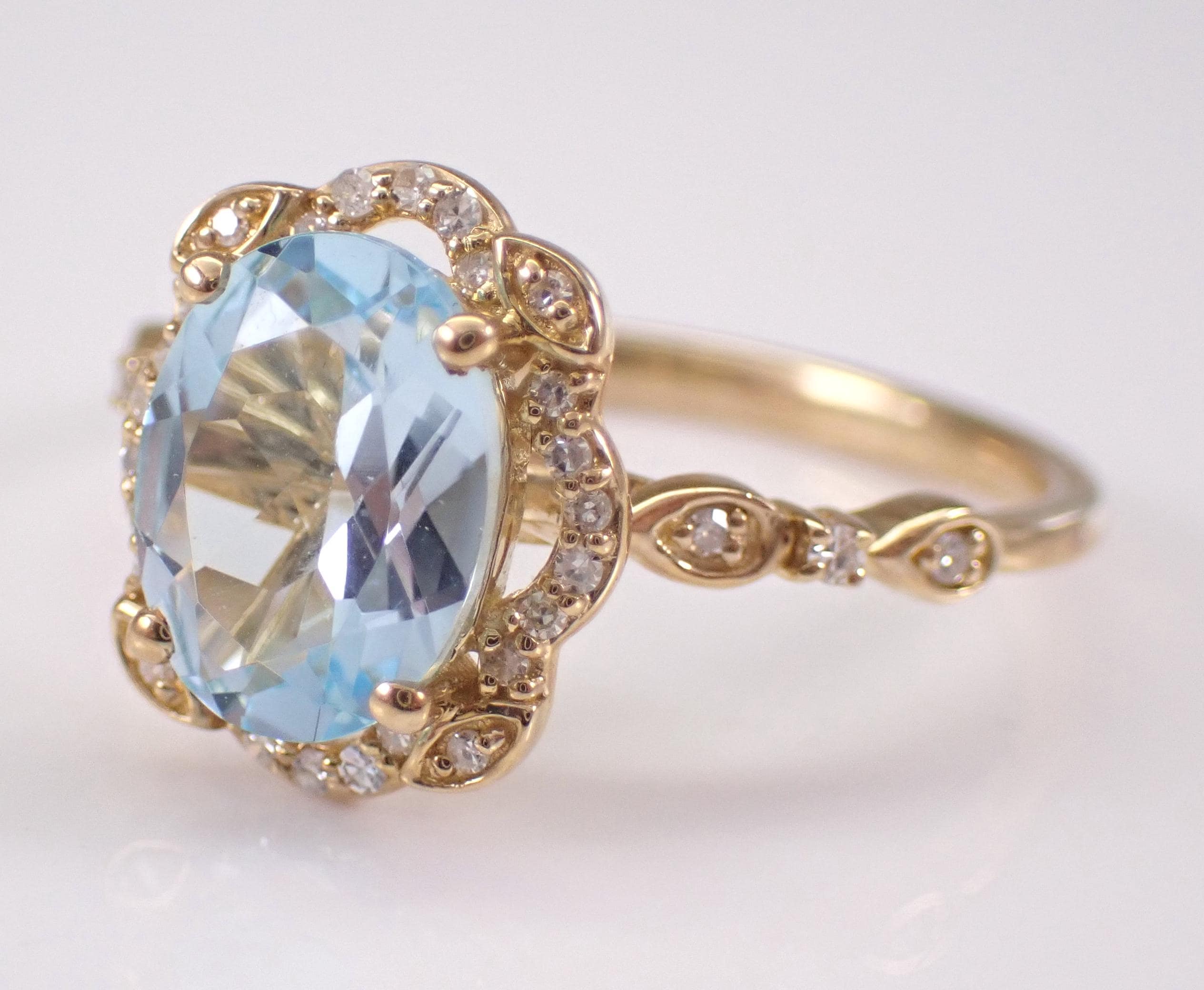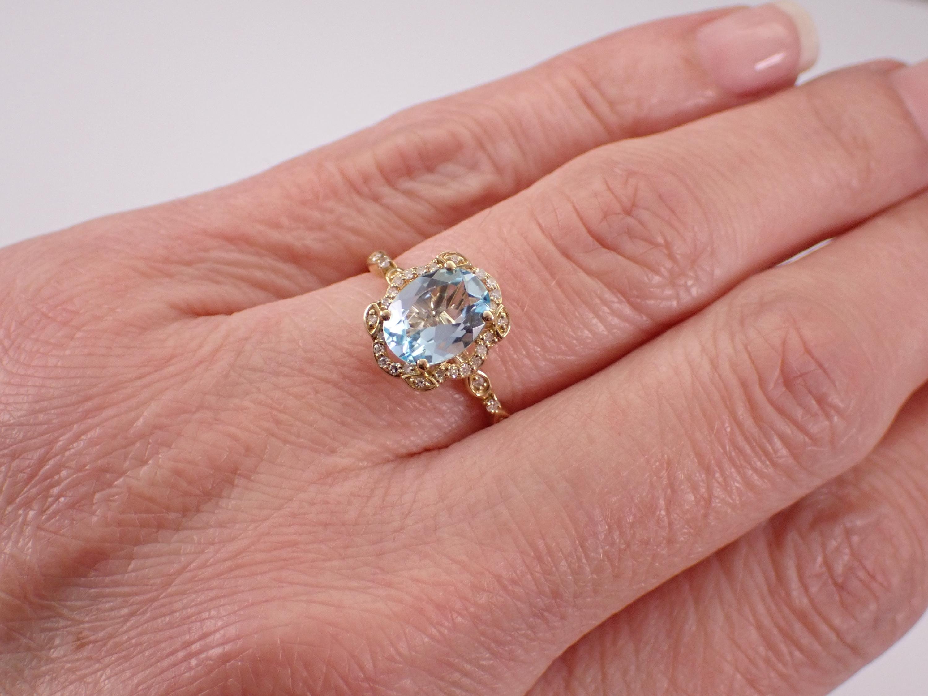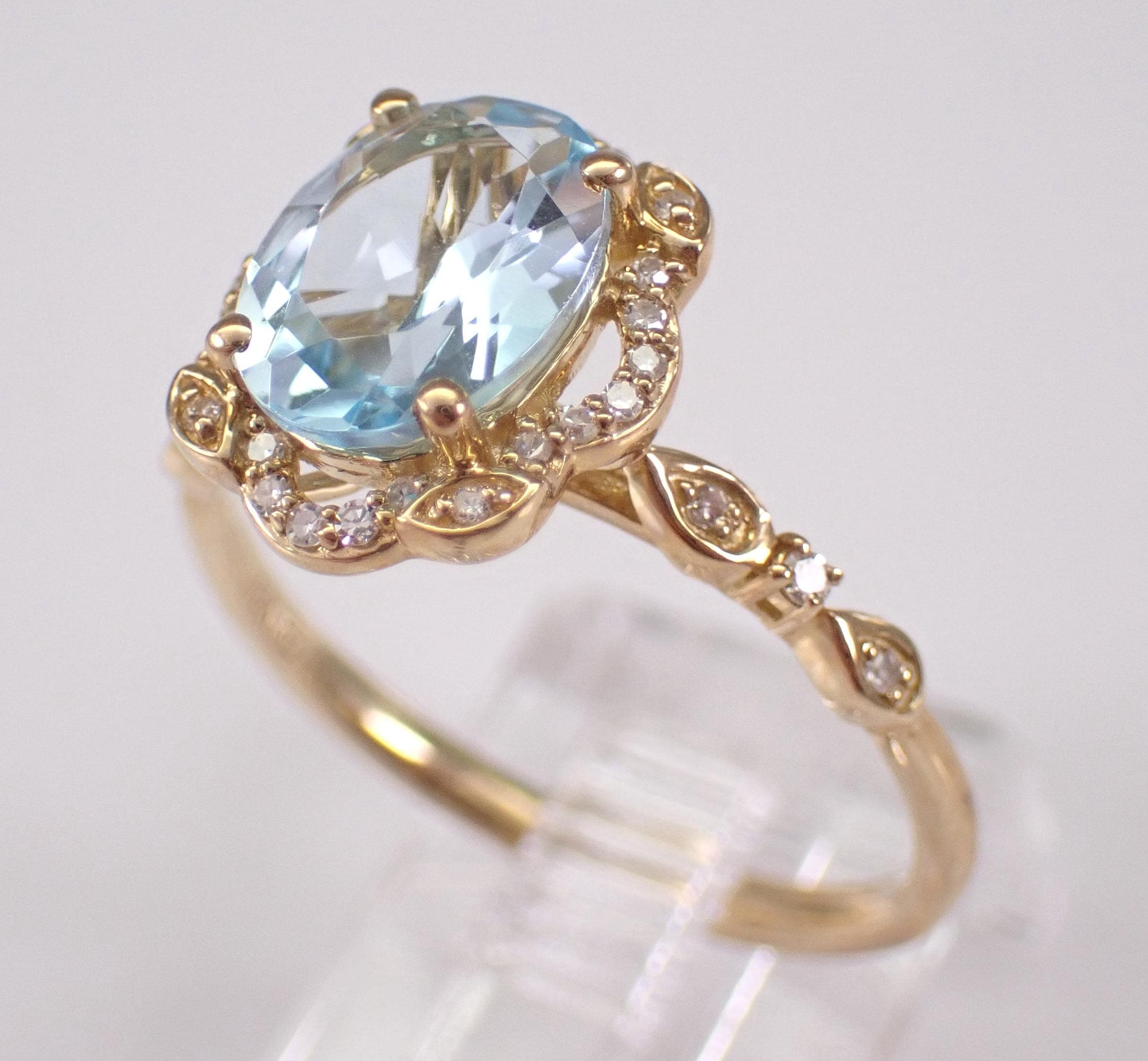 Yellow Gold Diamond and Blue Topaz Engagement Ring. This ring is set with one natural Oval Blue Topaz in the center. This Blue Topaz measures 9 X 7 mm and weighs 2 carats. There are thirty-two genuine Round Brilliant Diamonds set in this ring. These diamonds are H color, SI/I1 clarity and weigh a total of .15 carat. This ring is 10KT Yellow Gold, weighs 2.3 grams and is a finger size 7, which can be resized (please inquire about sizing with the finger size you need). This ring will be accompanied by an appraisal by a GIA Certified Diamond Grader with the retail replacement value of $1,389.00. I will ship this ring promptly in a gift box.