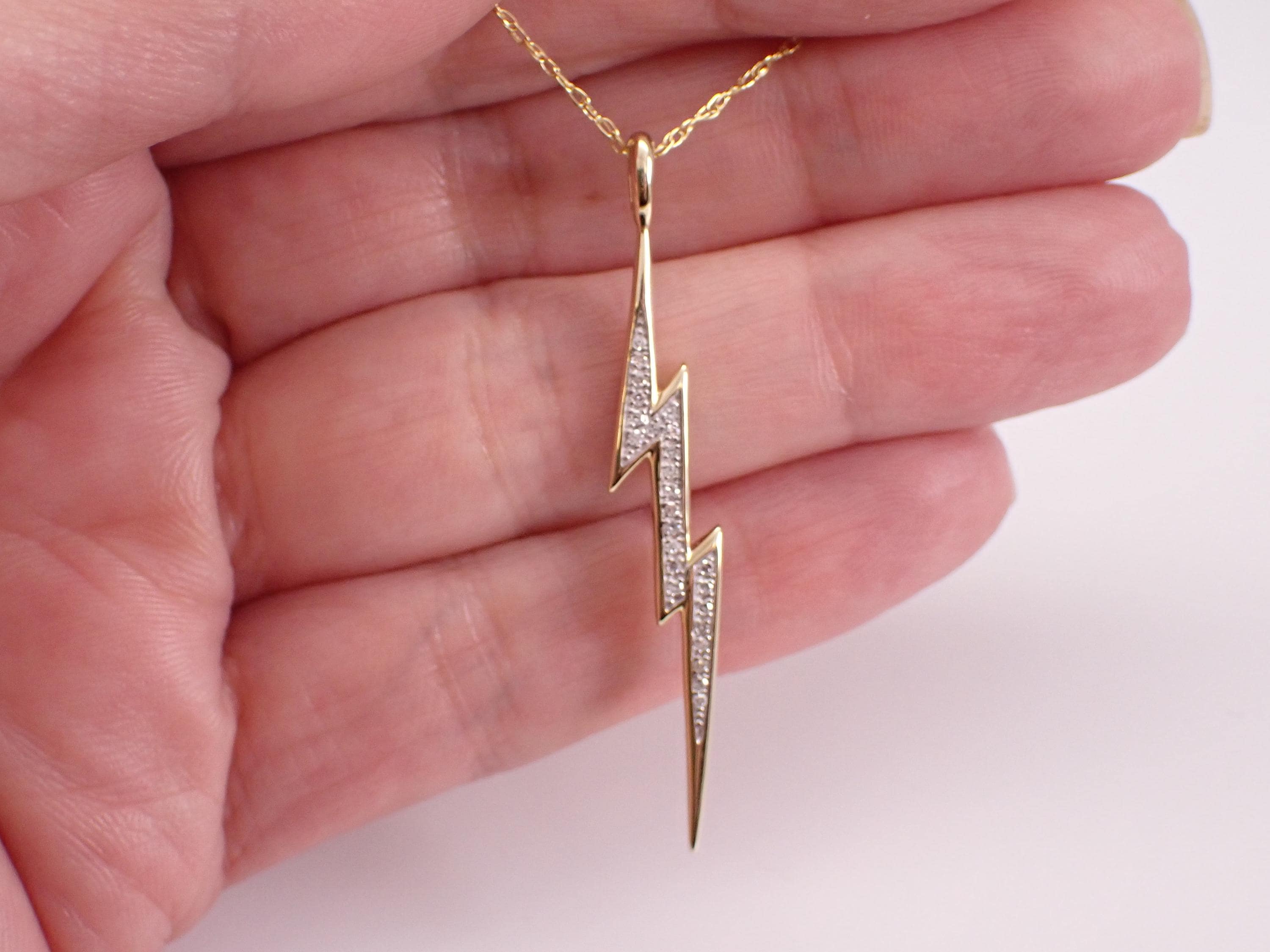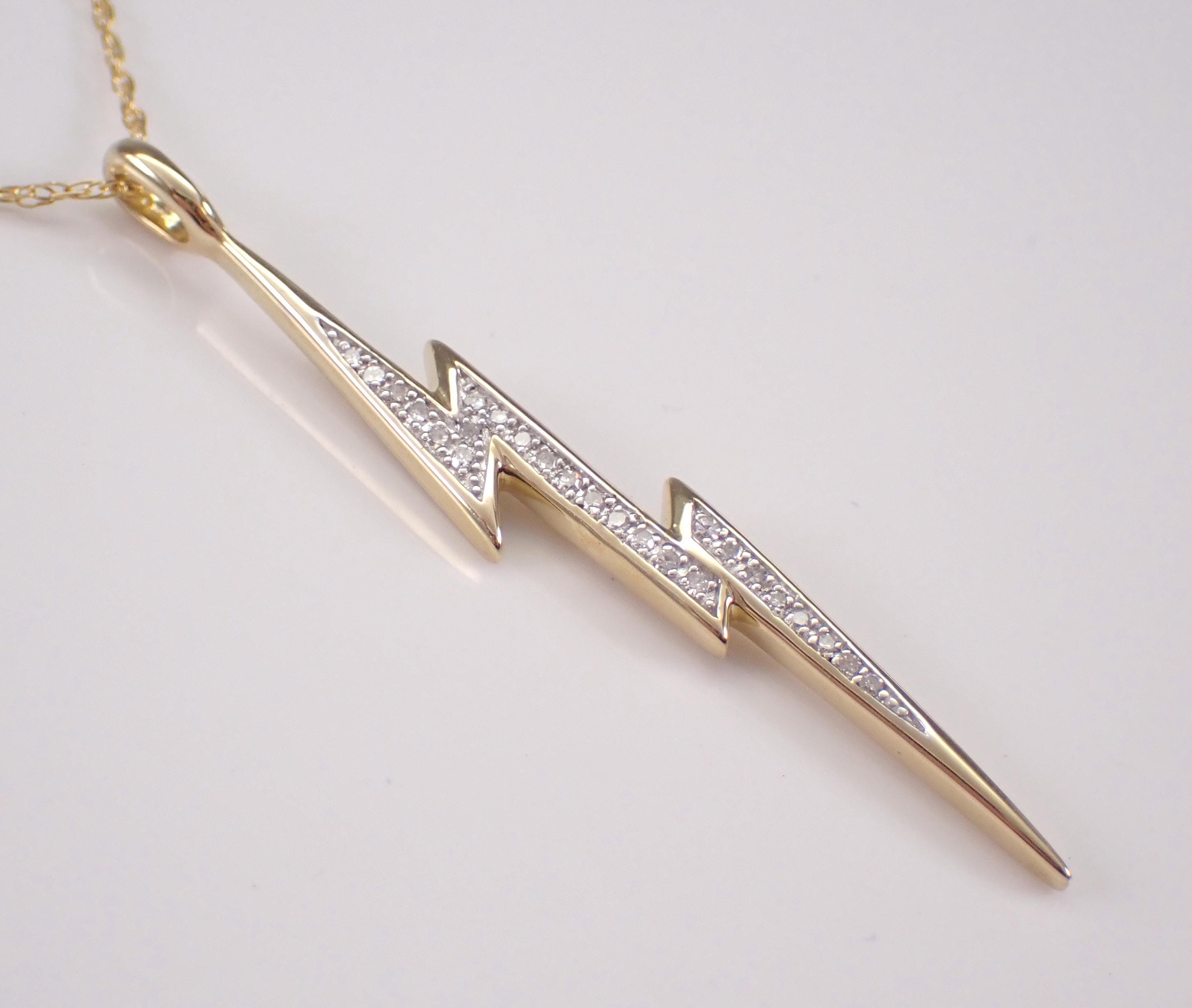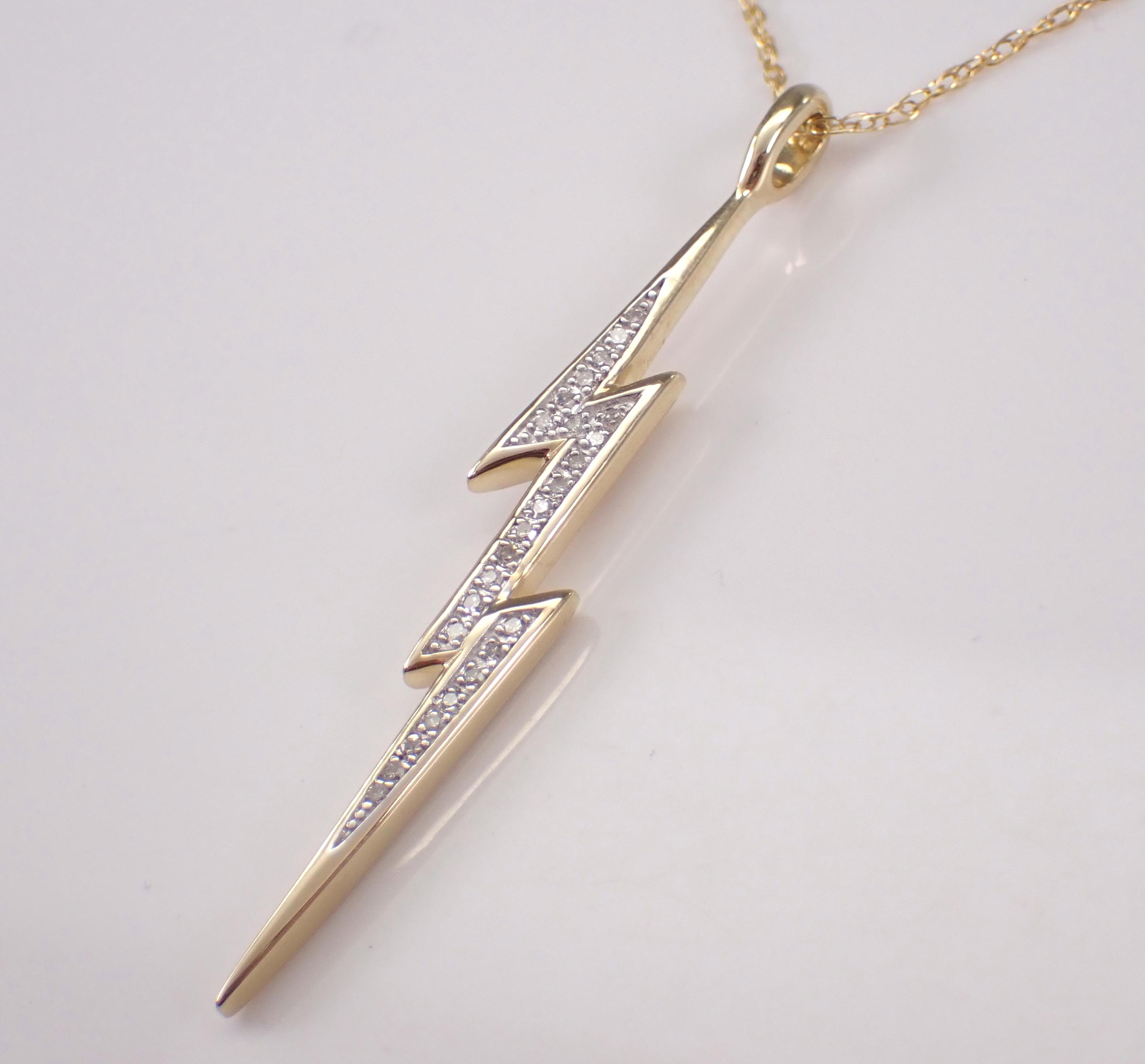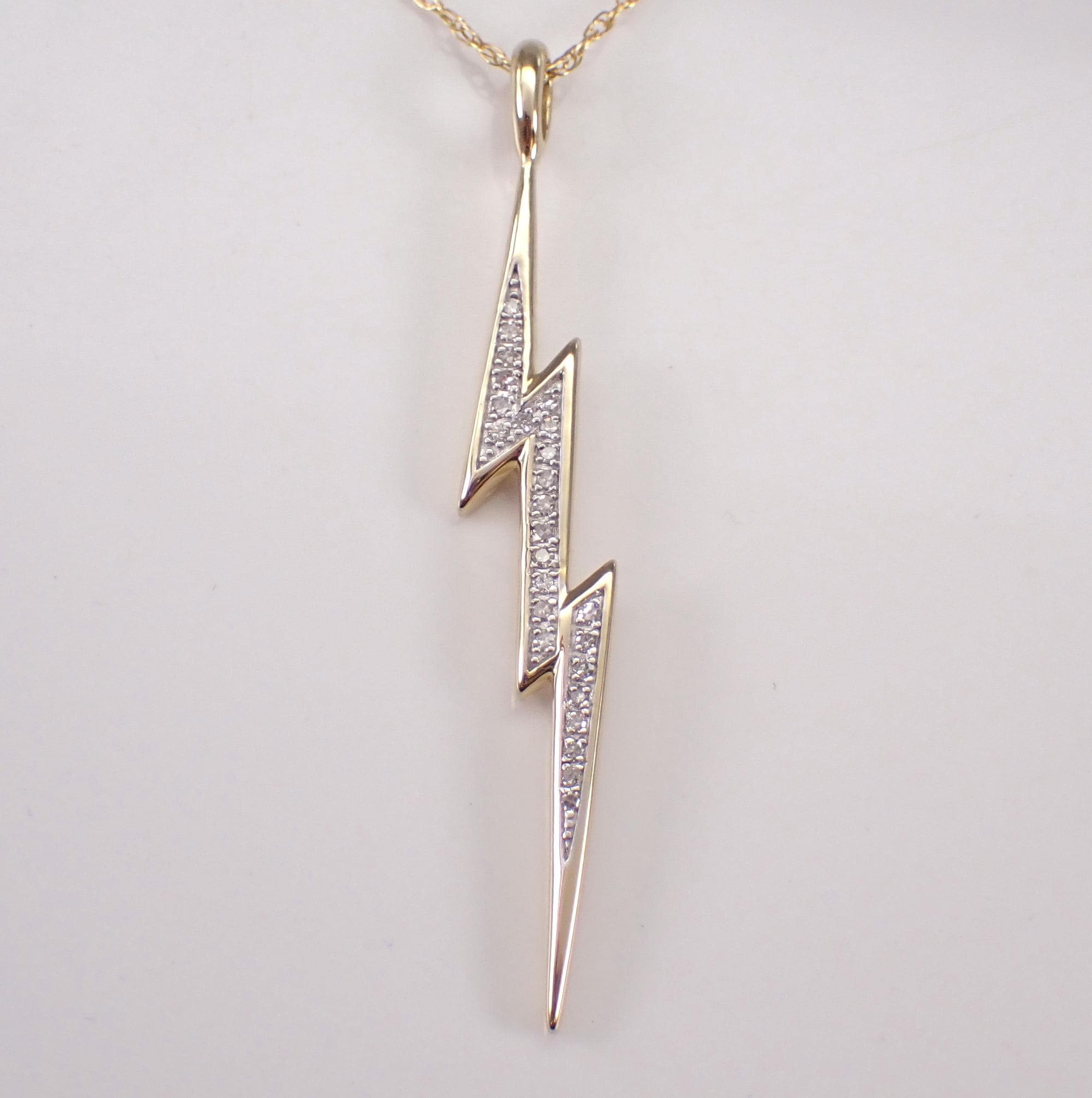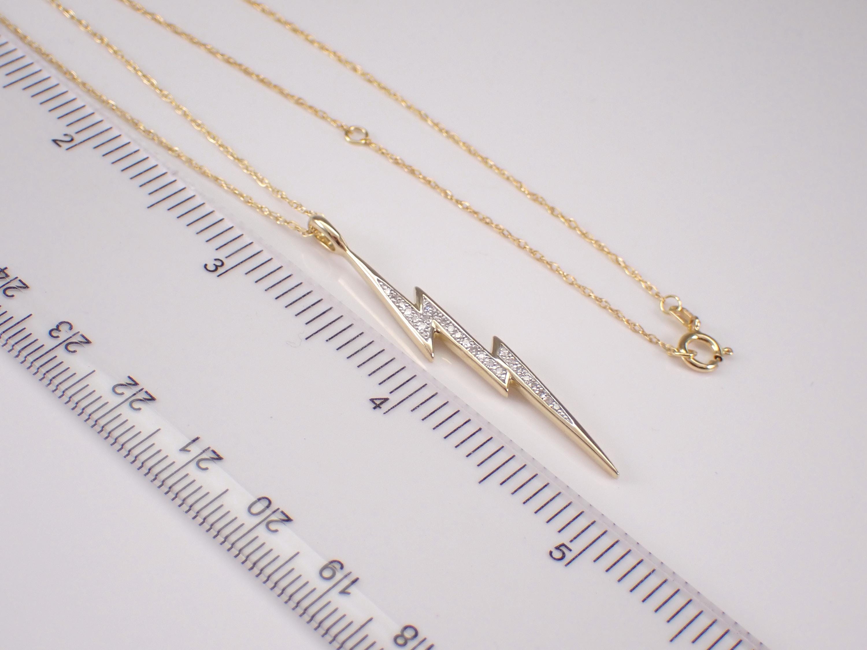 14K Yellow Gold Diamond Lightning Bolt Pendant Necklace. This pendant is set with twenty-five genuine natural round brilliant diamonds. These diamonds are H color, SI clarity and weigh a total of .15 carats. This necklace is 14KT Yellow Gold and comes with a 14KT Yellow Gold chain which measures 18" in length. Both the pendant and chain weigh a total of 3.1 grams. The pendant measures 46 mm in length. This necklace will be accompanied by an appraisal written by a GIA Certified Diamond Grader with the retail replacement value of $1,675.00. I will ship this necklace promptly in a beautiful gift box.