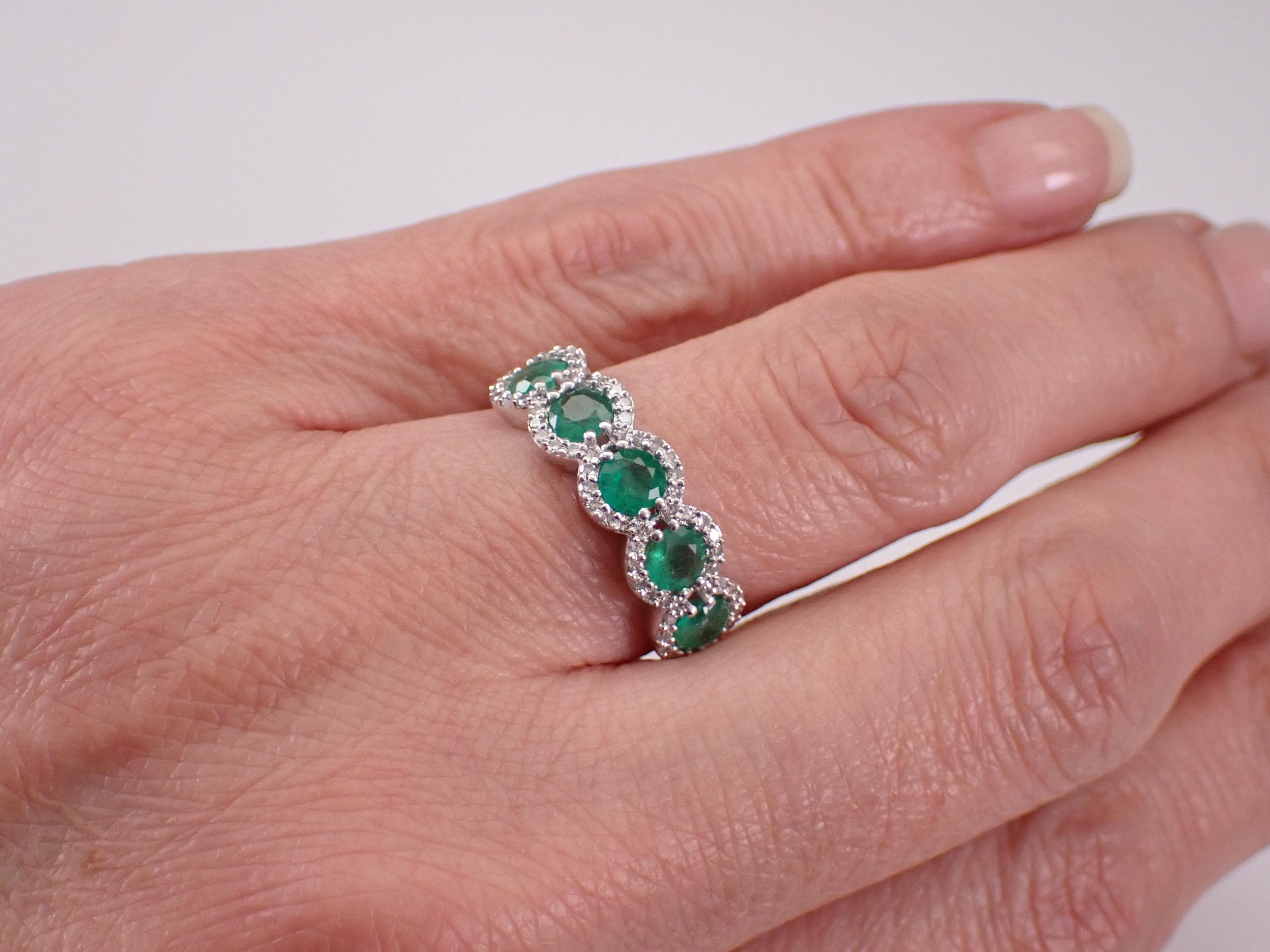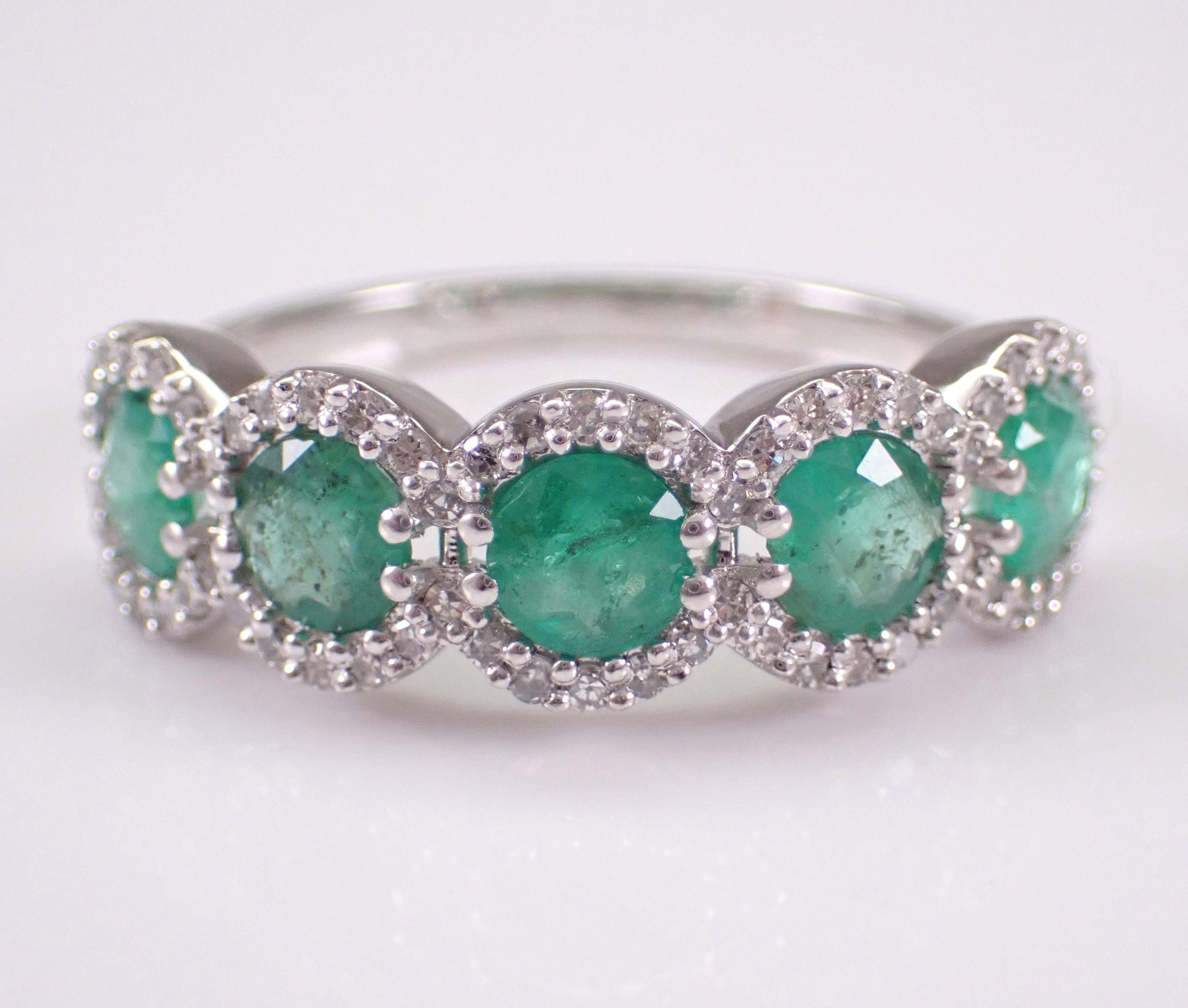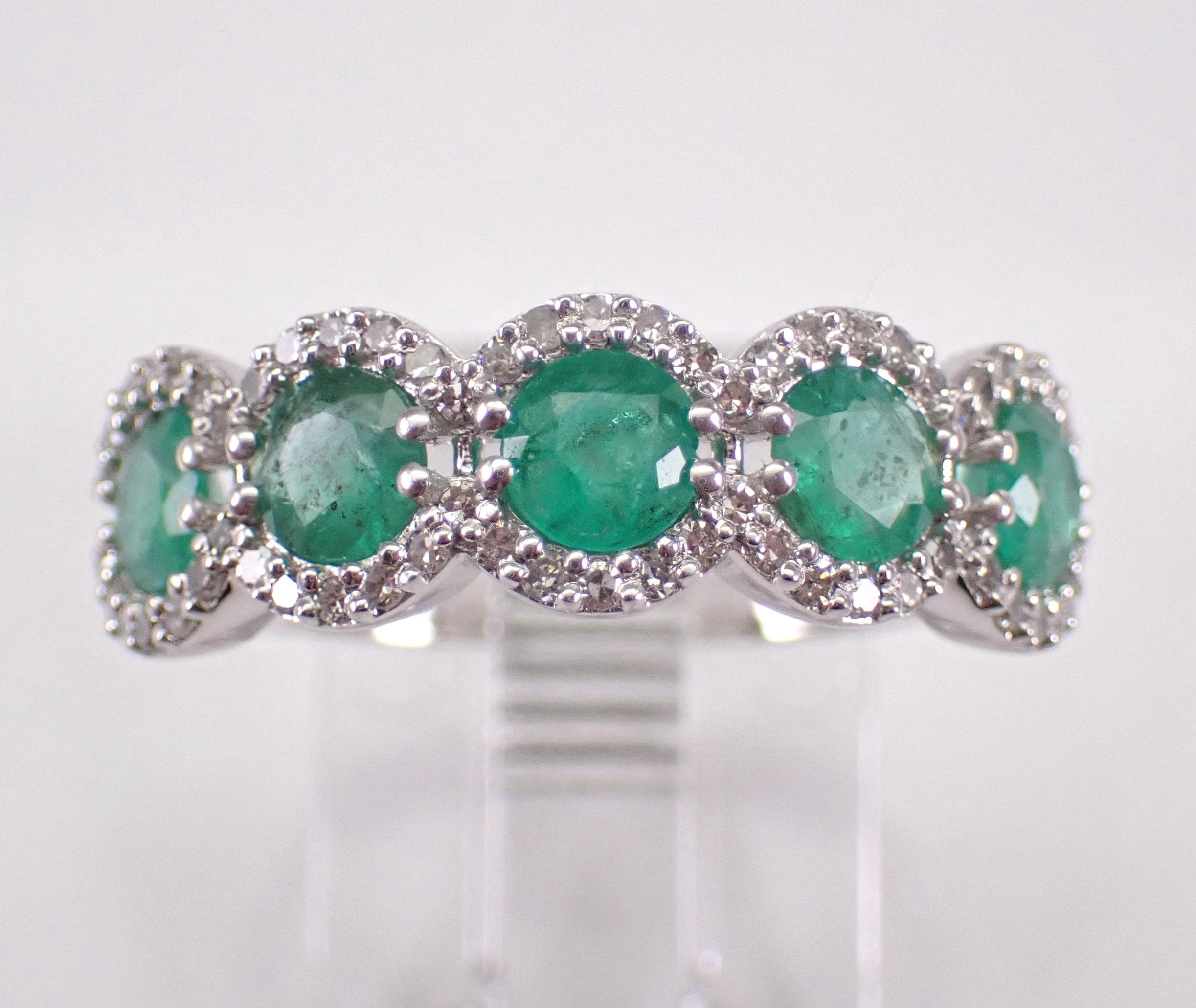 White Gold Diamond and Emerald Anniversary Band Halo Wedding Ring. This ring is set with five genuine Round Emeralds and sixty-two natural Round Brilliant Diamonds. These diamonds are H color, SI/I1 clarity and weigh a total of .30 carat. The Emeralds weigh a total of 1 carat. This ring is 10KT White Gold, weighs 3.0 grams, measures 6.5 mm in width and is a finger size 7, which can be resized free of charge (please inquire about sizing with the finger size you need). The ring will be accompanied by an appraisal by a GIA Certified Diamond Grader with the retail replacement value of $2,295.00. I will ship this ring promptly in a gift box.