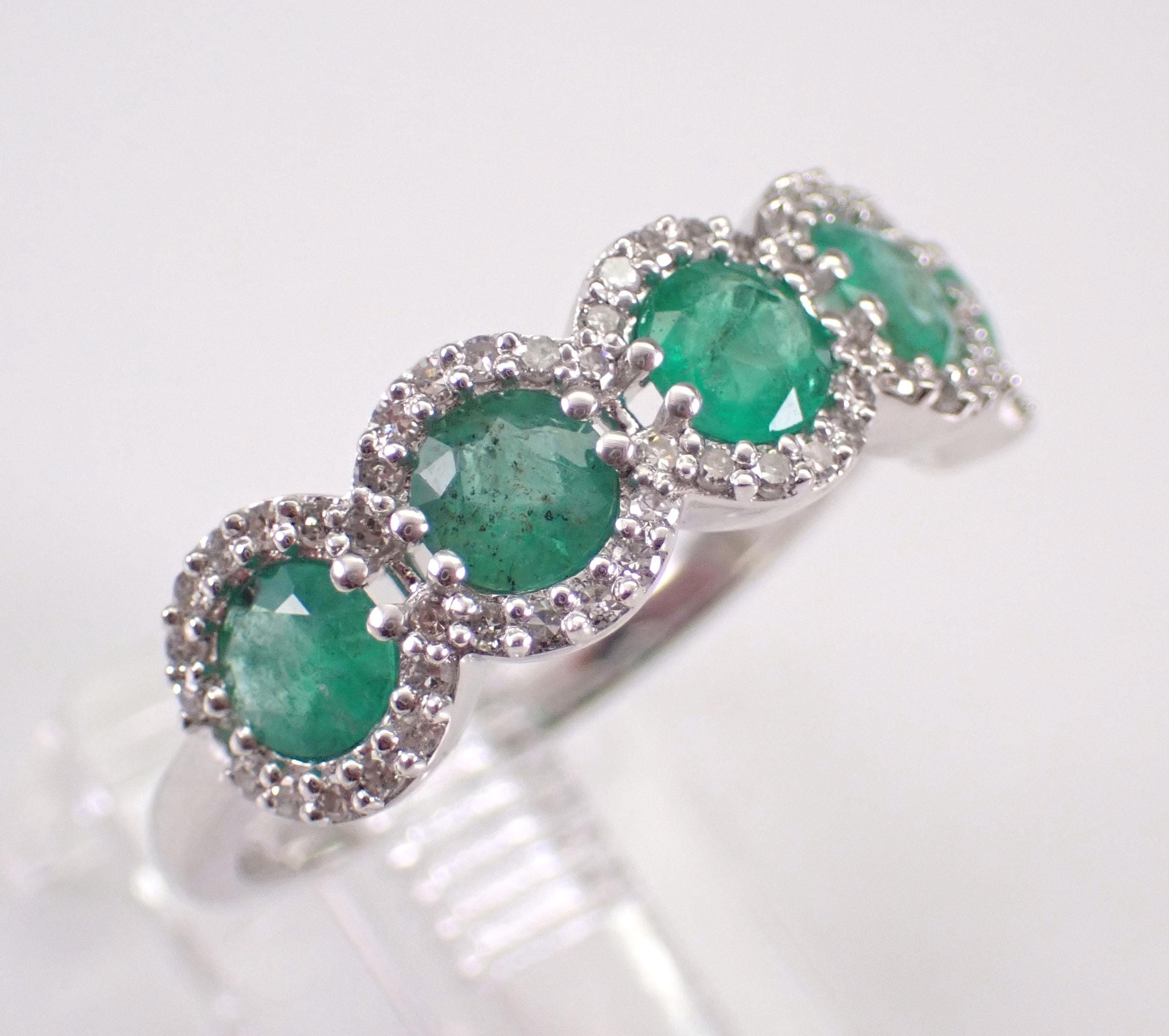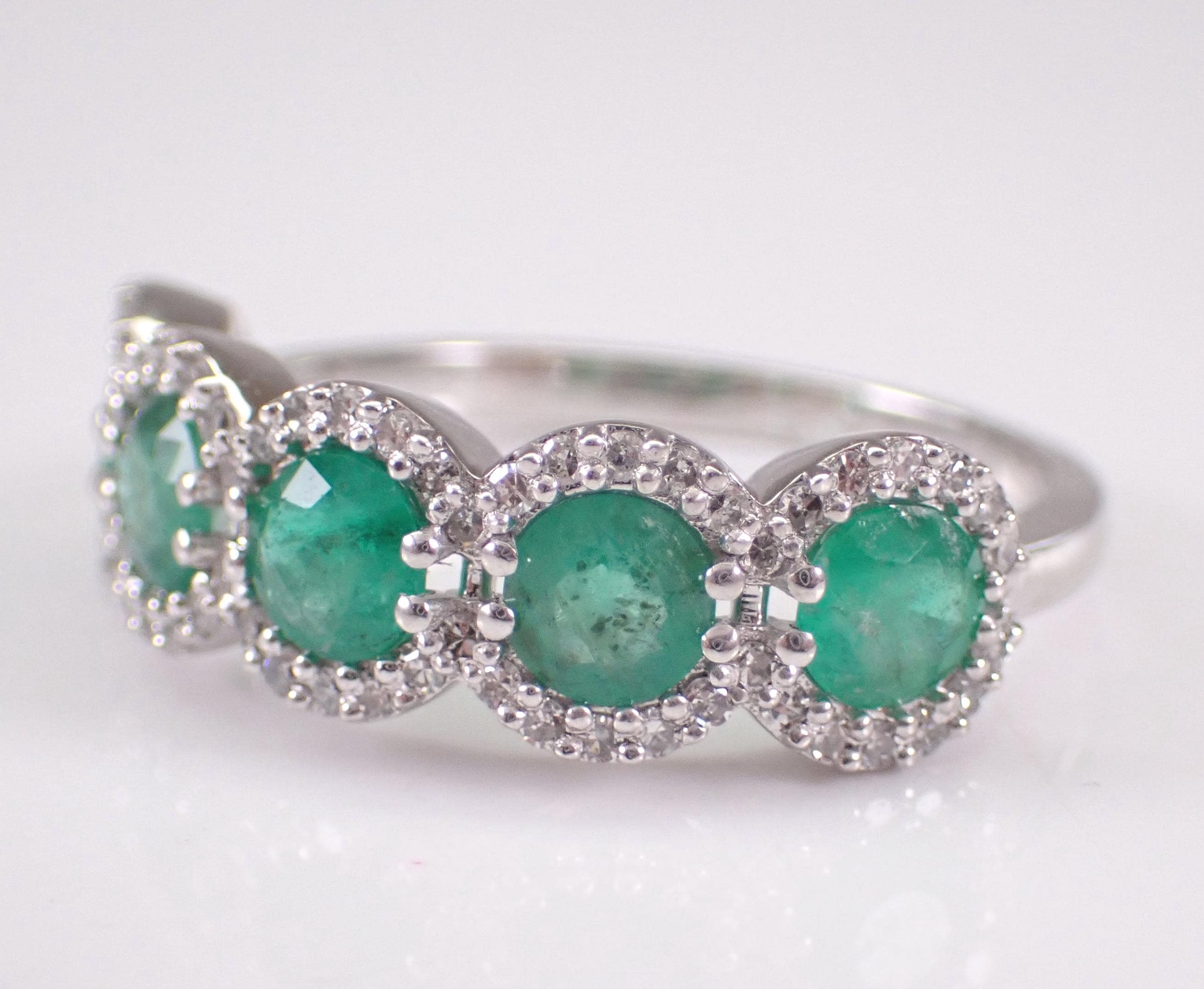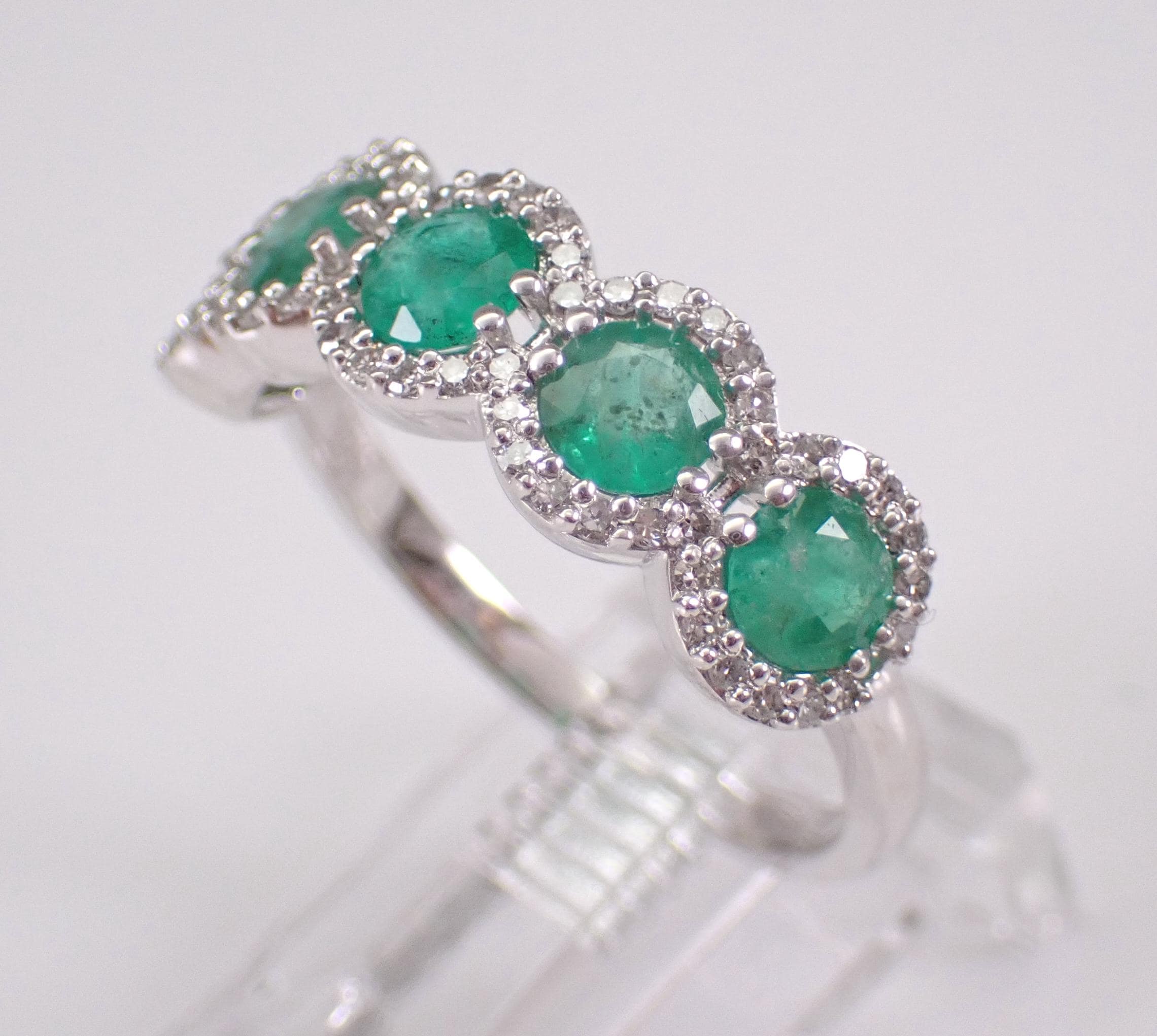 White Gold Diamond and Emerald Anniversary Band Halo Wedding Ring. This ring is set with five genuine Round Emeralds and sixty-two natural Round Brilliant Diamonds. These diamonds are H color, SI/I1 clarity and weigh a total of .30 carat. The Emeralds weigh a total of 1 carat. This ring is 10KT White Gold, weighs 3.0 grams, measures 6.5 mm in width and is a finger size 7, which can be resized free of charge (please inquire about sizing with the finger size you need). The ring will be accompanied by an appraisal by a GIA Certified Diamond Grader with the retail replacement value of $2,295.00. I will ship this ring promptly in a gift box.