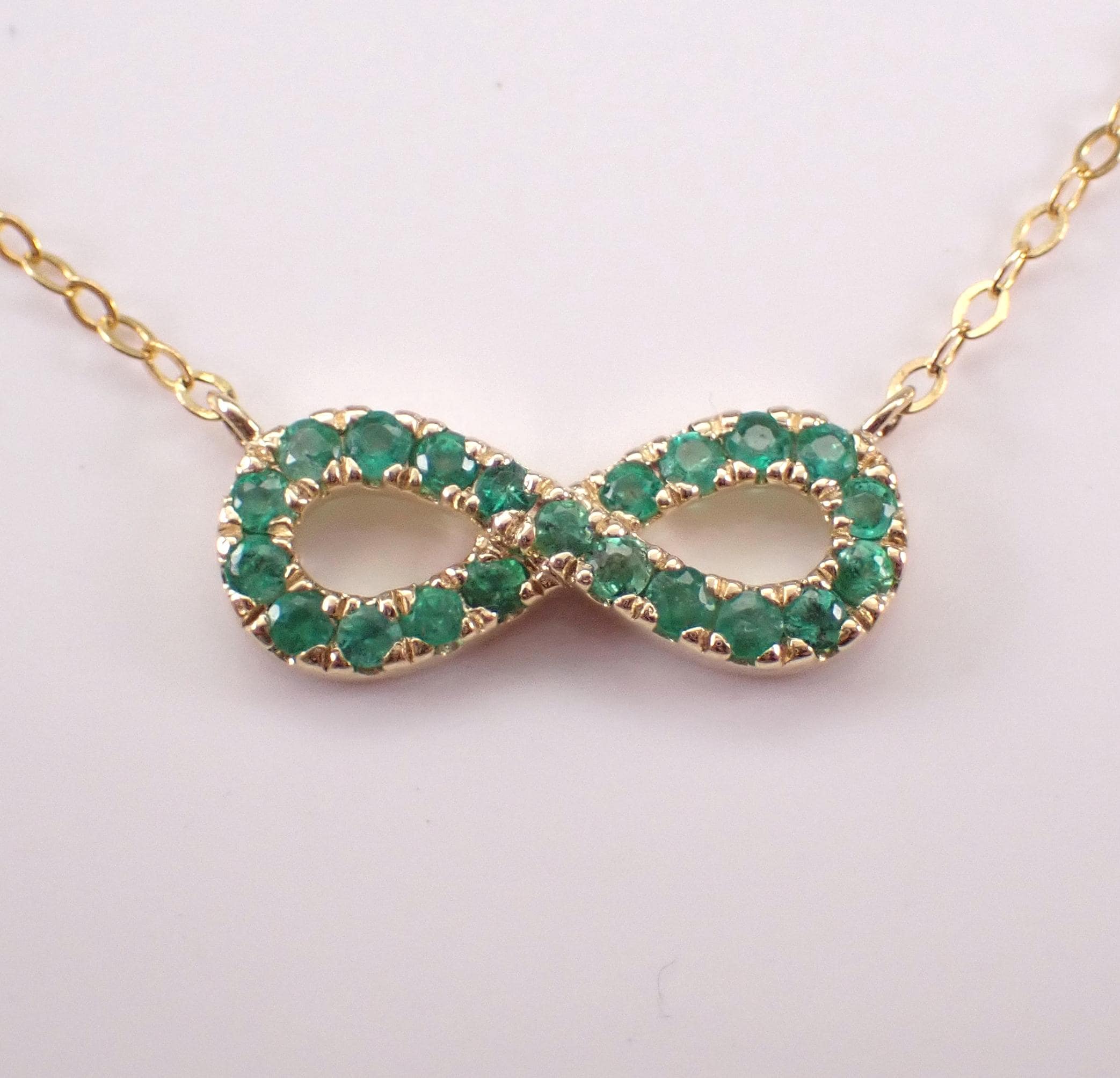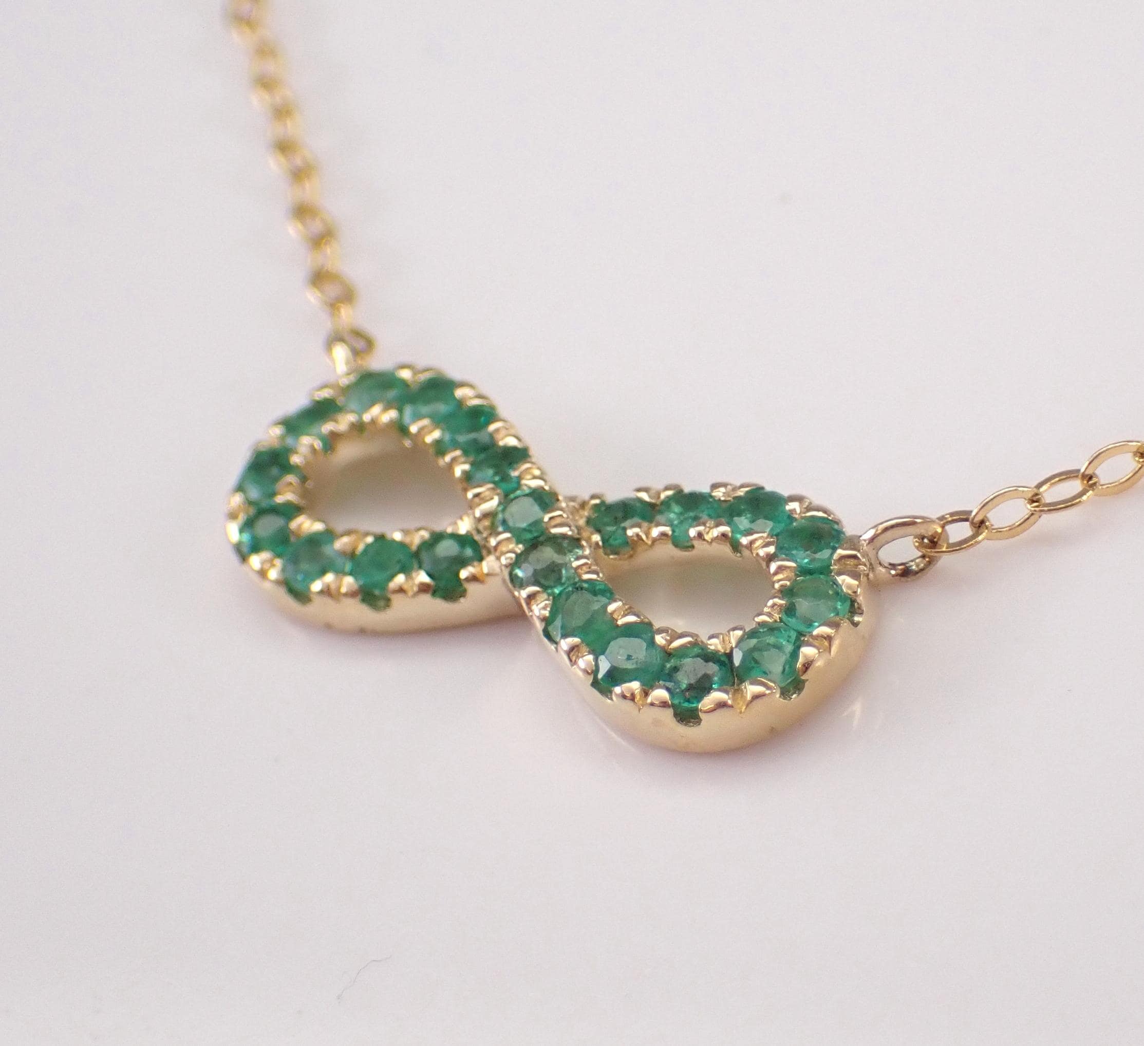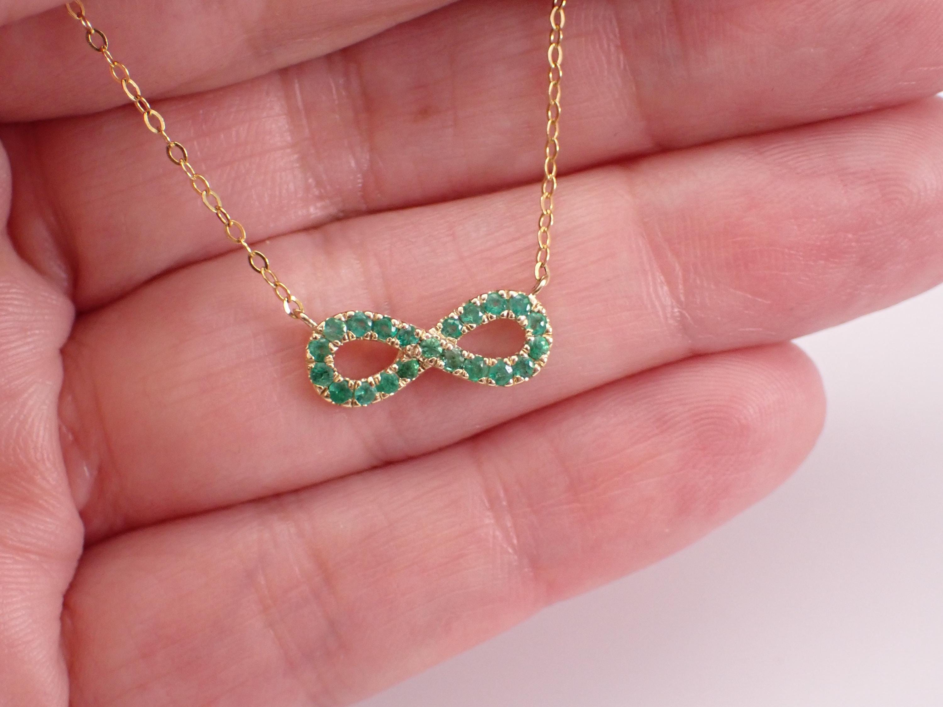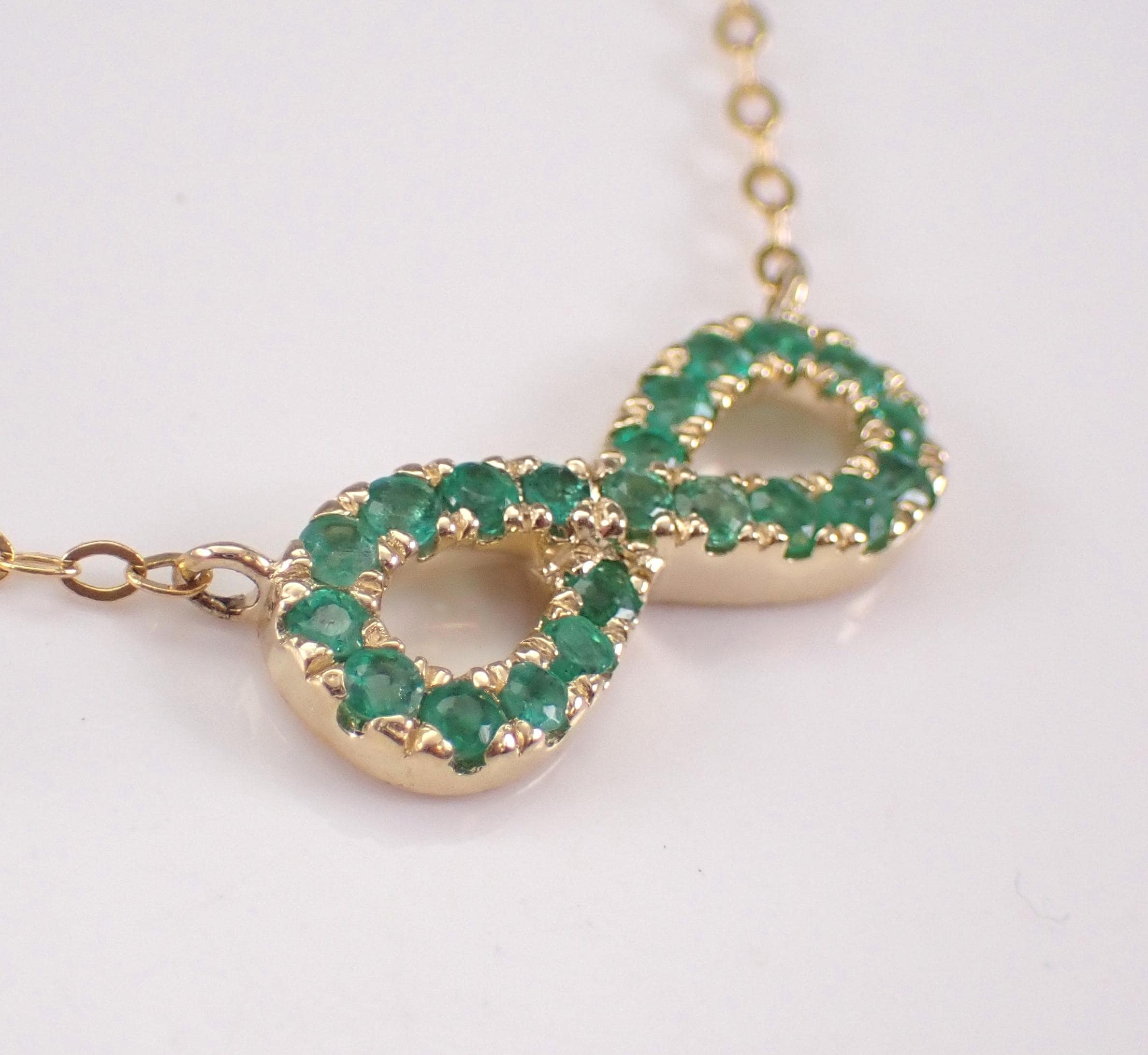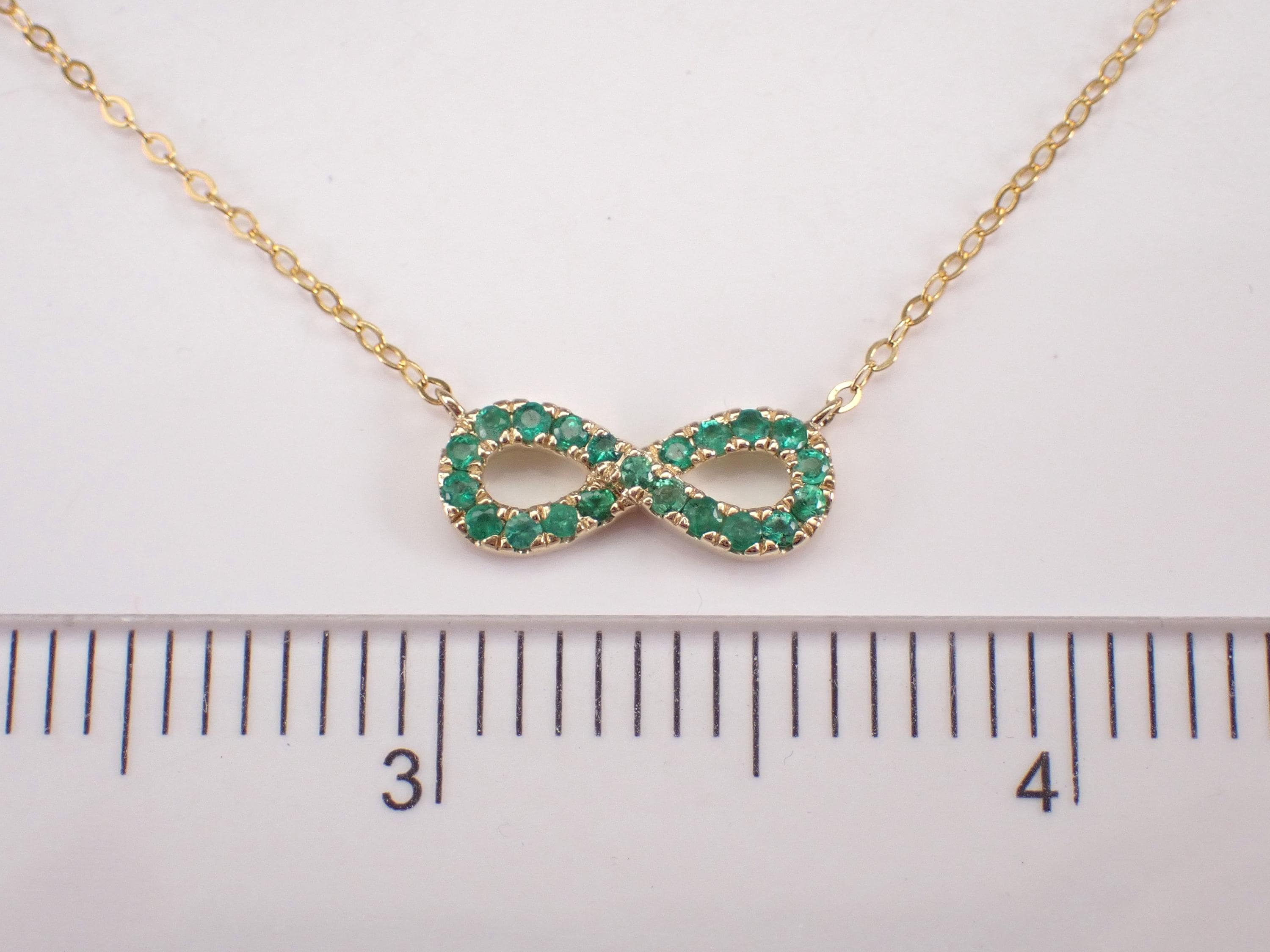 Yellow Gold Emerald Infinity Sign Pendant Necklace with Chain. This pendant is set with twenty-one natural Round Emeralds. These Emeralds amount to a total weight of .33 carat. This pendant is 10KT Yellow Gold, comes attached to a 17" 10K Yellow Gold chain and together weighs 1.8 grams. This pendant measures 16 X 6 mm. This necklace will be accompanied by an appraisal by a GIA Certified Diamond Grader with the retail replacement value of $1,235.00. I will ship this pendant promptly in a beautiful gift box.