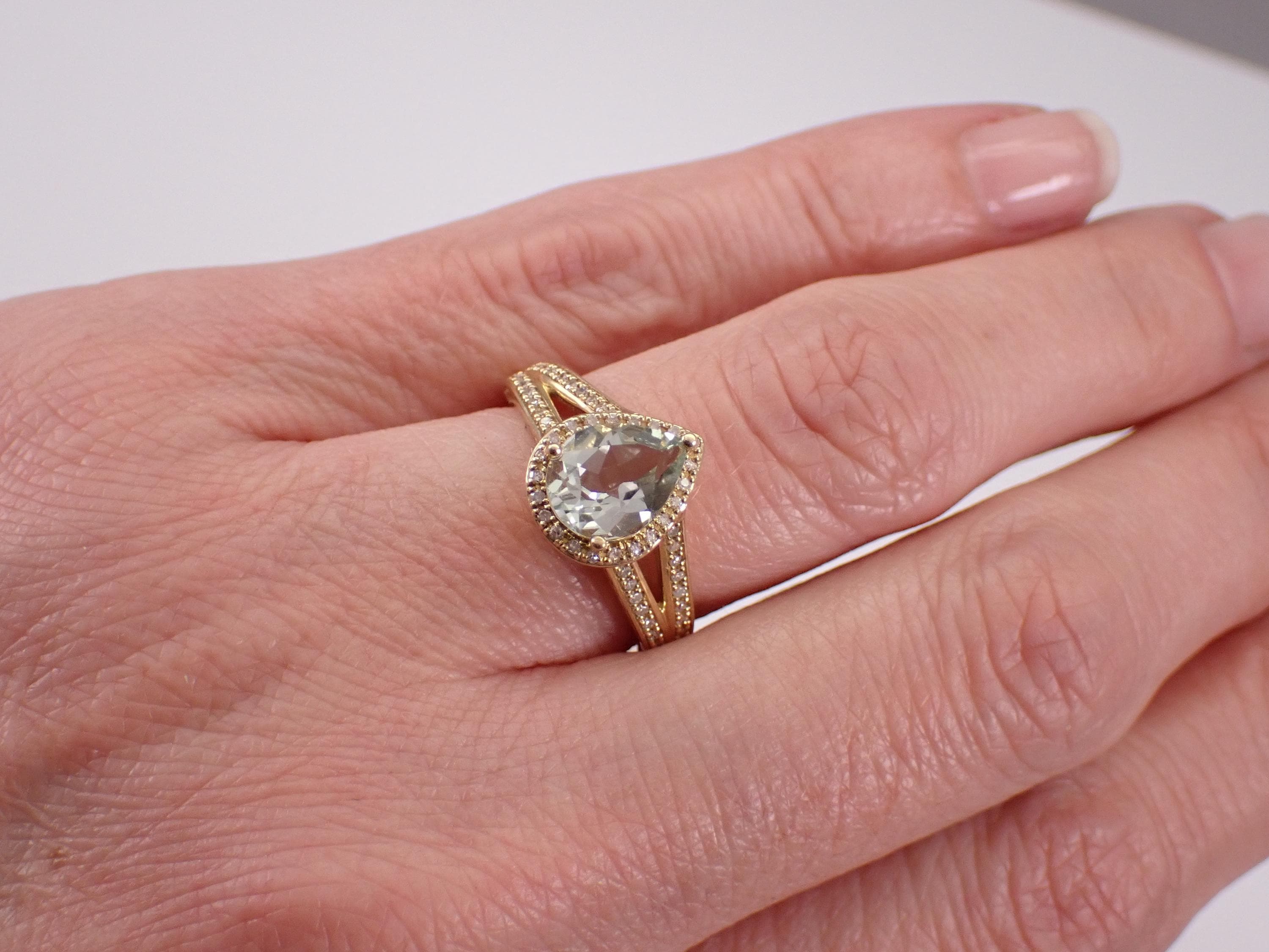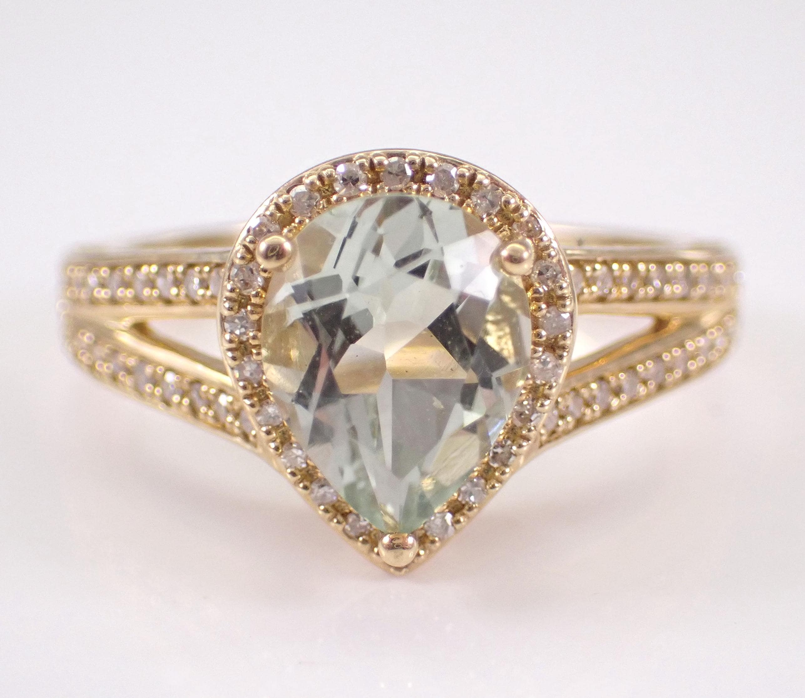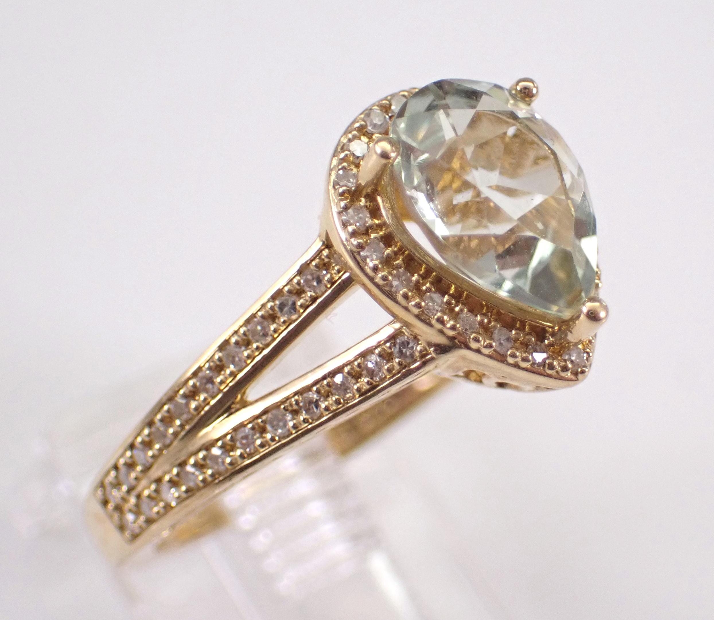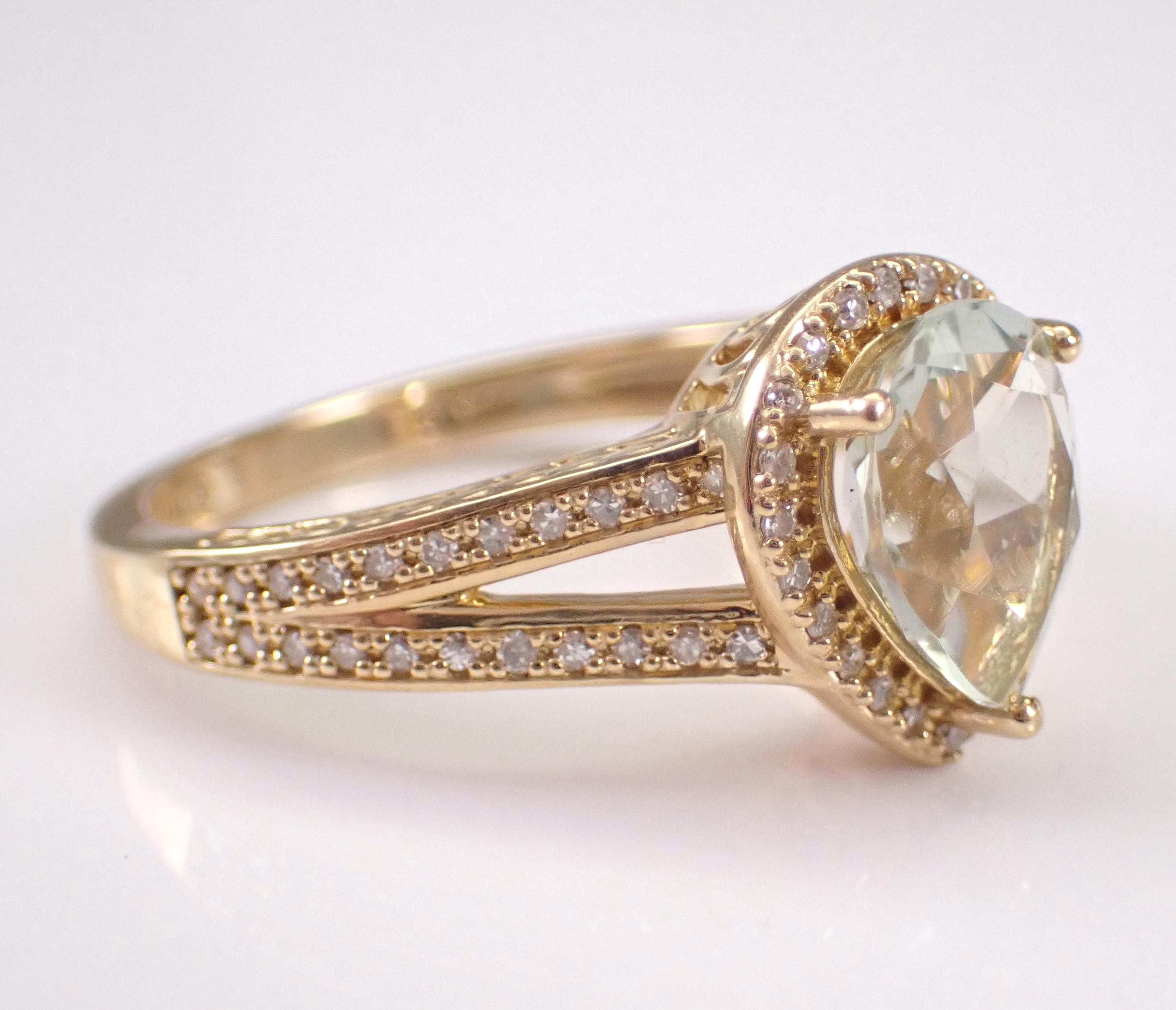 Yellow Gold Diamond and Green Amethyst Engagement Ring. This ring is set with one genuine Pear shaped Green Amethyst (Prasiolite) in the center and sixty-six natural Round Brilliant Diamonds throughout. These diamonds are H color, SI/I1 clarity and weigh a total of .25 carat. The Green Amethyst is a pale green color, measures 9 X 7 mm and weighs 1 1/2 carat. This ring is 10KT Yellow Gold, weighs 4.0 grams and is a finger size 7, which is resizable free of charge (please inquire about sizing with the finger size you need). The ring will be accompanied by an appraisal by a GIA Certified Diamond Grader with the retail replacement value of $1,495.00. I will ship this ring promptly in a gift box.