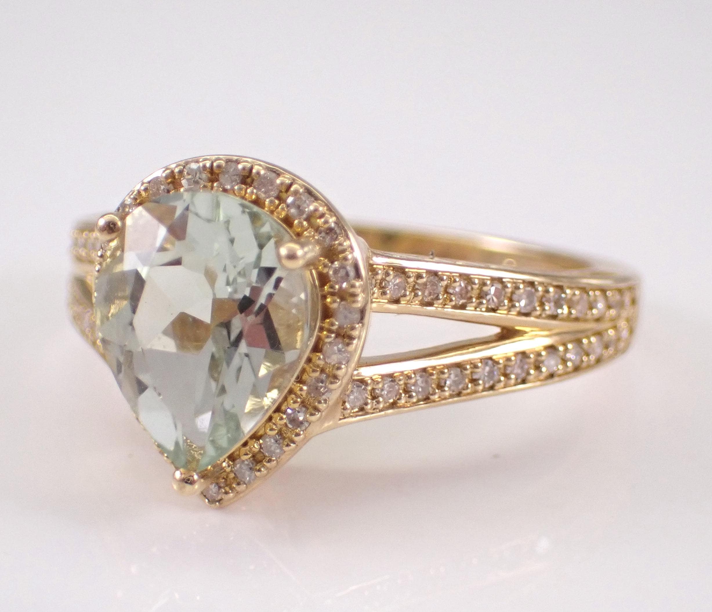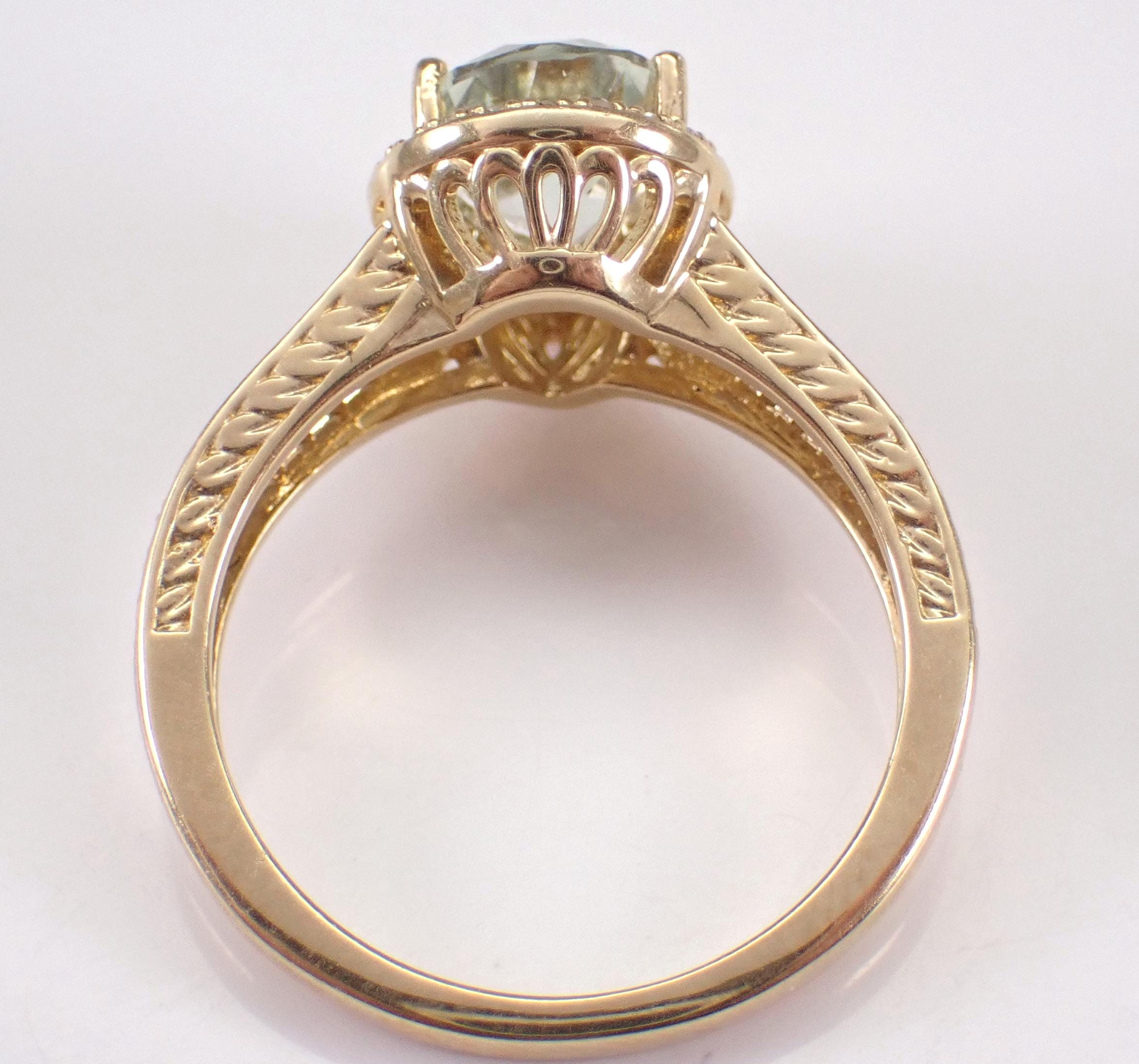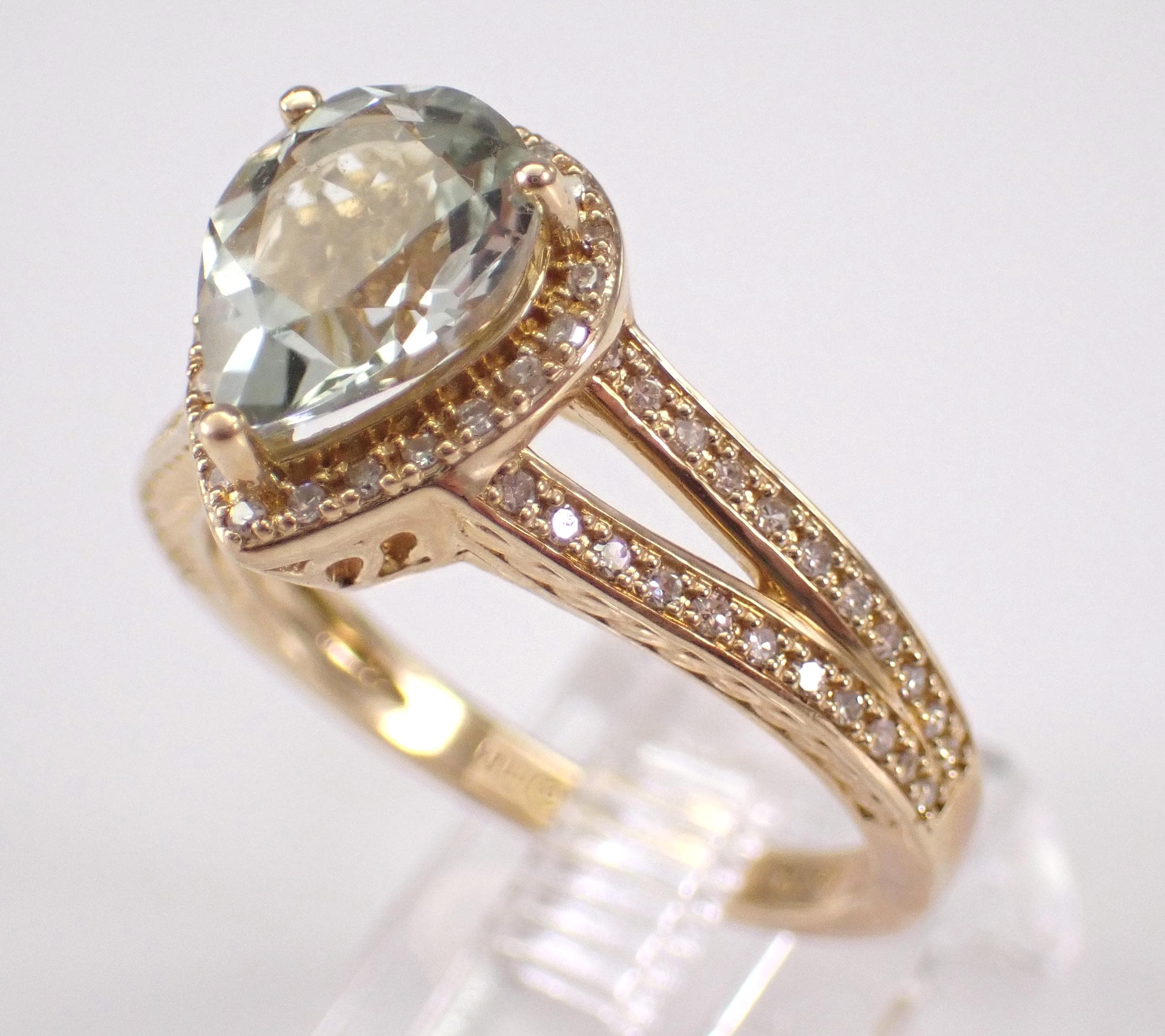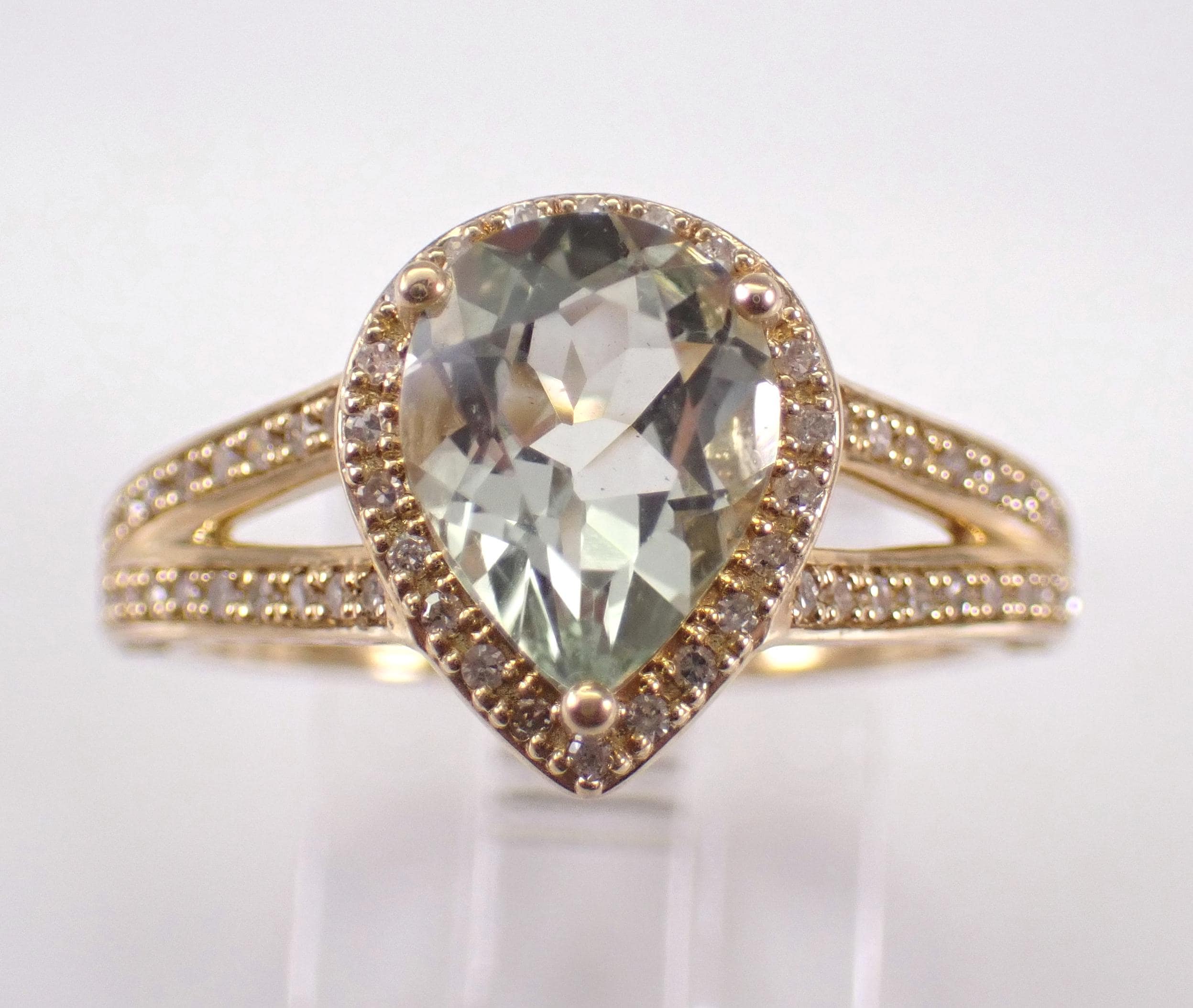 Yellow Gold Diamond and Green Amethyst Engagement Ring. This ring is set with one genuine Pear shaped Green Amethyst (Prasiolite) in the center and sixty-six natural Round Brilliant Diamonds throughout. These diamonds are H color, SI/I1 clarity and weigh a total of .25 carat. The Green Amethyst is a pale green color, measures 9 X 7 mm and weighs 1 1/2 carat. This ring is 10KT Yellow Gold, weighs 4.0 grams and is a finger size 7, which is resizable free of charge (please inquire about sizing with the finger size you need). The ring will be accompanied by an appraisal by a GIA Certified Diamond Grader with the retail replacement value of $1,495.00. I will ship this ring promptly in a gift box.