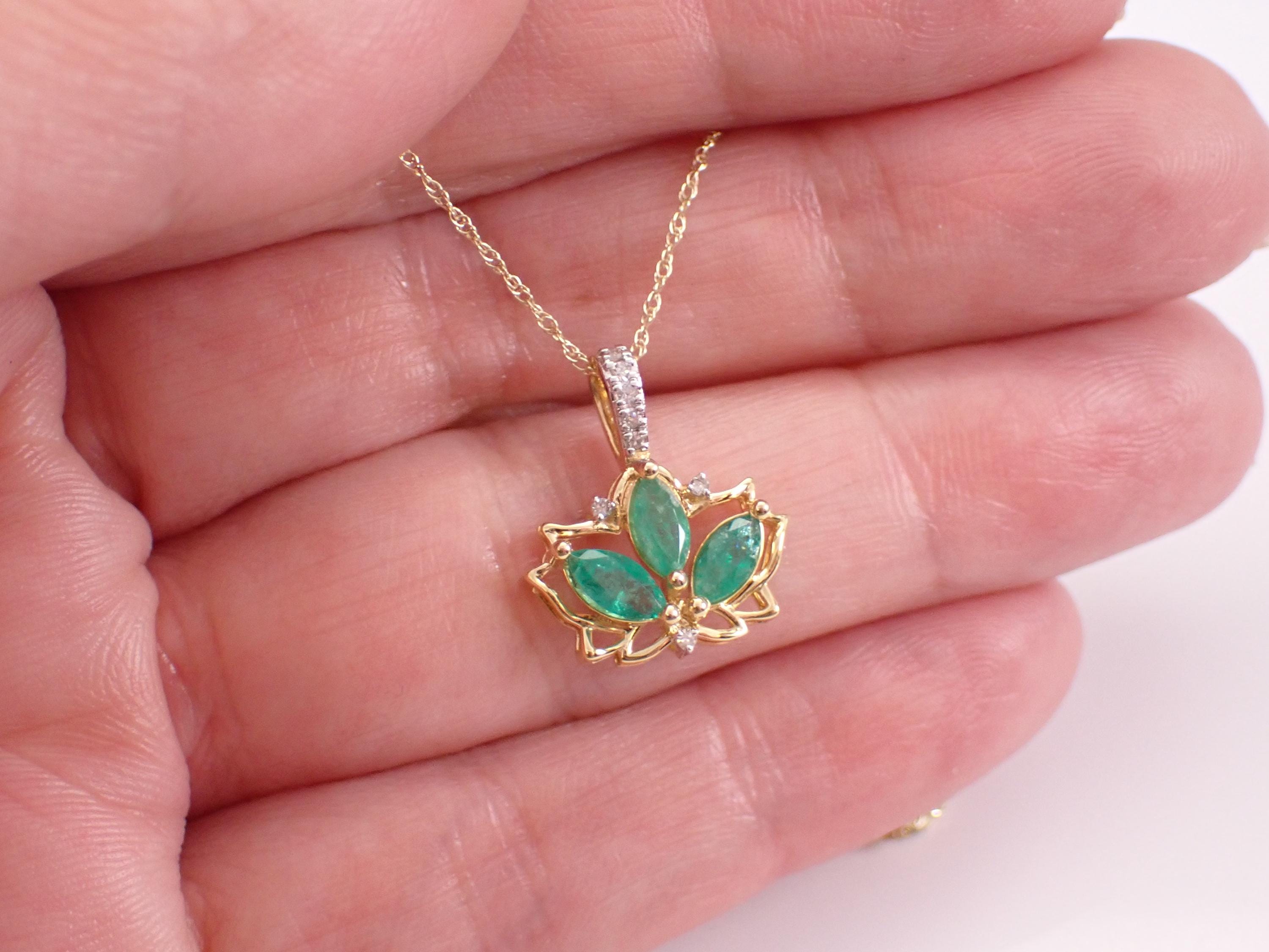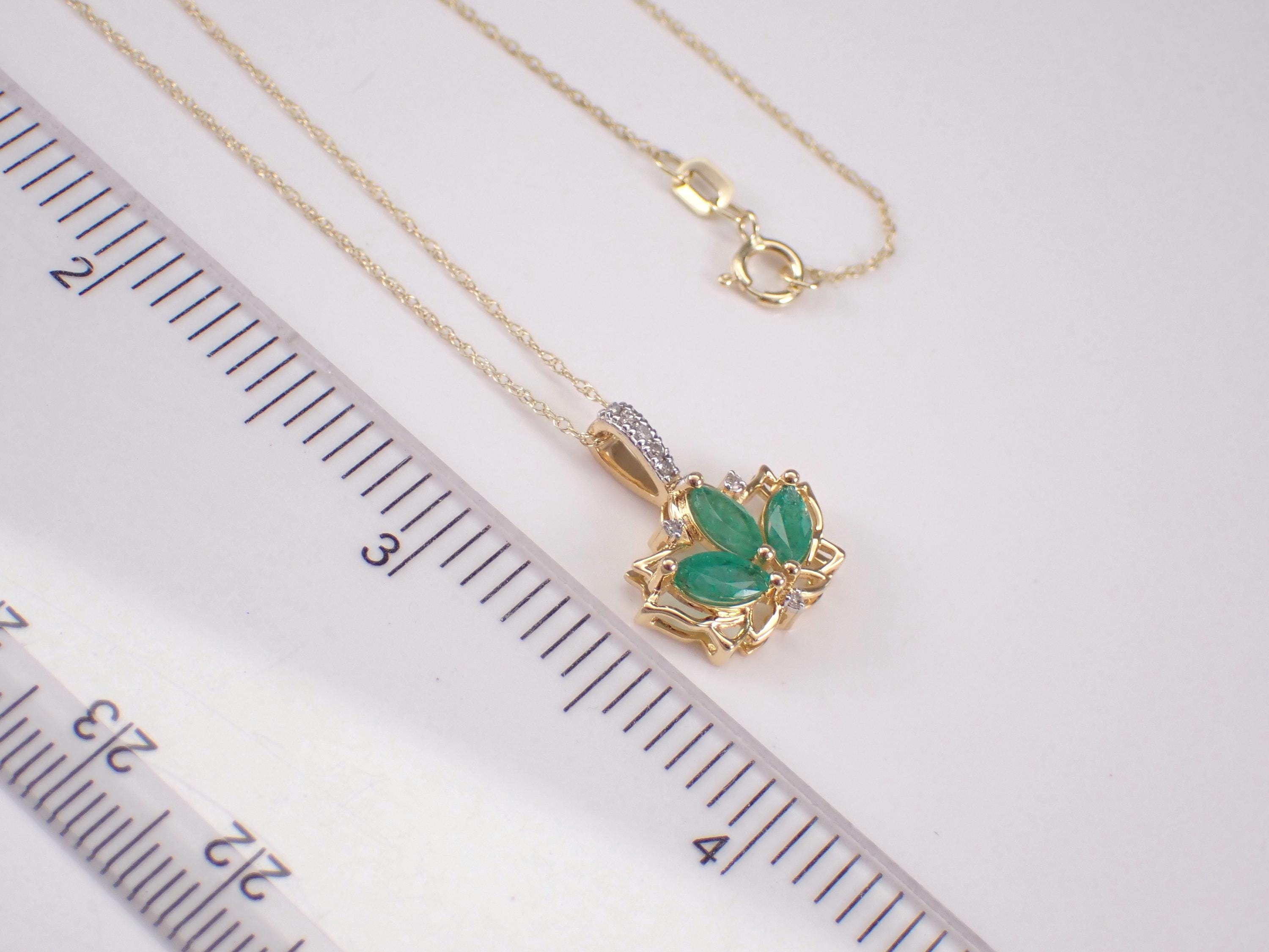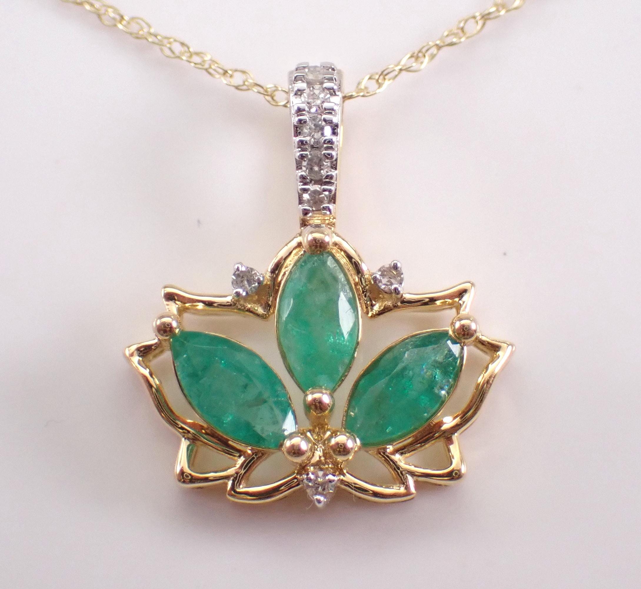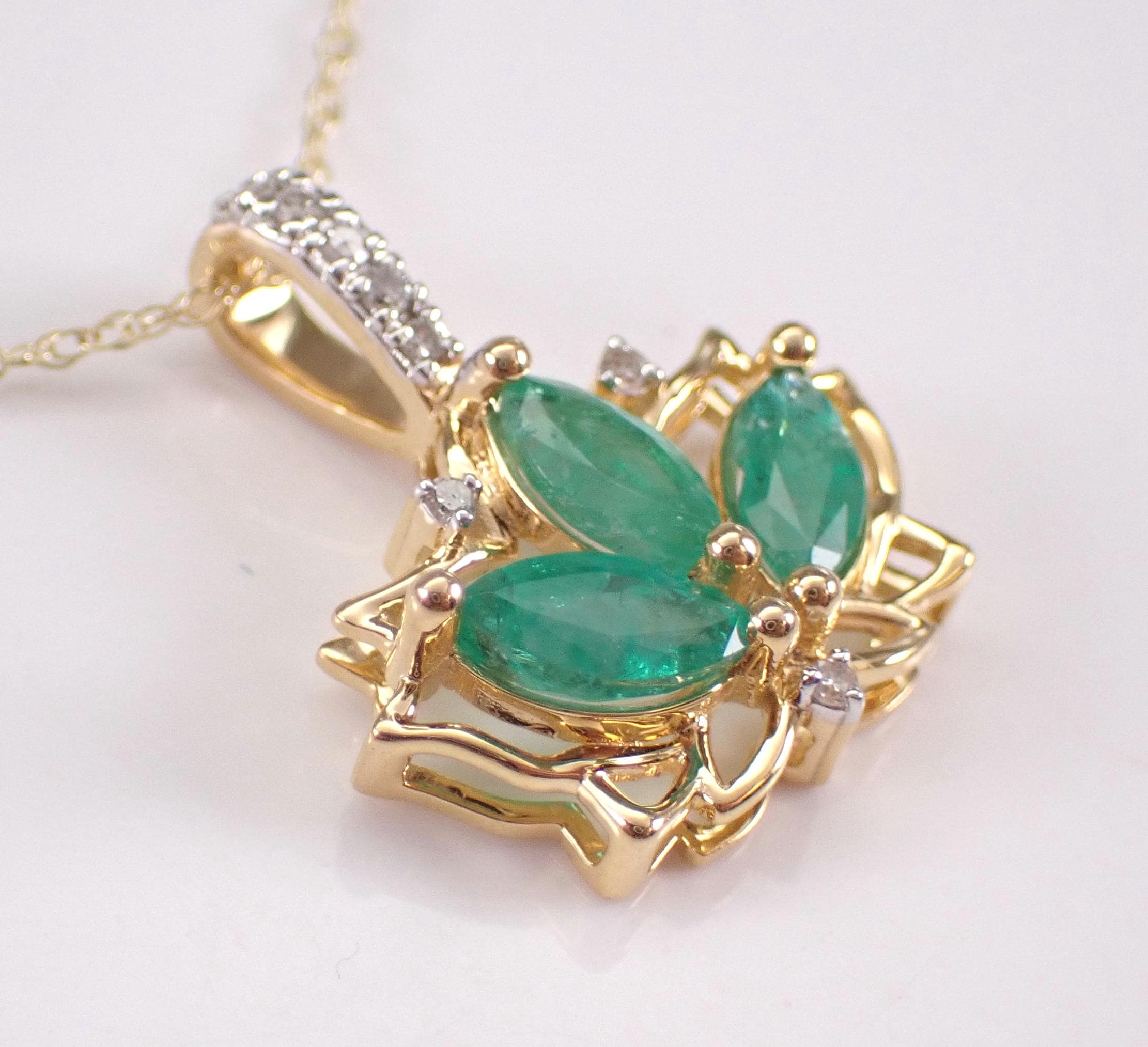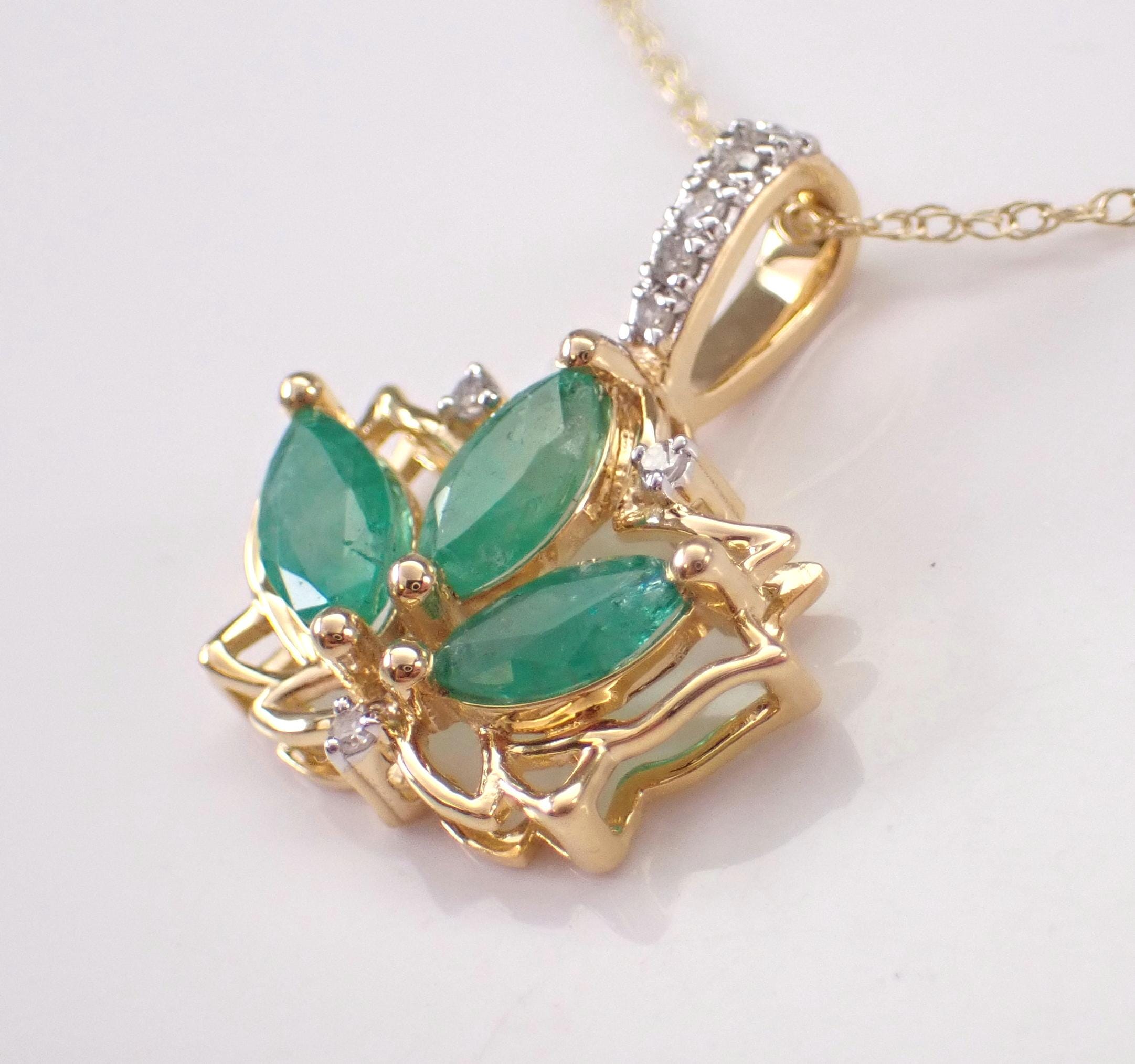 Yellow Gold Diamond and Emerald Pendant with Chain. This pendant is set with three Marquise Emeralds and eight Round Brilliant Diamonds. The Emeralds combine to a total weight of 1/2 carat. The diamonds are H color, I1 clarity and weigh a total of .05 carats. This pendant is 10KT Yellow Gold, comes with an 18" 10K Yellow Gold chain and together with the chain weighs 1.8 grams. This pendant measures 15 X 17 mm. This necklace will be accompanied by an appraisal by a GIA Certified Diamond Grader with the retail replacement value of $1,185.00. I will ship this pendant promptly in a beautiful gift box.