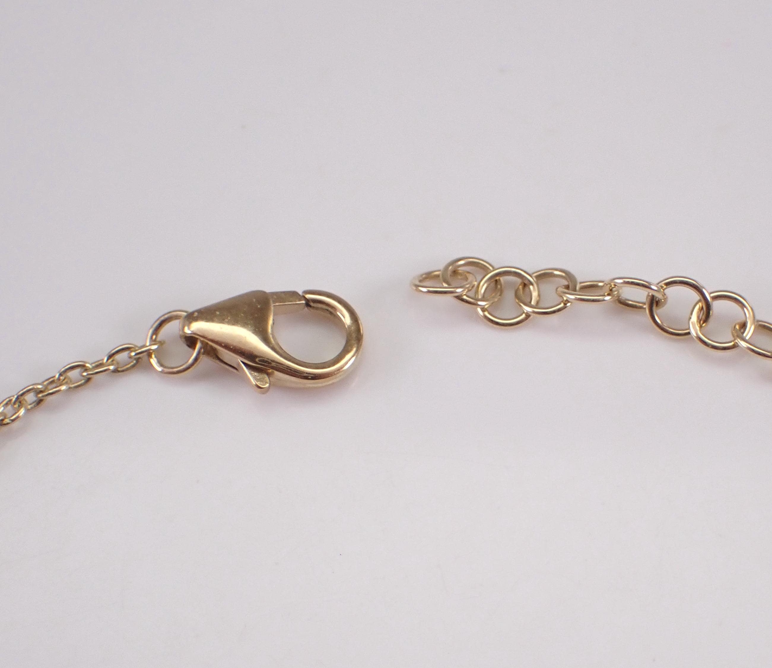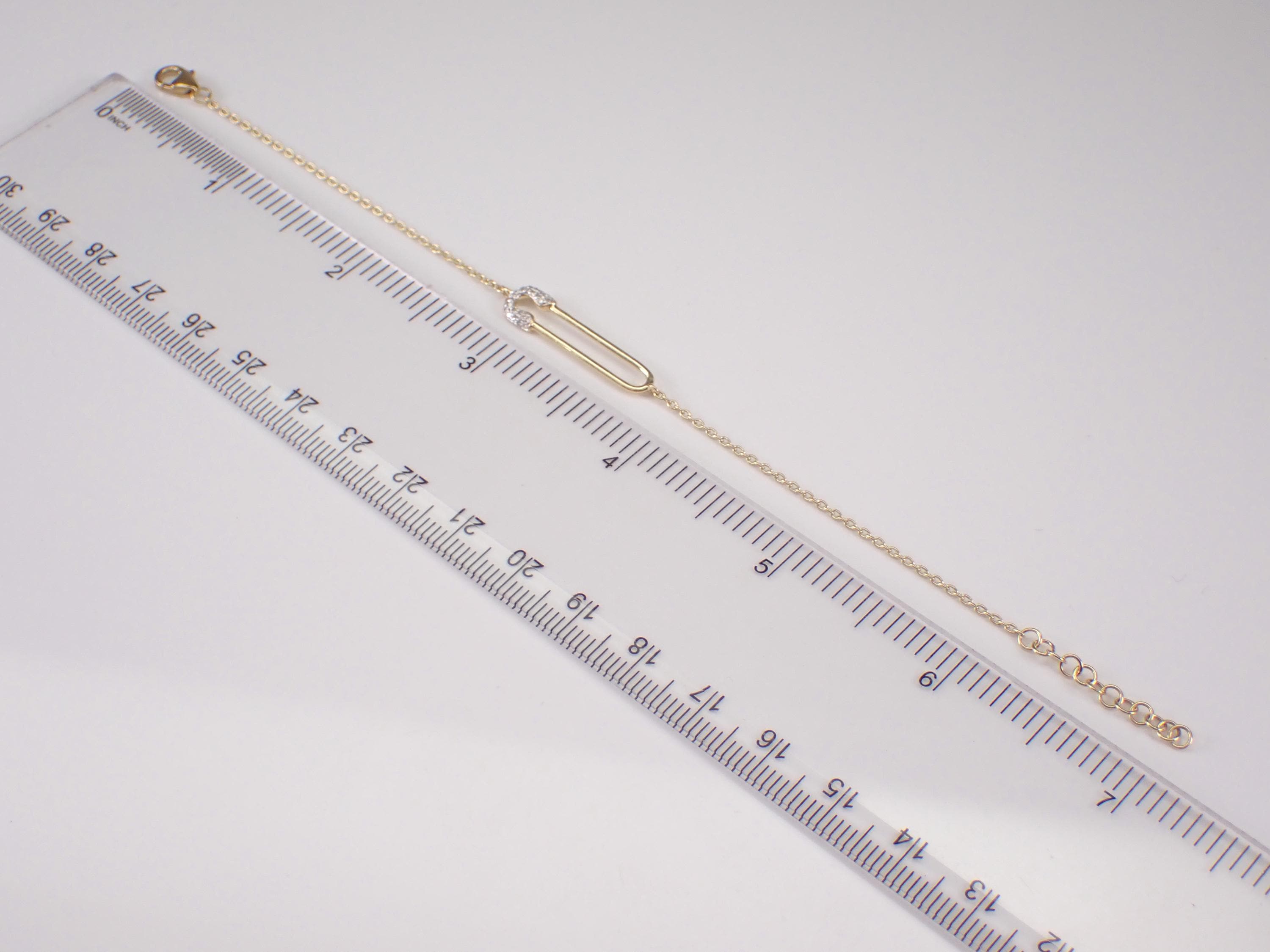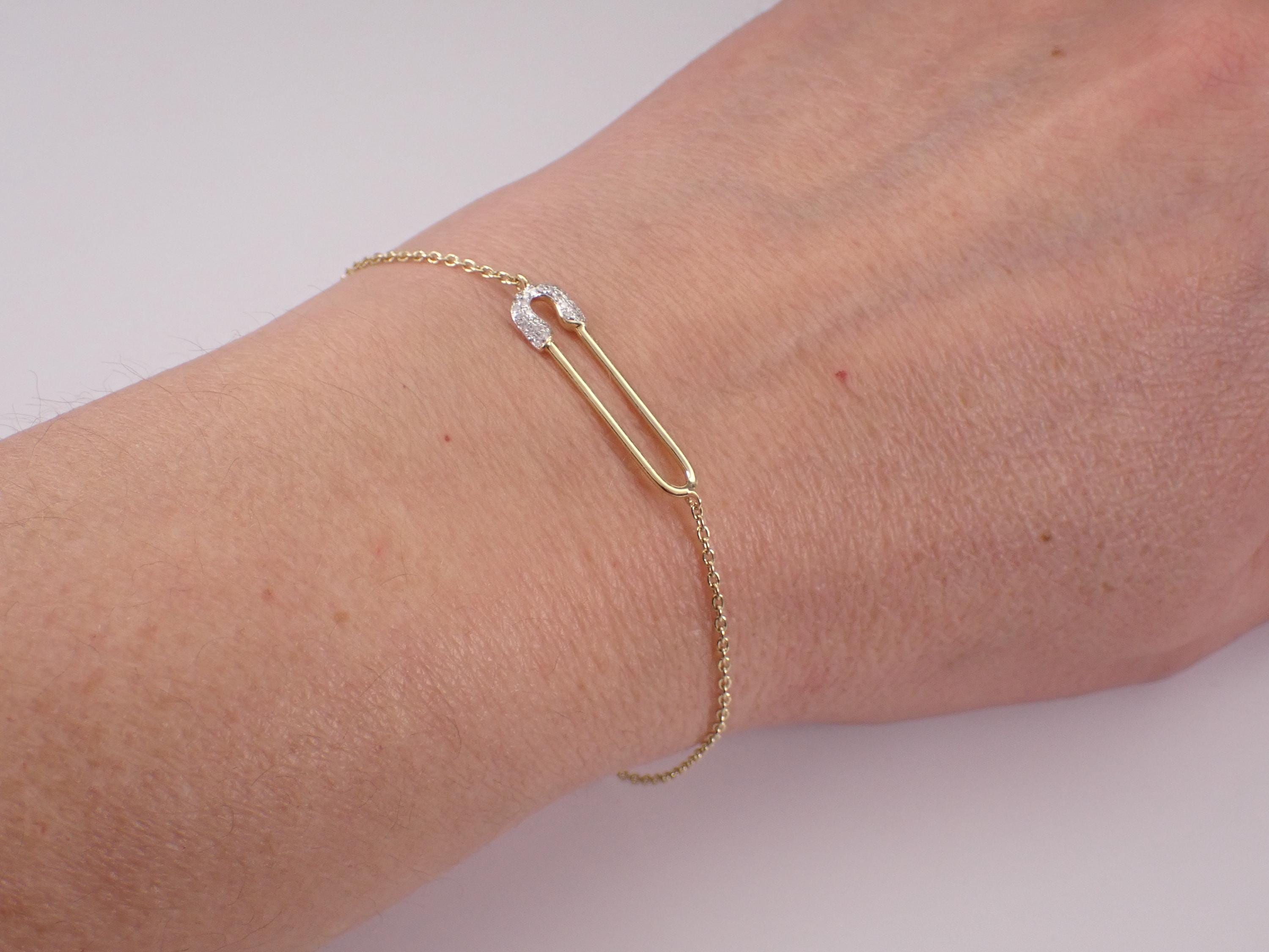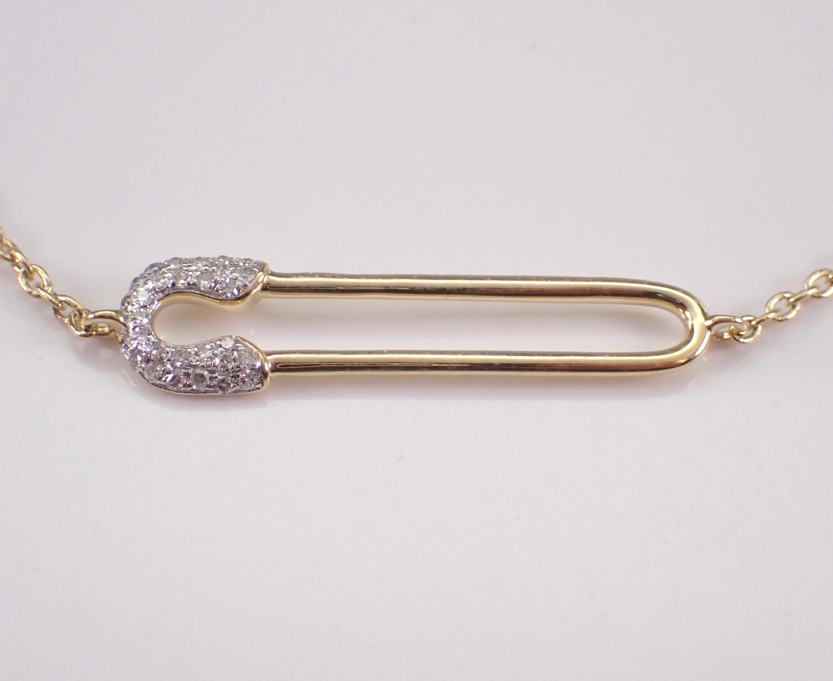 Yellow Gold Diamond Safety Pin Bracelet. This bracelet weighs 1.7 grams and fits a lady's wrist (measures 6-7", adjustable). There are twenty-nine genuine Round Brilliant Diamonds set in the center of this bracelet. These diamonds are G/H color, SI clarity and weigh a total of .15 carat. This safety pin measures 25 mm across. I will ship this bracelet promptly in a gift box.