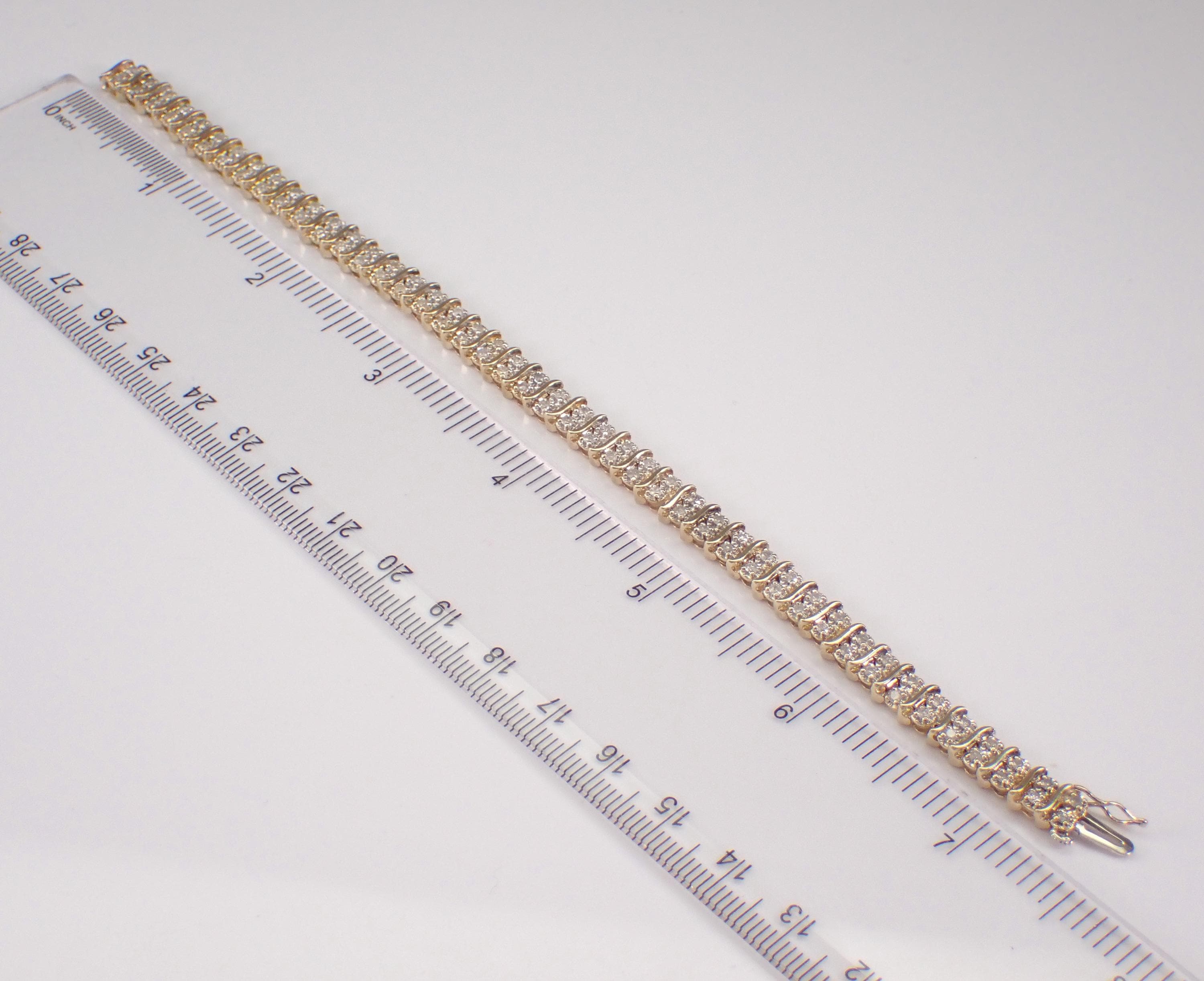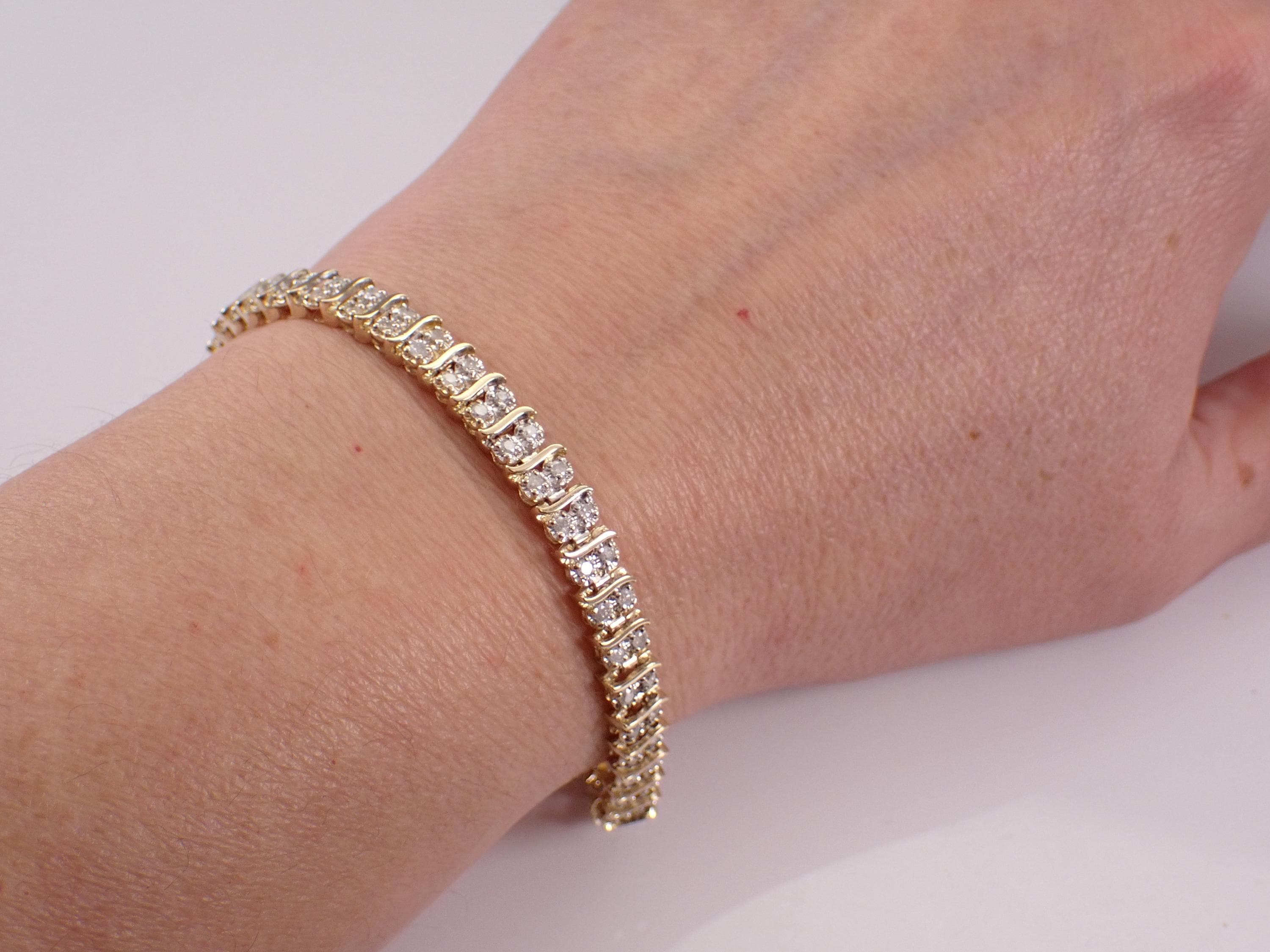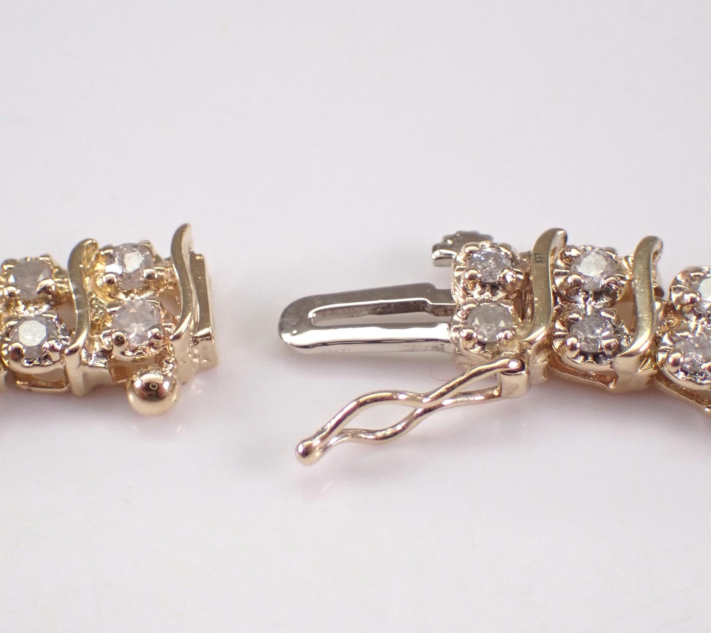 14K Yellow Gold Diamond Tennis Bracelet. This bracelet is set with eighty-eight genuine Round Diamonds. These diamonds are H color, I1 clarity and weigh a total of 1 1/4 carats. The bracelet is 14K Yellow Gold, weighs 13.3 grams, measures 6 mm in width and 7" in length. This bracelet will be accompanied by an appraisal for insurance and authentication purposes. I will ship this bracelet promptly in a gift box.