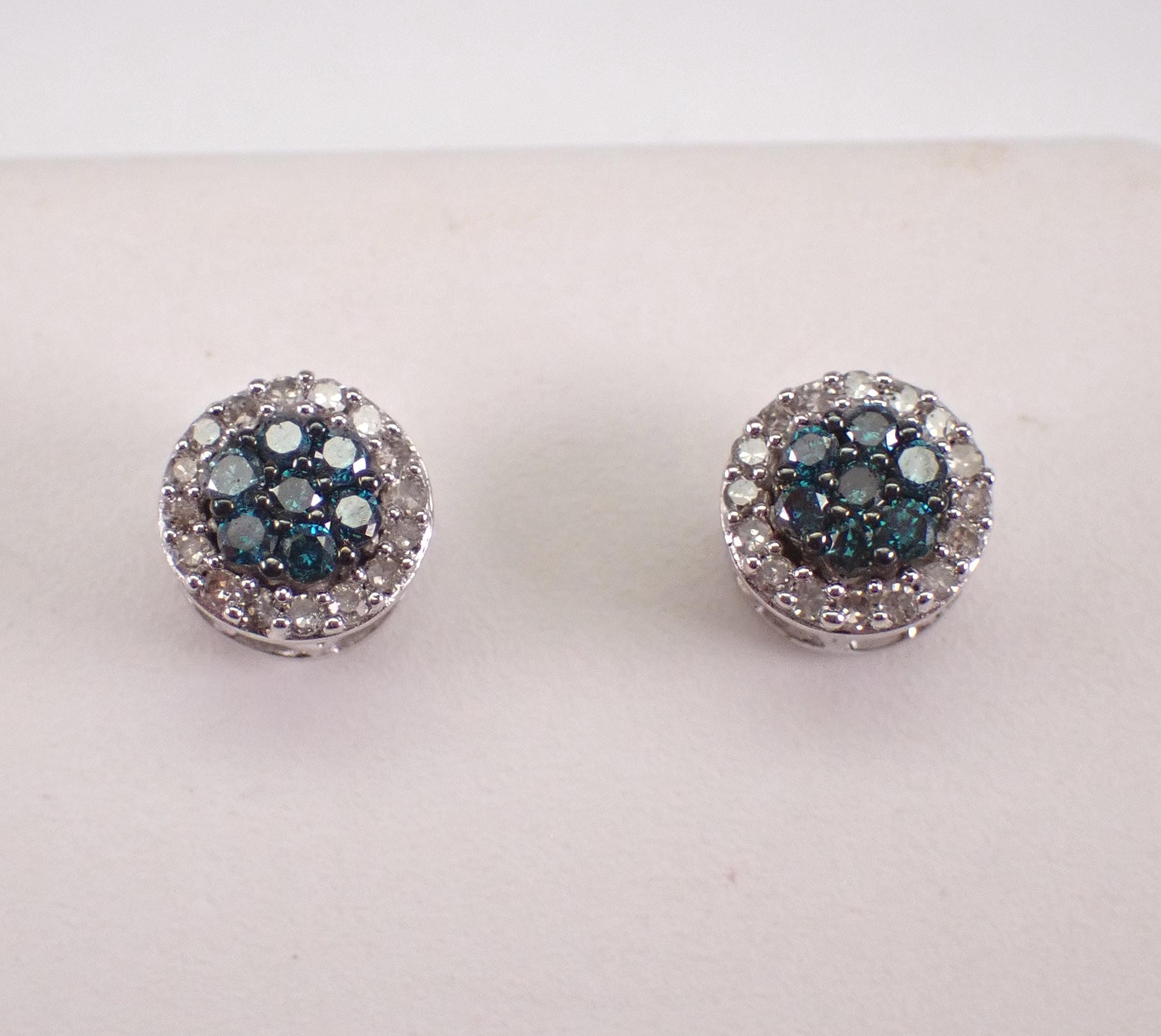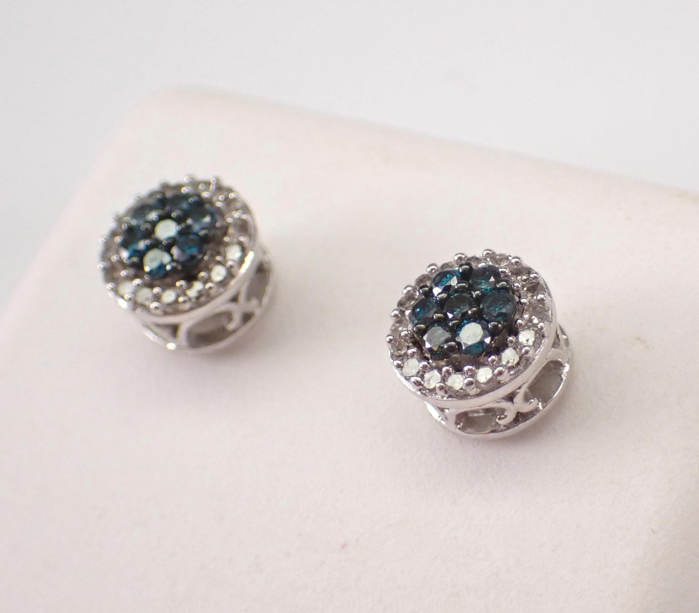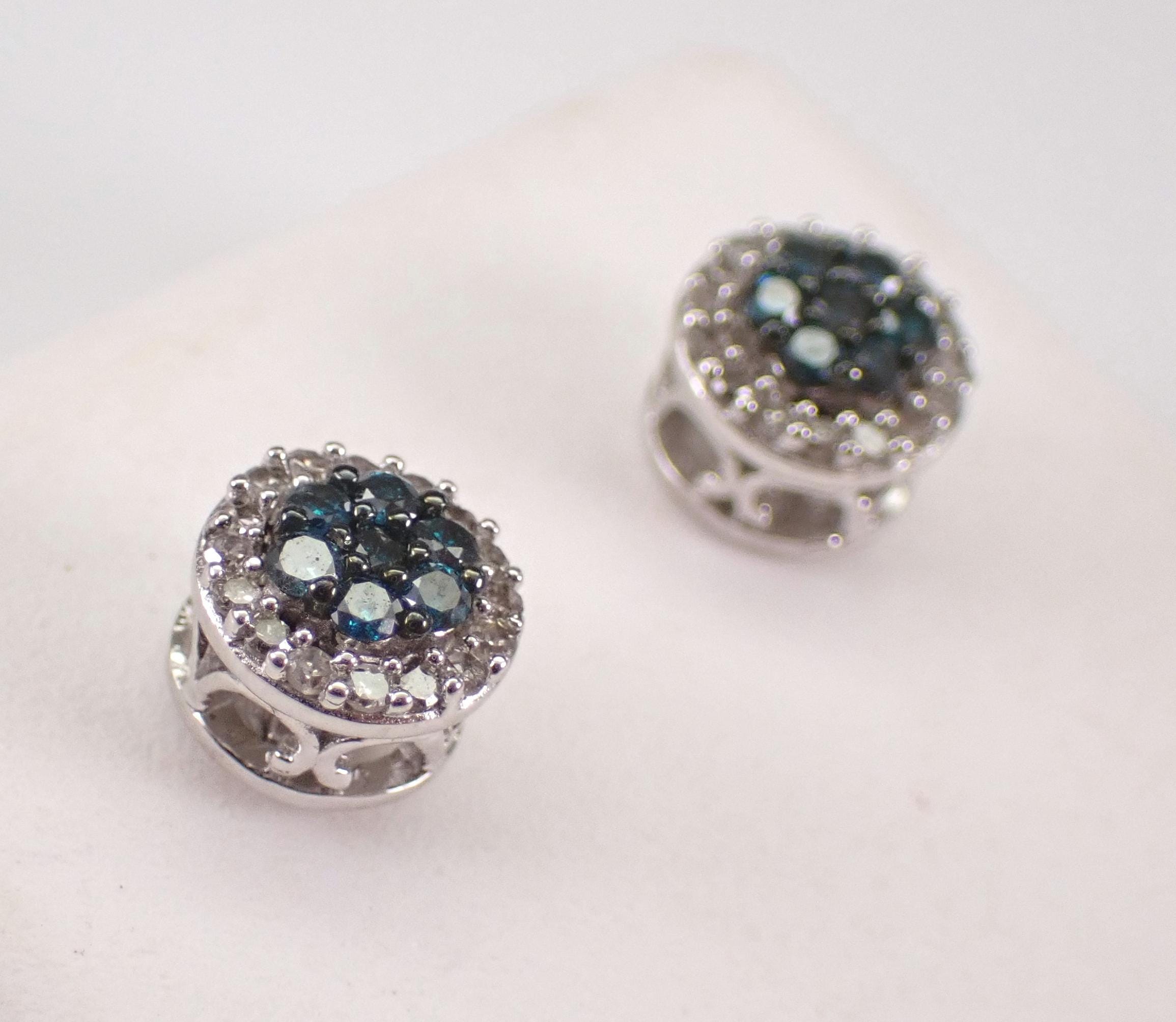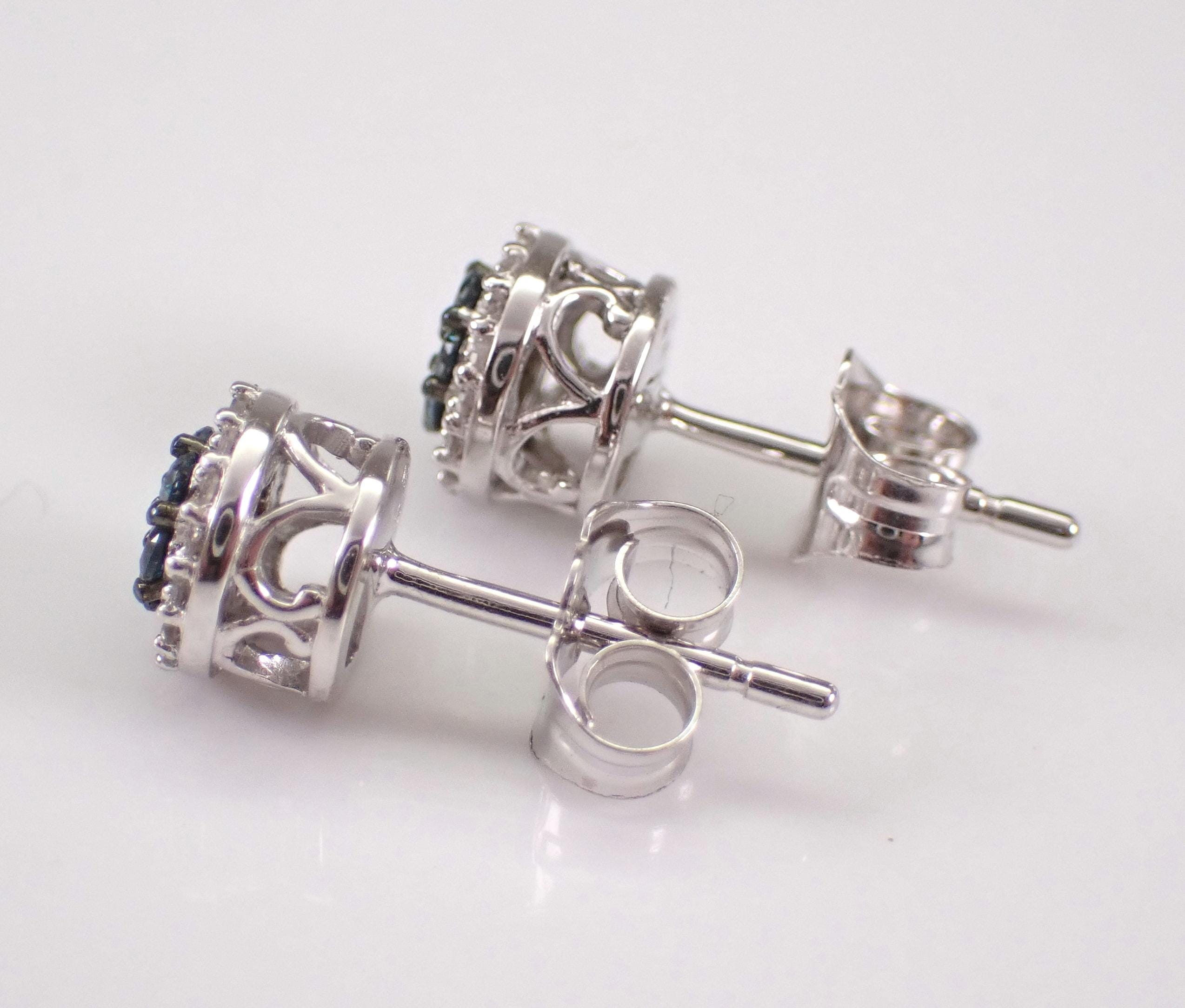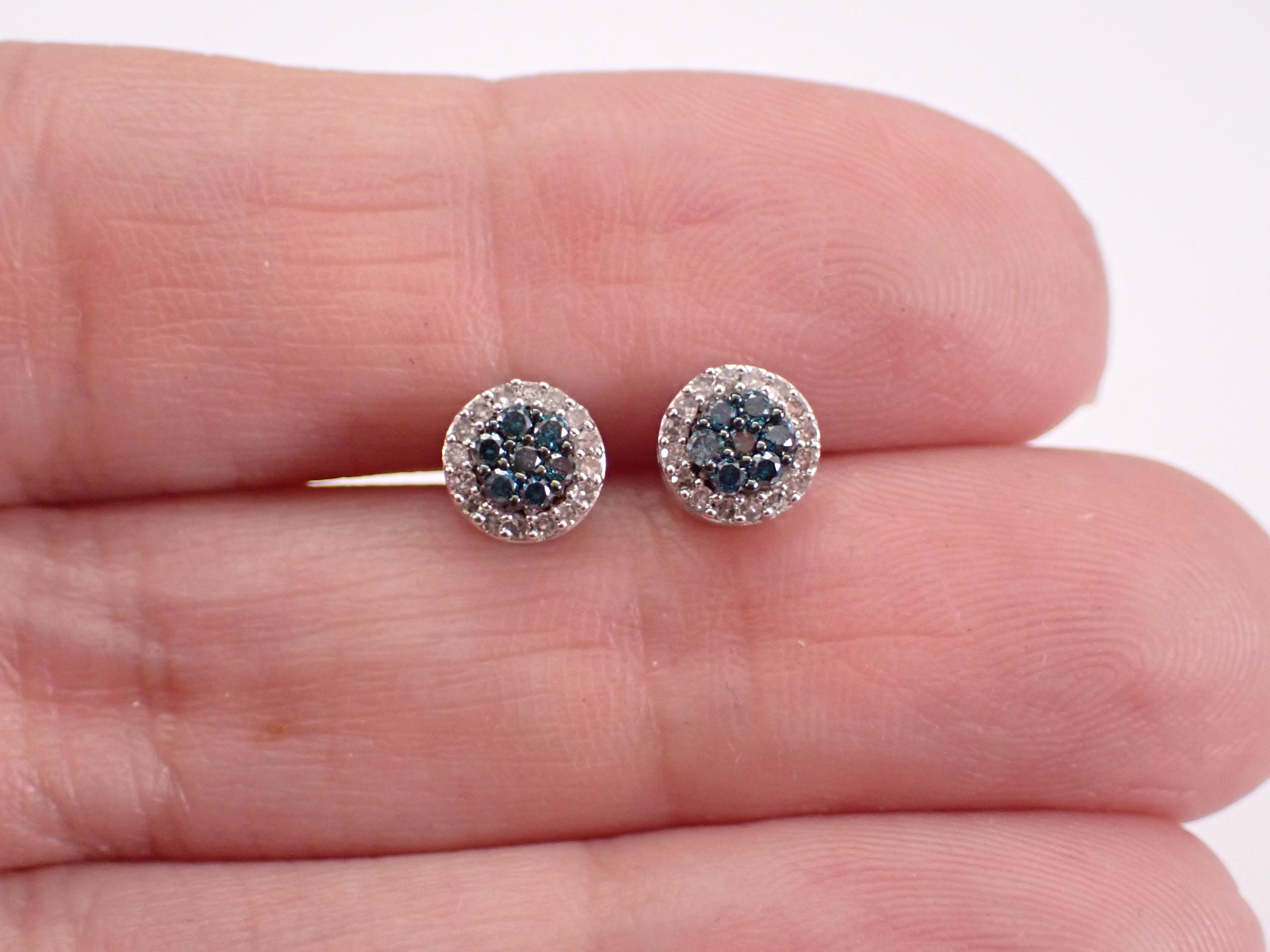These earrings are set with seven Round Brilliant BLUE Diamonds and sixteen natural Round Brilliant colorless Diamonds in EACH earring. These Diamonds are H color (white), I1 clarity and amount to a total weight of 1/4 carat.