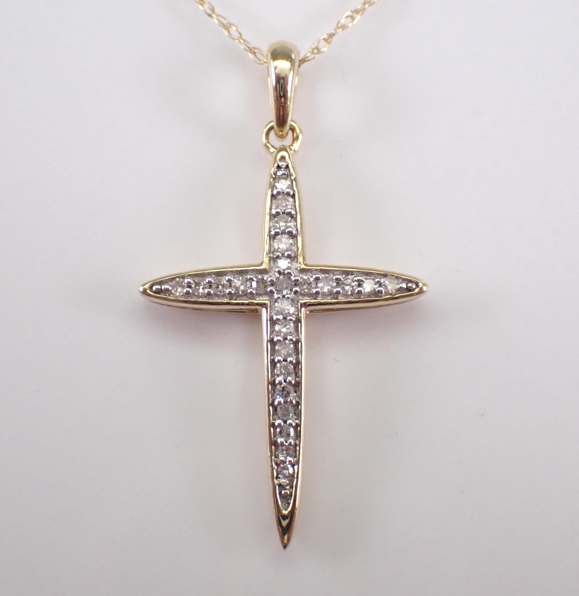 Yellow Gold Diamond Cross Pendant Necklace with Chain. This cross is set with twenty-five genuine Round Brilliant Diamonds. These diamonds are H color, SI/I1 clarity and weigh a total of .10 carat. This pendant is 10KT Yellow Gold, comes with an 18" 10K Yellow Gold chain and together with the chain weighs 1.6 grams. This cross measures 23 X 15 mm without the bail. This cross will be accompanied by an appraisal by a GIA Certified Diamond Grader with the retail replacement value of $1,295.00. I will ship this pendant promptly in a beautiful gift box.