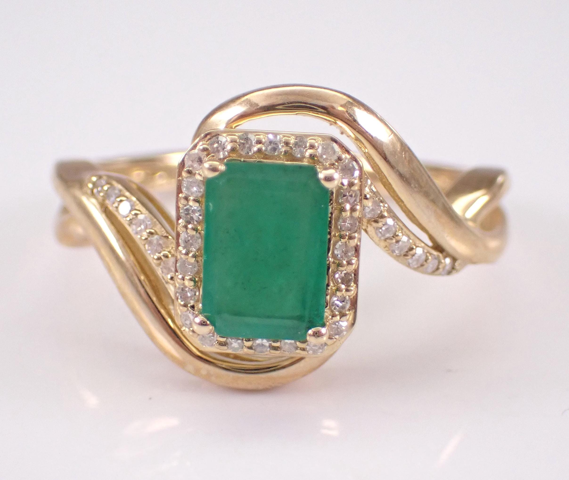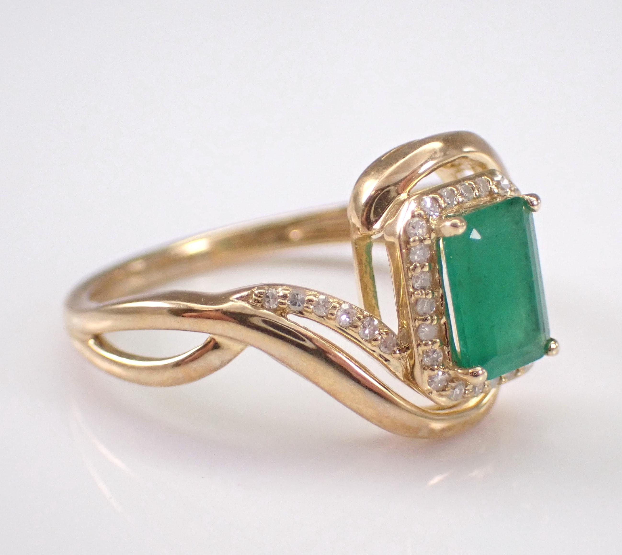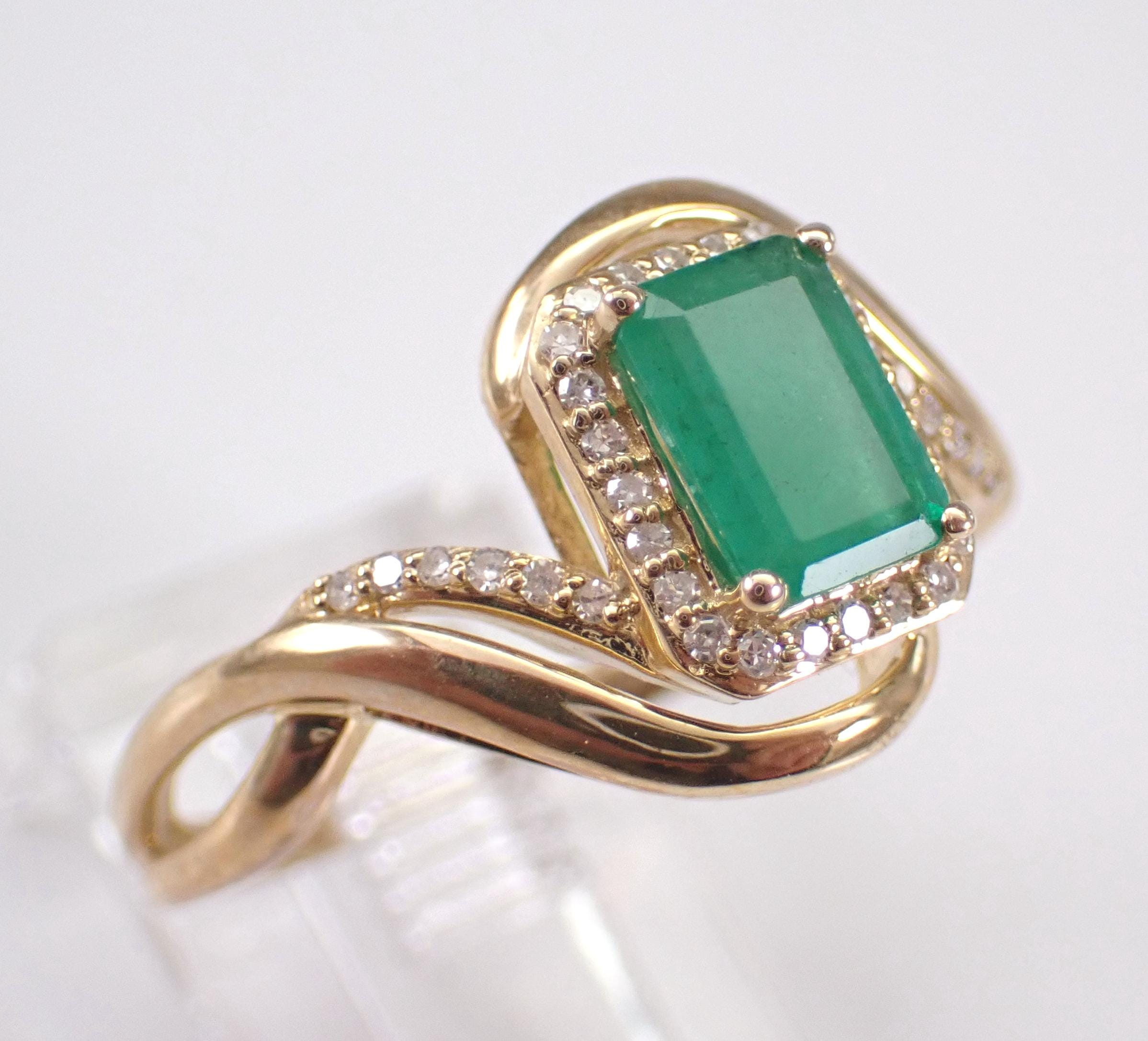 Yellow Gold Diamond and Emerald Halo Engagement Ring. This ring is set with one genuine Emerald-Cut Emerald in the center. This Emerald measures 7 X 5 mm and weighs 1 carat. There are thirty-six genuine Round Brilliant Diamonds set in this ring. These diamonds are H color, I1 clarity and weigh a total of .15 carats. This ring is 10KT Yellow Gold, weighs 3.3 grams and is a finger size 7, which can be resized (please inquire about sizing with the finger size you need). This ring will also be accompanied by an appraisal by a GIA Certified Diamond Grader with the replacement value of $1,495.00. I will ship this ring promptly in a beautiful gift box.