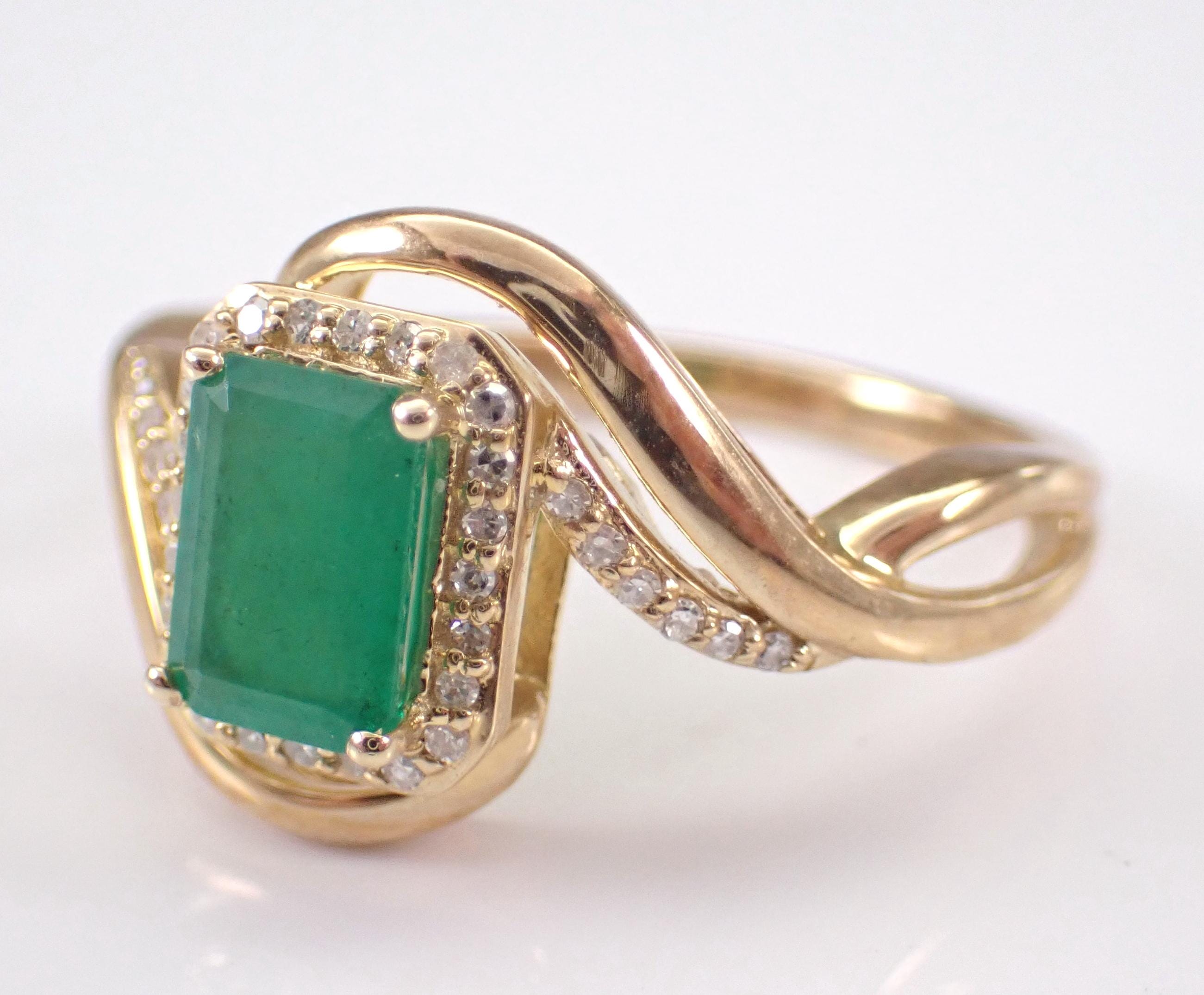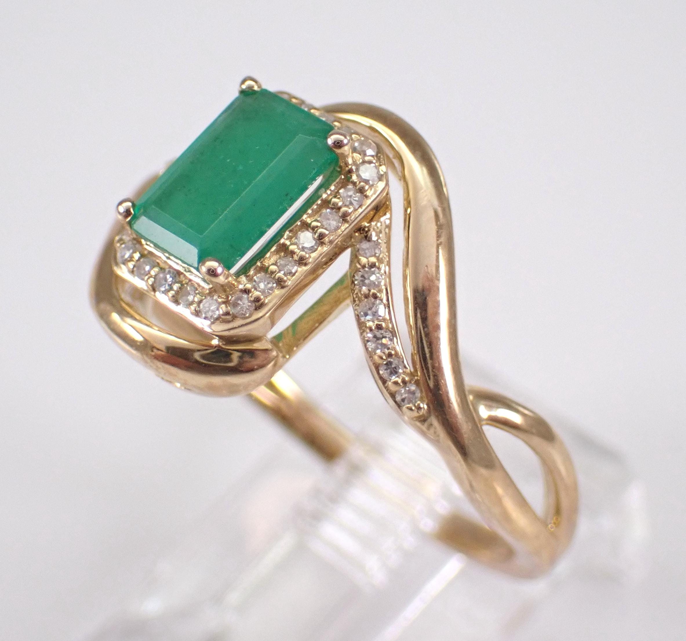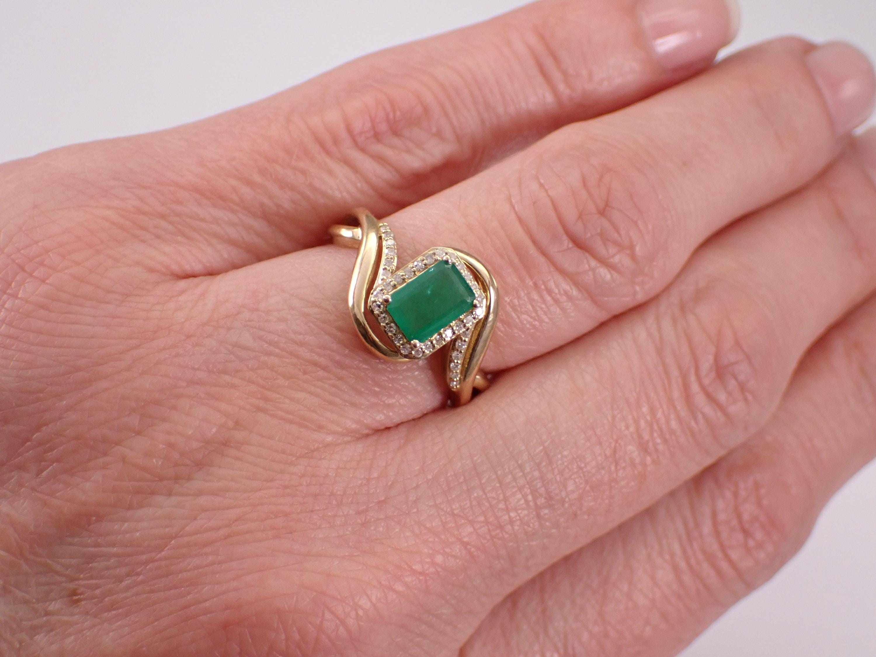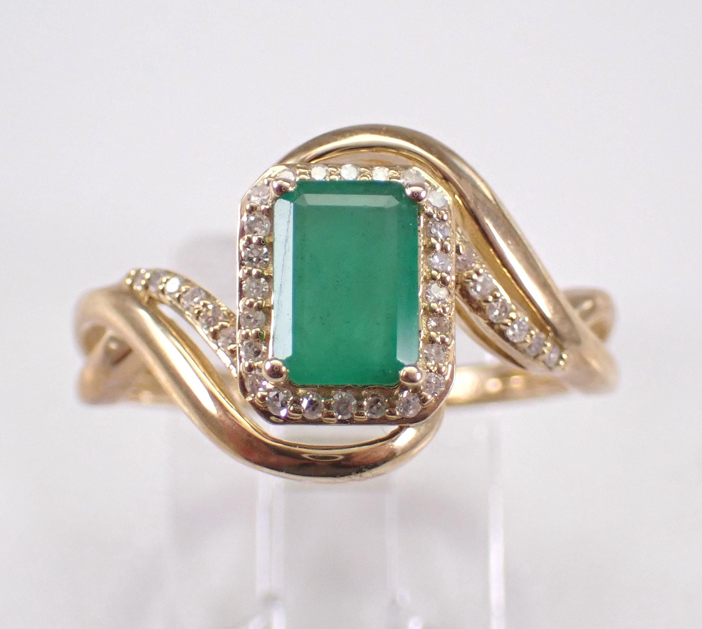 Yellow Gold Diamond and Emerald Halo Engagement Ring. This ring is set with one genuine Emerald-Cut Emerald in the center. This Emerald measures 7 X 5 mm and weighs 1 carat. There are thirty-six genuine Round Brilliant Diamonds set in this ring. These diamonds are H color, I1 clarity and weigh a total of .15 carats. This ring is 10KT Yellow Gold, weighs 3.3 grams and is a finger size 7, which can be resized (please inquire about sizing with the finger size you need). This ring will also be accompanied by an appraisal by a GIA Certified Diamond Grader with the replacement value of $1,495.00. I will ship this ring promptly in a beautiful gift box.