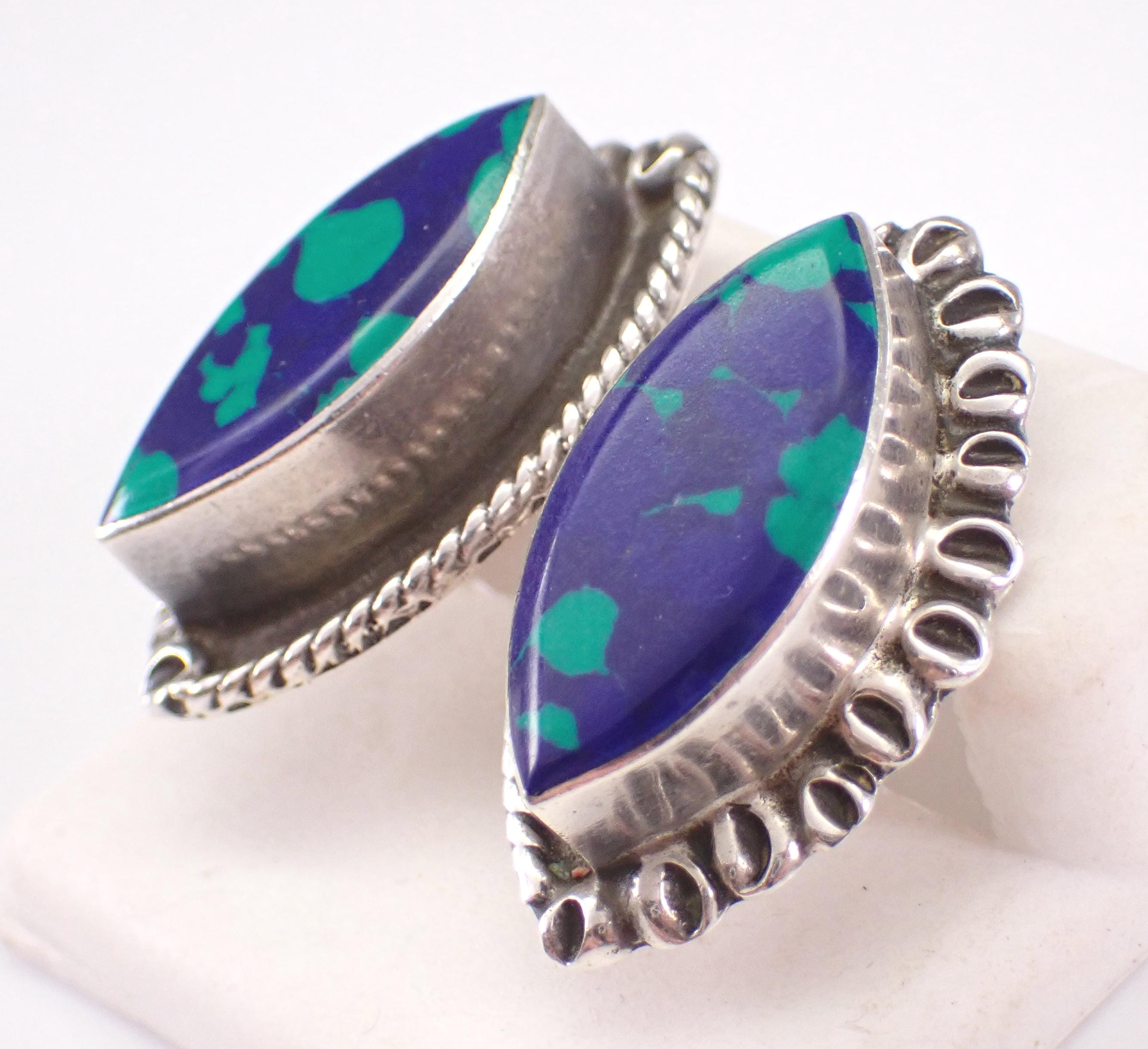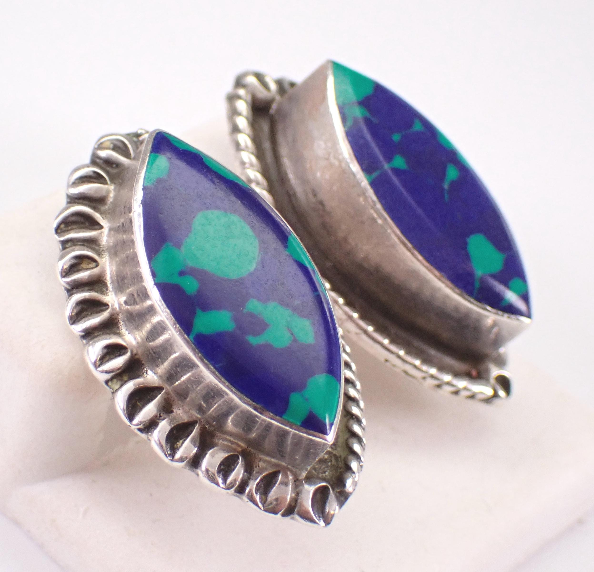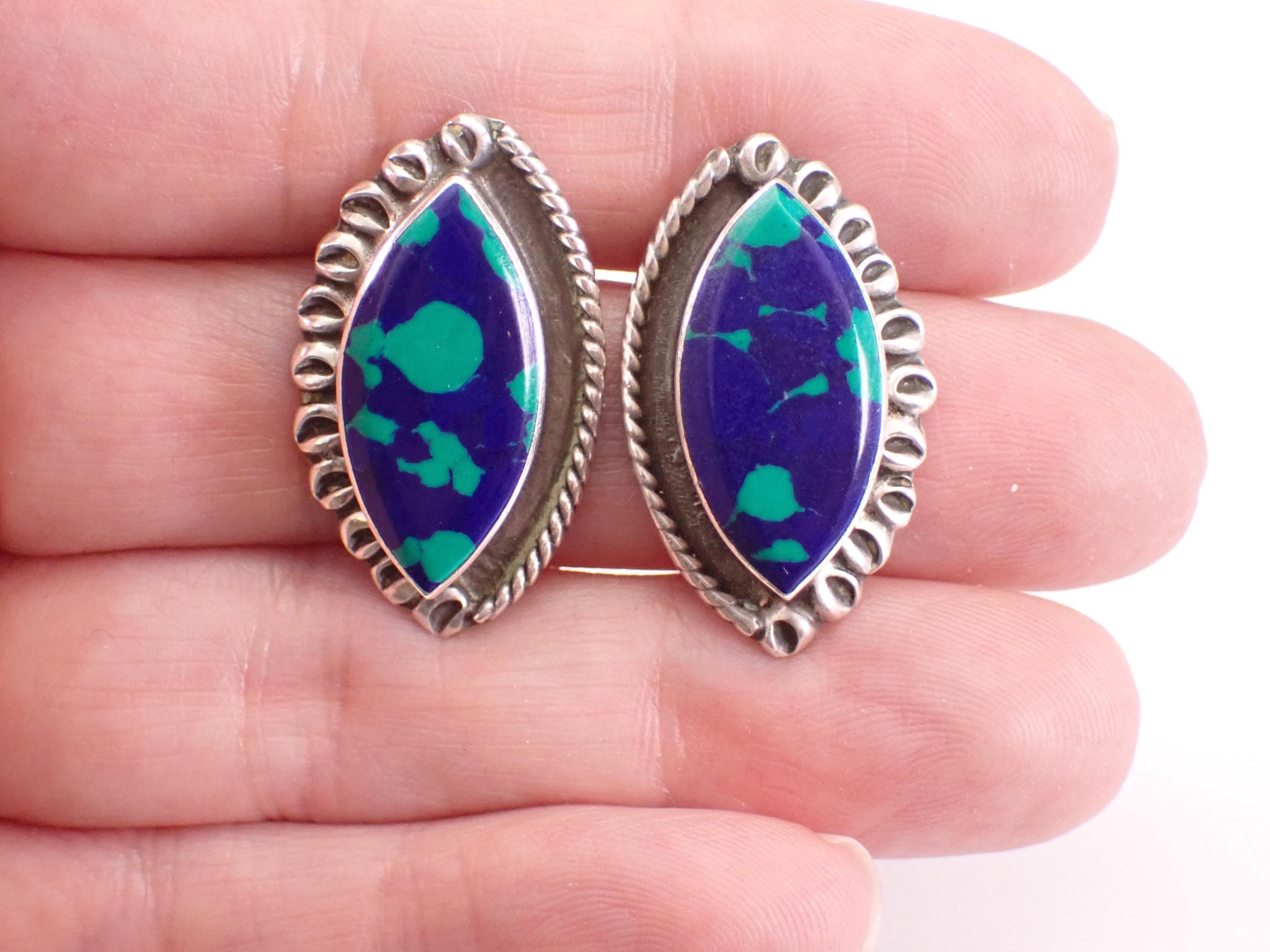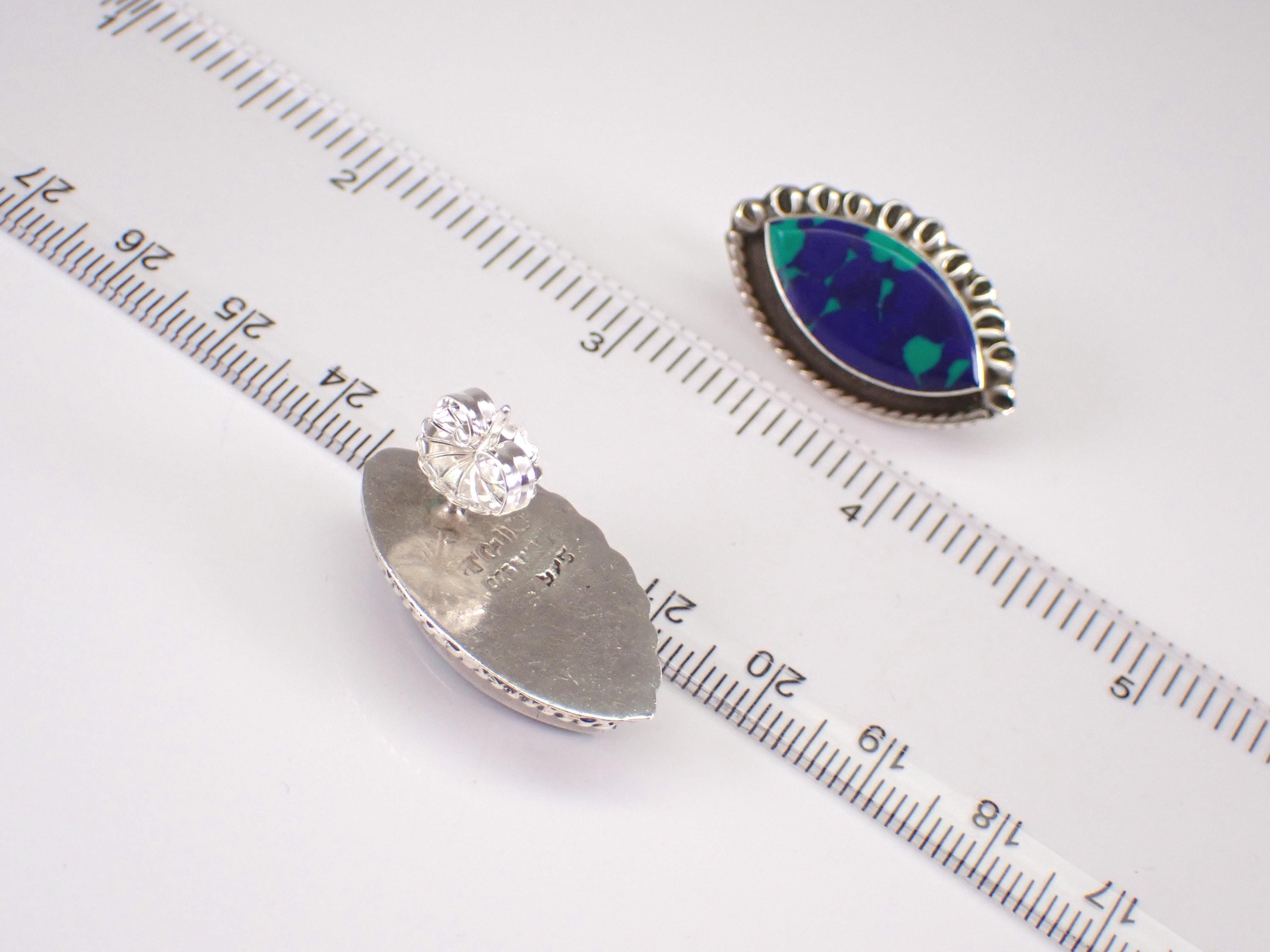 Beautiful and unique Azurite stud earrings are crafted in 925 Sterling Silver. There is a genuine Marquise shaped Azurite set in the center of each earring. These gems measure 22 X 11 mm each. Each earring measures 29 X 17 mm. These earrings weigh a total of 14.8 grams. The earrings have large friction post backings for pierced ears. Each earring is stamped 925, denoting Sterling Silver. These earrings will be shipped promptly in a gift pouch.