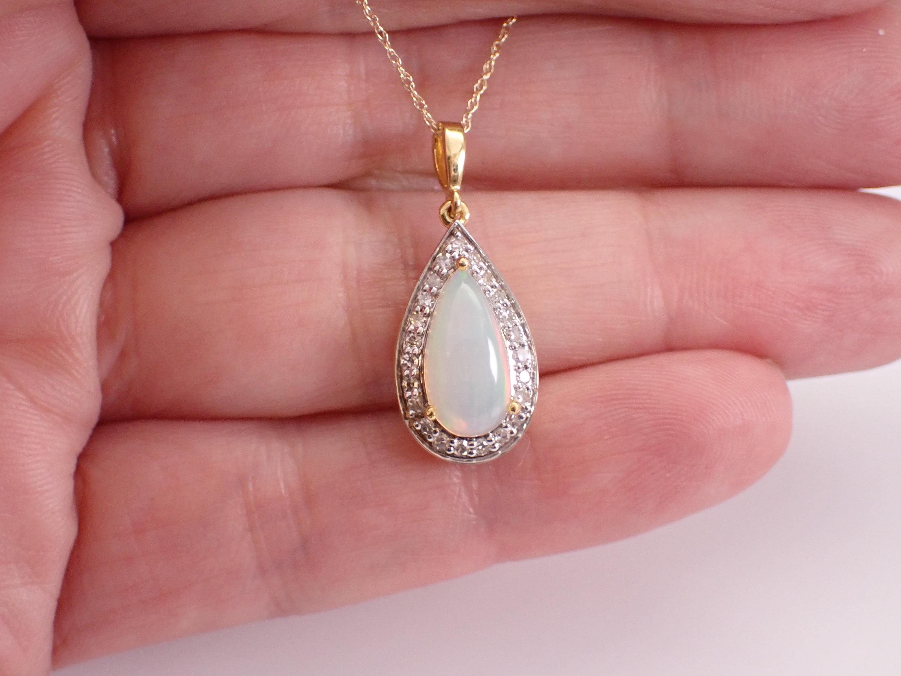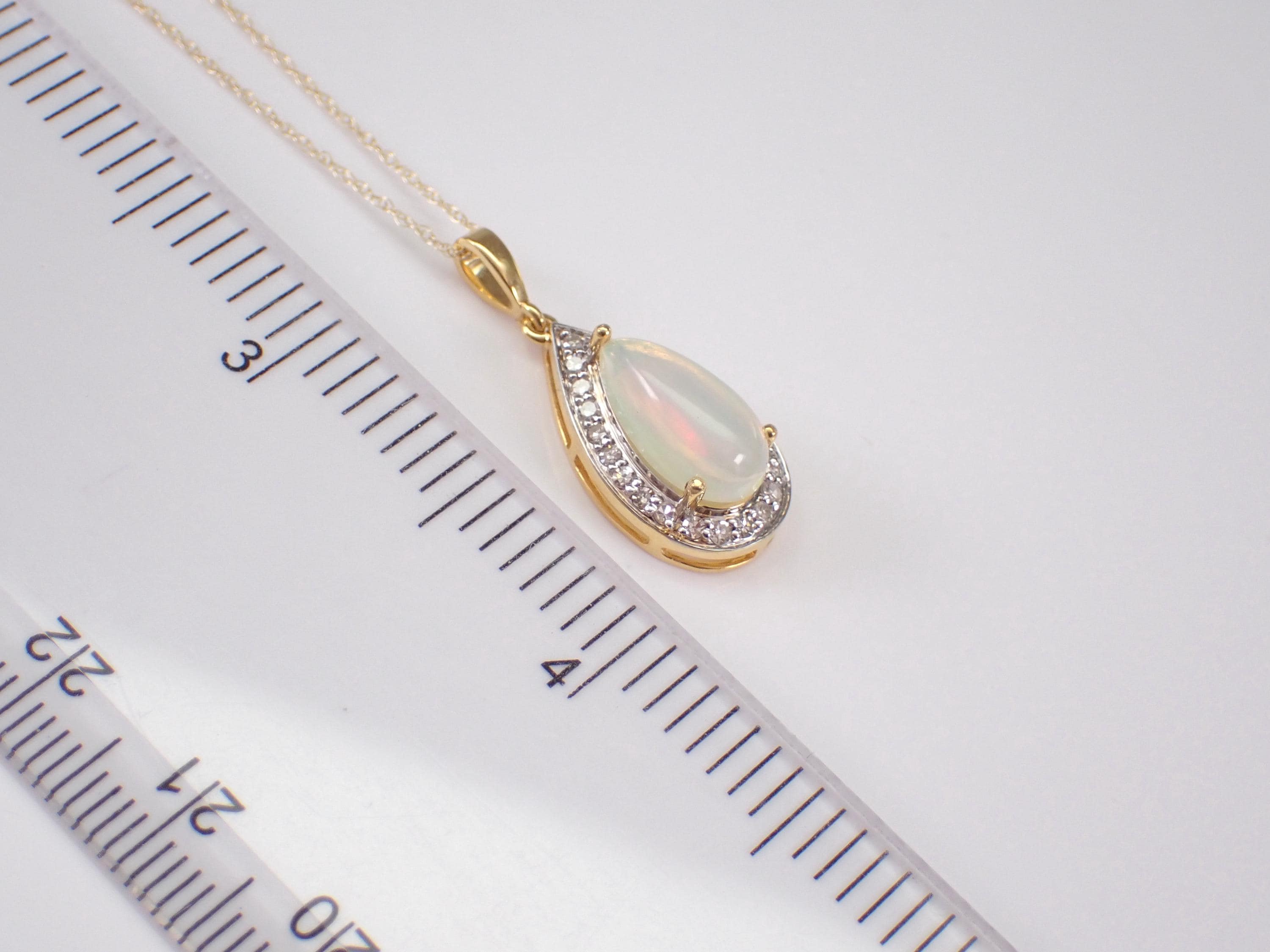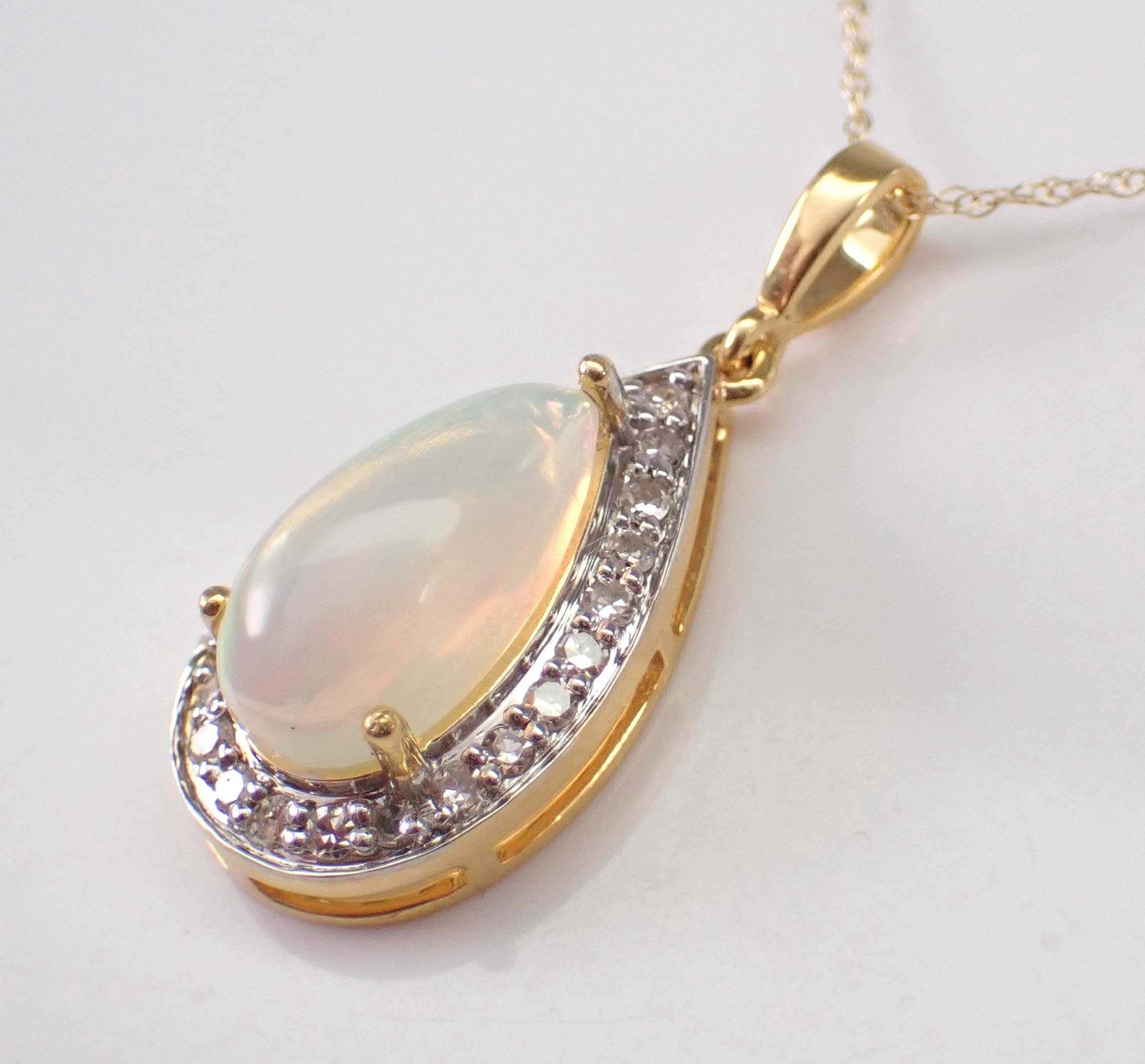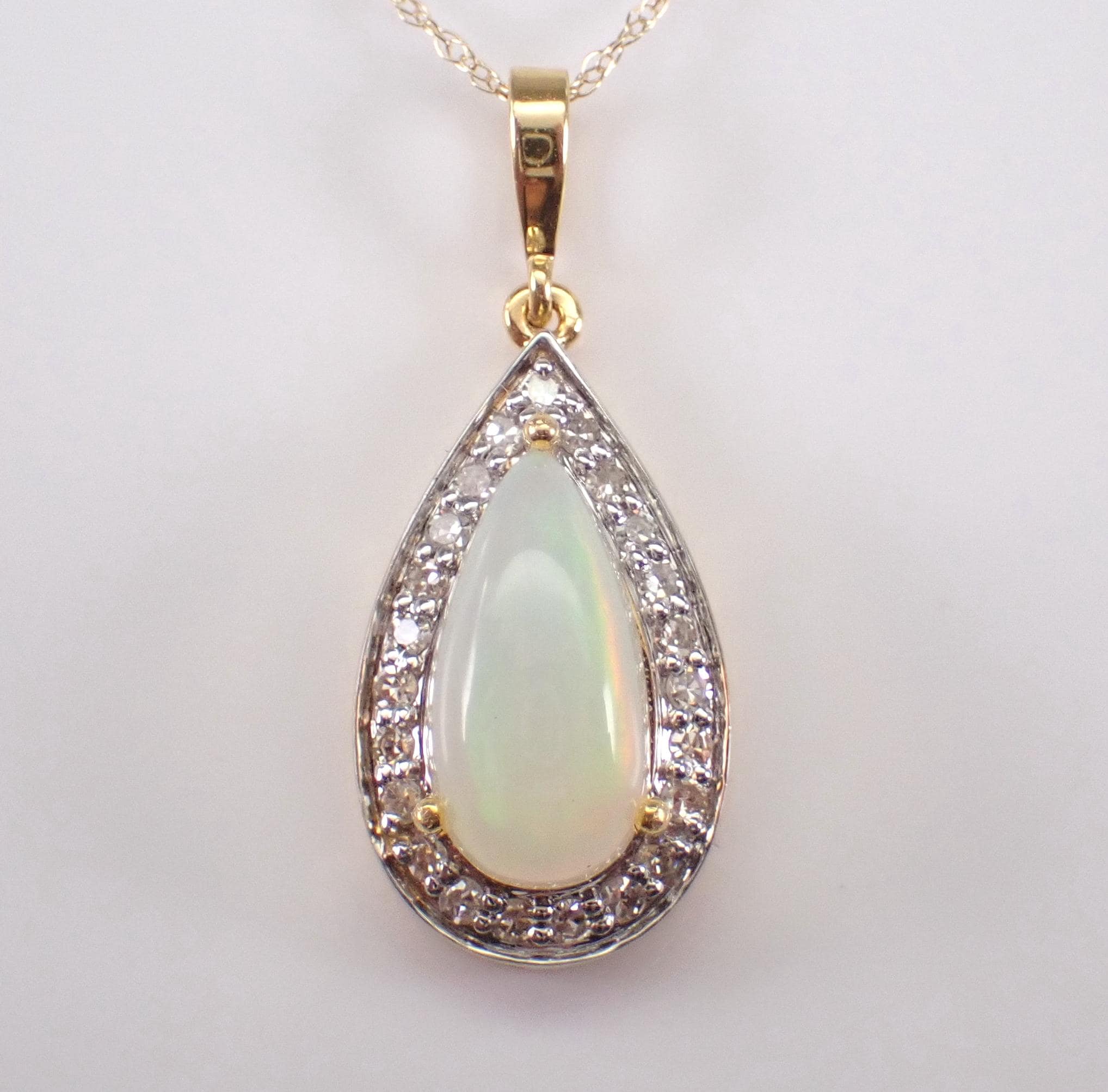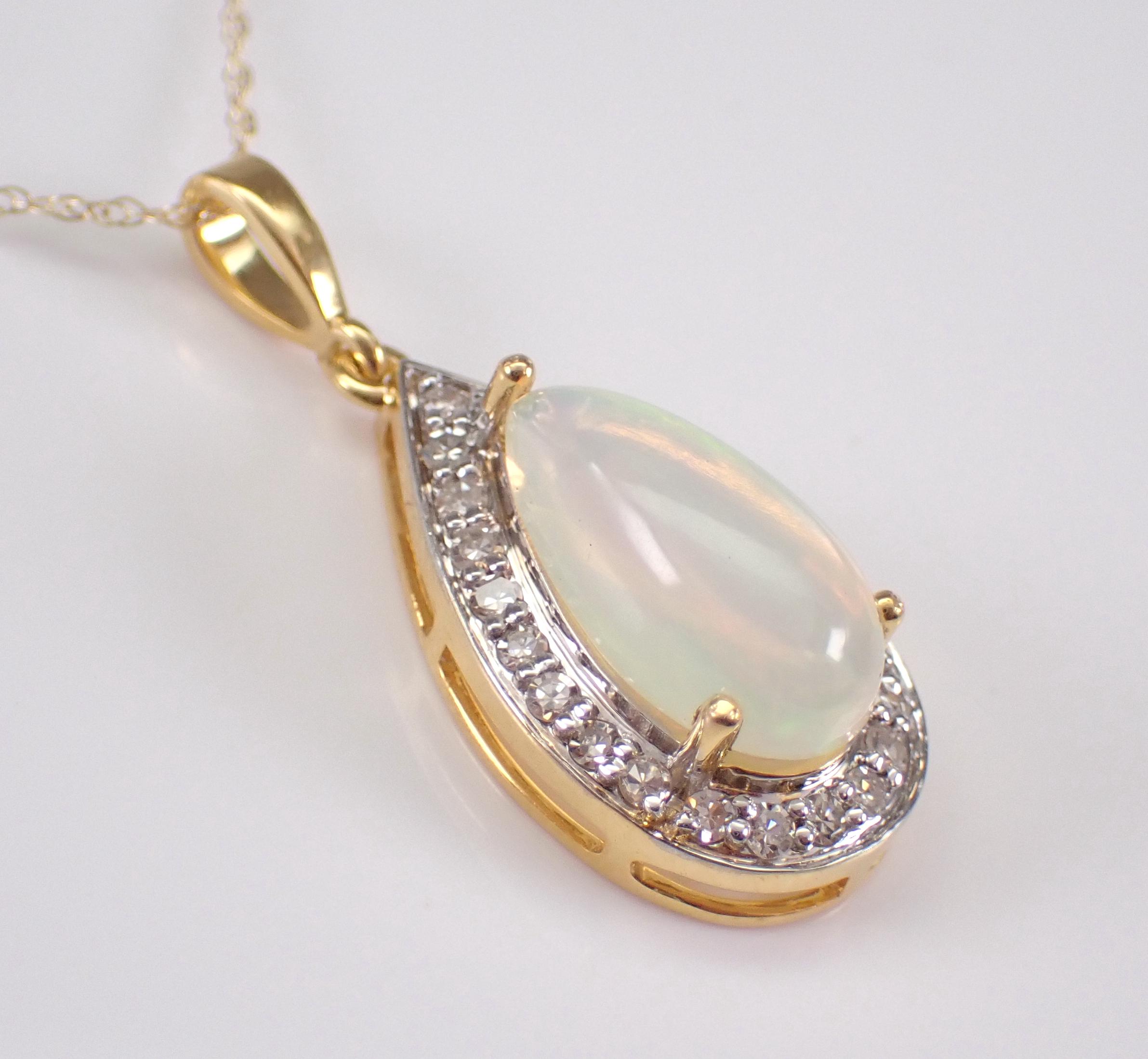 Yellow Gold Diamond and Opal Pendant Necklace. The Necklace is set with one Pear shaped Opal Cabochon in the center. This Opal measures 12 X 6.5 mm and weighs 1 1/4 carat. There are twenty-three Round Brilliant Diamonds set in this pendant. These diamonds are H color, SI clarity and weigh a total of .25 carat. The pendant is 10K Yellow Gold and comes with an 18" 10K Yellow Gold chain and together weigh 1.9 grams. The pendant measures 18 X 10.5 mm. This necklace will be accompanied by an appraisal with the retail replacement value of $1,485.00. I will ship this necklace promptly in a gift box.