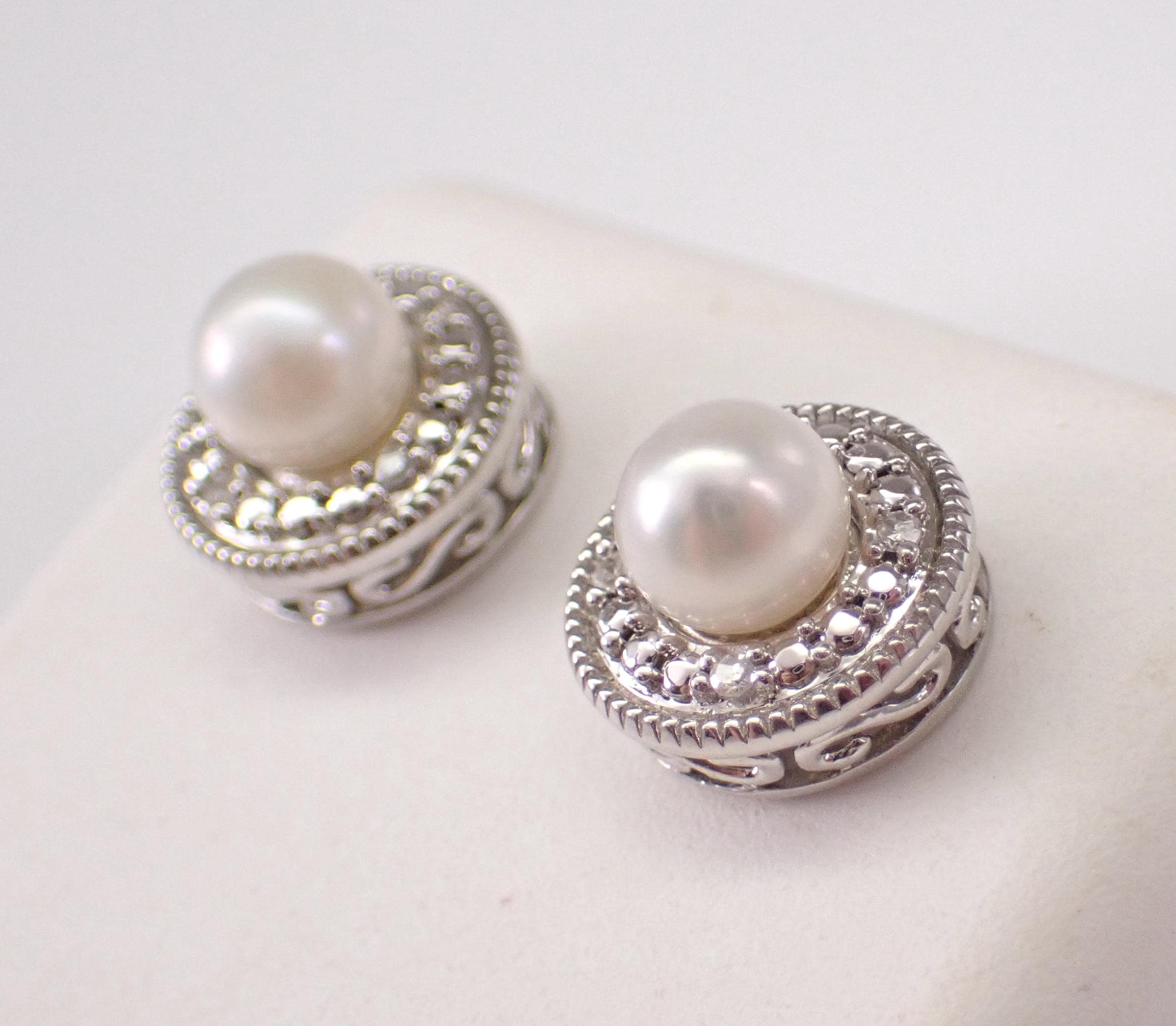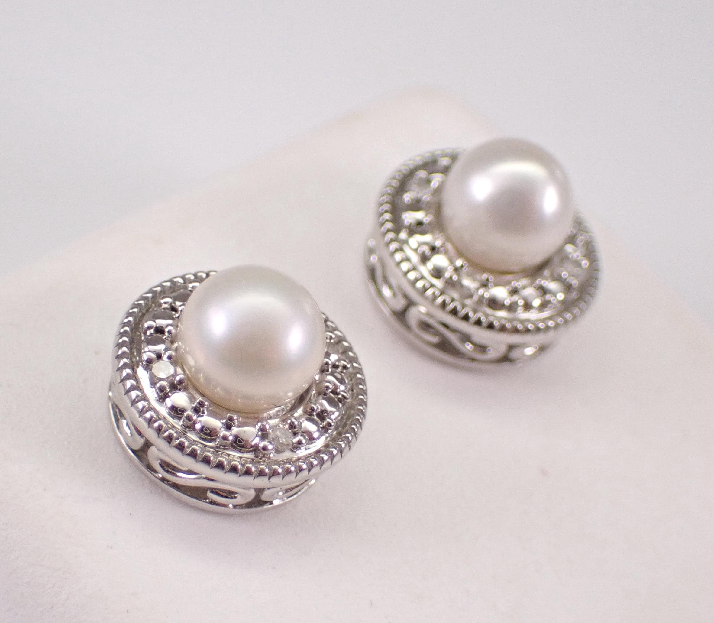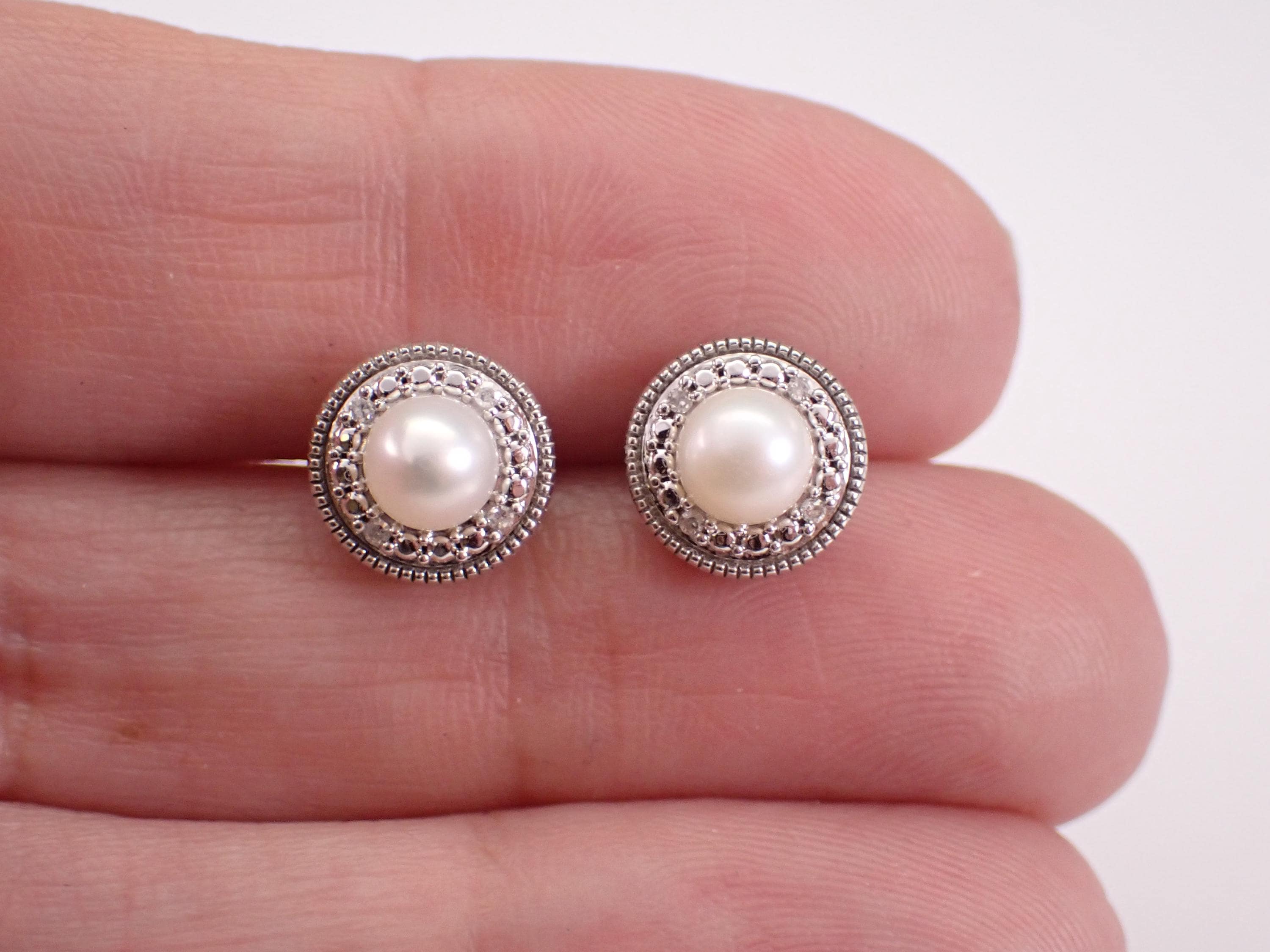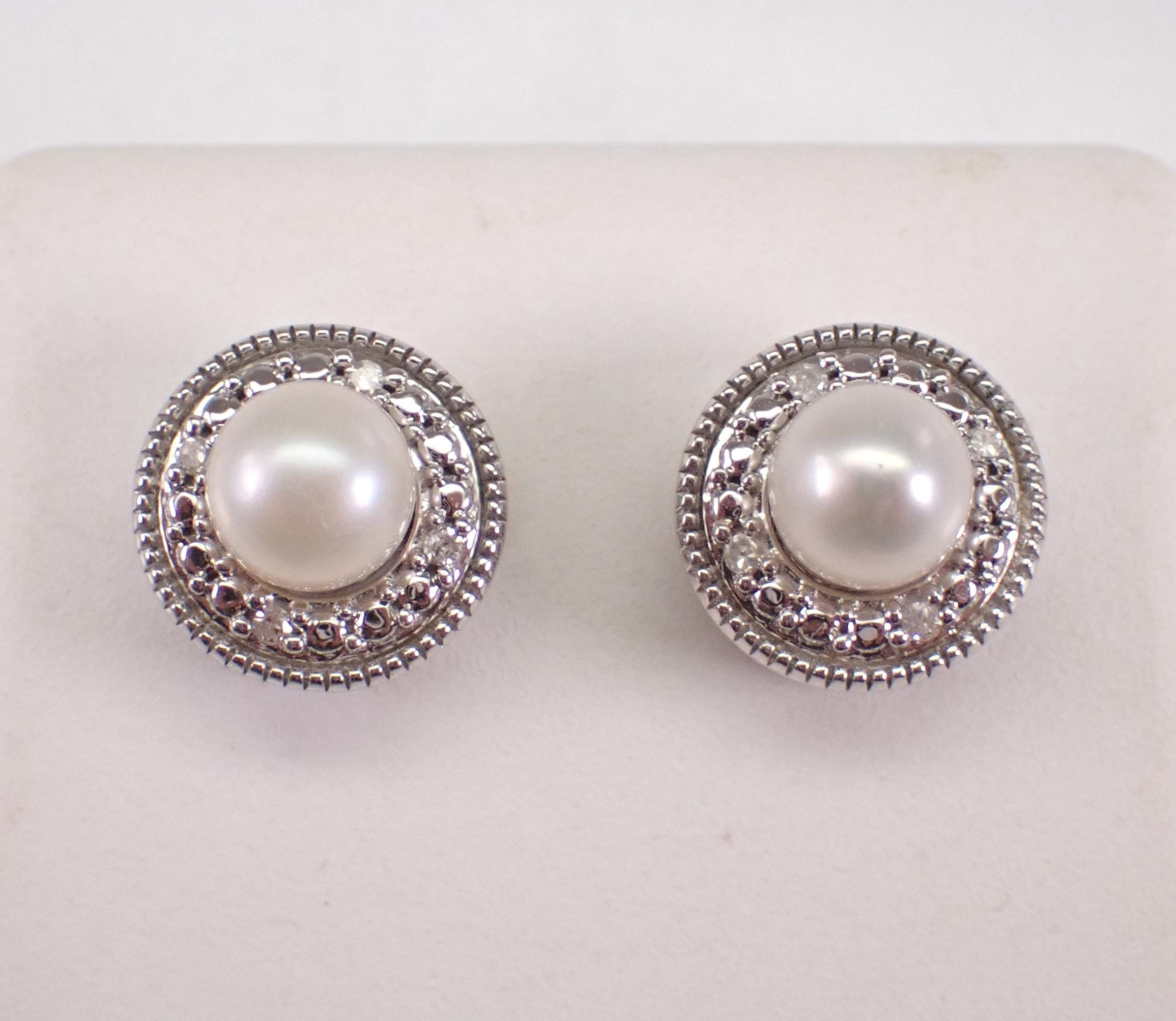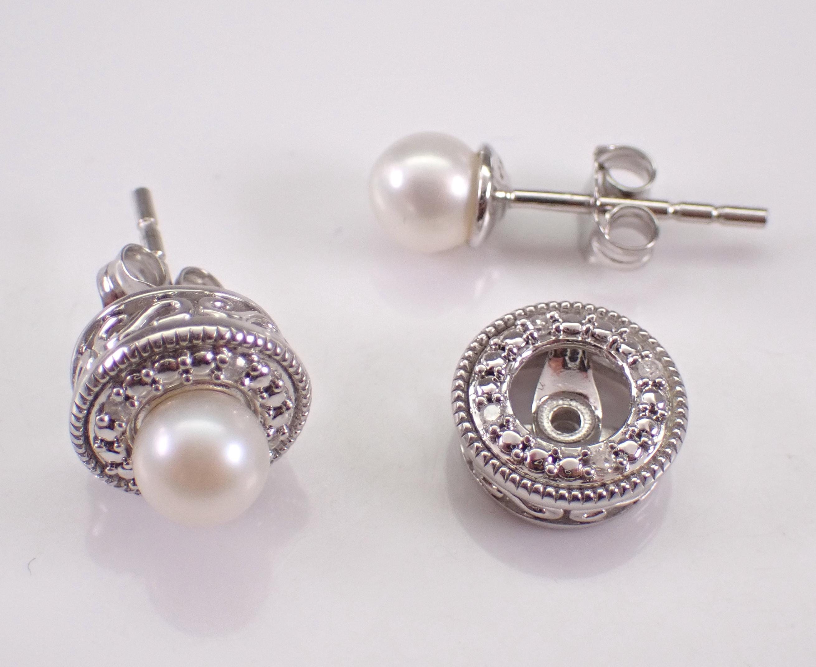White Gold Pearl Stud Earrings and Diamond Halo Jackets. These earrings are set with a genuine white Pearl set the center. These Pearls measure 5 mm in diameter each. There are four natural Round Diamonds set in EACH of the Jackets of these earrings. These diamonds are H color, I clarity and weigh a total of .06 carat. These earrings are 10K White Gold, weigh a total of 2.6 grams (with Jackets) and measure 9 mm in diameter each. These earrings are for pierced ears and the earrings have friction post backings. These earrings will be accompanied by an appraisal written by a GIA Certified Diamond Grader with the retail replacement value of $1,095.00. I will ship these earrings promptly in a gift box.