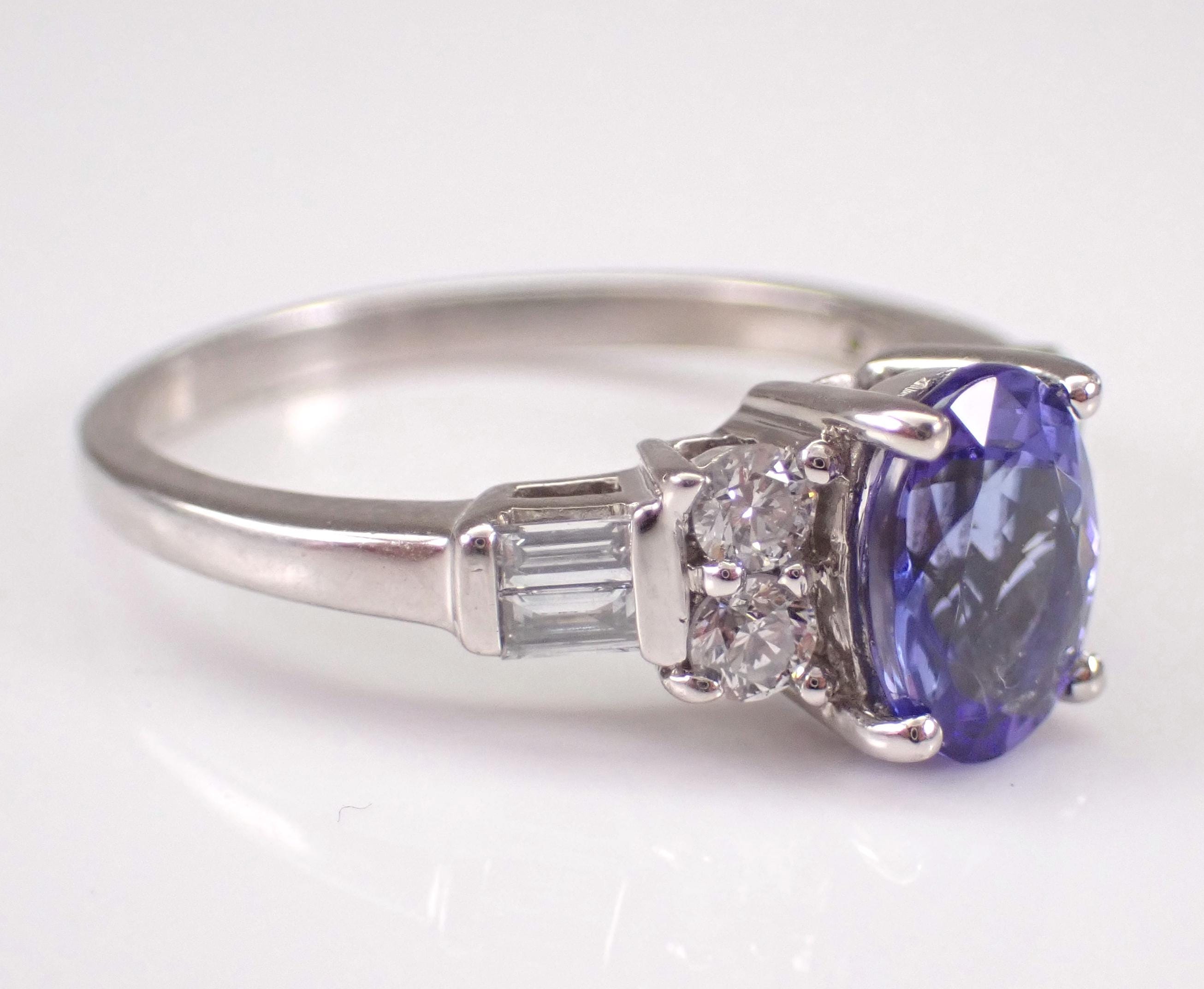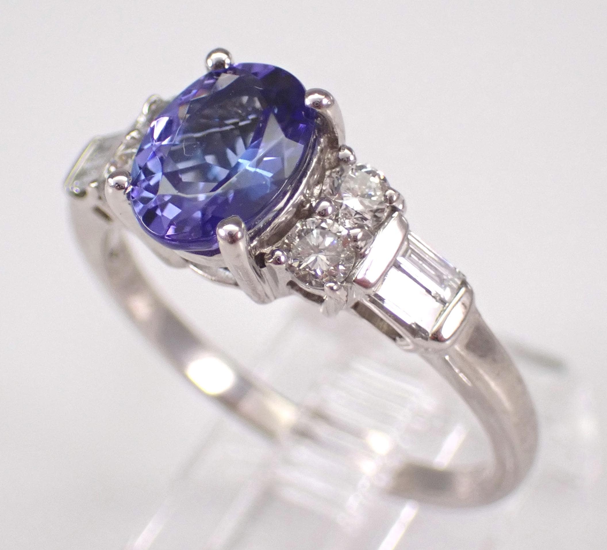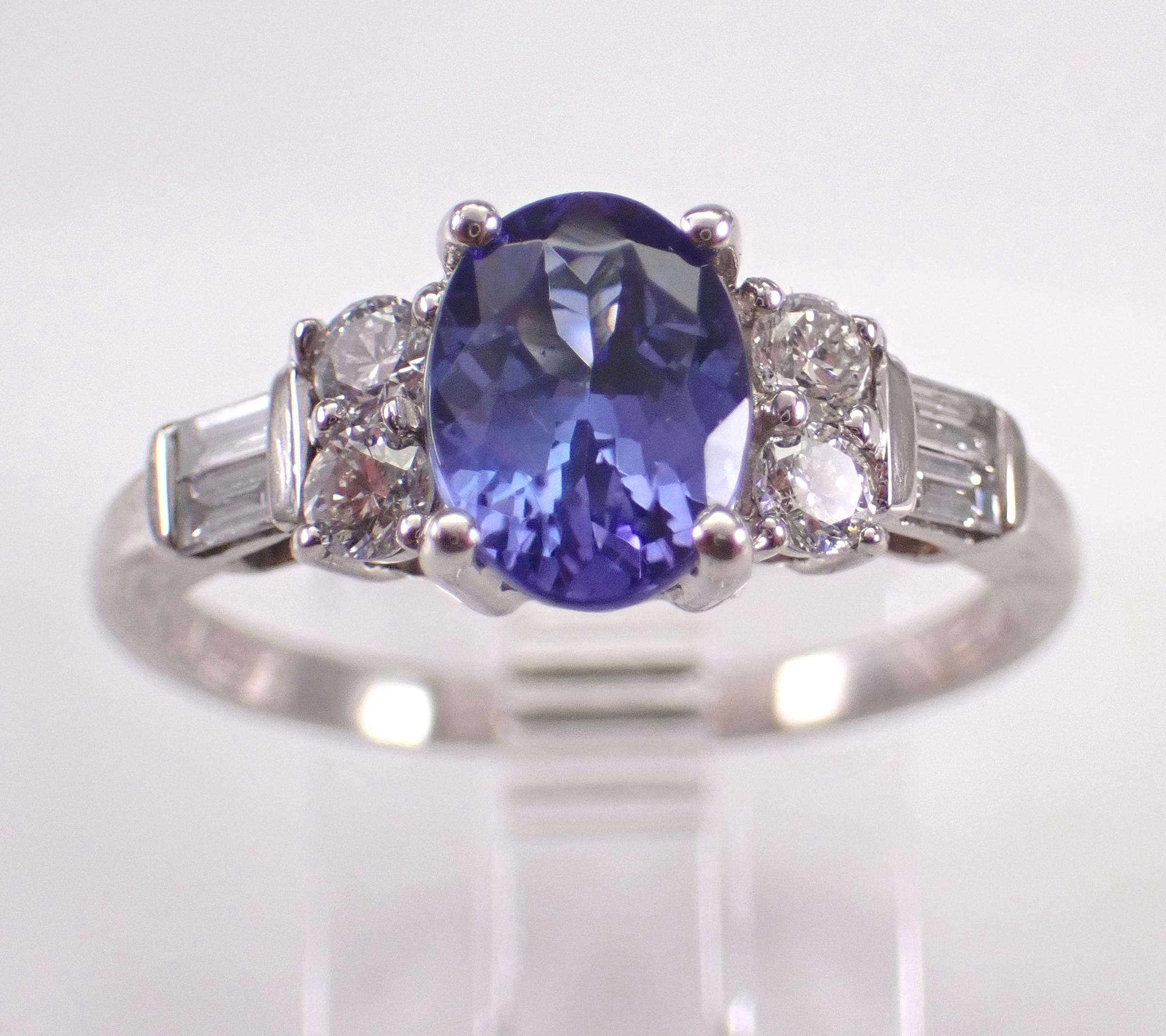 Platinum Diamond and Tanzanite Engagement Ring. This ring is set with one genuine Oval Tanzanite in the center. This Tanzanite measures 8 X 6 mm and weighs 1 carat. There are four natural Baguette Diamonds and four genuine Round Brilliant Diamonds set in this ring. These diamonds are G color, SI1 clarity and weigh a total of .43 carat. This ring is Solid Platinum (stamped PT950), weighs 4.6 grams and is a finger size 7, which can be resized free of charge (please inquire about sizing with the finger size you need). This ring will also be accompanied by an appraisal by a GIA Certified Diamond Grader with the replacement value of $4,695.00. I will ship this ring promptly in a beautiful gift box.
