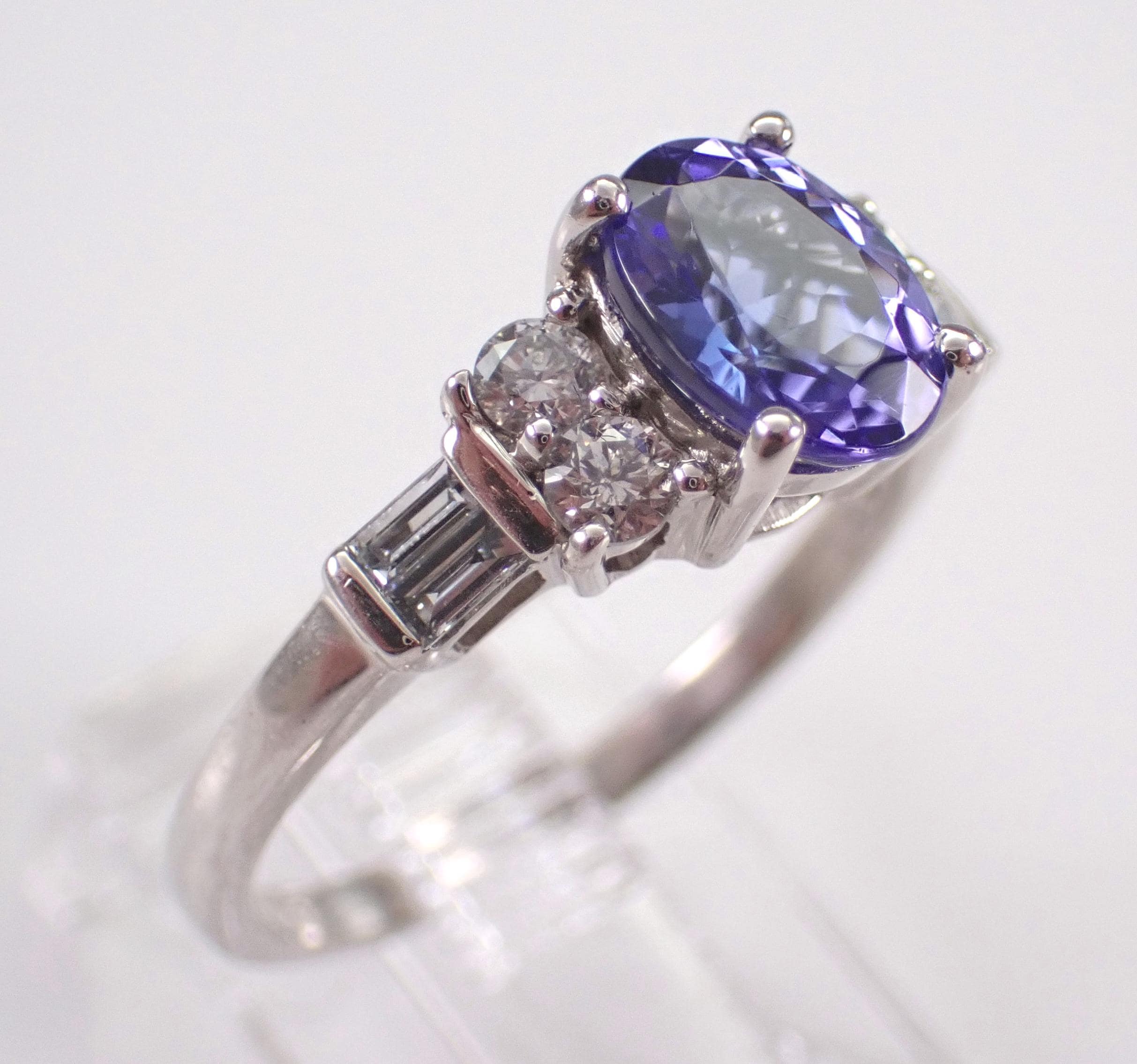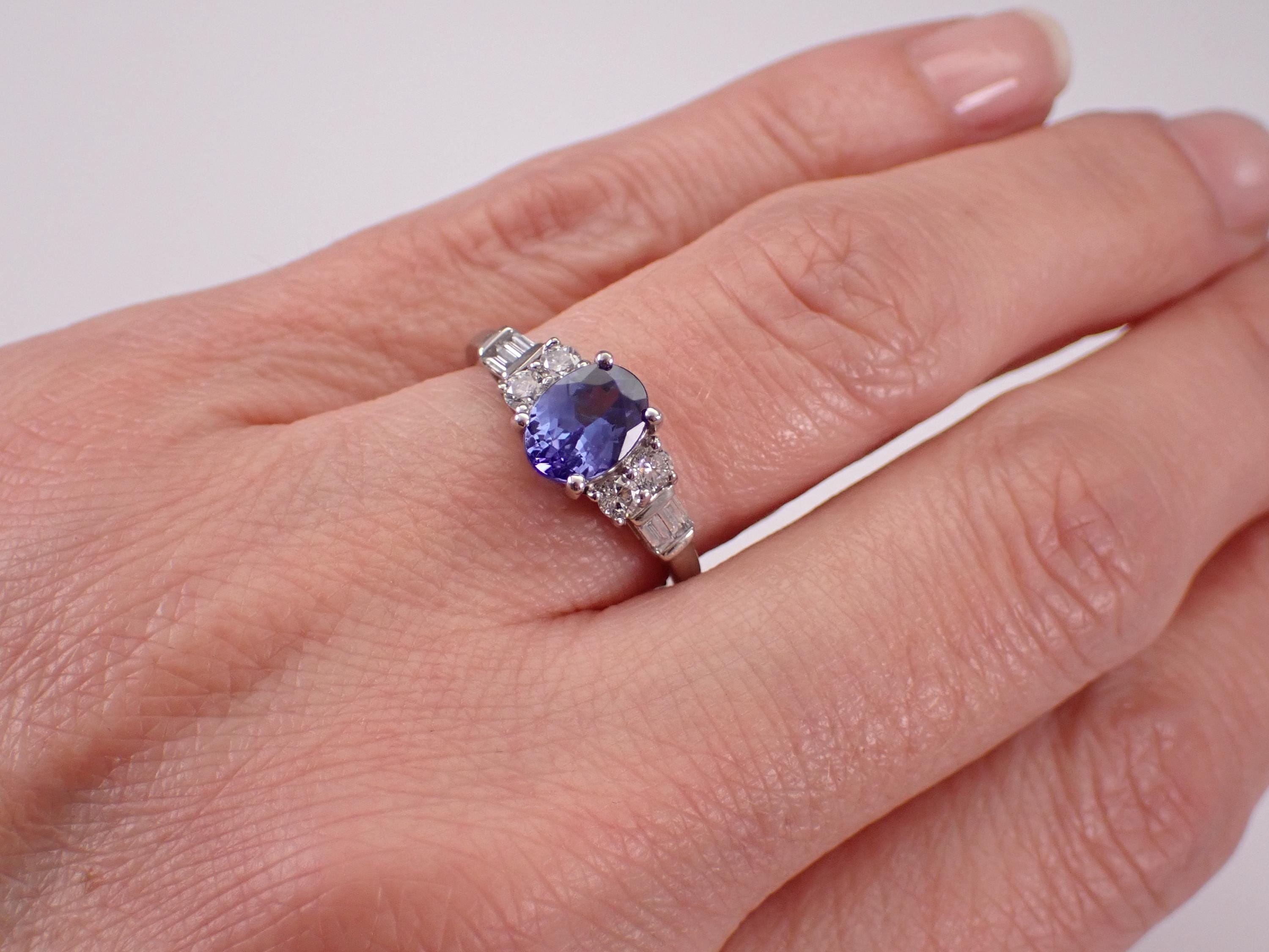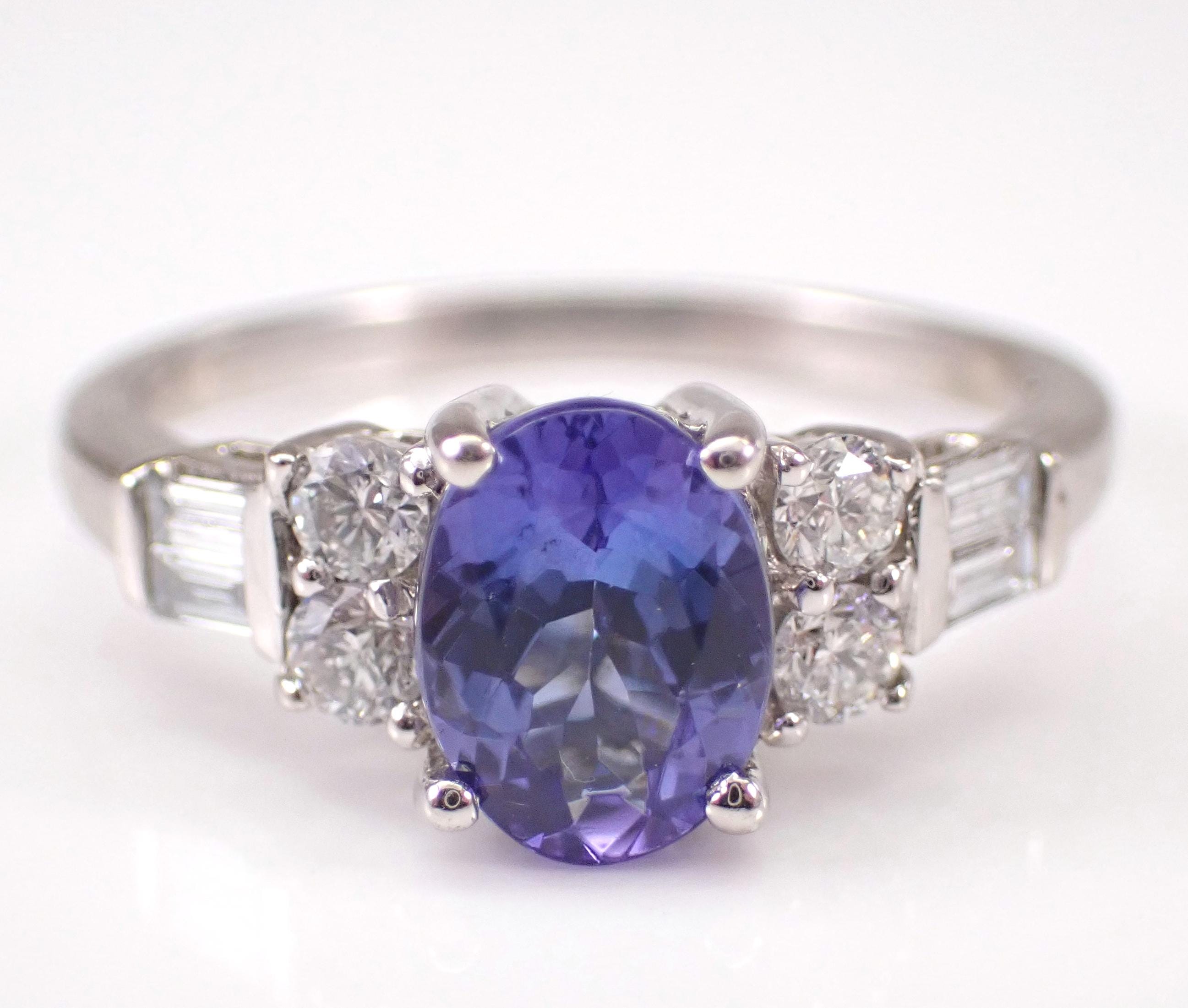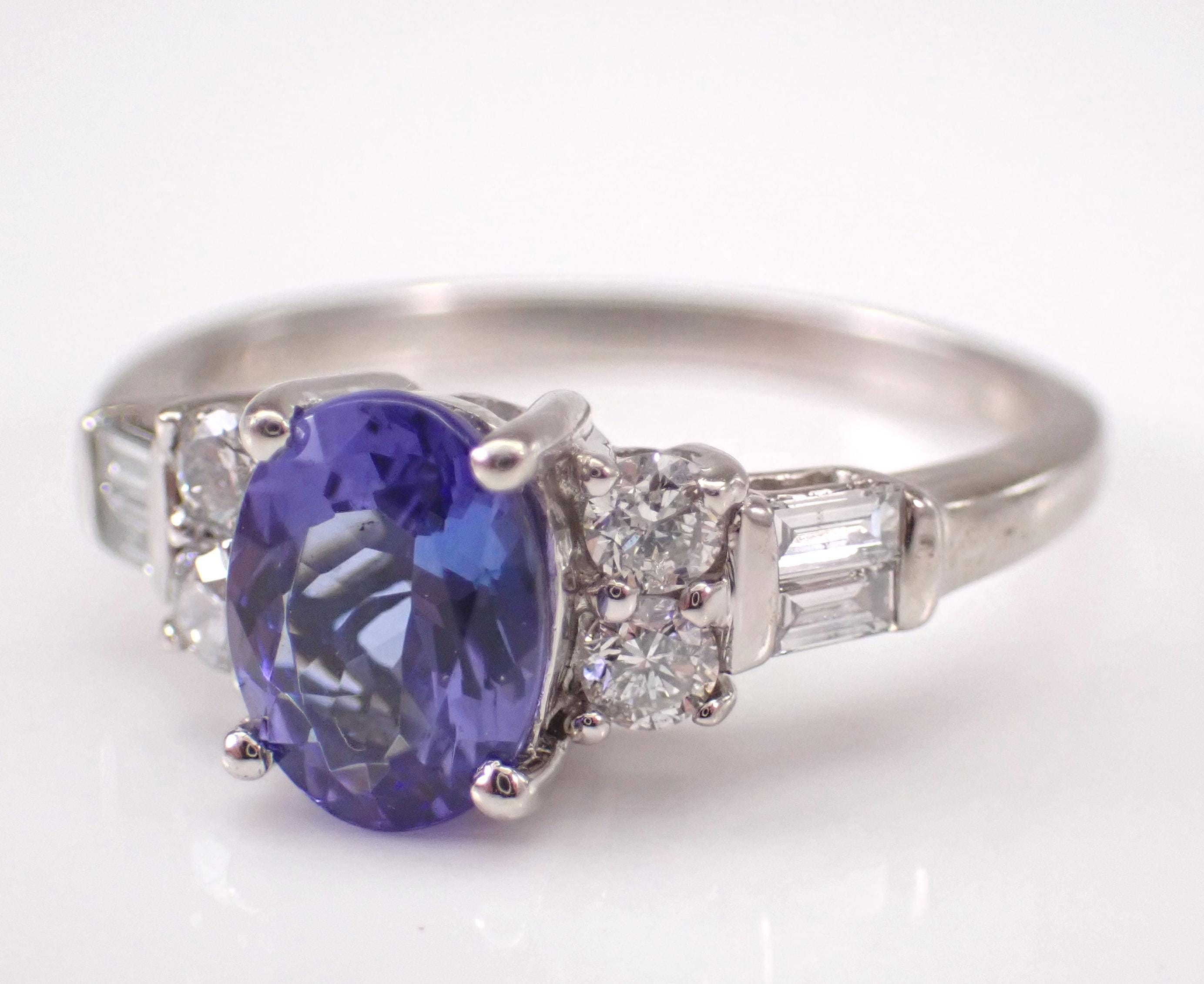 Platinum Diamond and Tanzanite Engagement Ring. This ring is set with one genuine Oval Tanzanite in the center. This Tanzanite measures 8 X 6 mm and weighs 1 carat. There are four natural Baguette Diamonds and four genuine Round Brilliant Diamonds set in this ring. These diamonds are G color, SI1 clarity and weigh a total of .43 carat. This ring is Solid Platinum (stamped PT950), weighs 4.6 grams and is a finger size 7, which can be resized free of charge (please inquire about sizing with the finger size you need). This ring will also be accompanied by an appraisal by a GIA Certified Diamond Grader with the replacement value of $4,695.00. I will ship this ring promptly in a beautiful gift box.