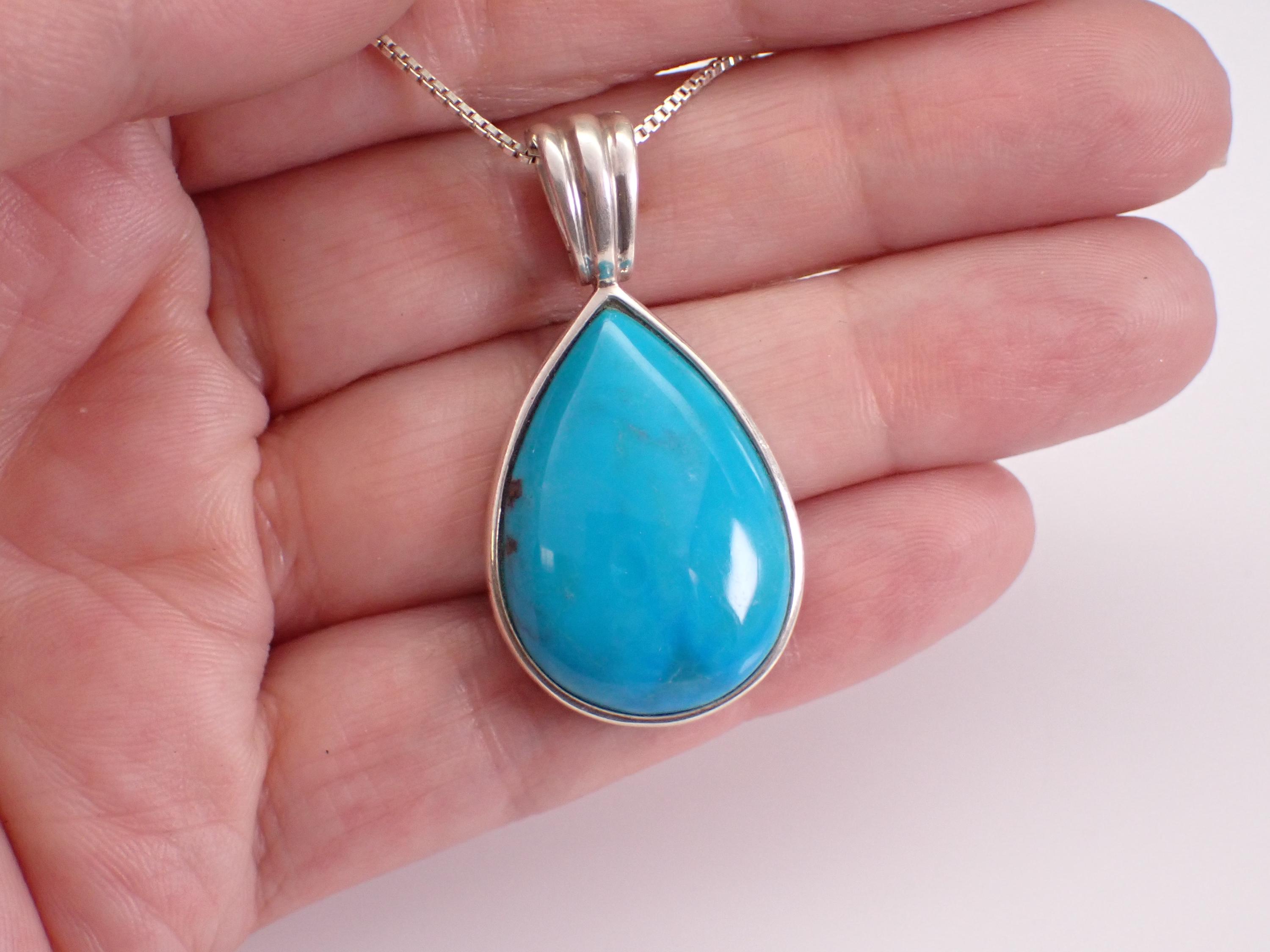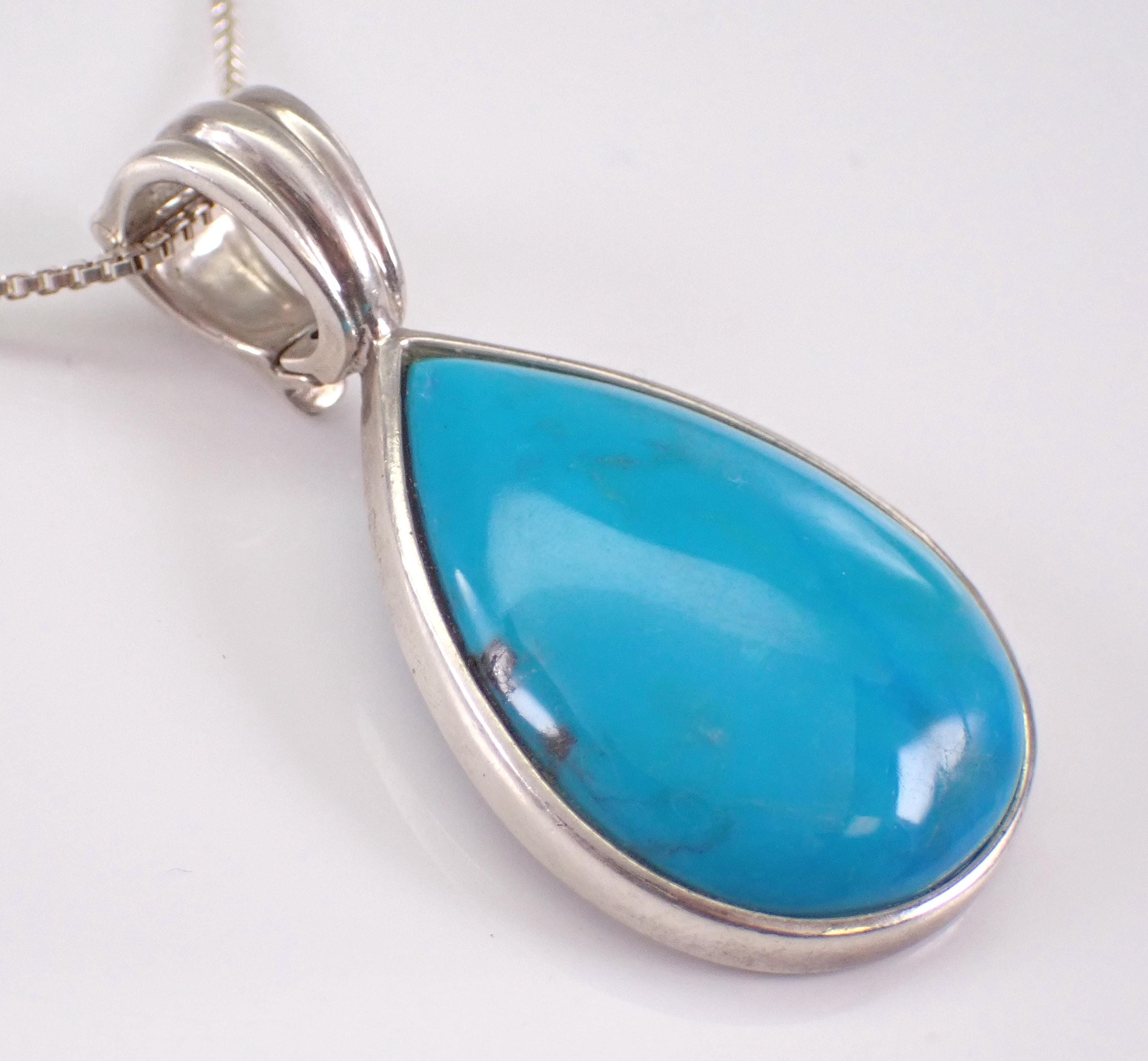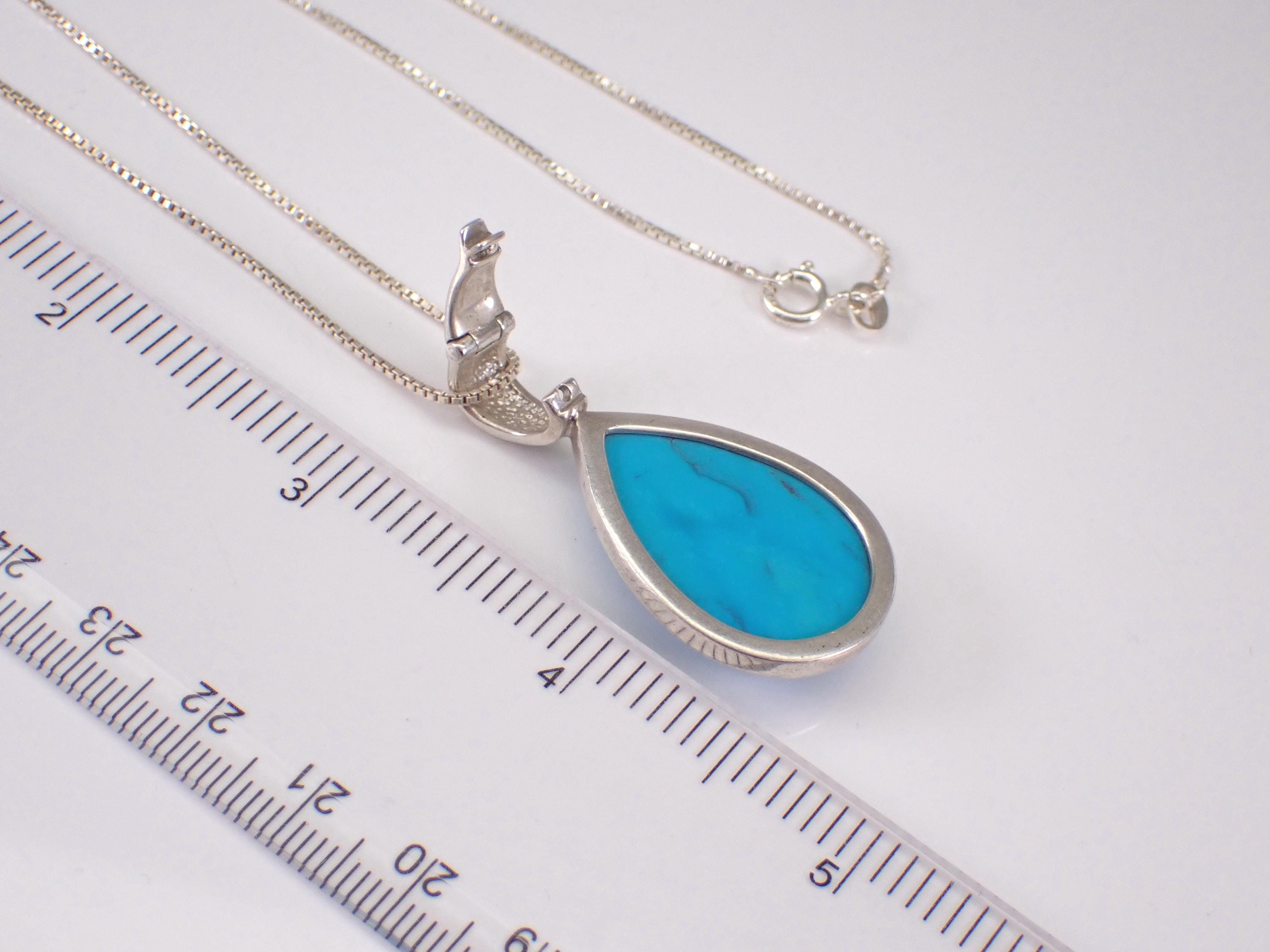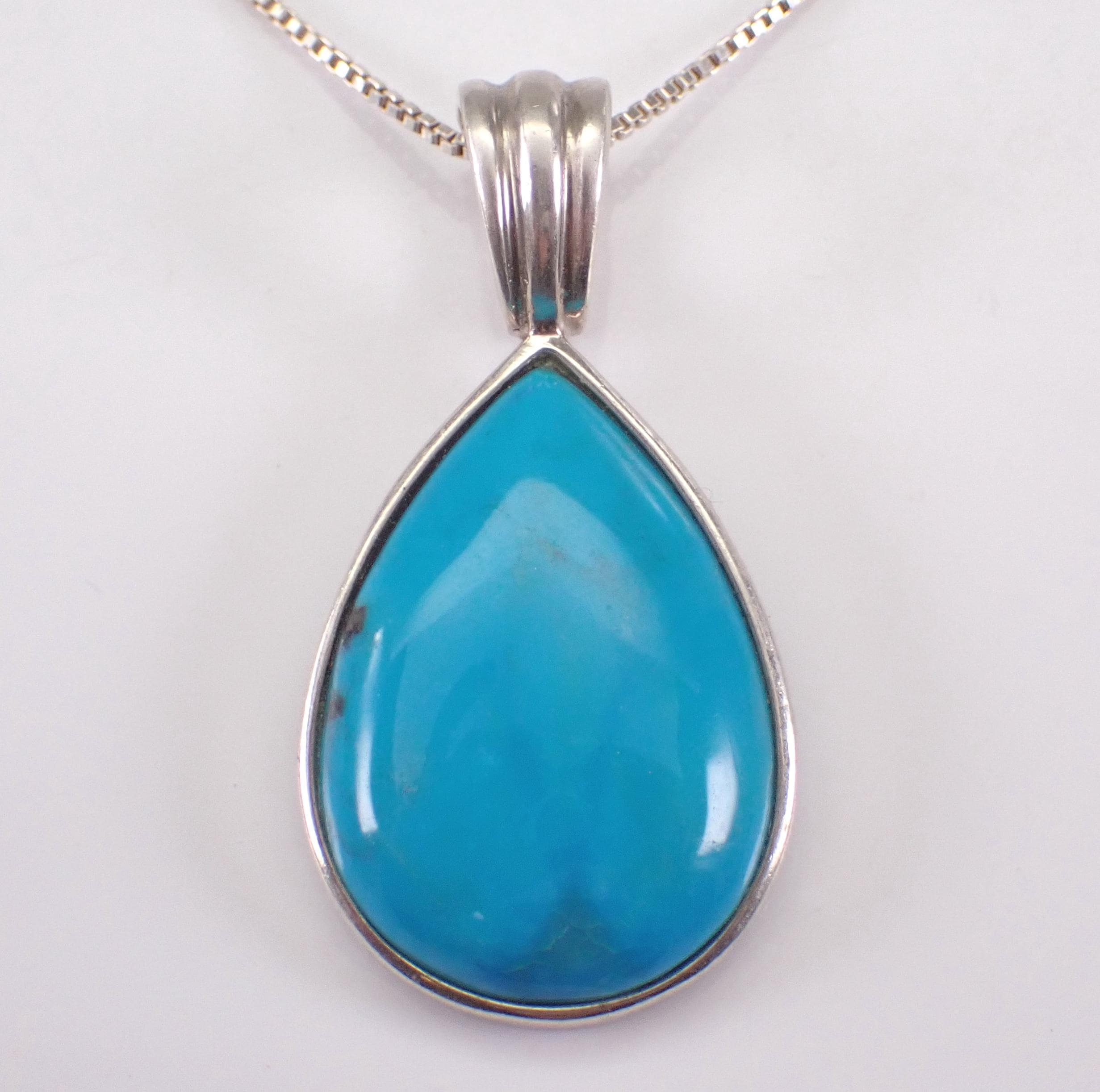 A unique vintage sterling silver Turquoise Teardrop Enhancer Charm necklace. This vintage silver necklace is in excellent condition. This charm is set with a pear shaped Turquoise gemstone measuring 28 X 19 mm.
