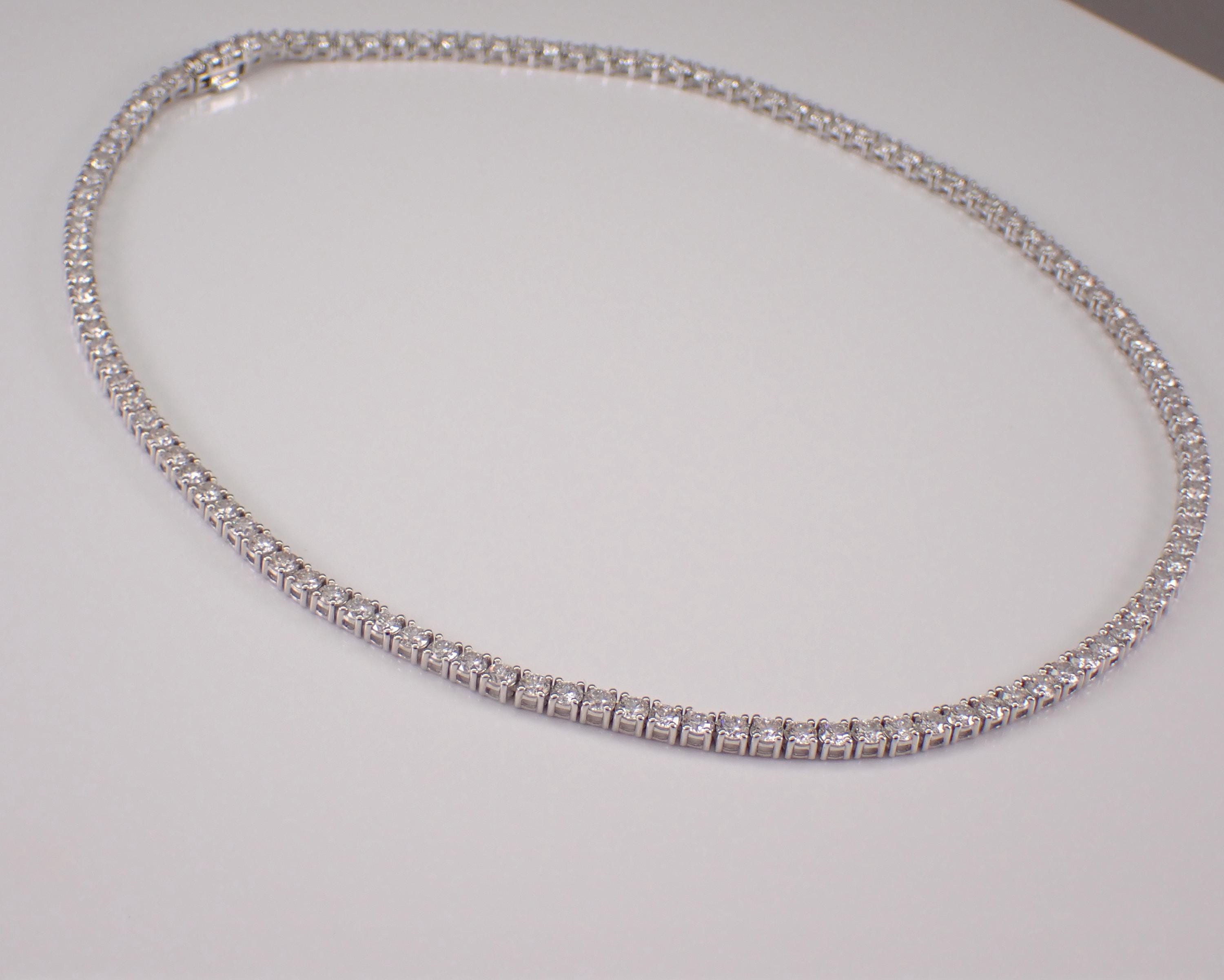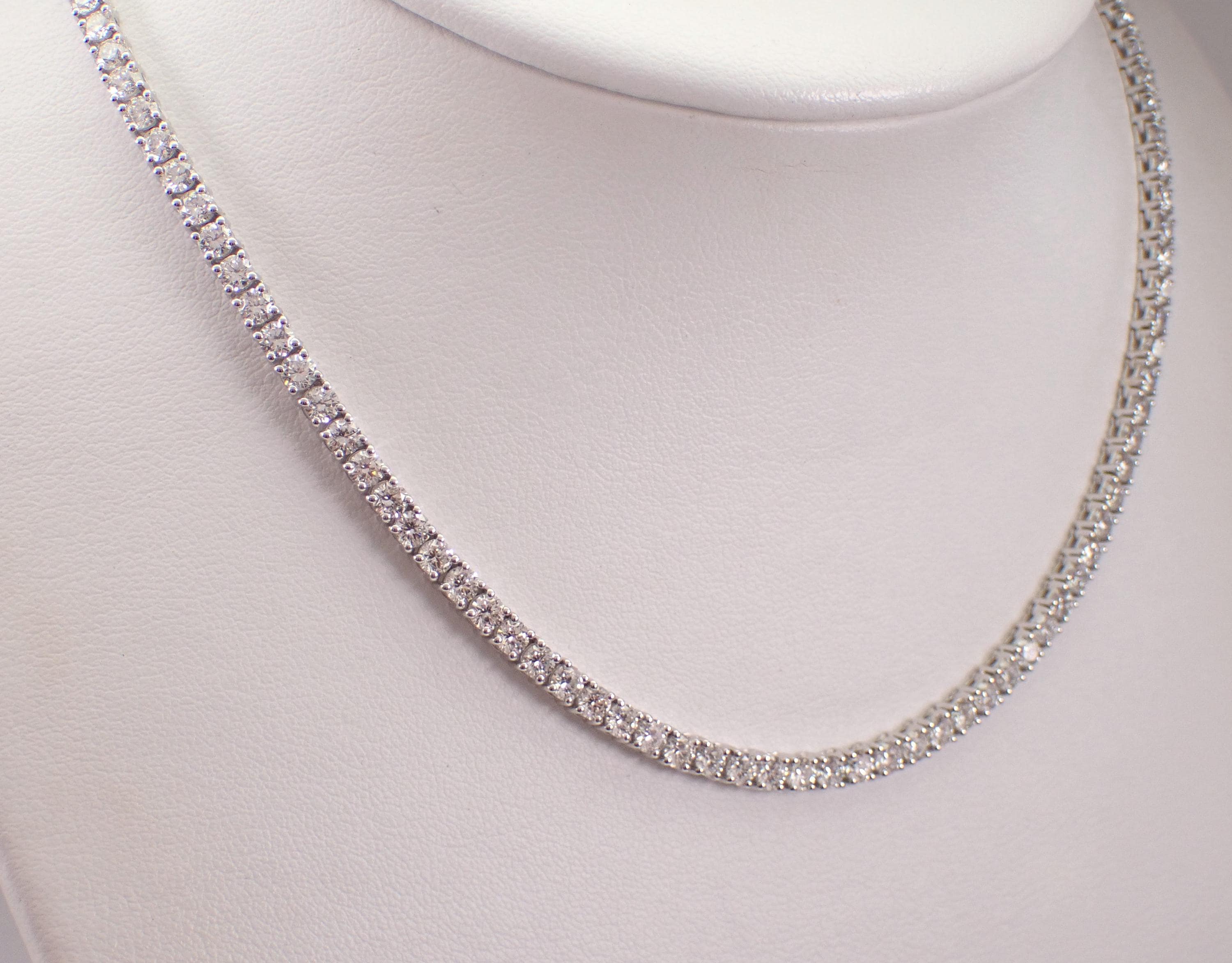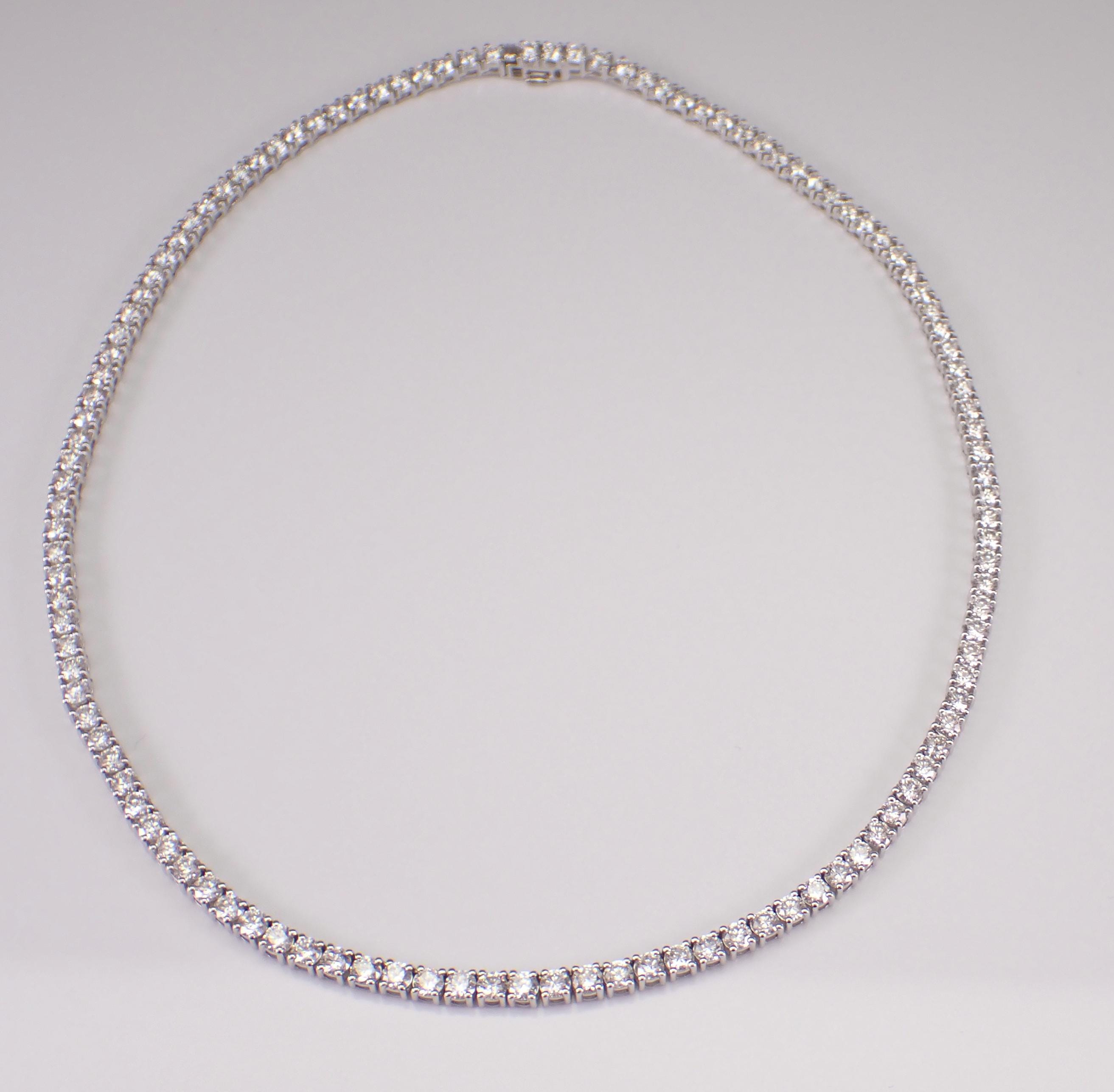 14K White Gold Diamond Tennis Necklace. This necklace is set with Lab Grown Round Brilliant Diamonds. These diamonds are F color, VS1 clarity and weigh a total of 15.21 carats. This necklace is 14KT White Gold and measures 16" in length. This necklace weighs 18.2 grams and will be accompanied by an appraisal for insurance and authentication purposes. I will ship this necklace promptly in a beautiful gift box.