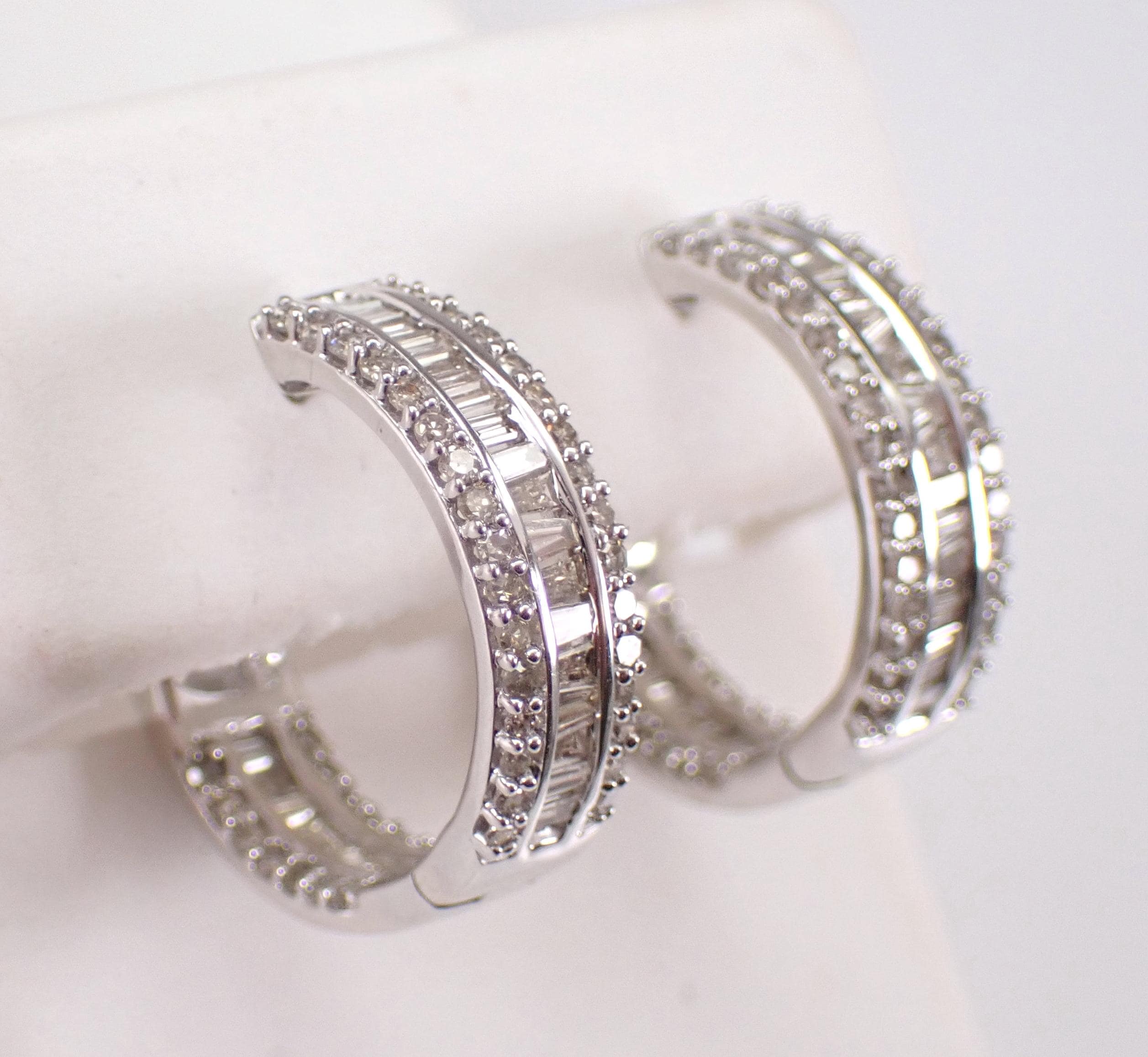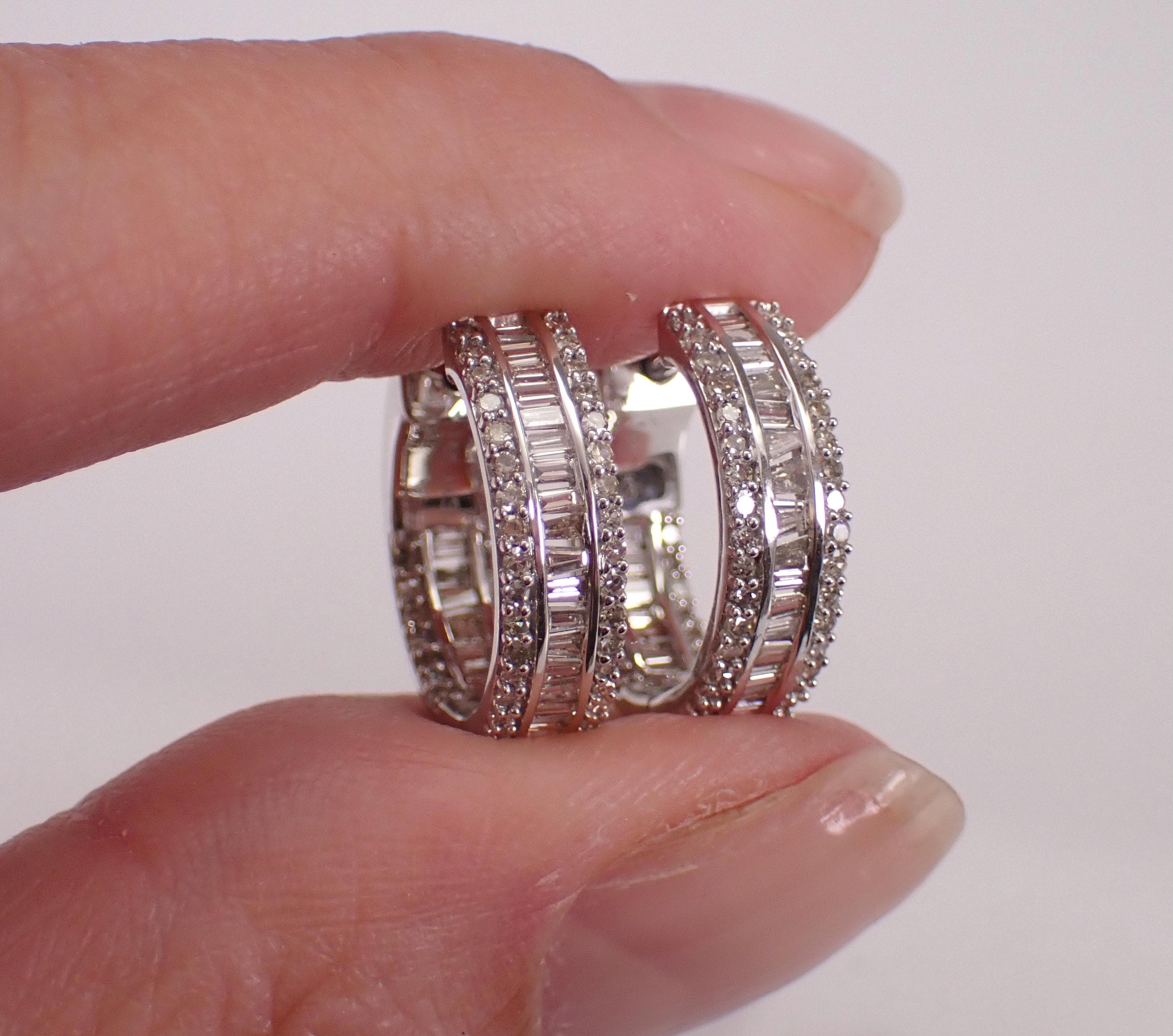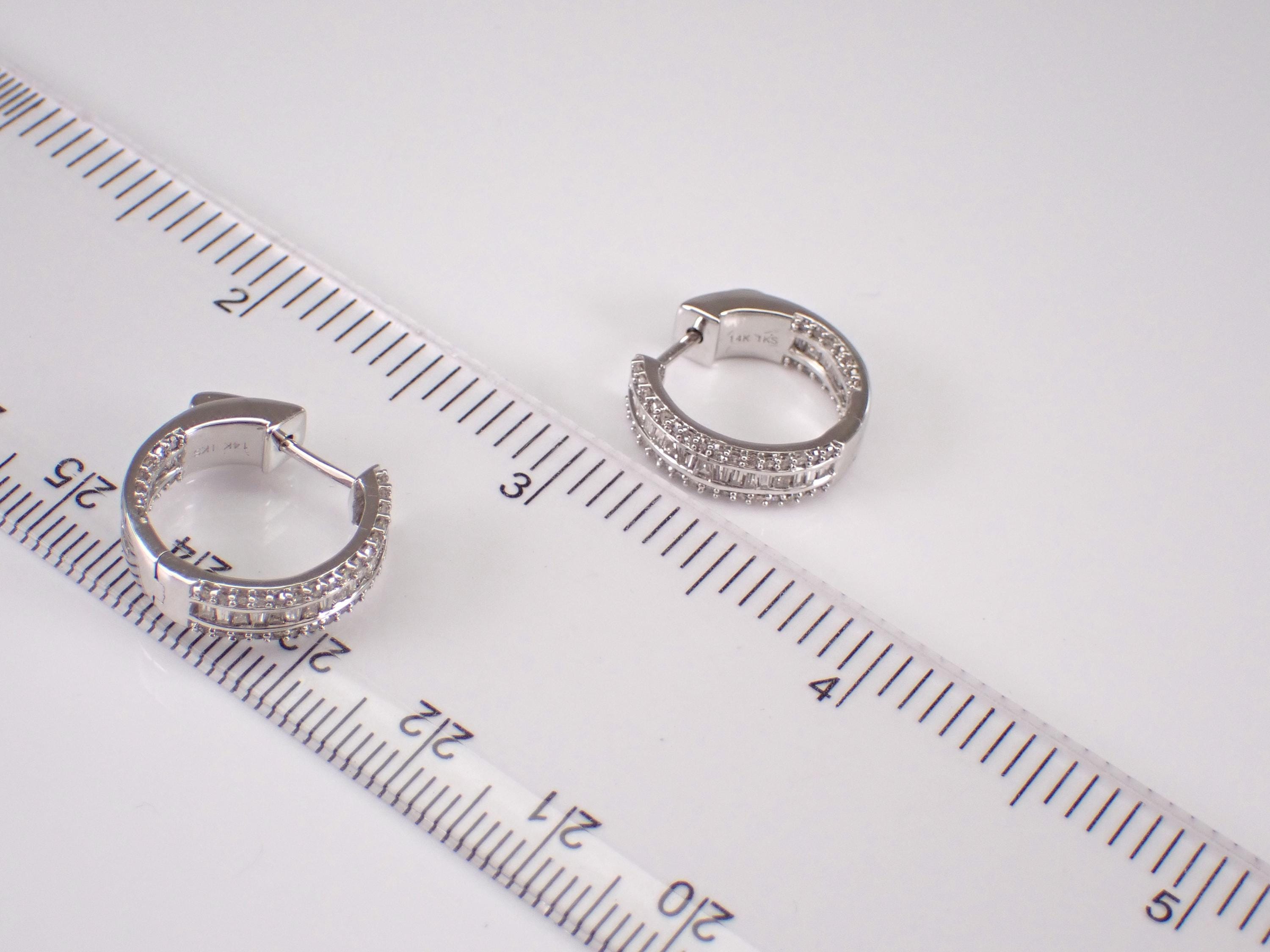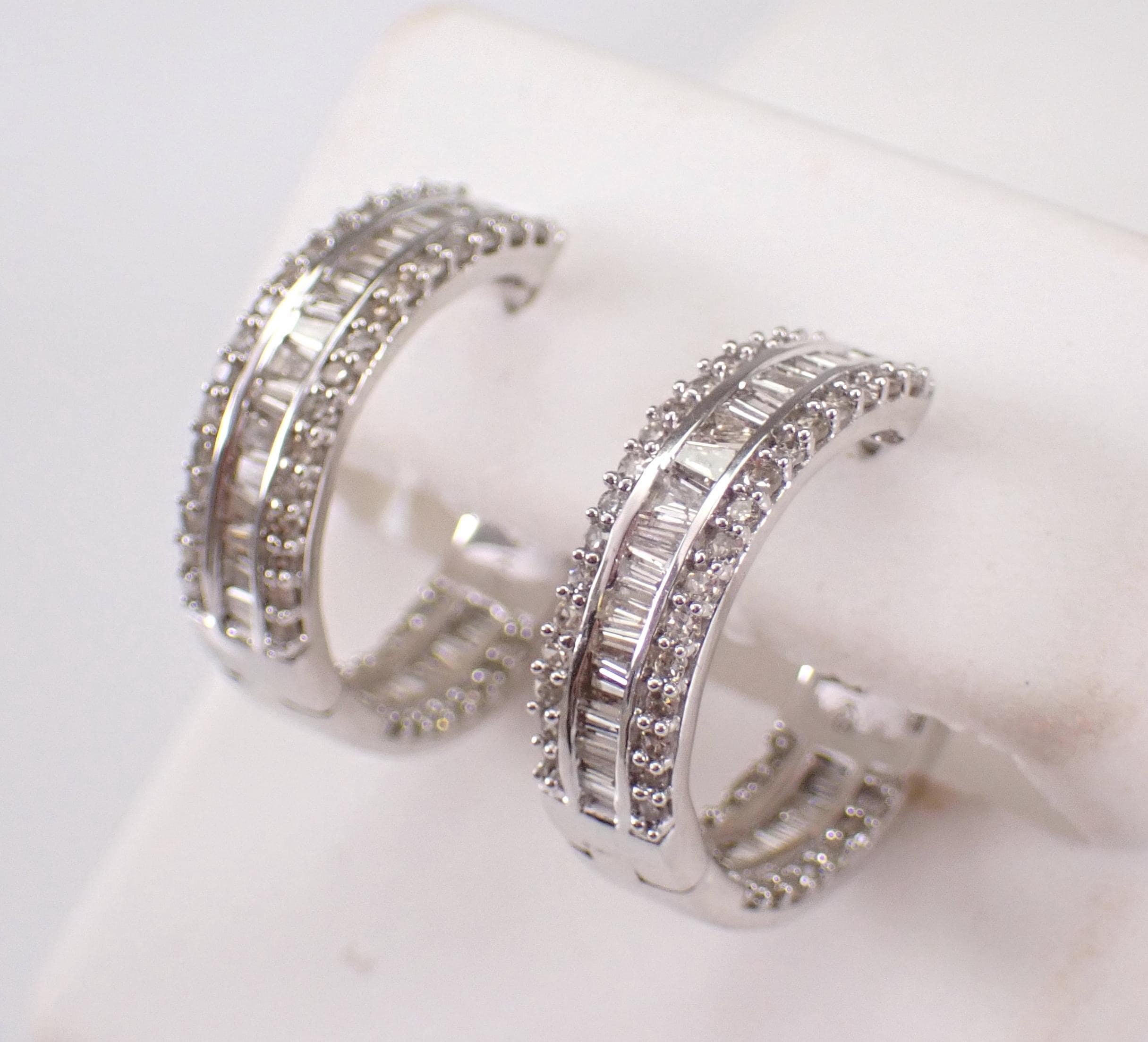 14K White Gold Diamond Hoop Earrings. These earrings are set with twenty-three genuine Baguette Diamonds and forty-four Round Brilliant Diamonds in EACH earring. These diamonds are H color, SI/I1 clarity and weigh a total of 1.00 carat. These earrings are 14K White Gold and weigh a total of 6.0 grams. These earrings are for pierced ears and measure 16.5 mm in diameter and 5 mm in width. These earrings will be accompanied by an appraisal written by a GIA Certified Diamond Grader with the retail replacement value of $3,495.00. I will ship these earrings promptly in a gift box.