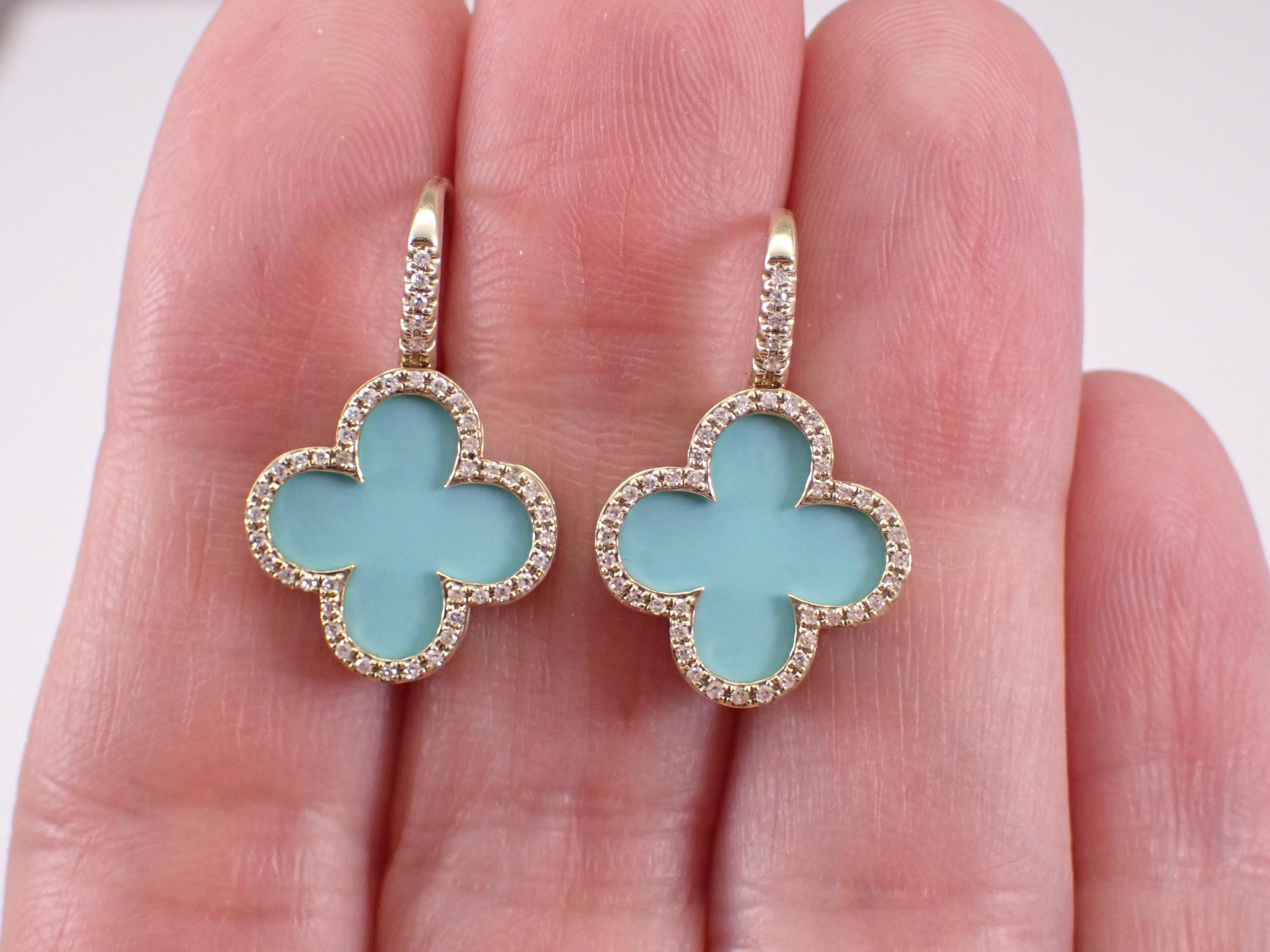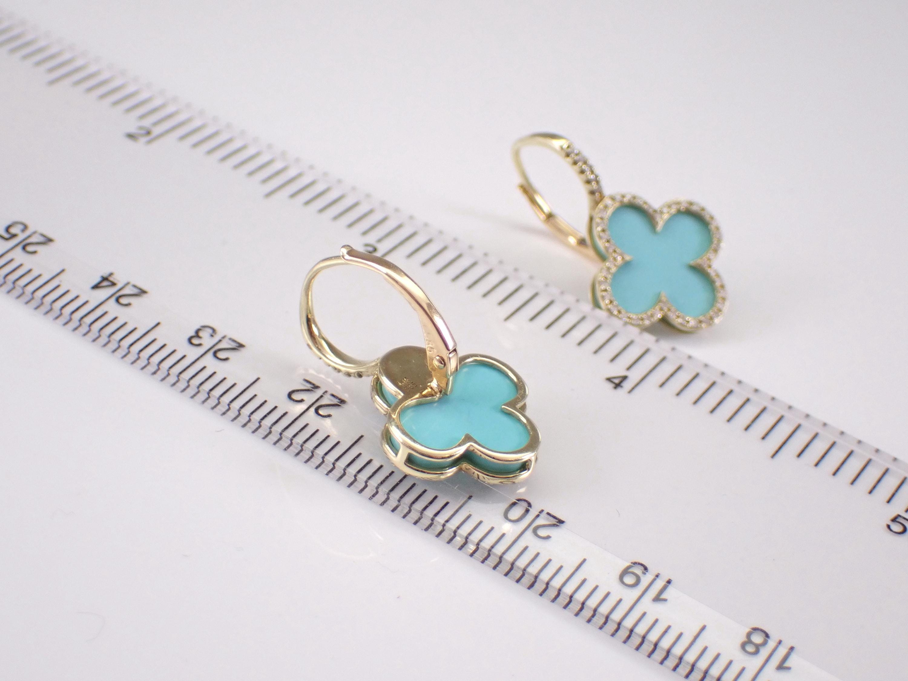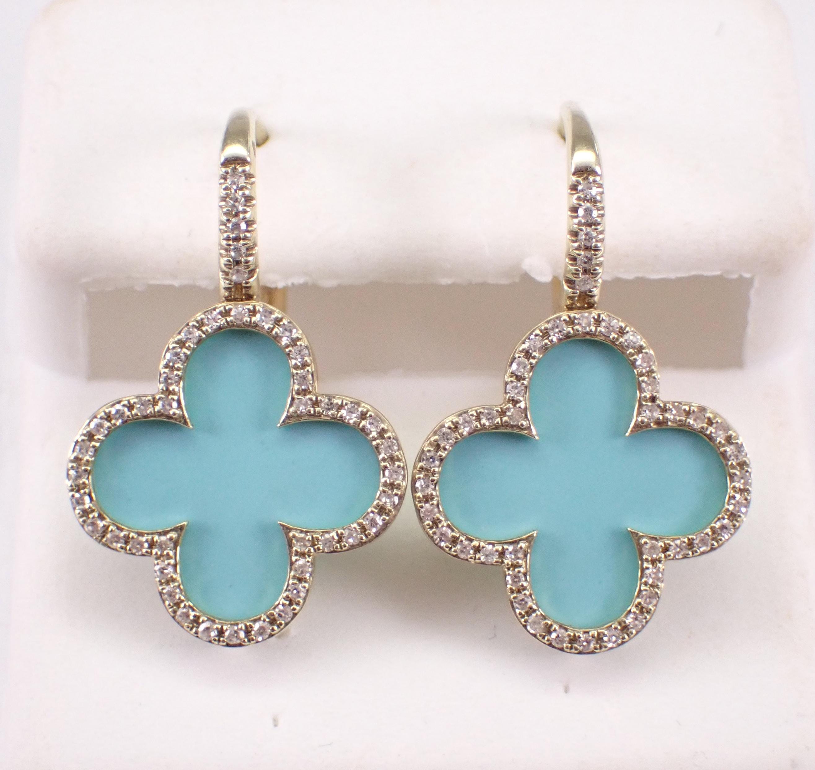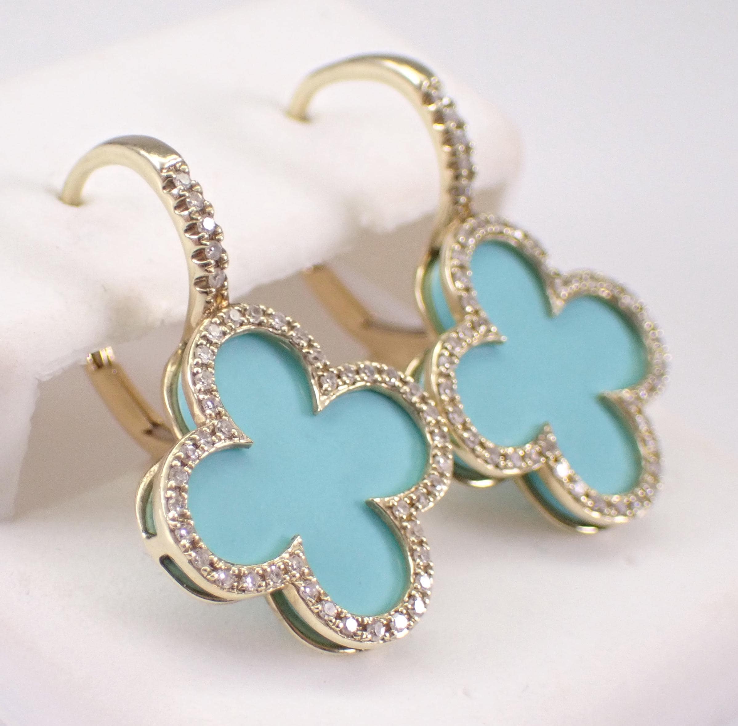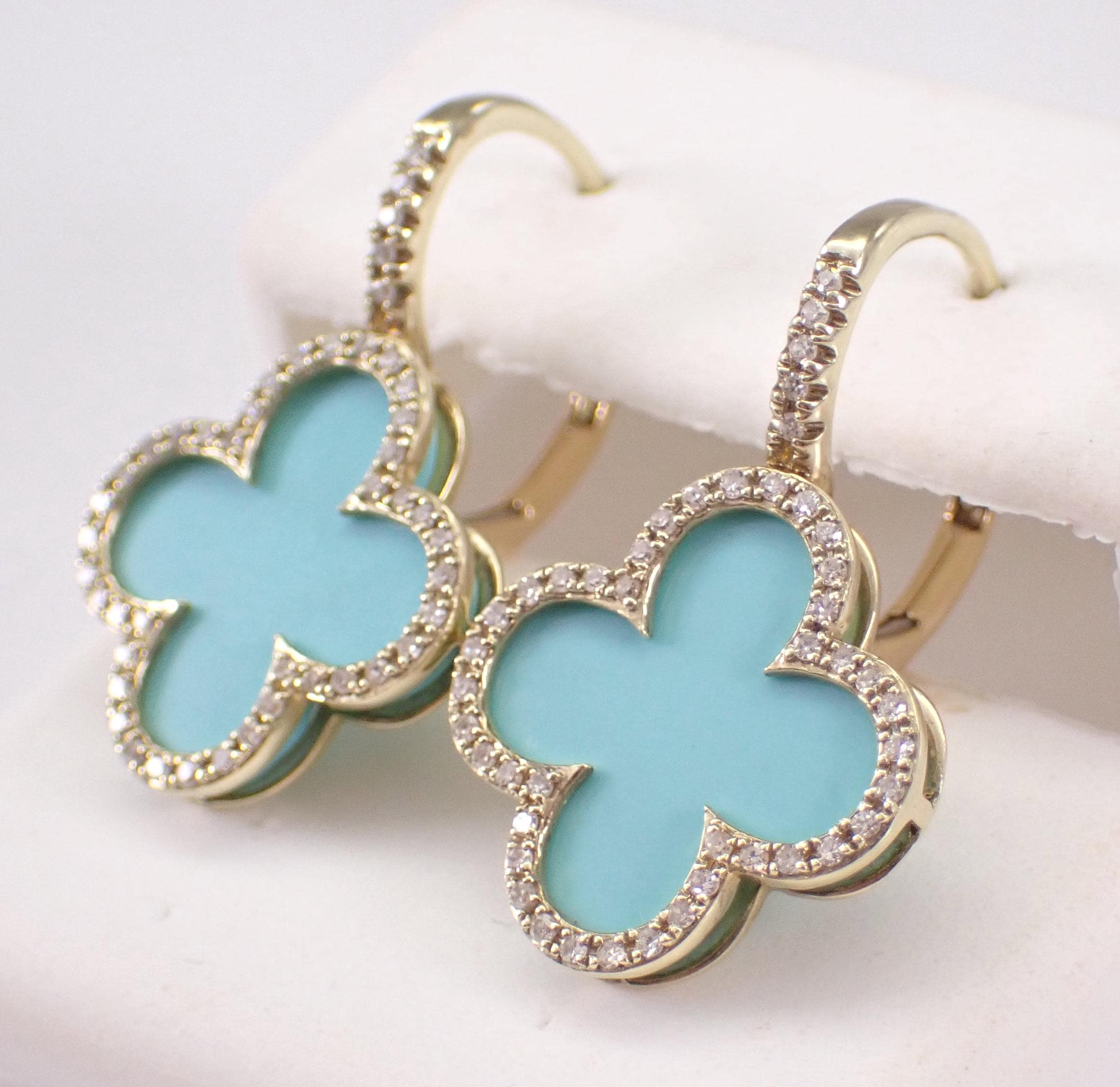 14K Yellow Gold Diamond and Turquoise Earrings. These earrings are set with one Clover shaped Turquoise in the center of each earring and forty-five genuine Round Brilliant Diamonds set in each earring. The Turquoise is a beautiful even teal color and measures 14 X 14 mm each. The diamonds in these earrings are G/H color, SI/I1 clarity and weigh a total of 1/2 carat. These earrings are 14KT Yellow Gold and weigh a total of 3.8 grams. These earrings are for pierced ears, measure 23 mm in length and have secure lever back clasps. These earrings will be accompanied by an appraisal written by a GIA Certified Diamond Grader with the retail replacement value of $3,895.00. I will ship these earrings promptly in a gift box.