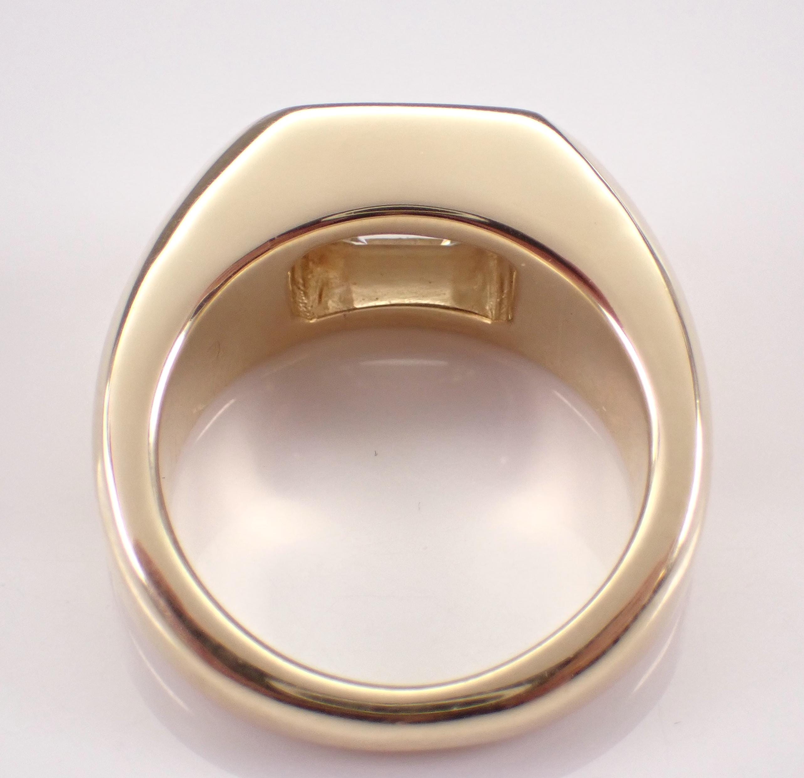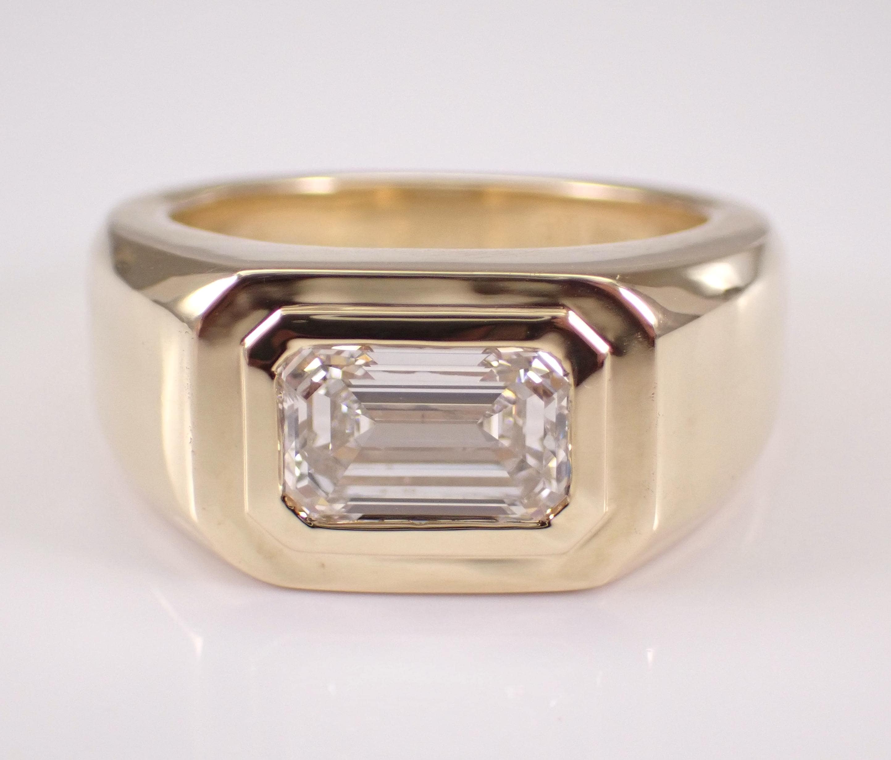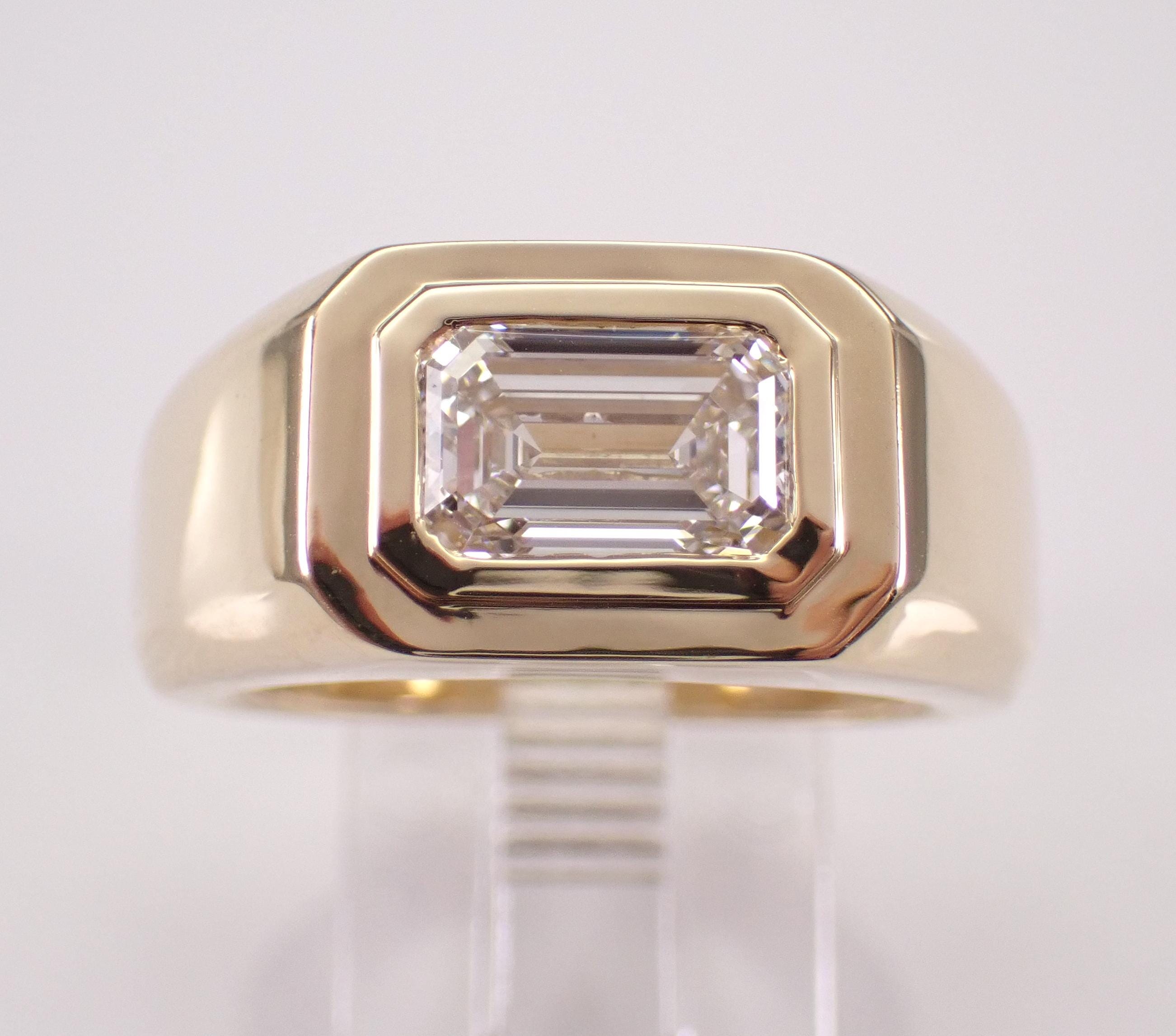 Mens 14K Yellow Gold Diamond Pinky Ring. This ring is set with one Lab Grown Emerald Cut Diamond. This Diamond is F color, VS1 clarity and weighs 2.05 carat. This ring is solid 14K Yellow Gold, weighs 16.7 grams and measures 10 mm in width at its widest point. This ring is a finger size 7 1/2, which can be resized free of charge (please inquire about sizing with the finger size that you need). This ring will be accompanied by an appraisal for insurance and authentication purposes. I will ship this ring promptly in a gift box.