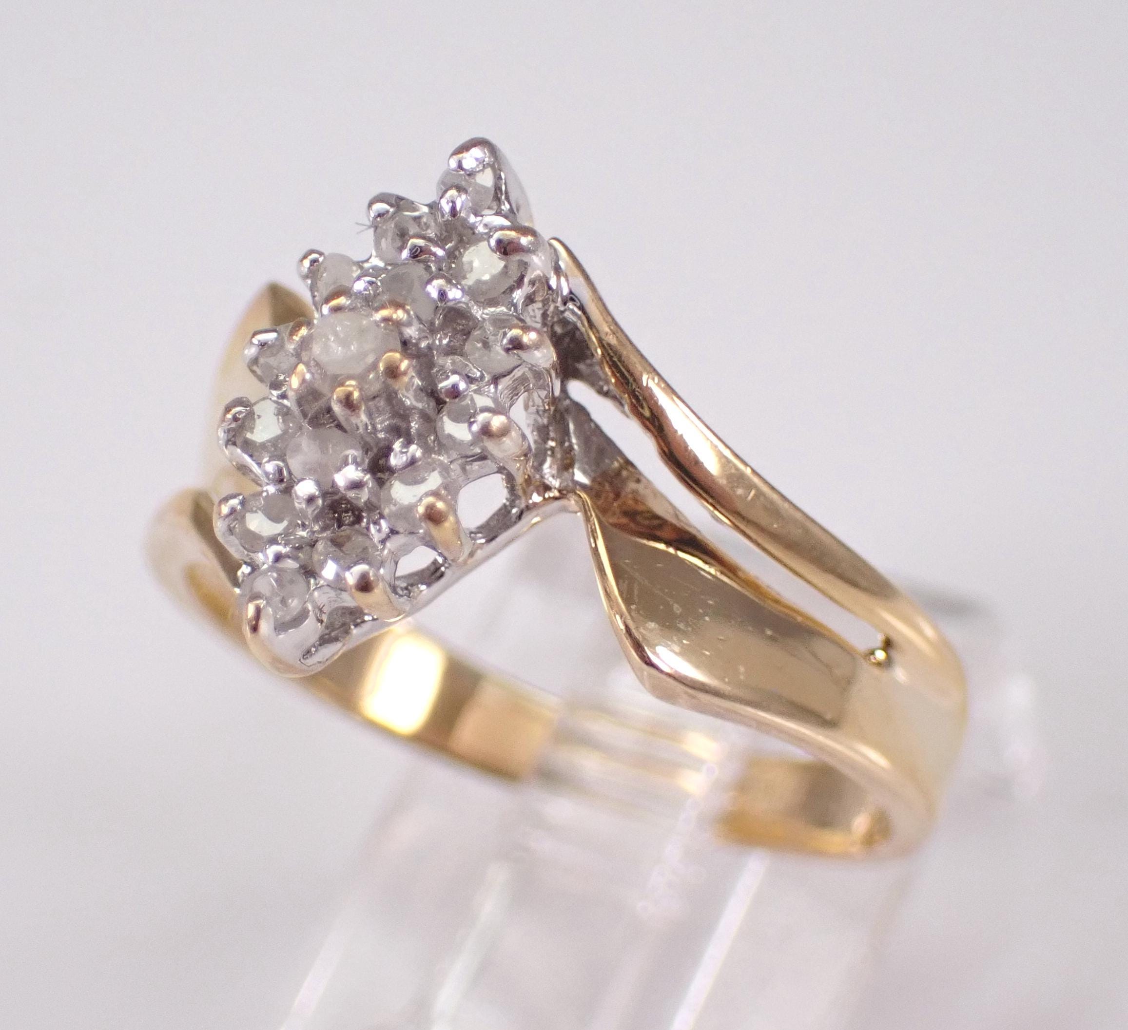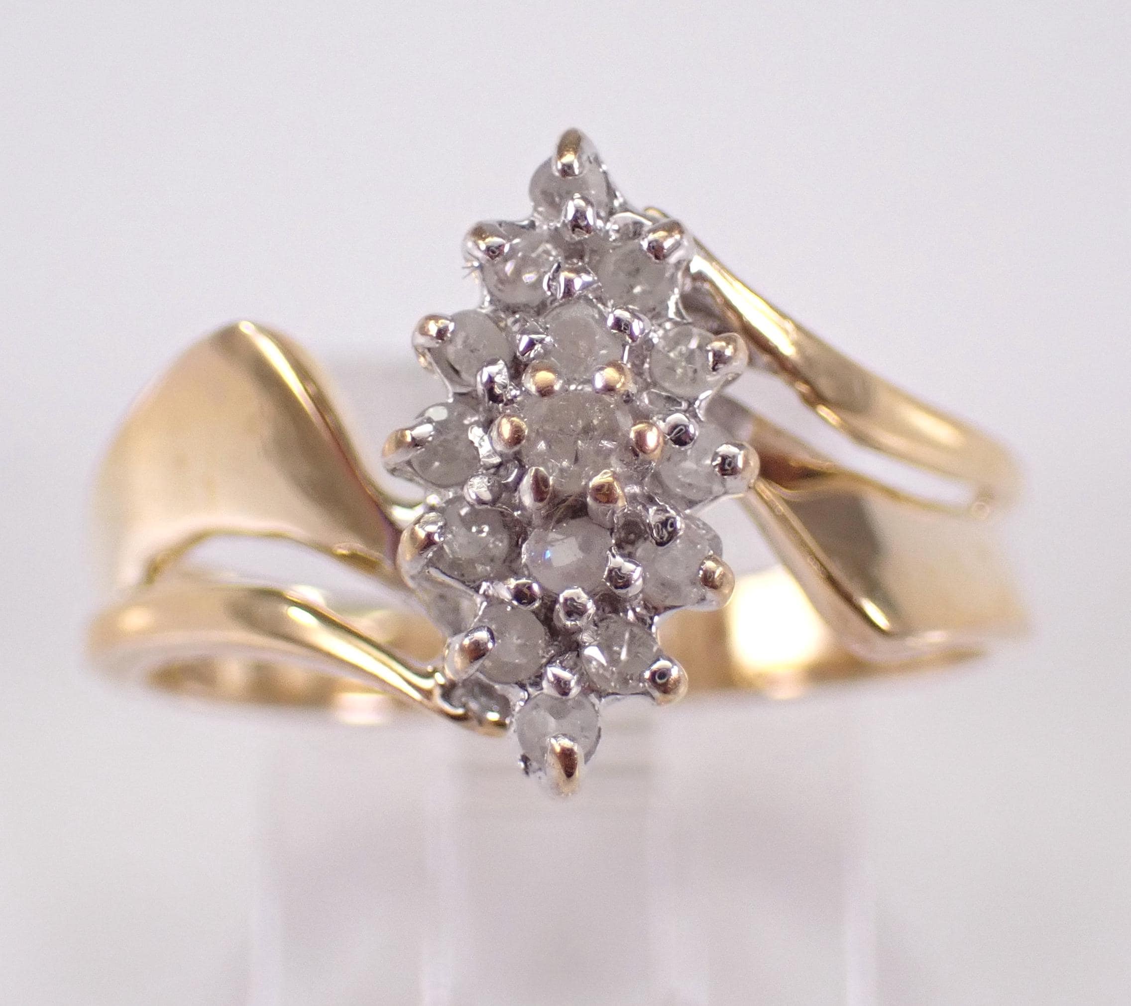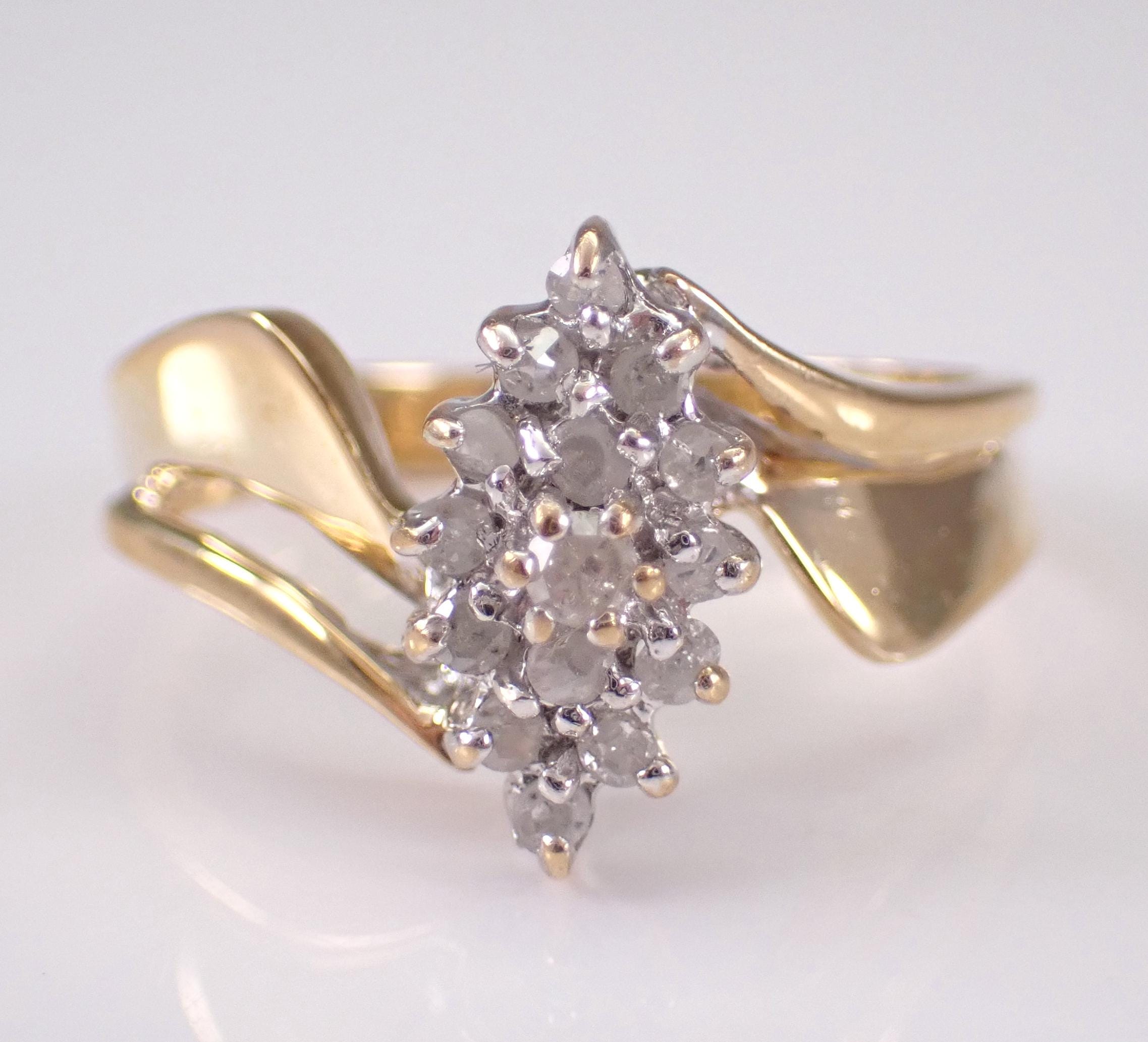Vintage Yellow Gold Diamond Cluster Ring. This ring is set with fifteen Round Diamonds. These diamonds are H color, I2/I3 clarity and weigh a total .20 carats. The ring is 10KT Yellow Gold, weighs 3.0 grams, measures 12 mm along the finger and is a finger size 7 1/4, which can be resized (please inquire about sizing with the finger size you need). I will ship this ring promptly in a gift box.